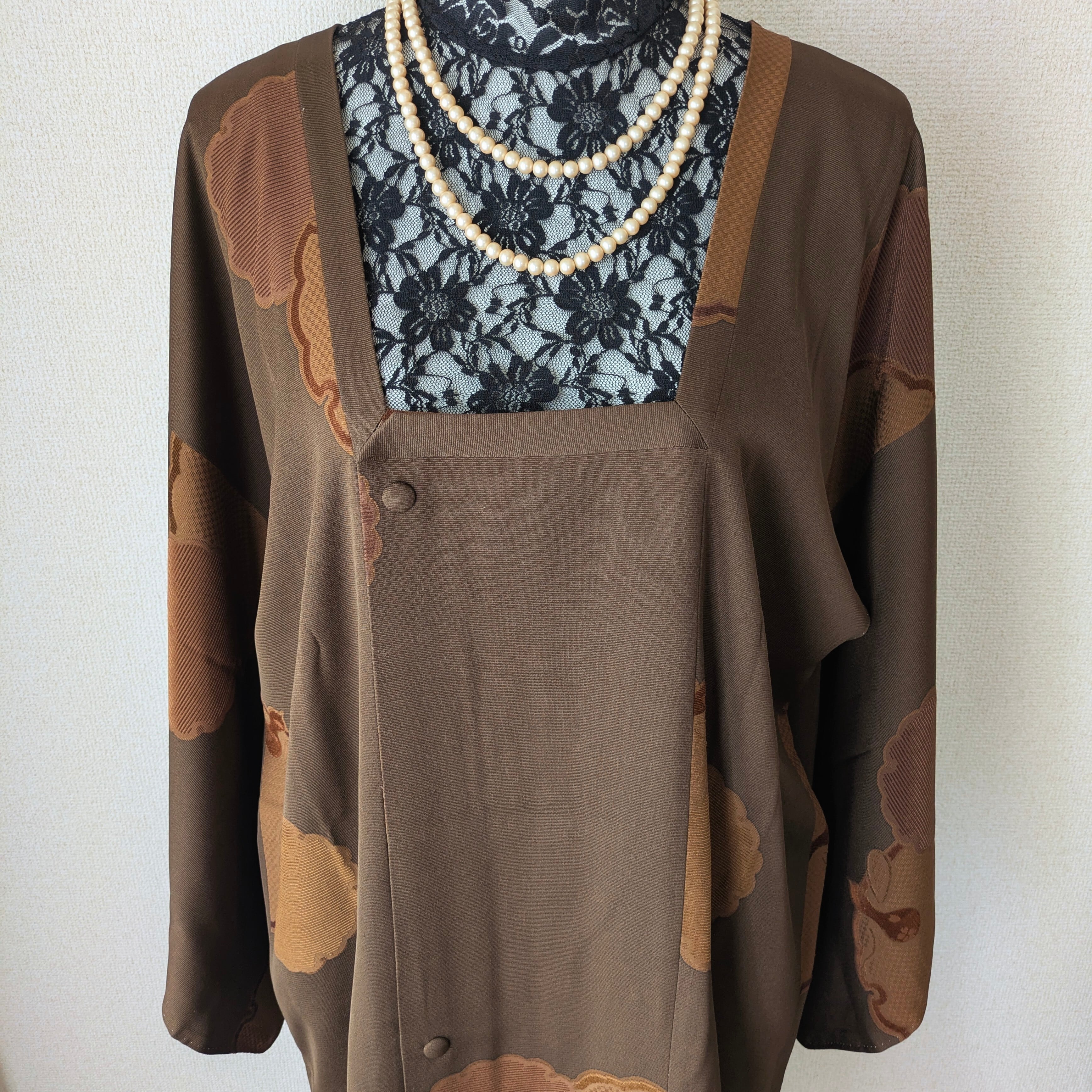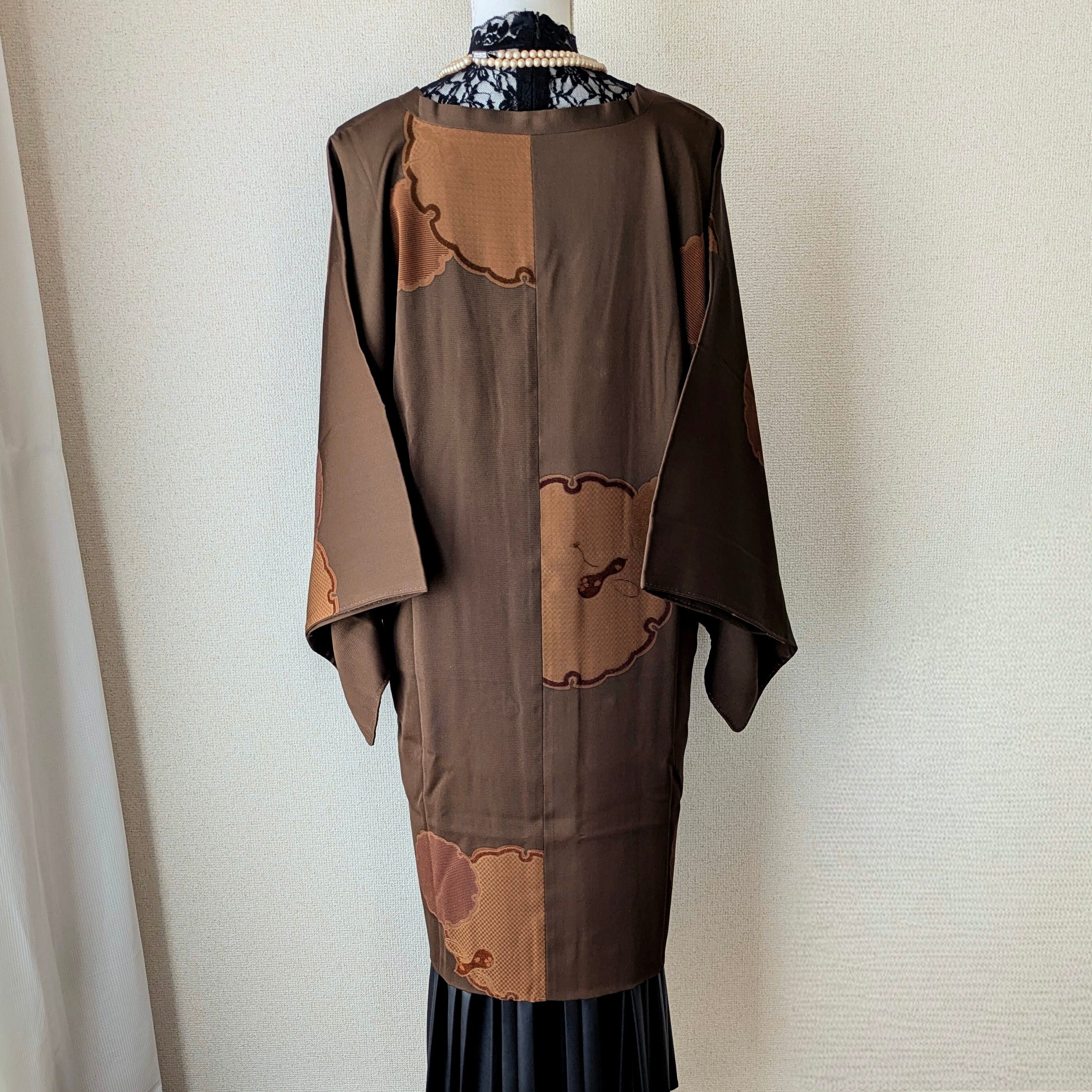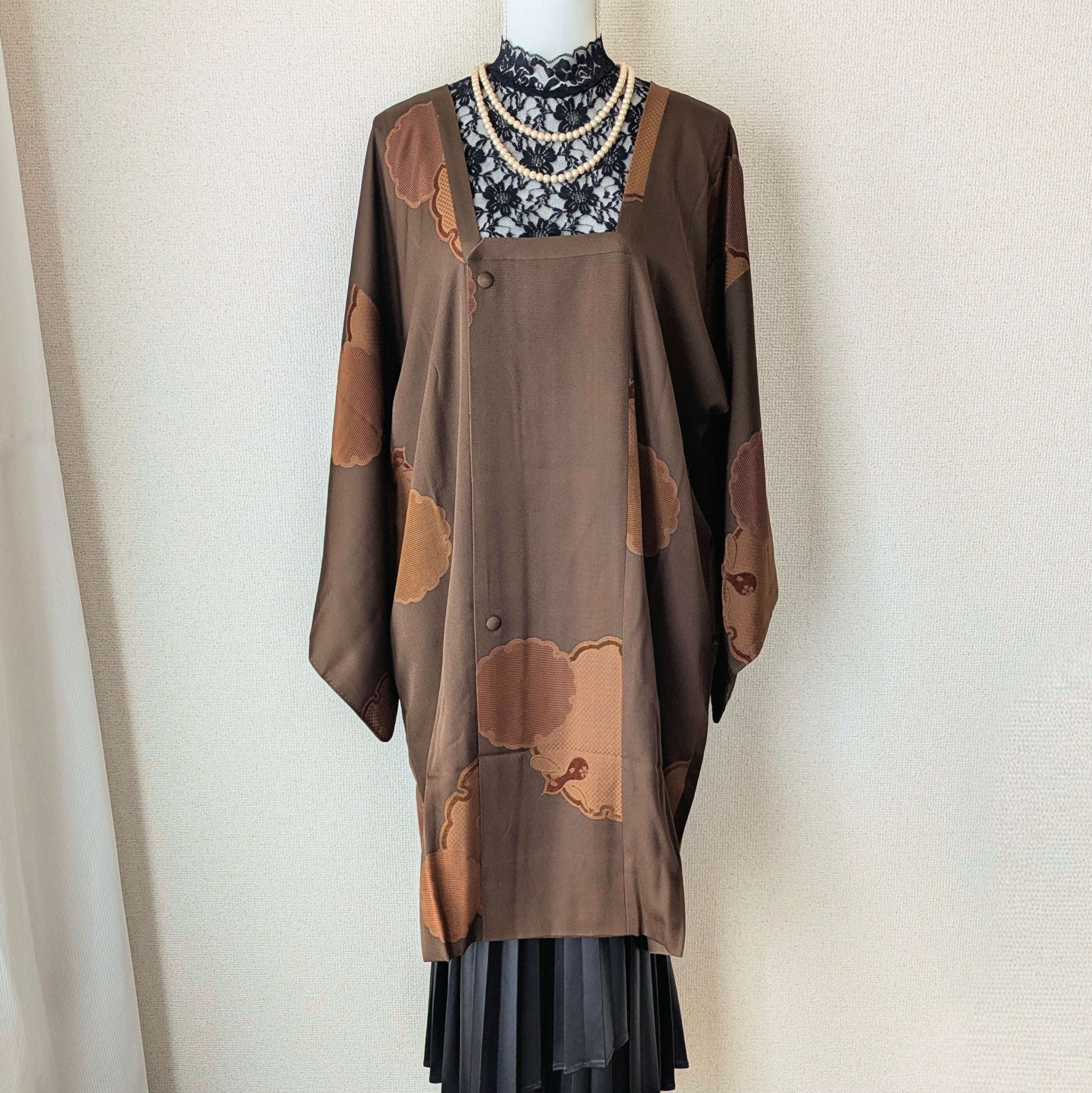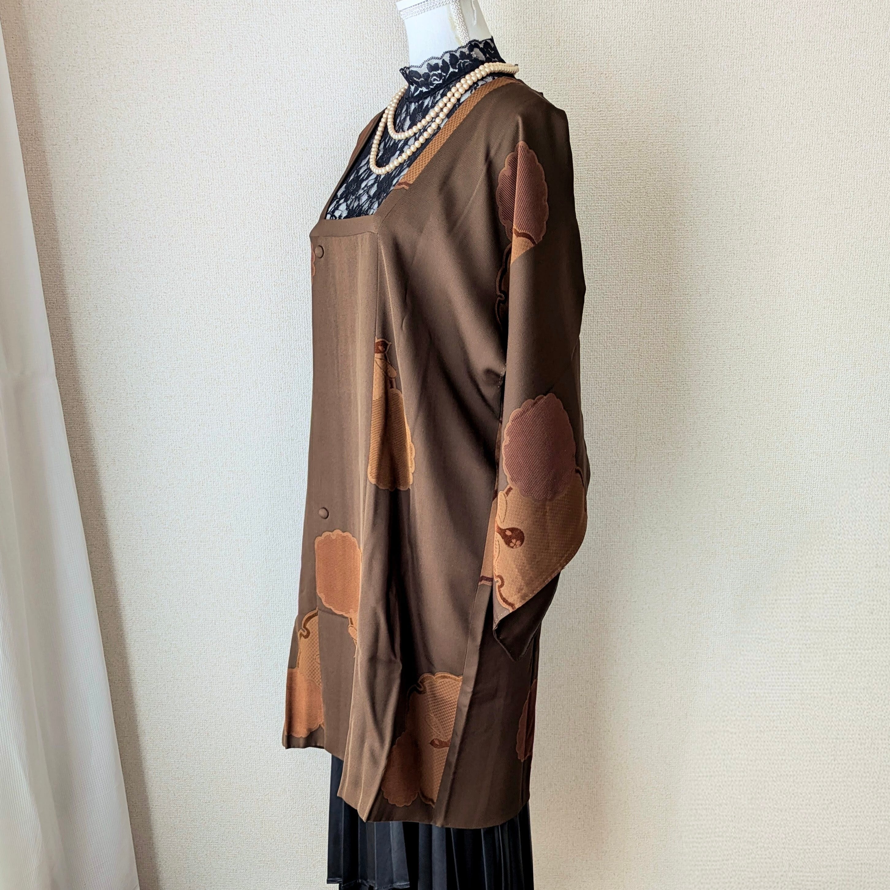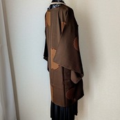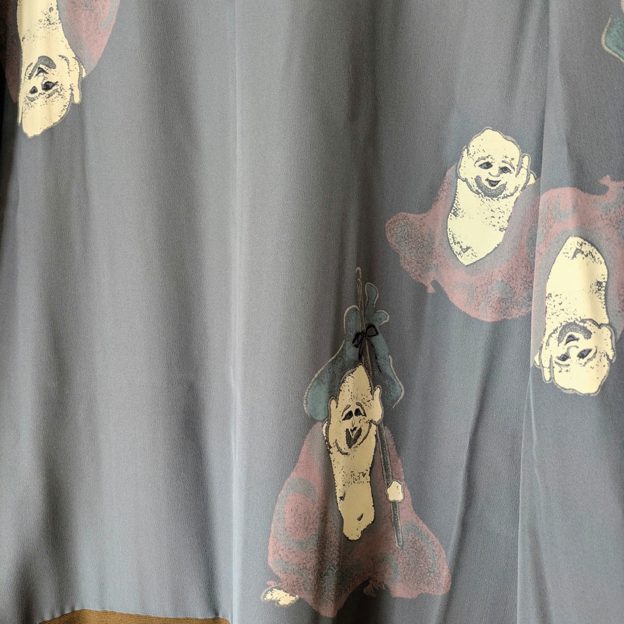 表地には茶色の雪輪文様、裏地には愉しげな姿の恵比寿様が描かれた道行コート(雨コート)です。