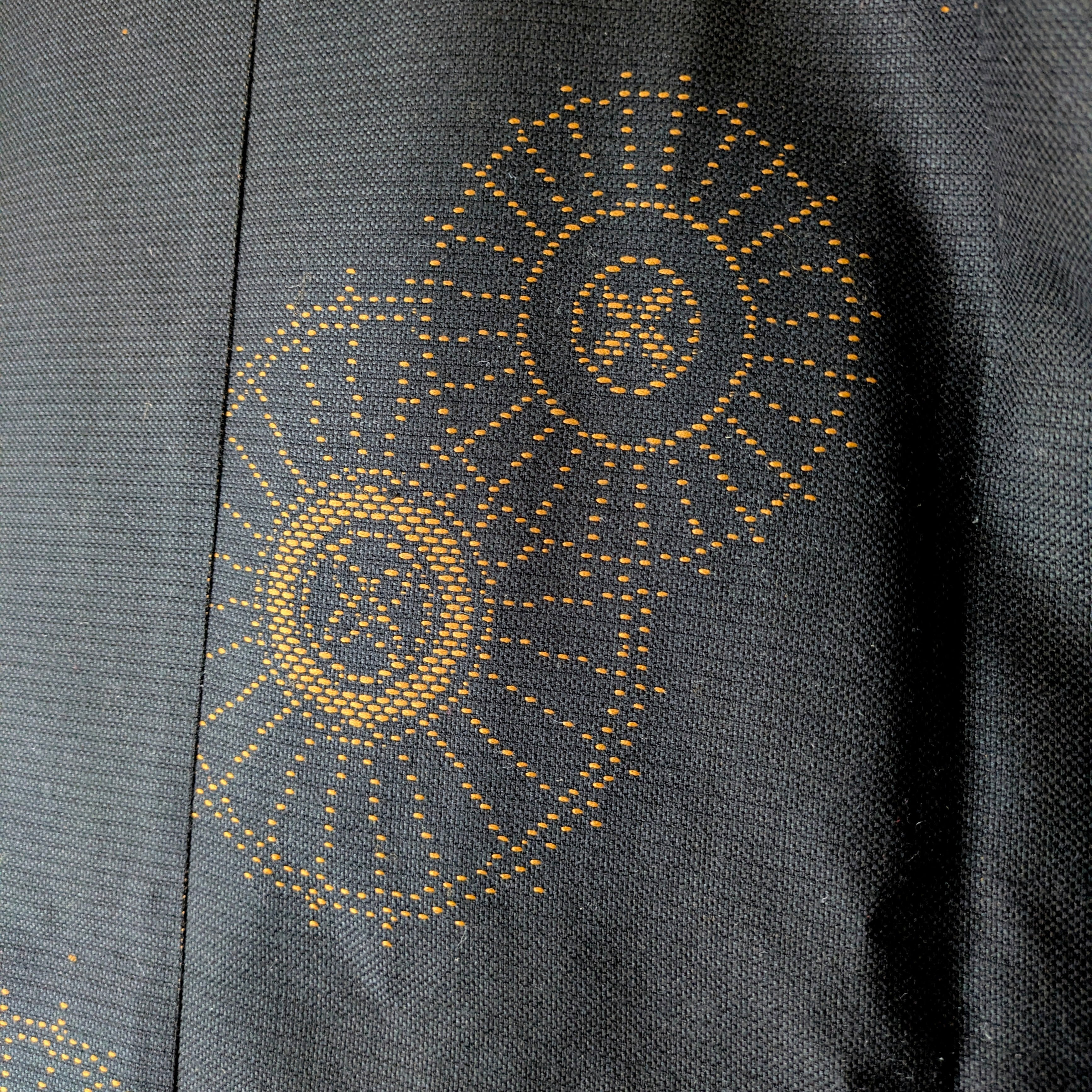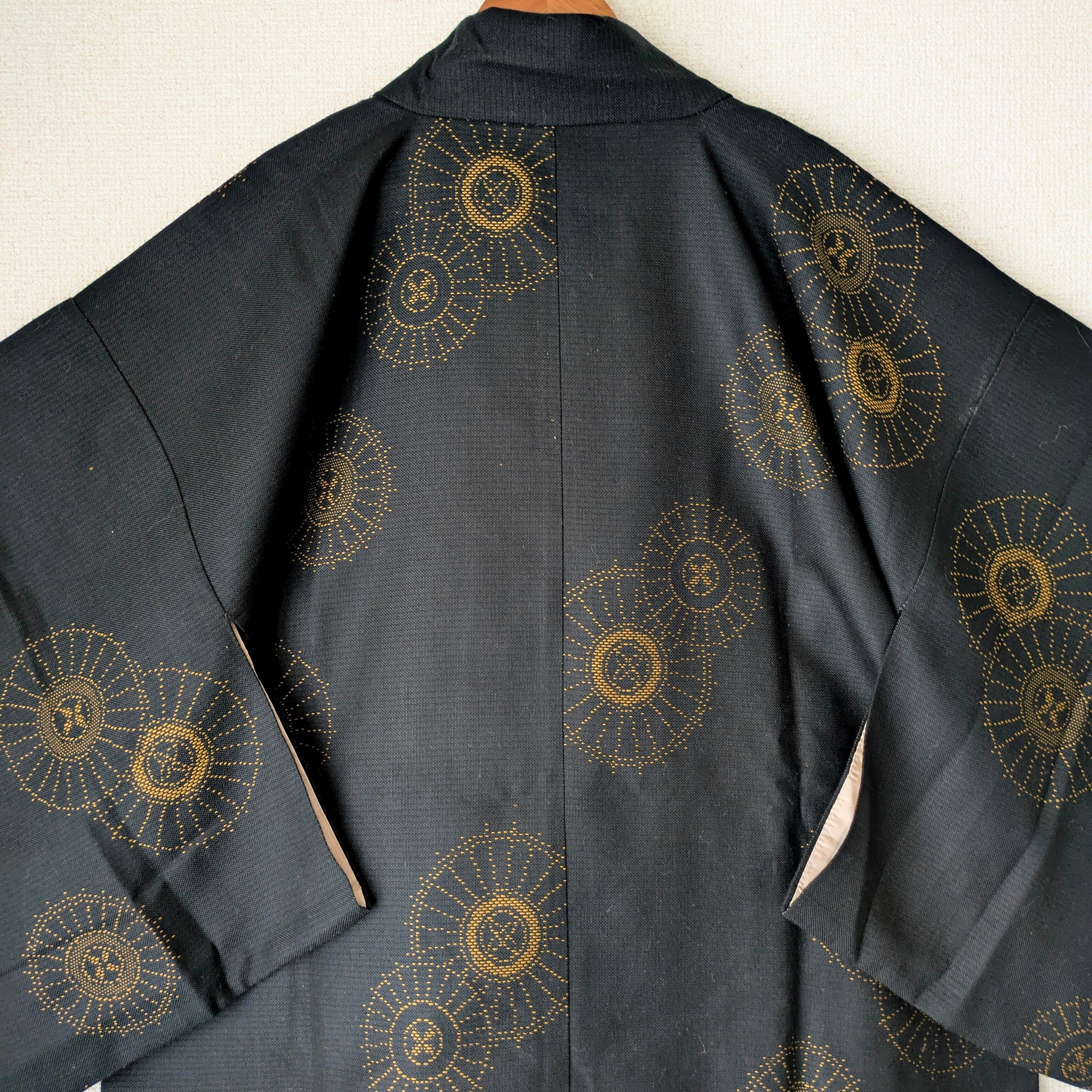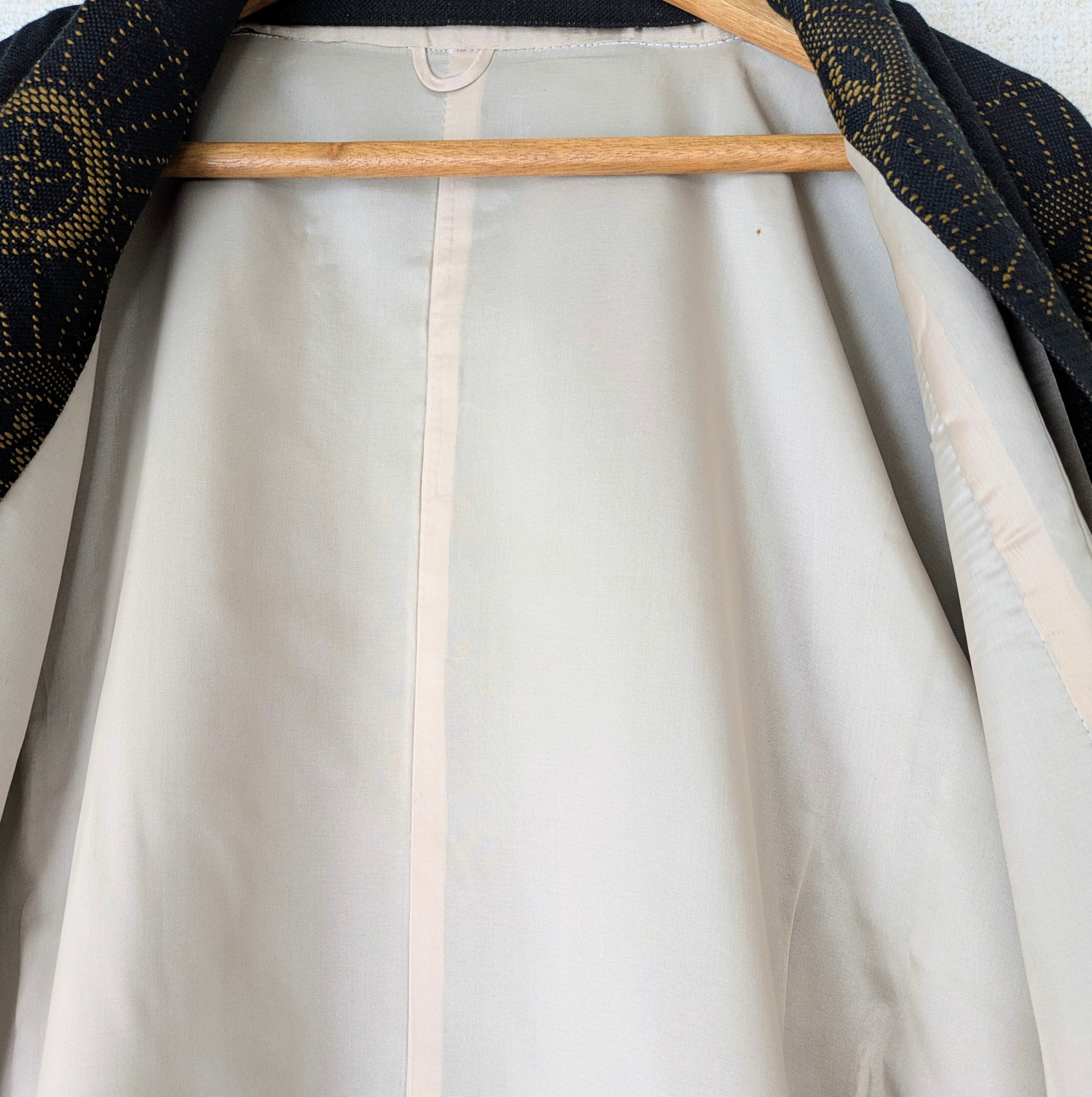 黒に黄色の番傘模様が粋なウール地の道中着です。衿は広衿仕様となっています。