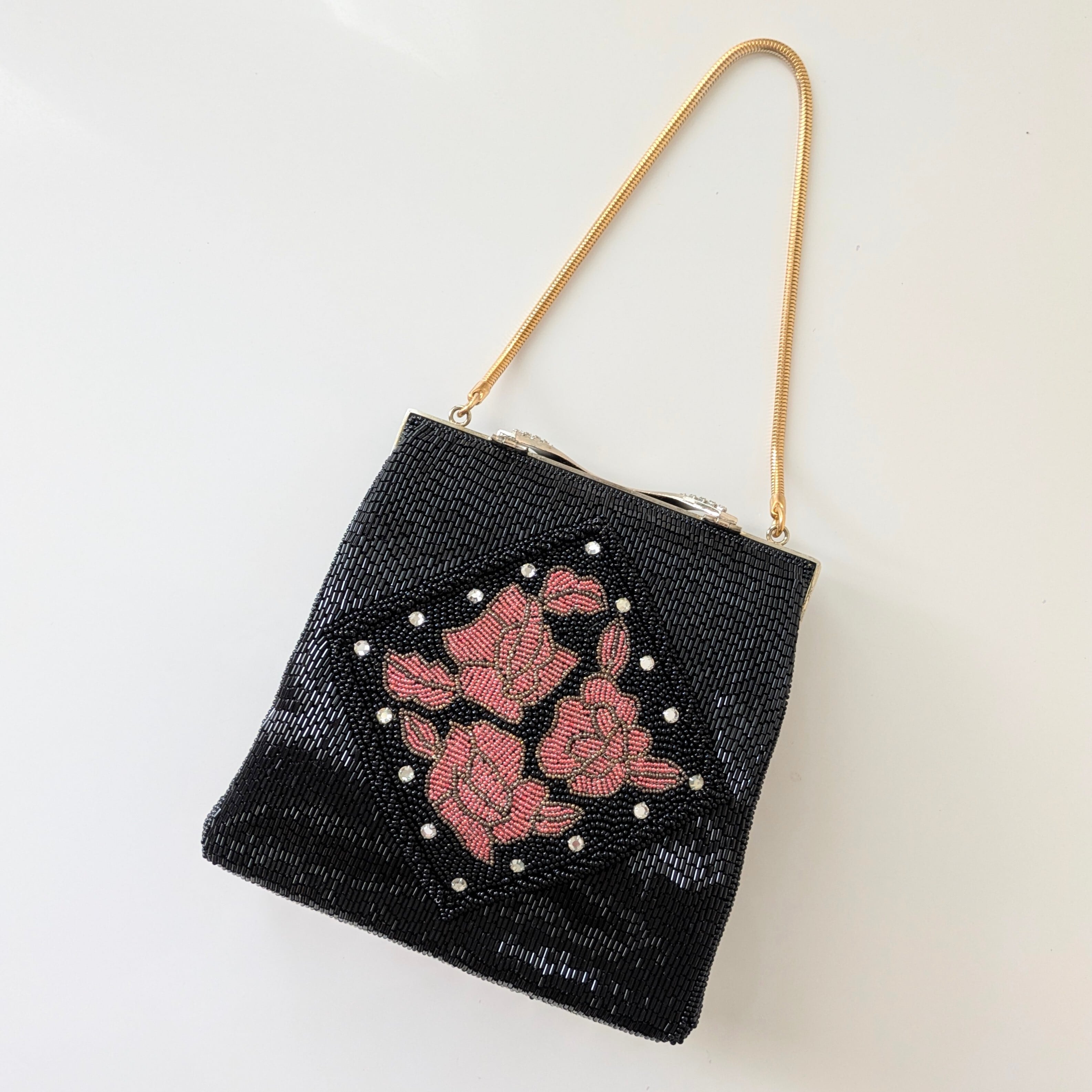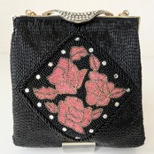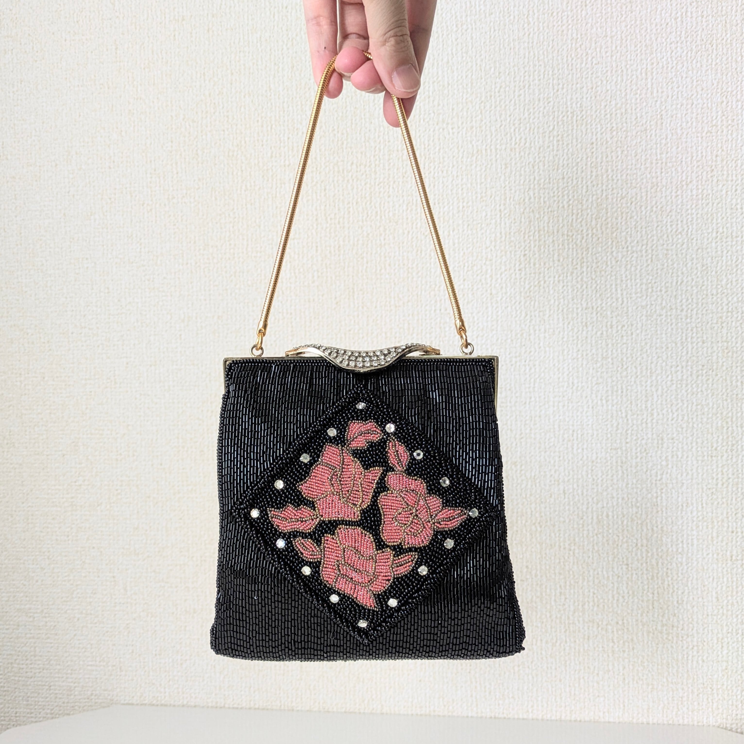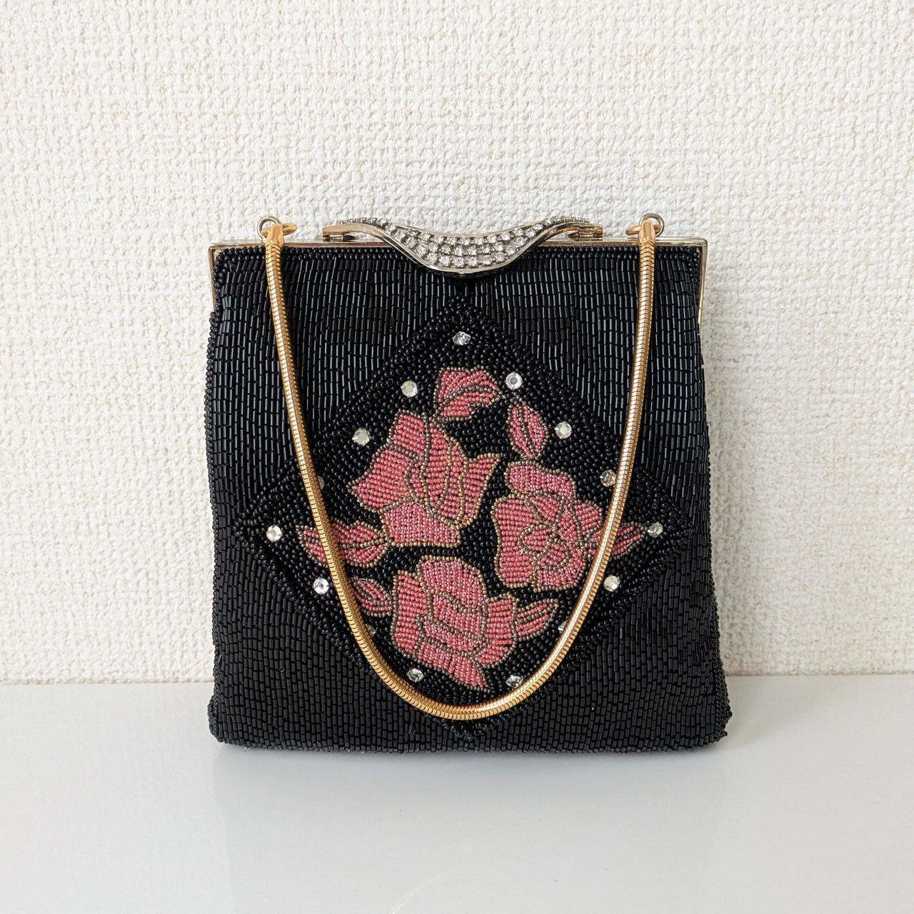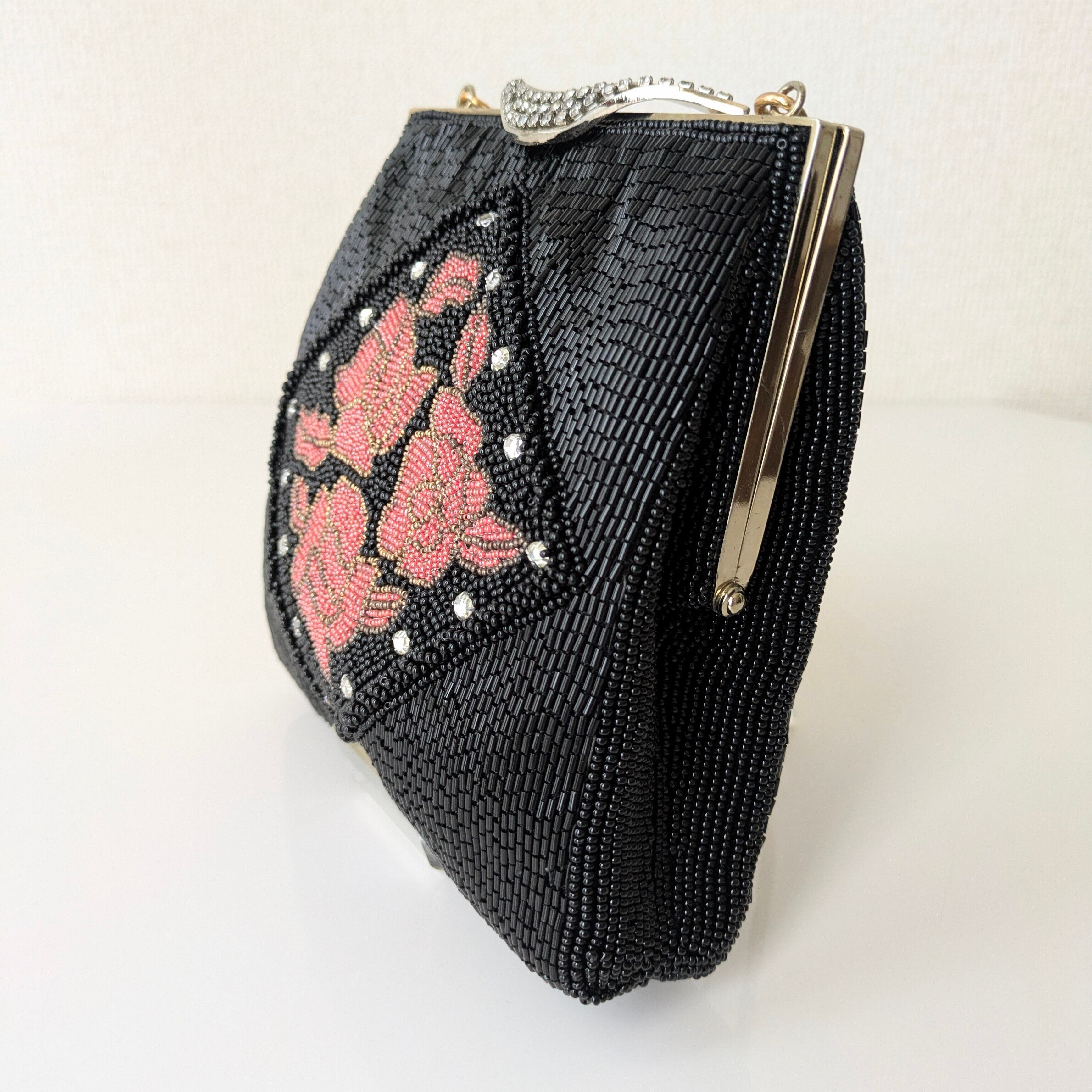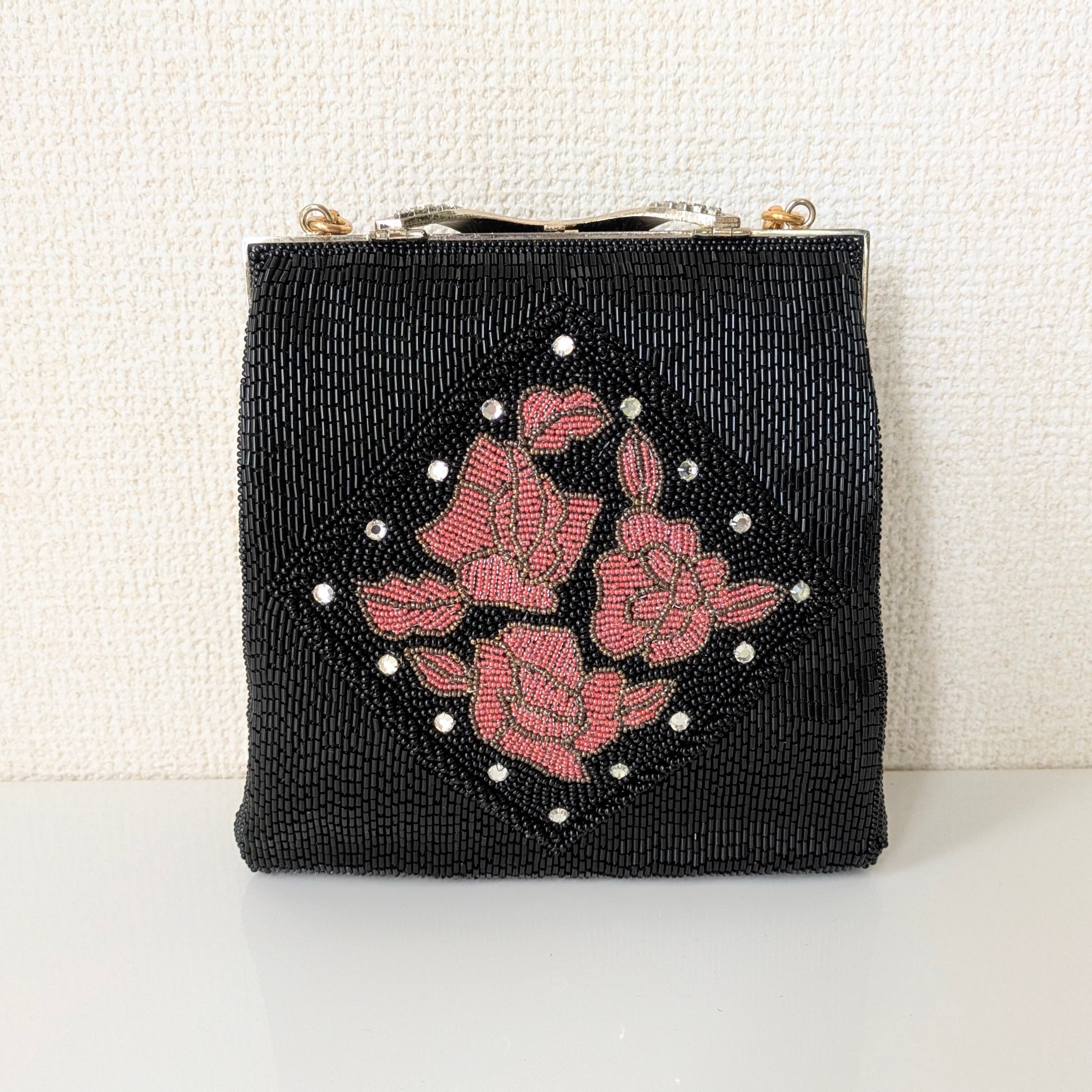 黒に赤い薔薇の花が三つあしらわれたほぼ真四角の小ぶりなビーズバッグです。