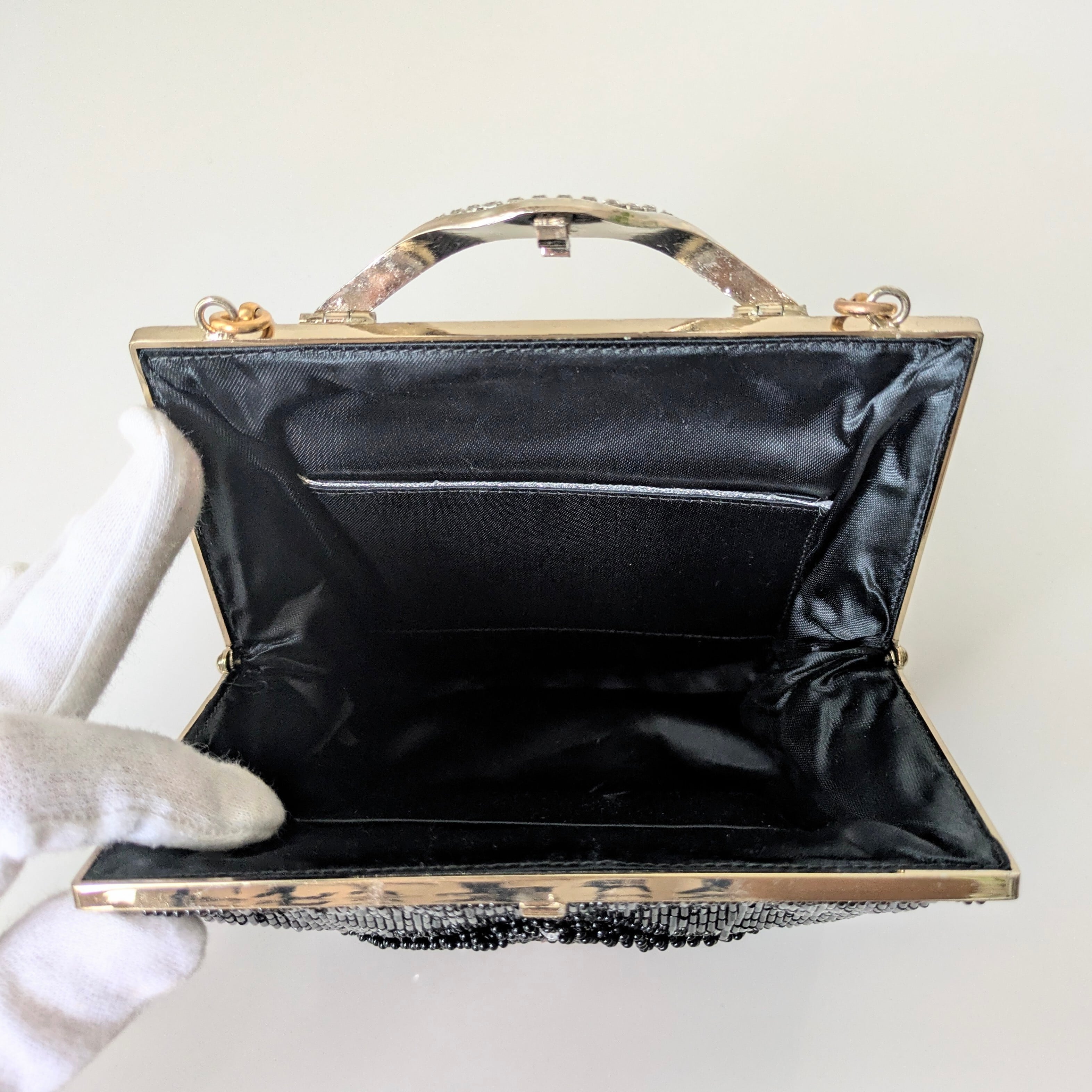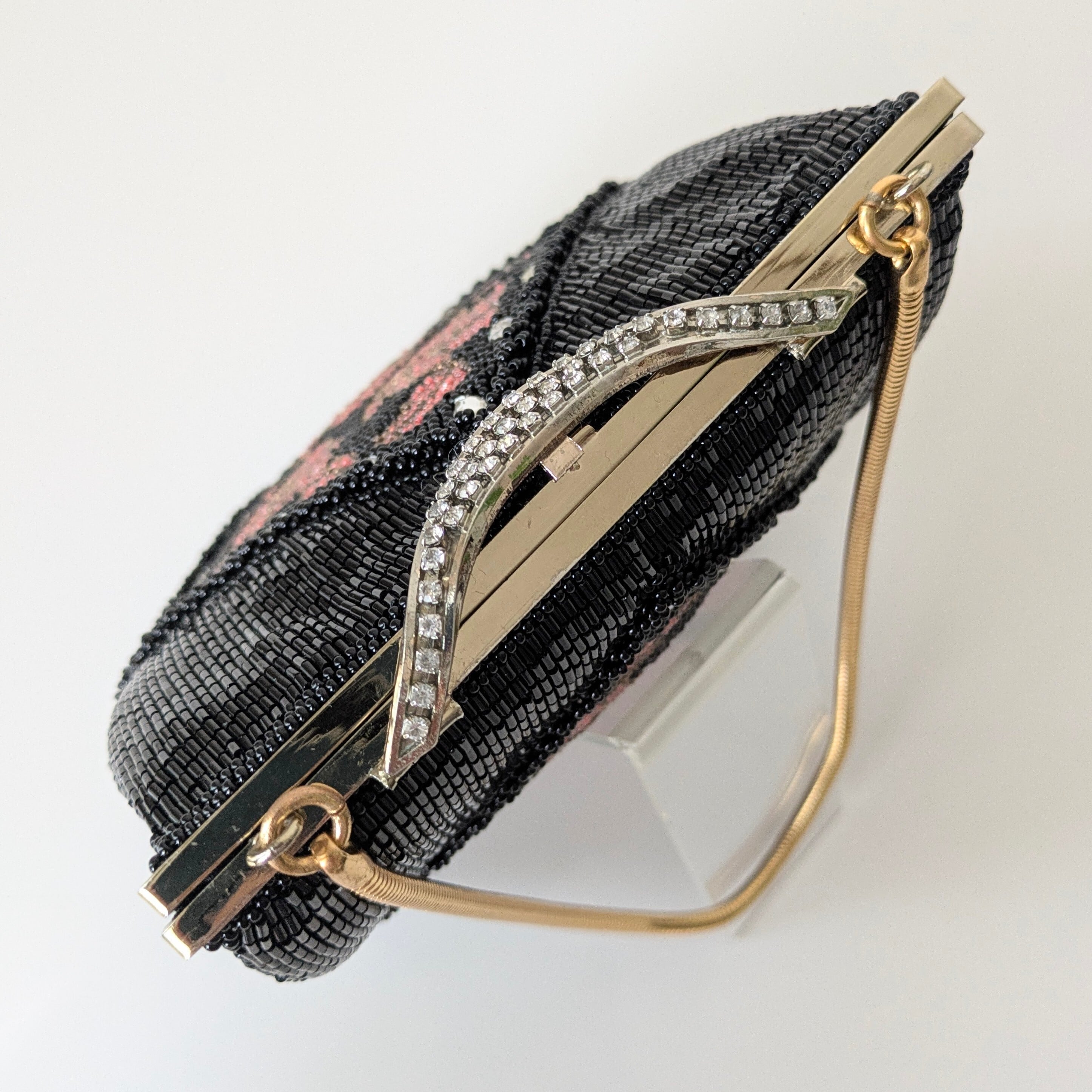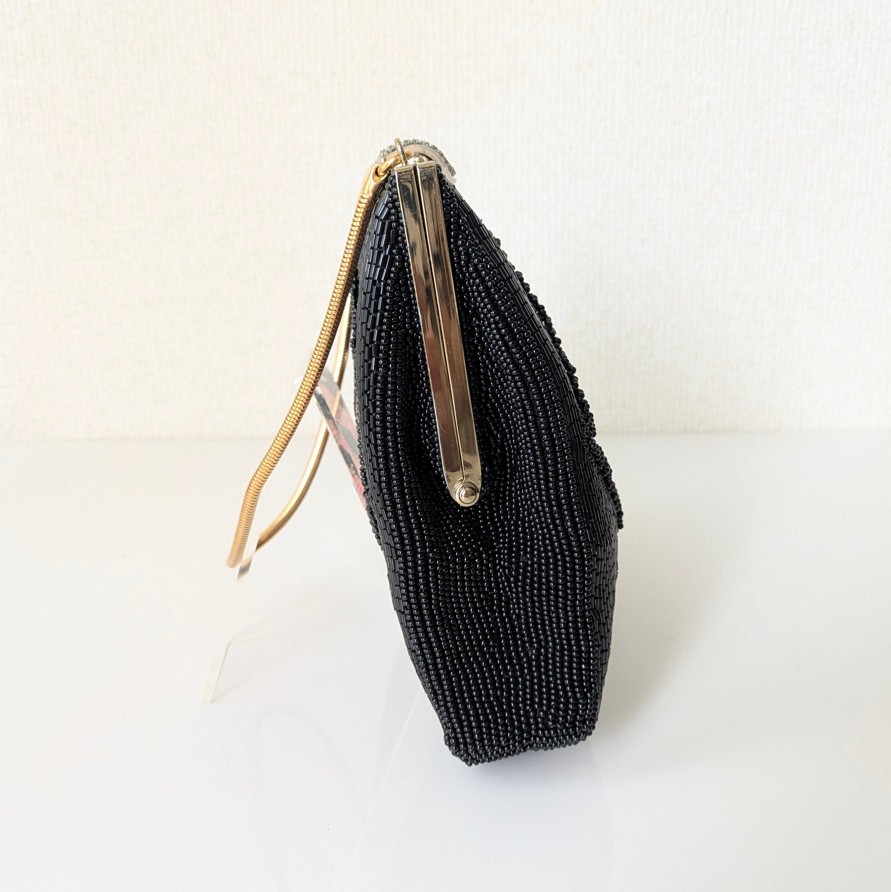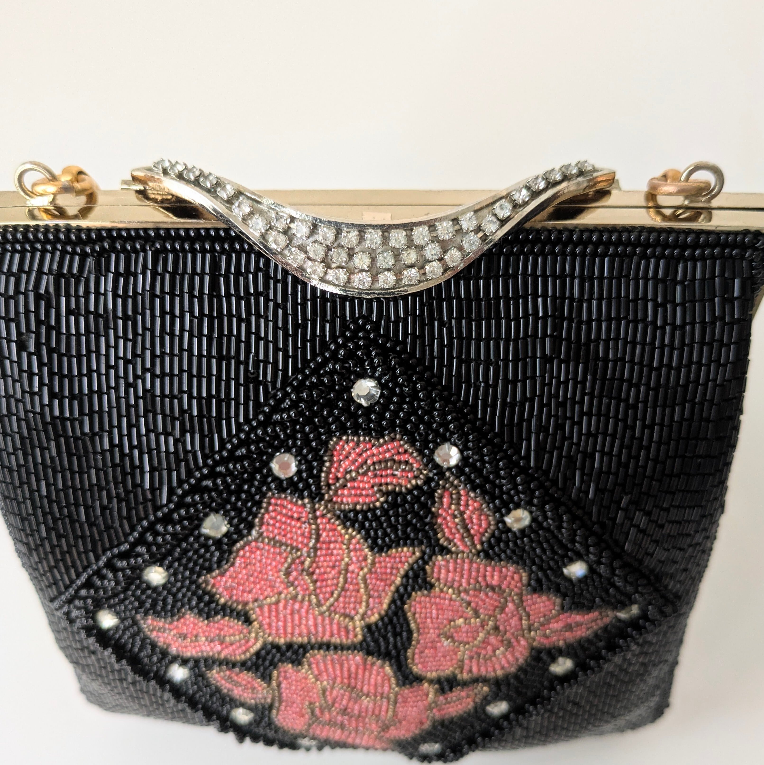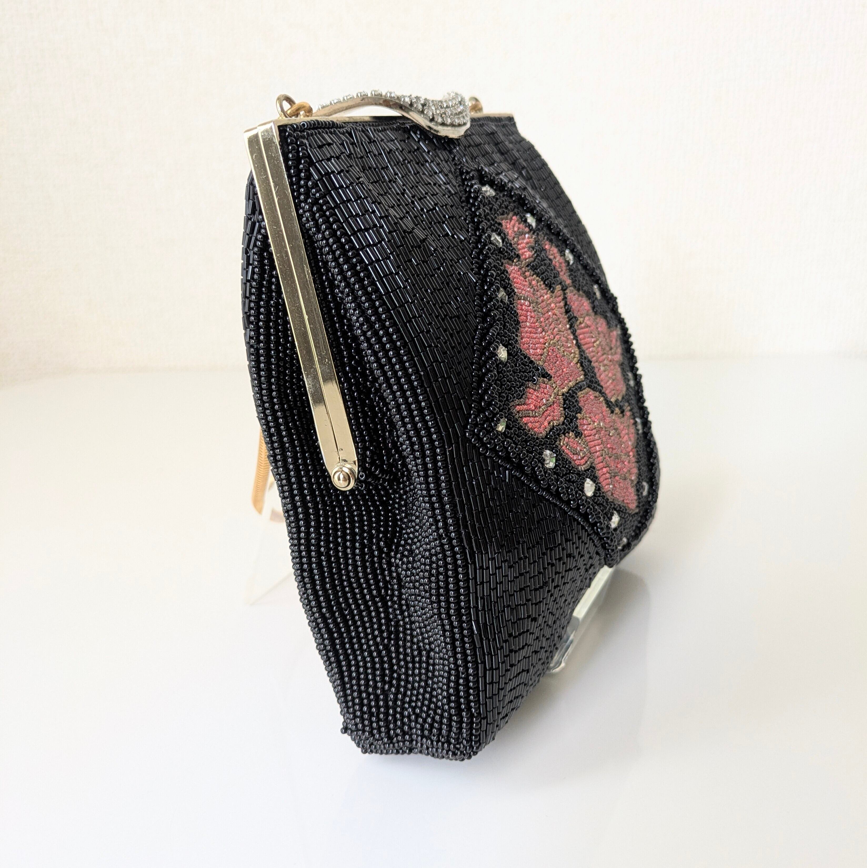 黒に赤い薔薇の花が三つあしらわれたほぼ真四角の小ぶりなビーズバッグです。
