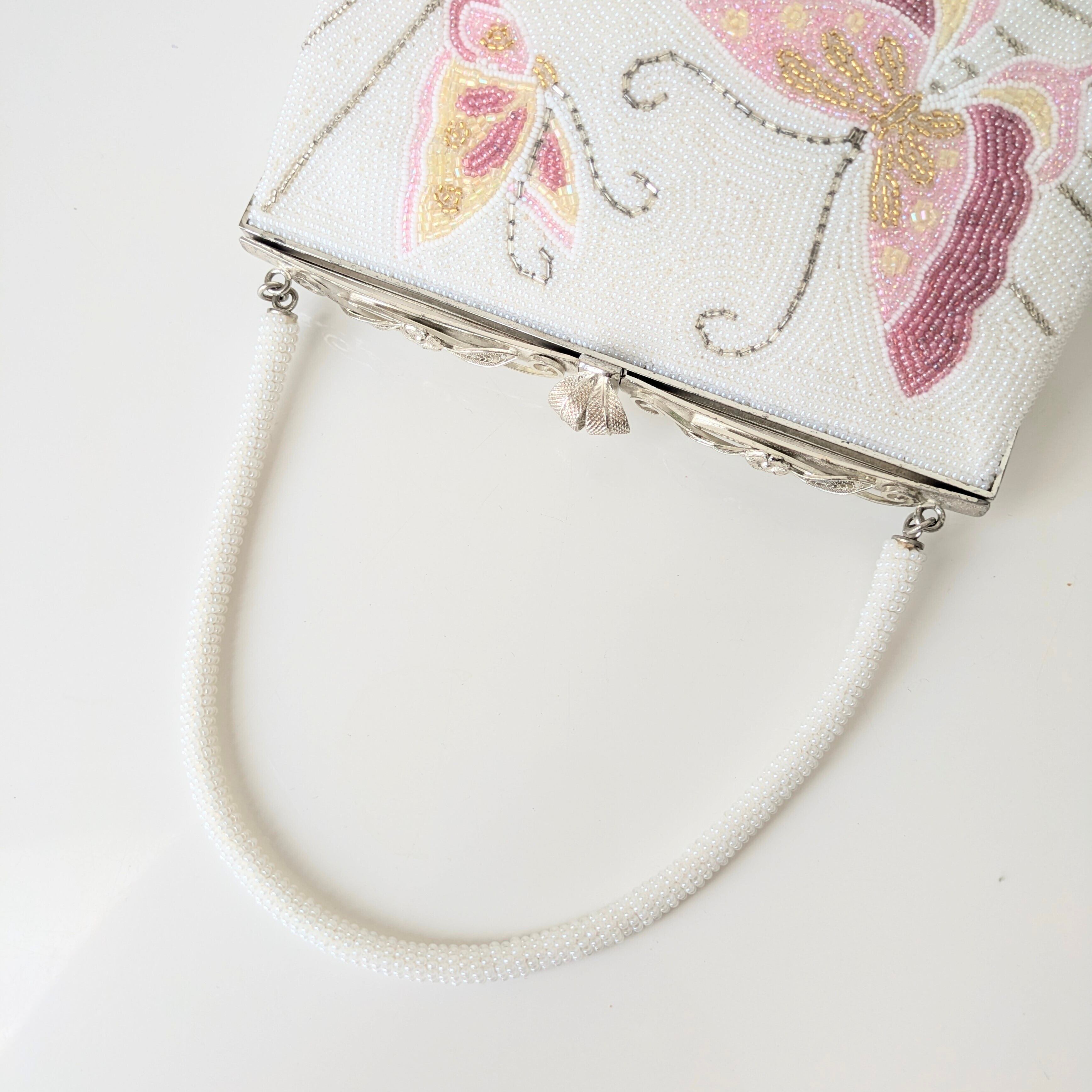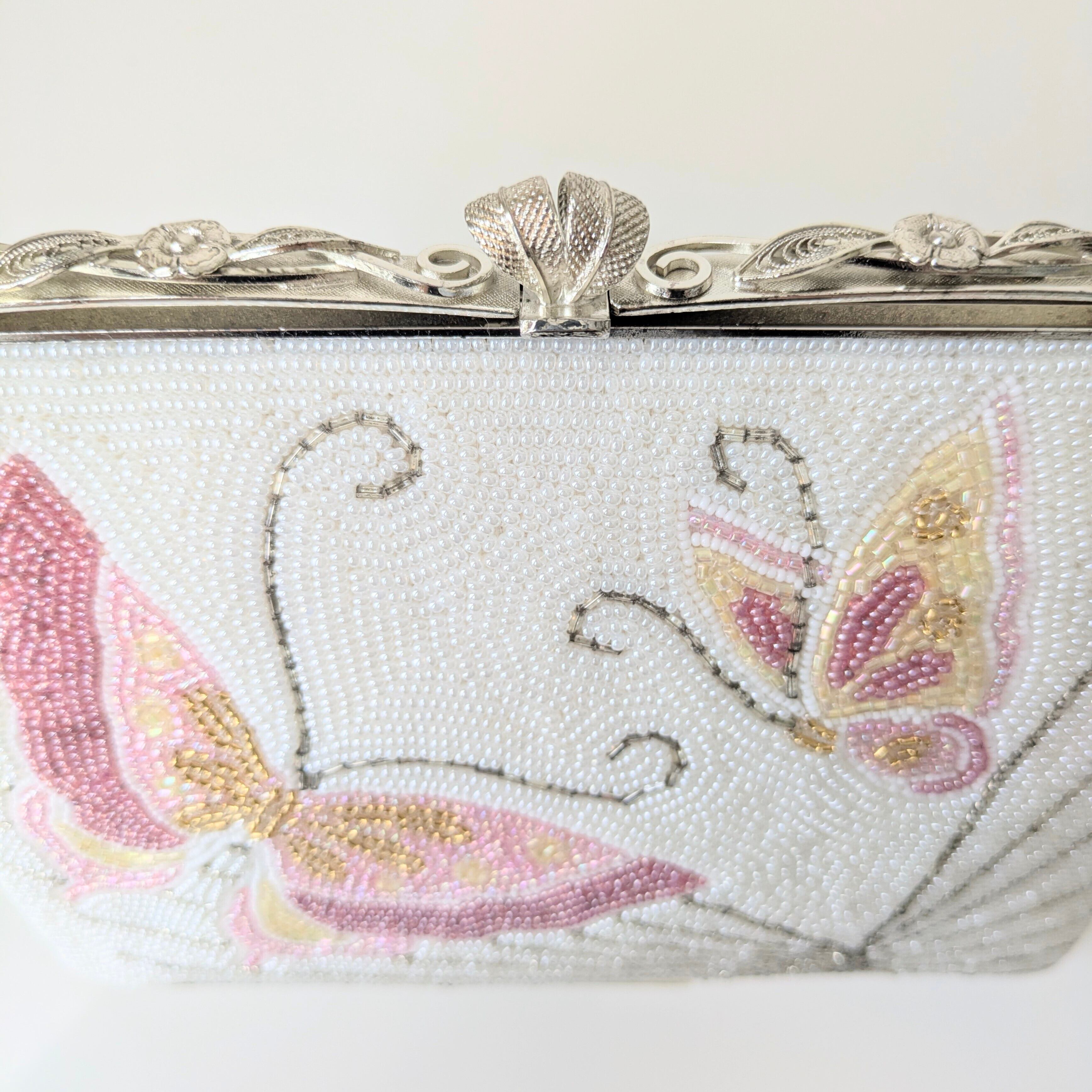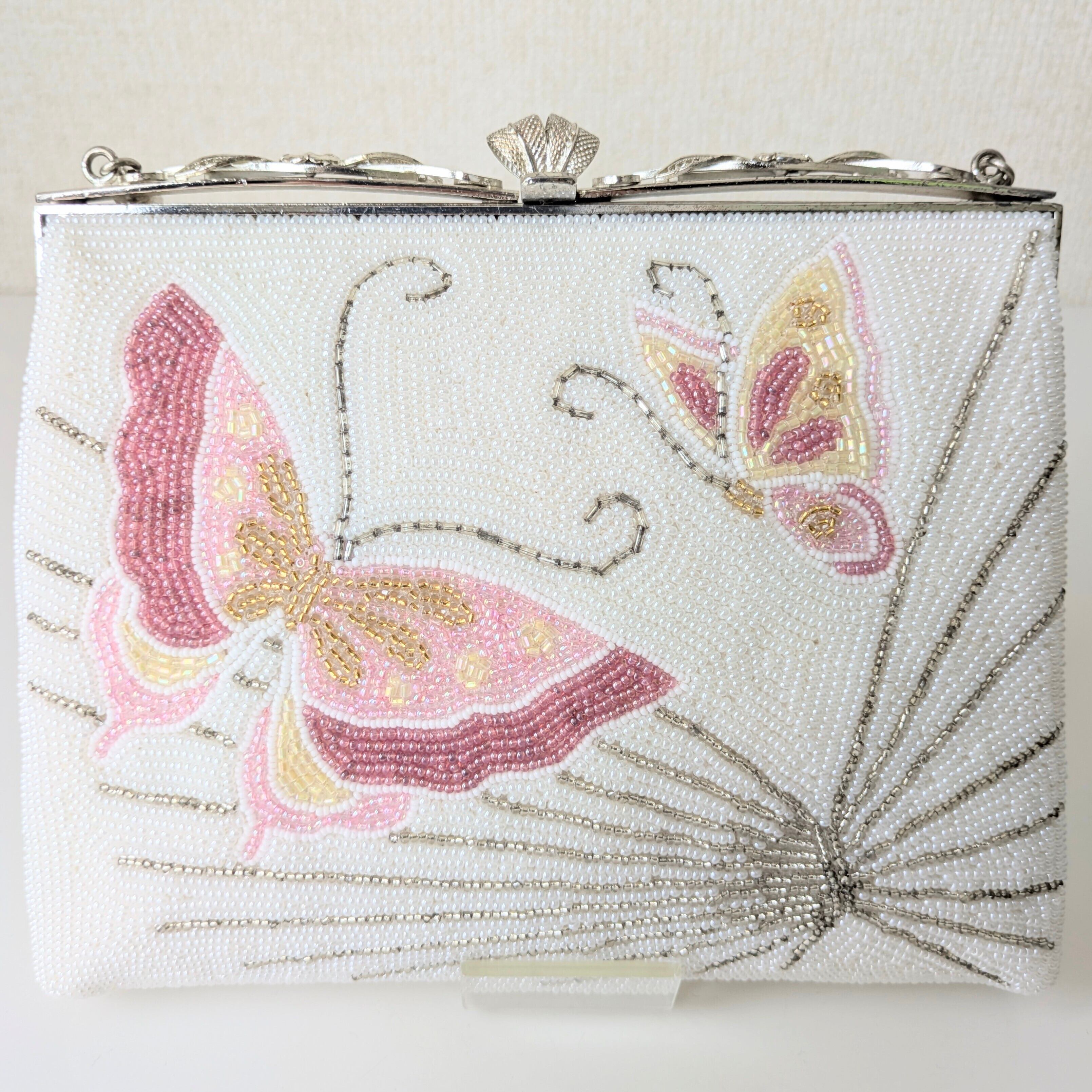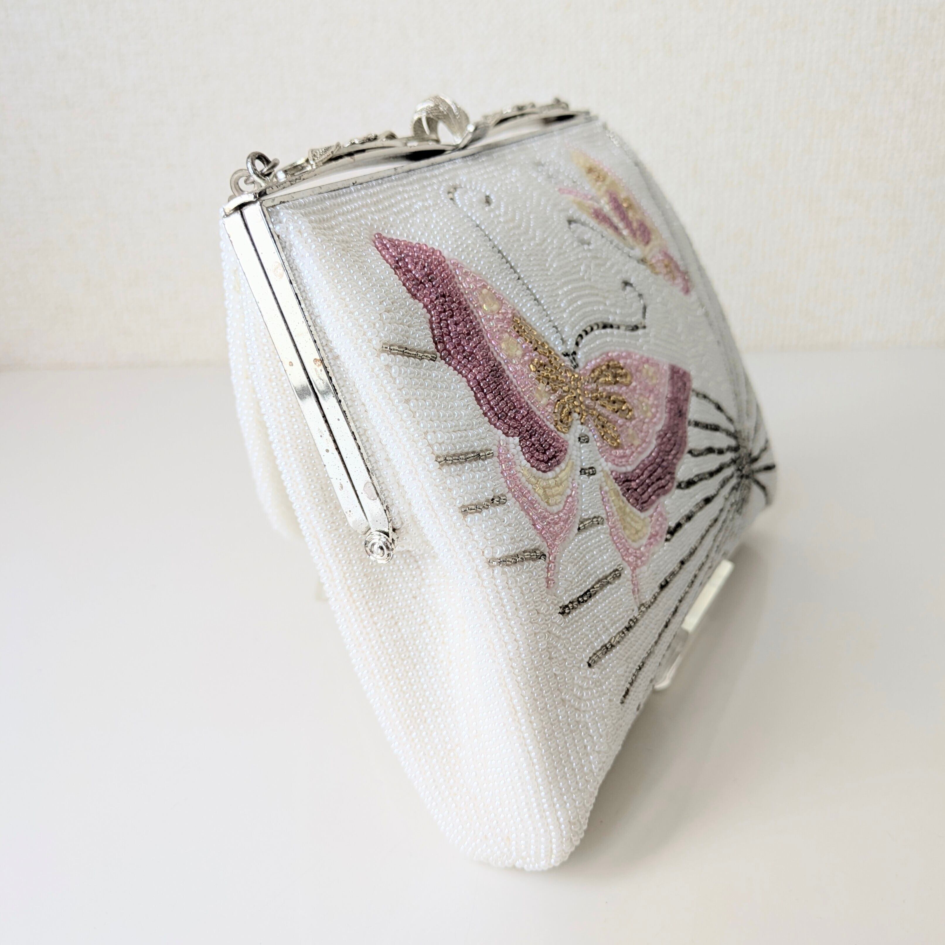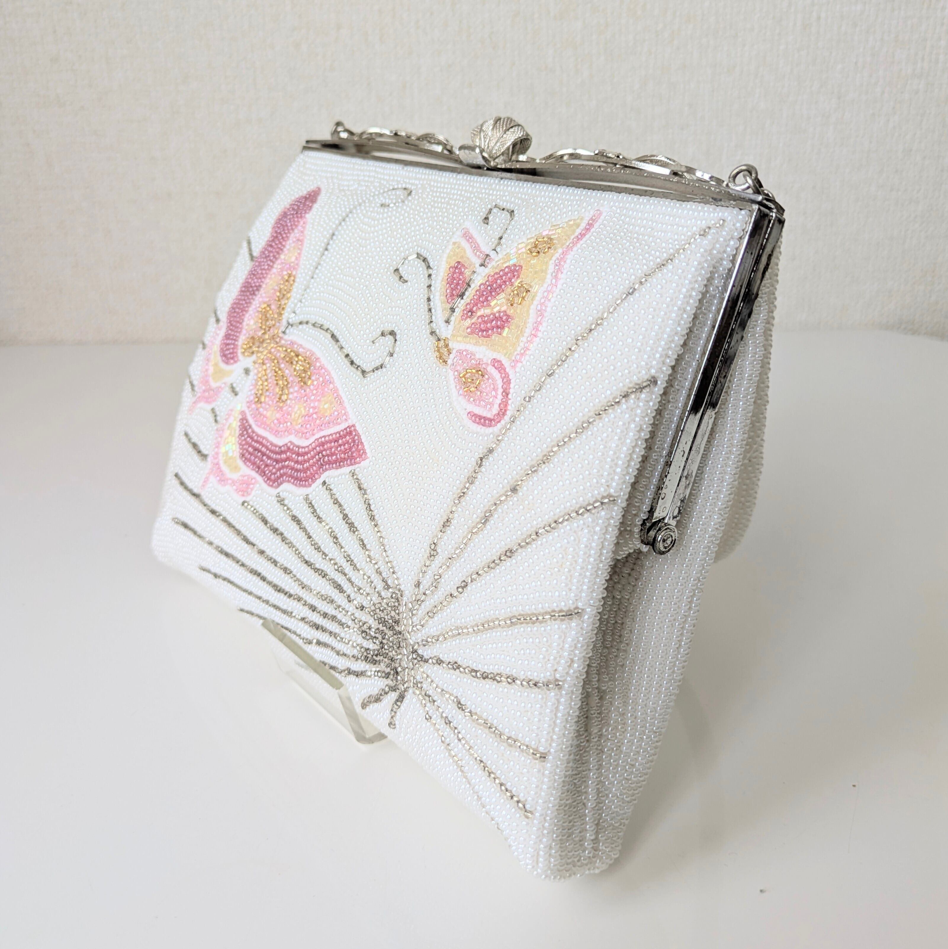 白色を背景に2羽の蝶が描かれたビーズバッグです。シルバーの線で描かれた蝶のシルエットが、ピンク色の2羽の蝶を引き立てているかのようなデザインです。