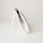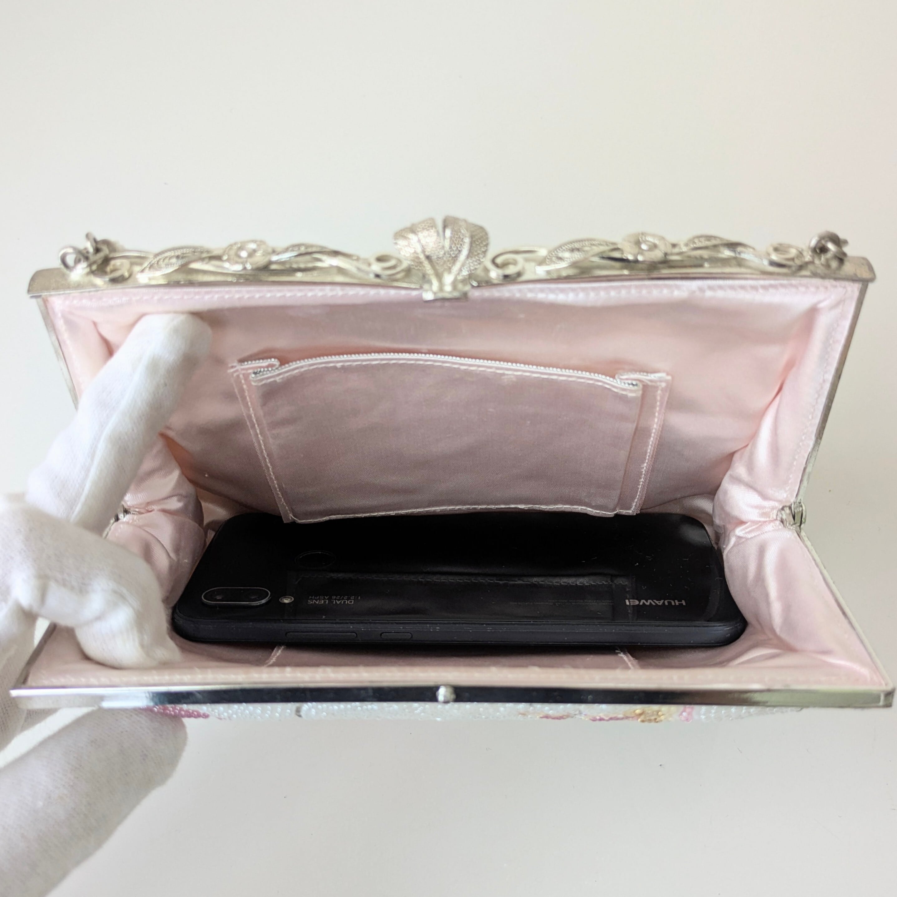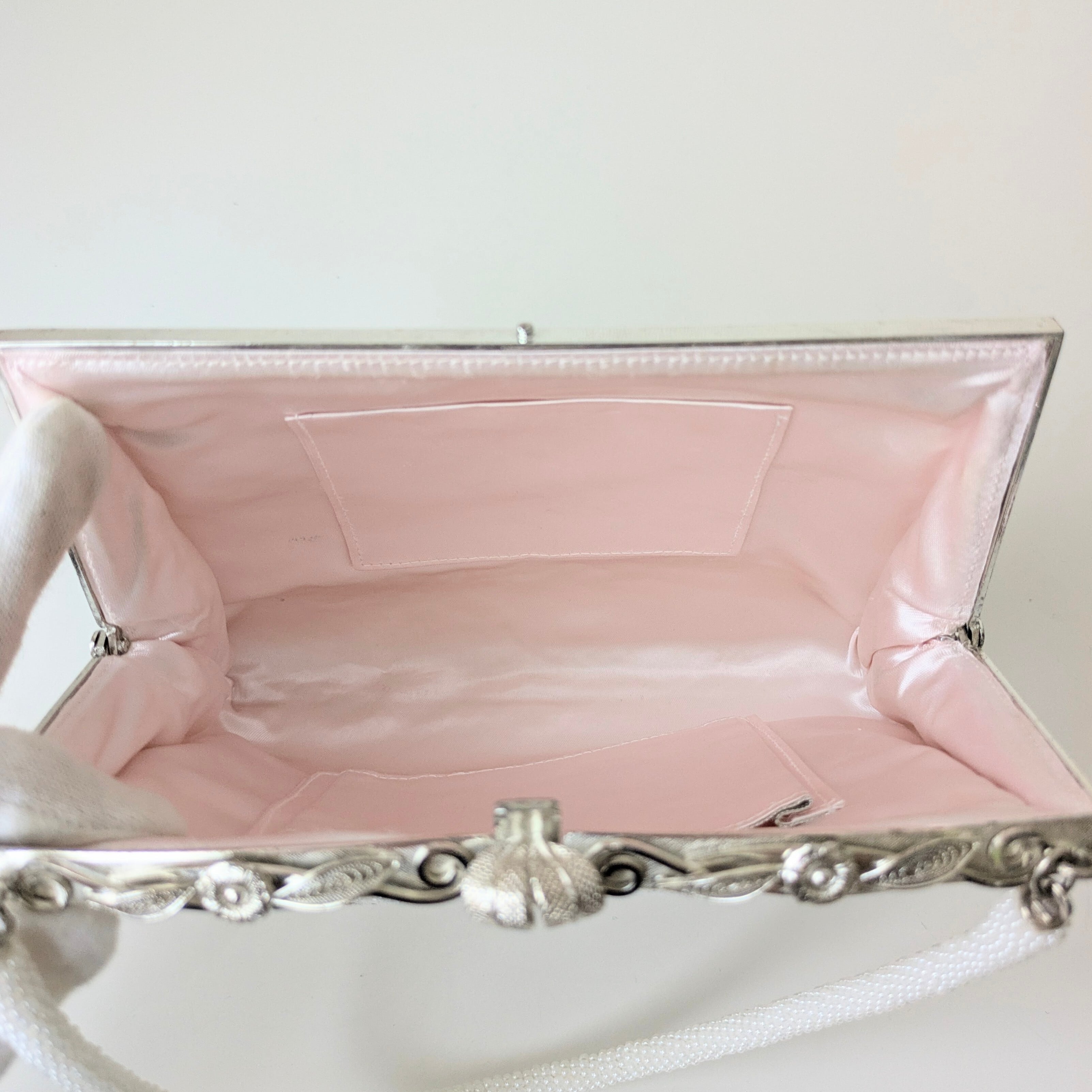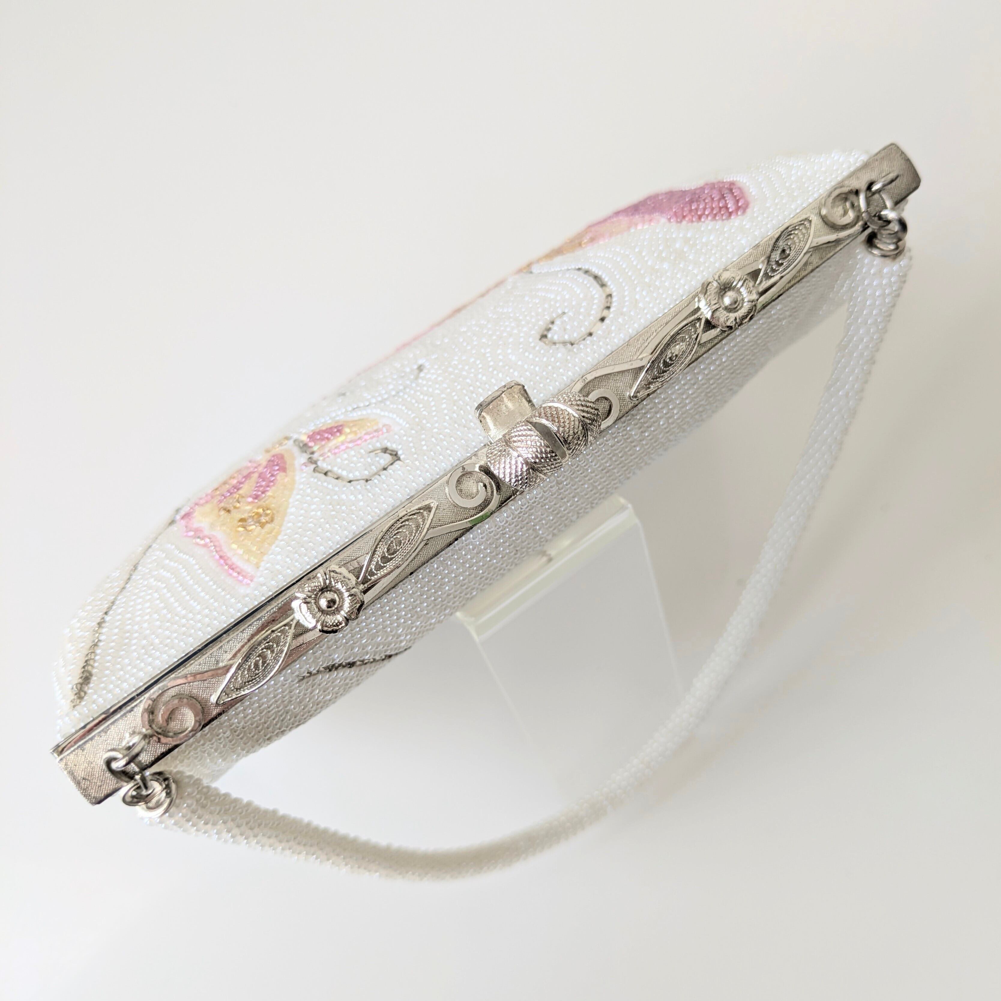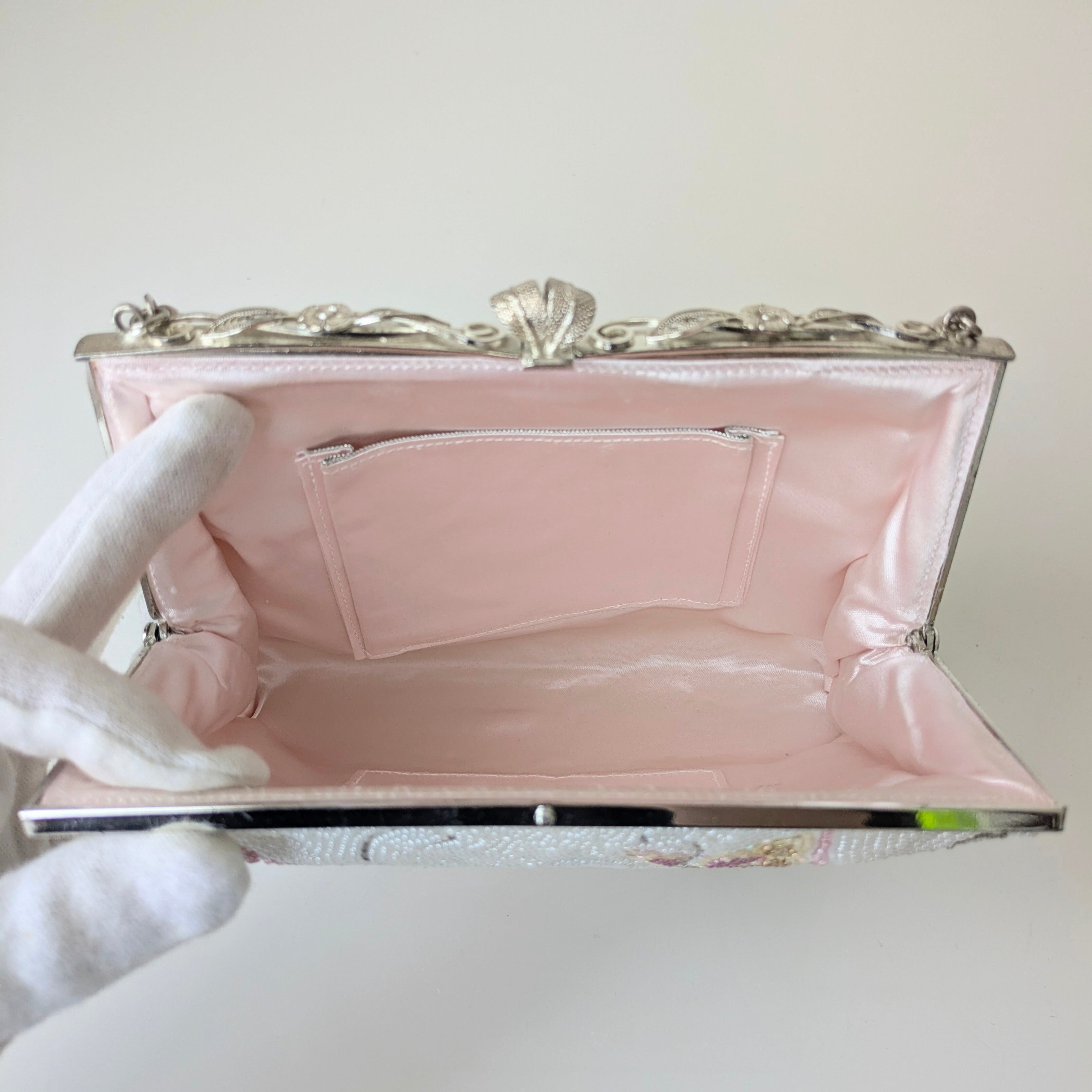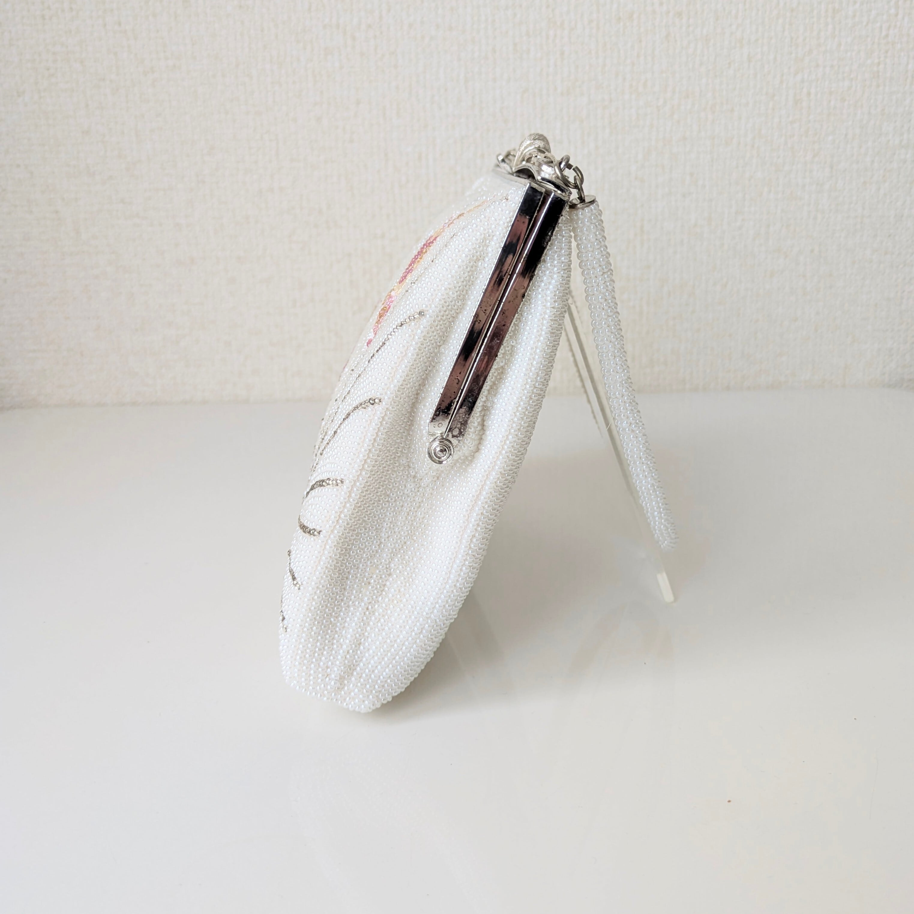 白色を背景に2羽の蝶が描かれたビーズバッグです。シルバーの線で描かれた蝶のシルエットが、ピンク色の2羽の蝶を引き立てているかのようなデザインです。