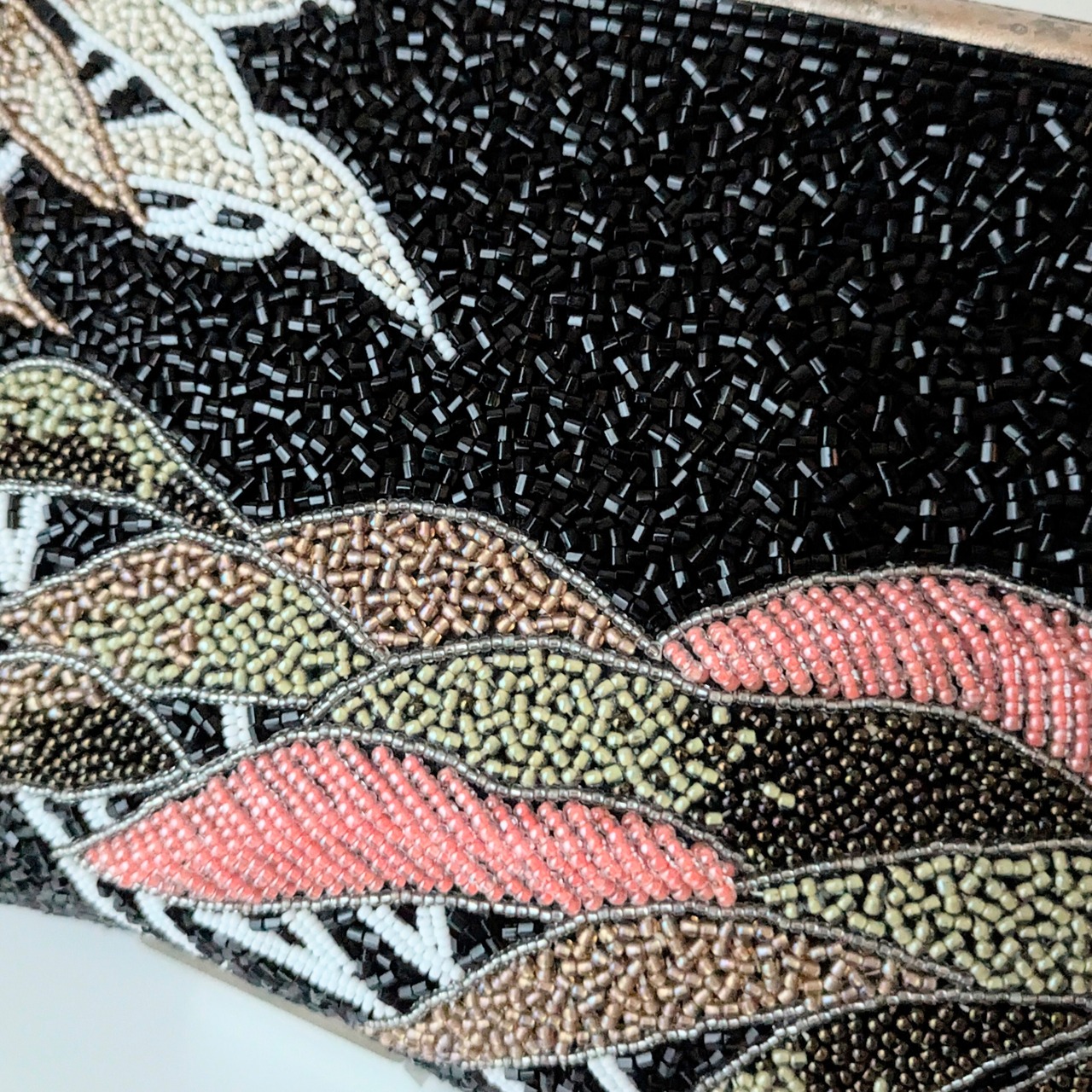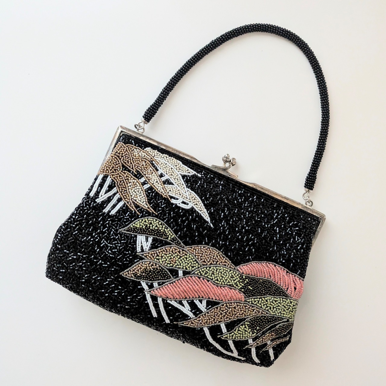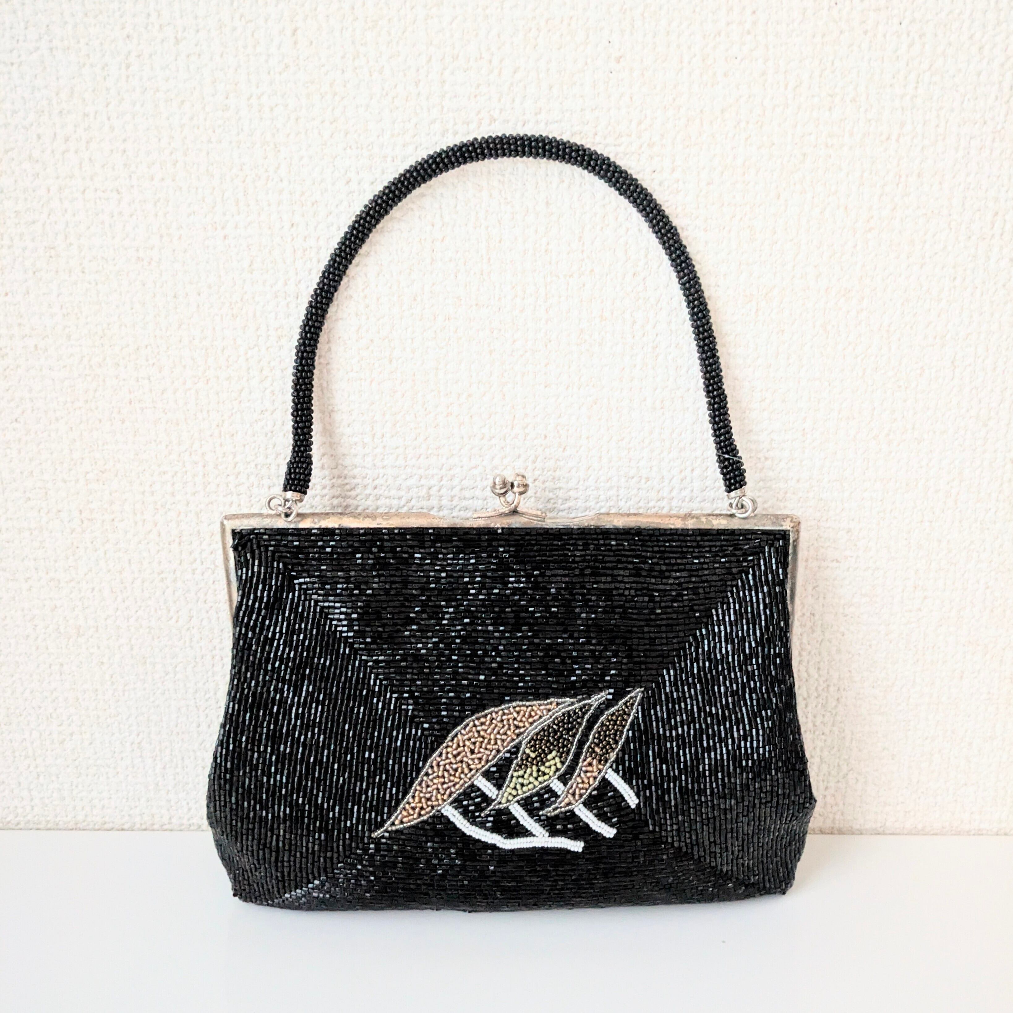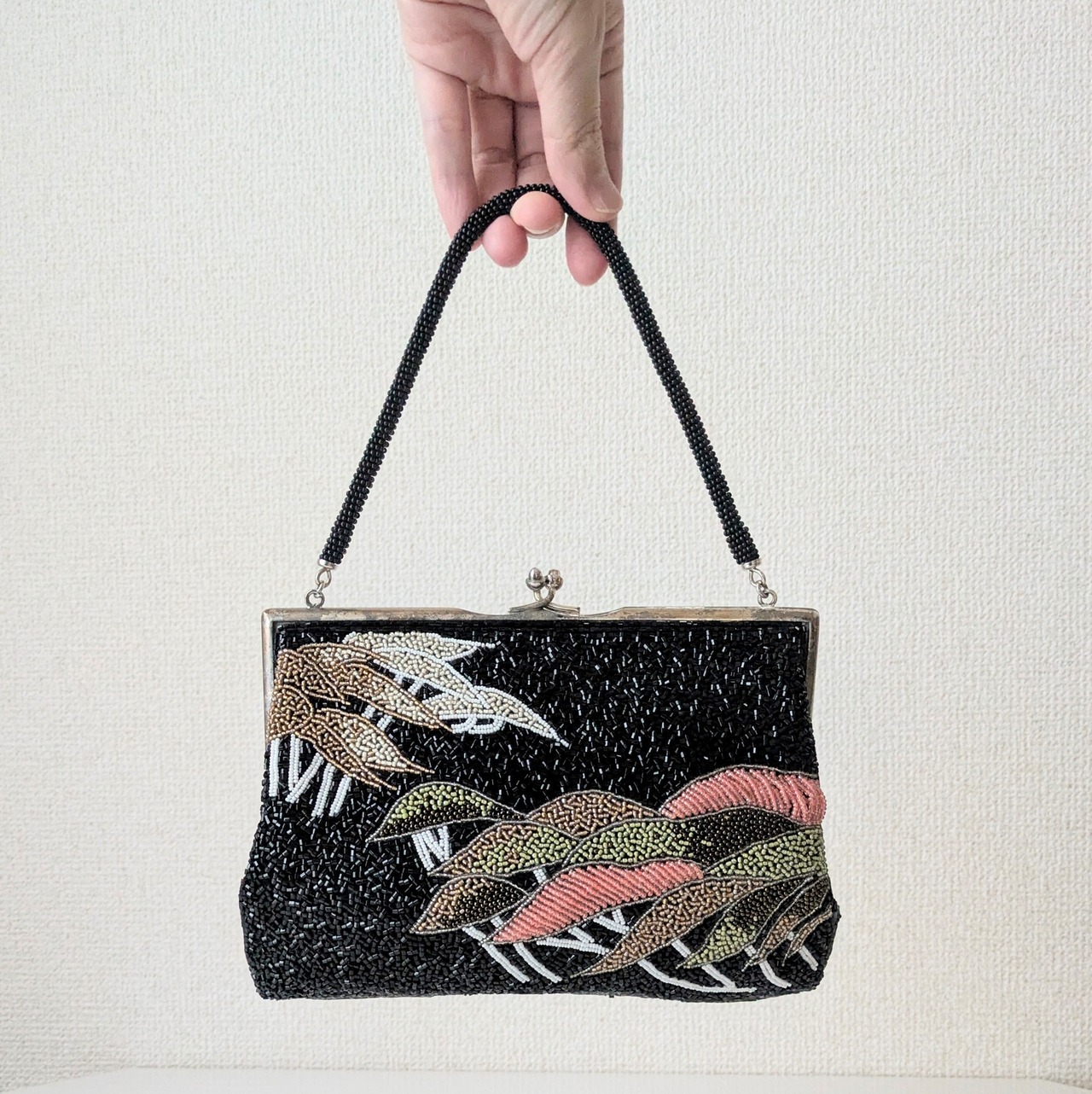 黒を背景に重なり合う松の柄があしらわれたビーズバッグです。緑から紅葉を思わせる赤褐色まで、葉の微妙な色合いの変化がビーズで繊細に表現されています。