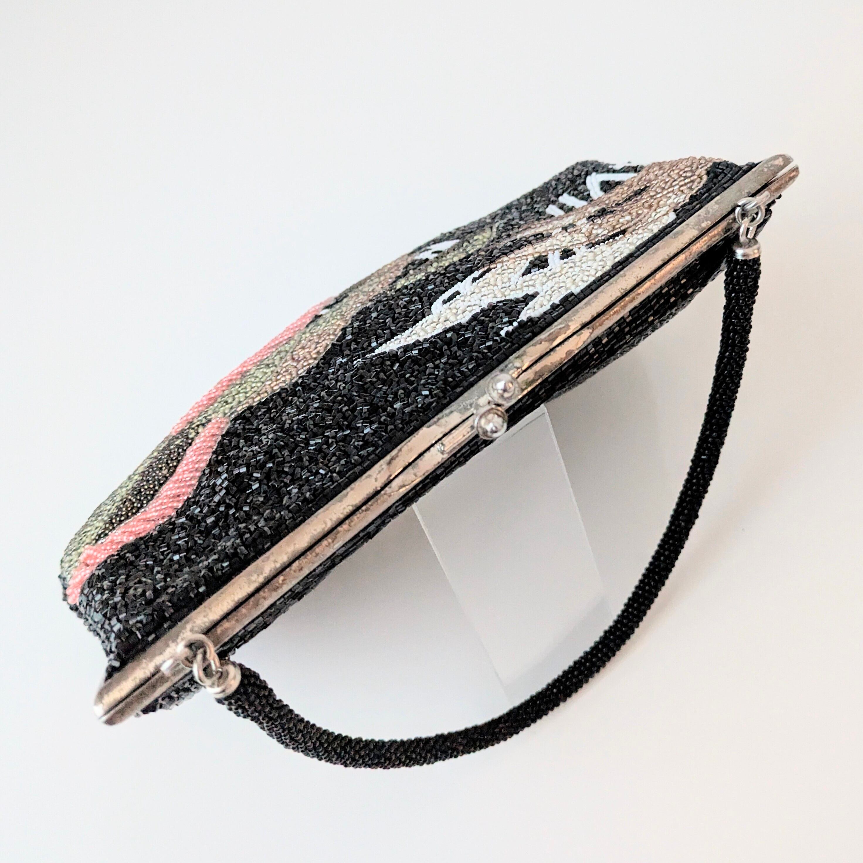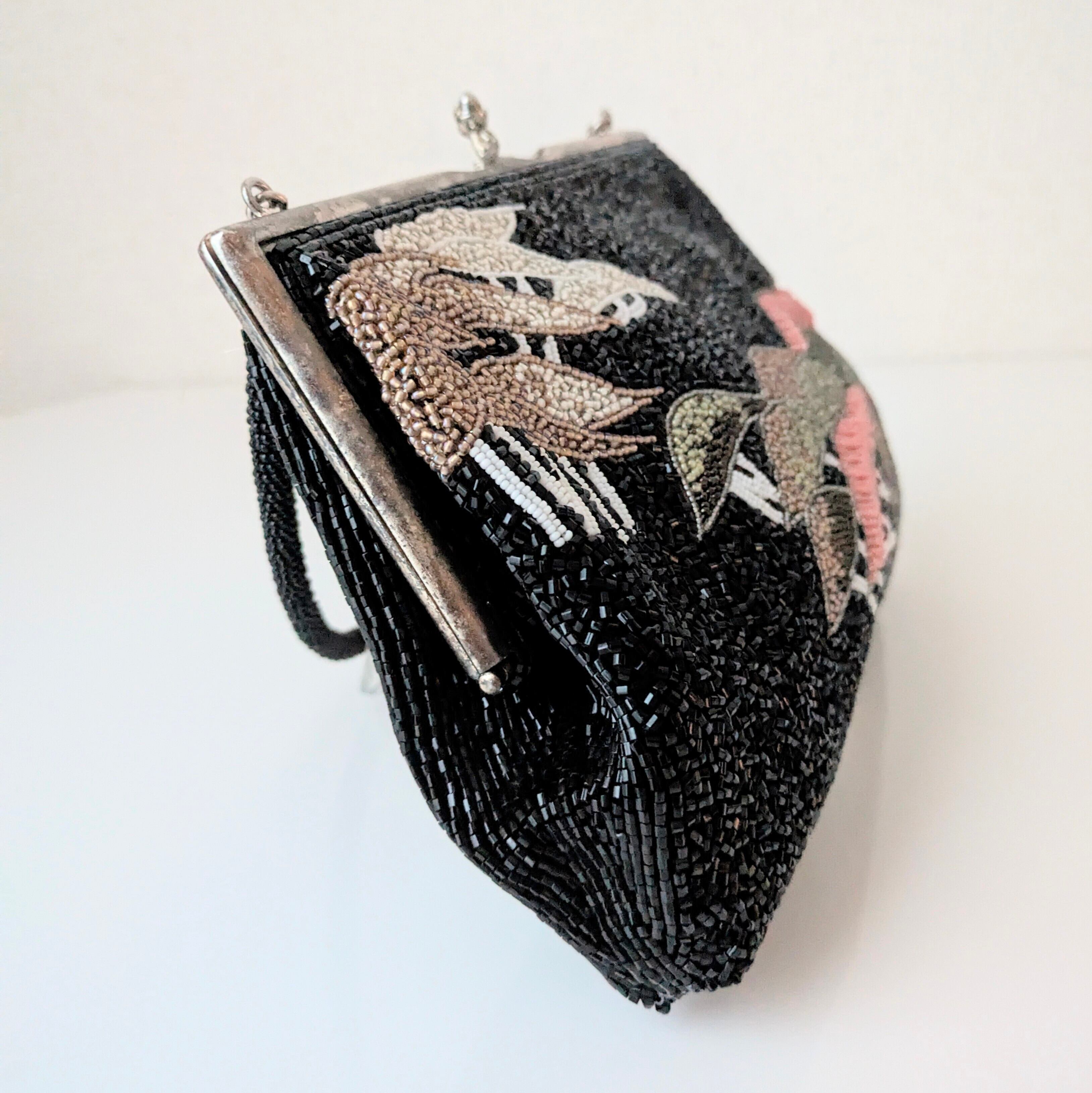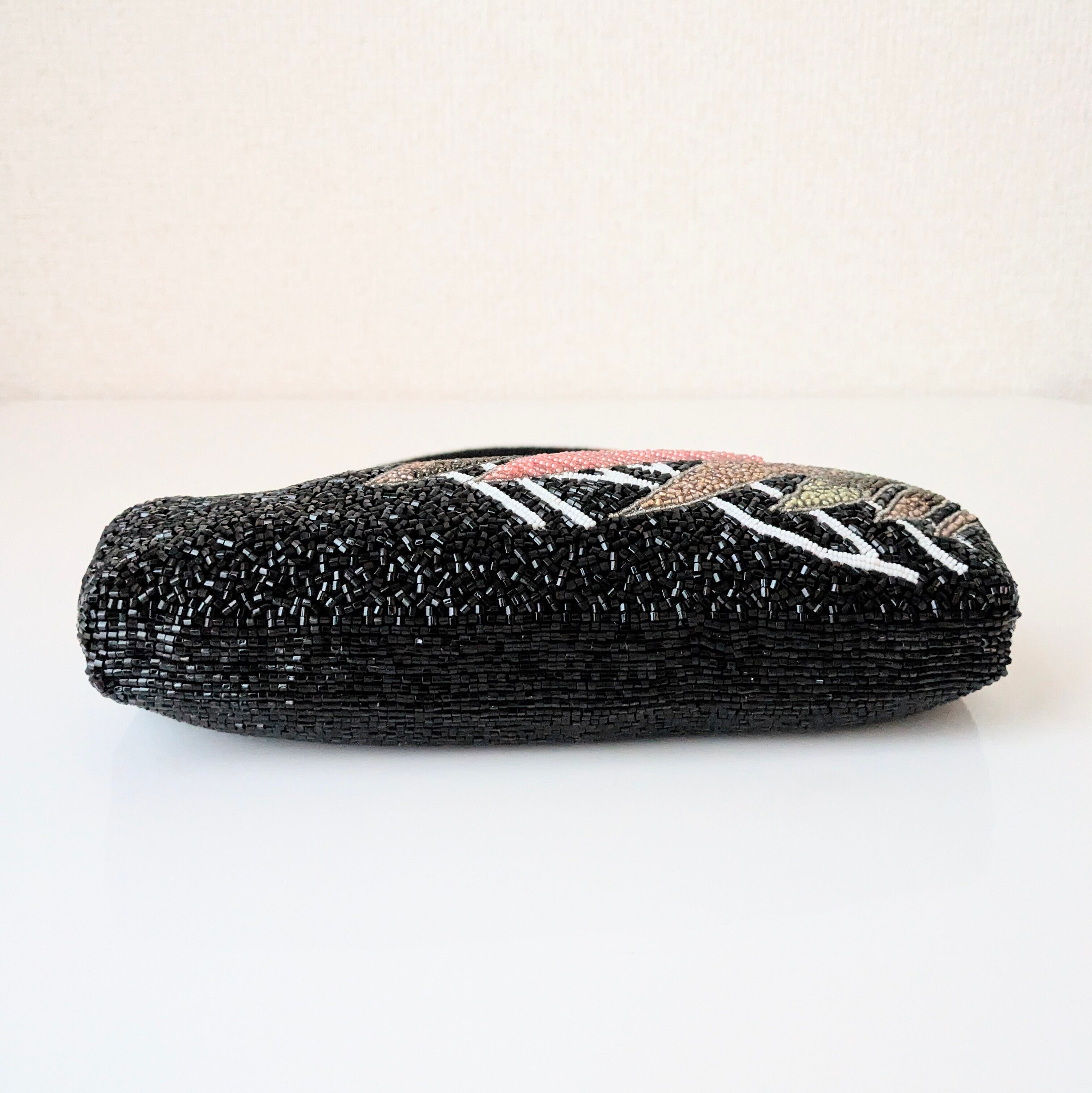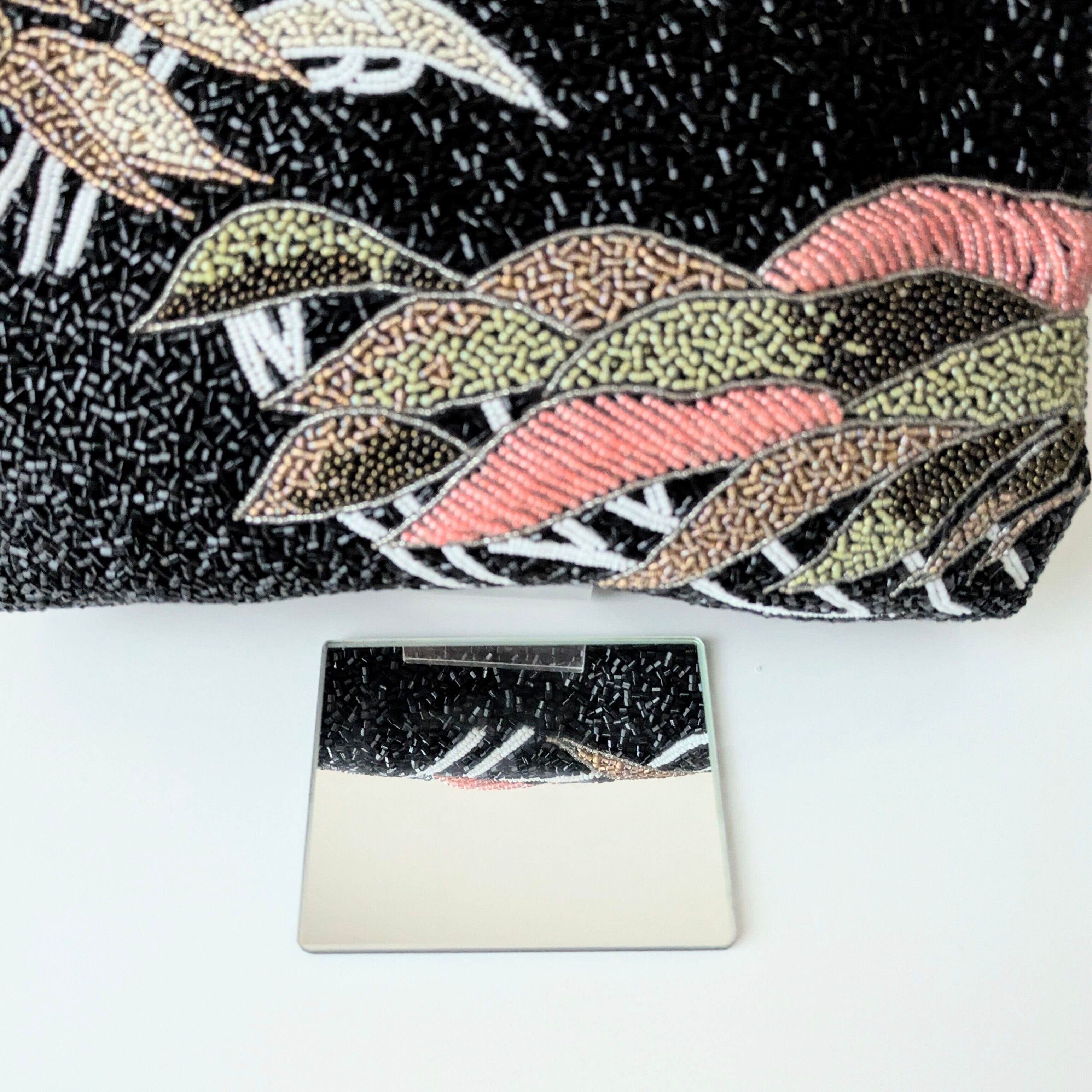 黒を背景に重なり合う松の柄があしらわれたビーズバッグです。緑から紅葉を思わせる赤褐色まで、葉の微妙な色合いの変化がビーズで繊細に表現されています。
