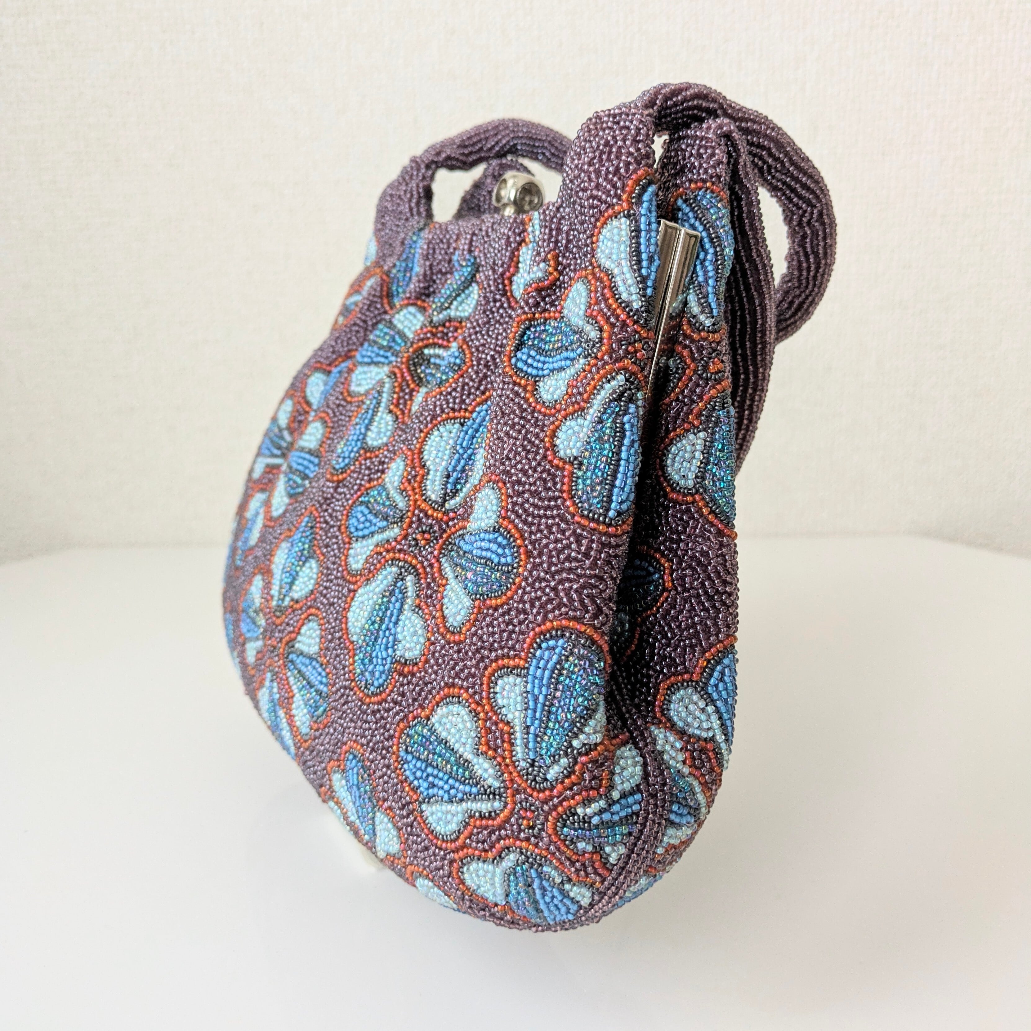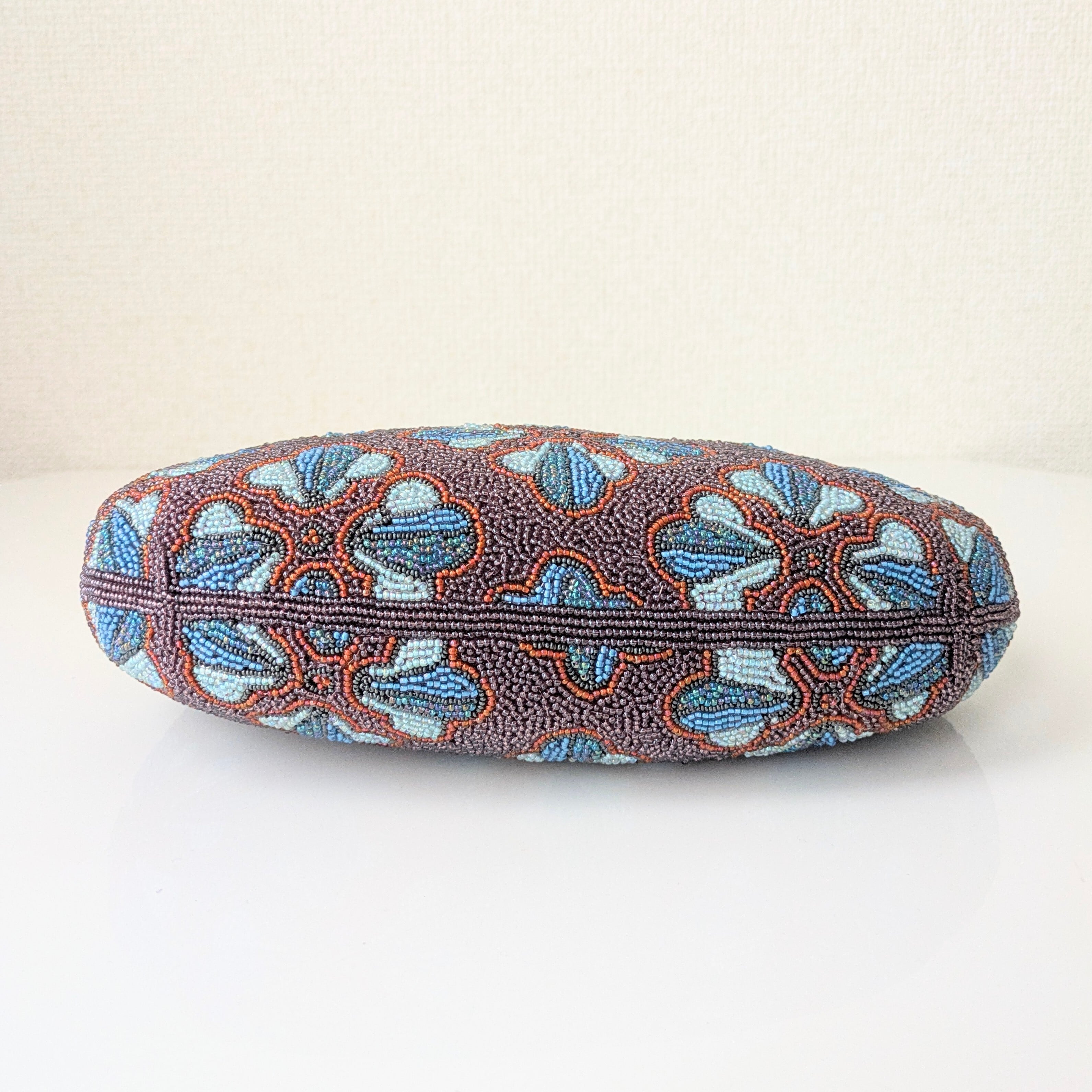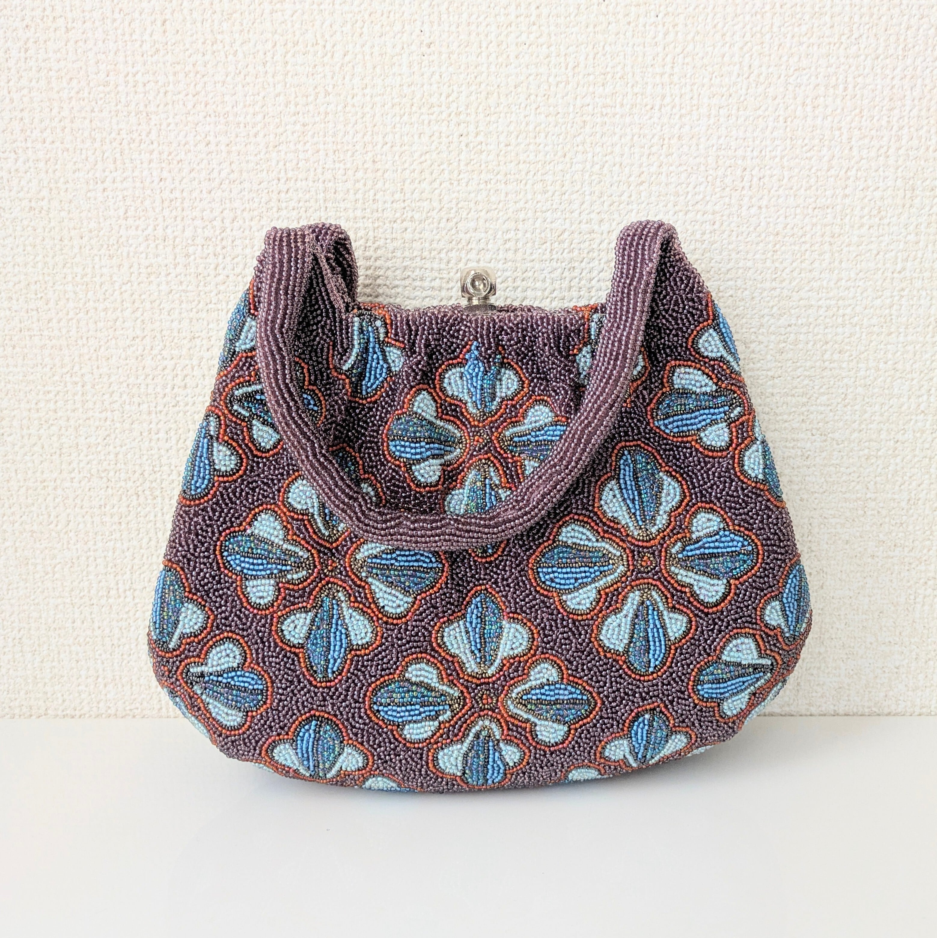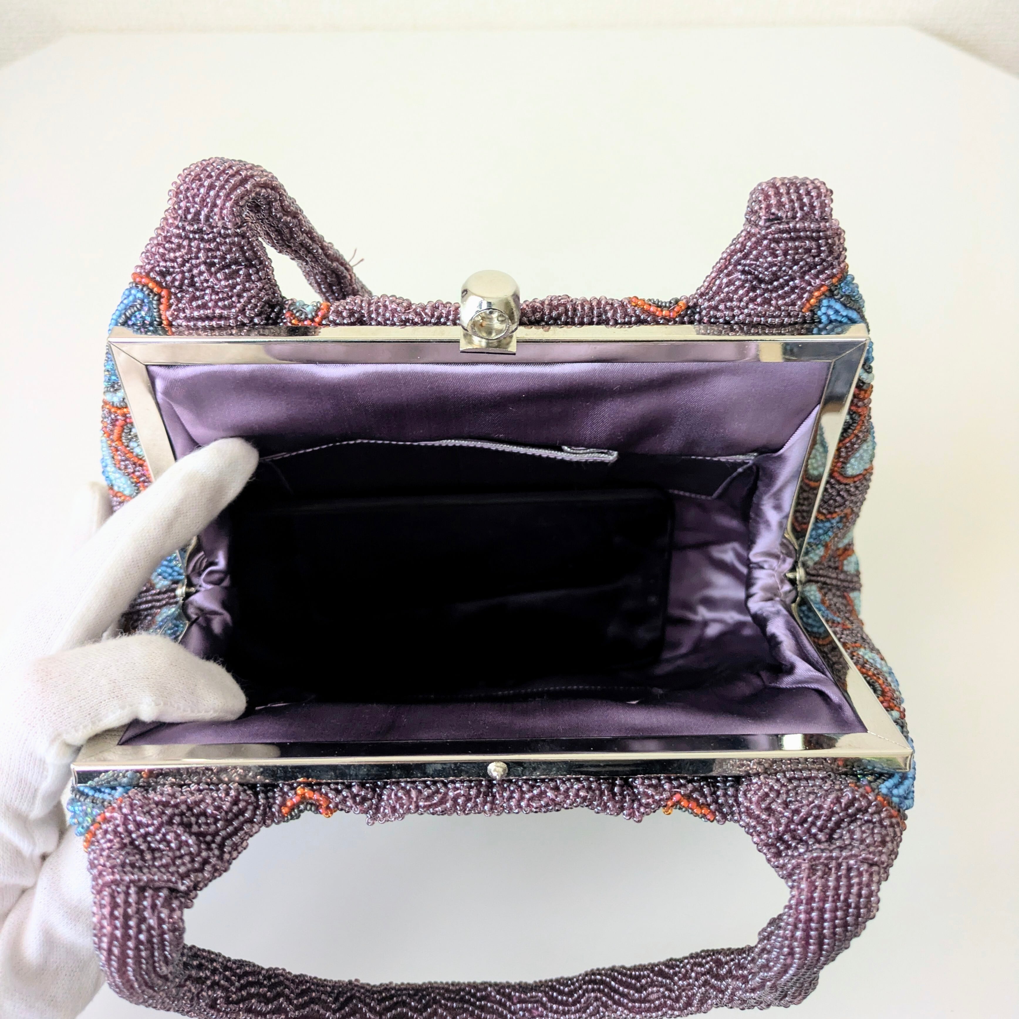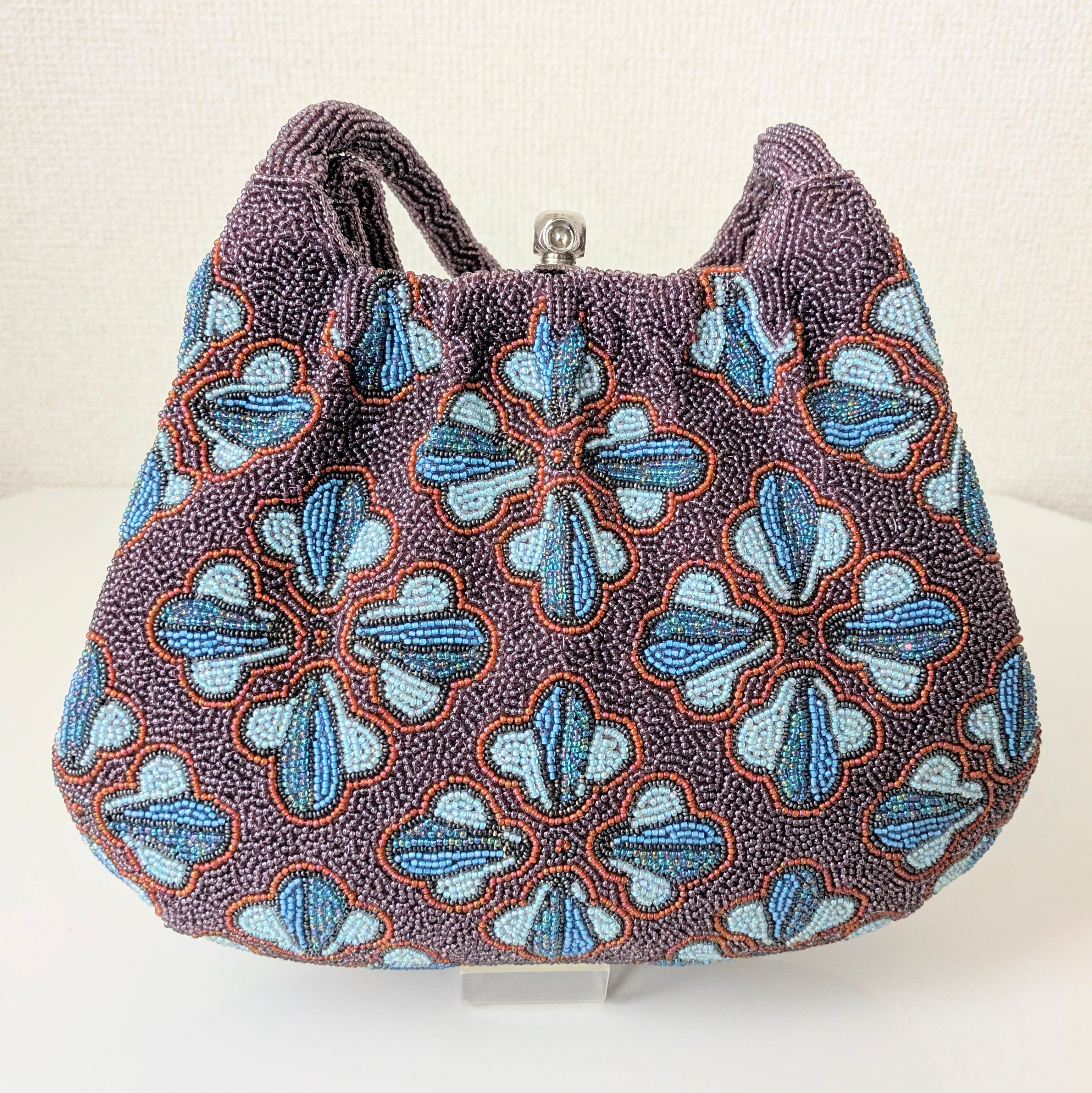 紫のベースに幾何学的な花柄をあしらったビーズバッグは、レトロでありながらもどこかポップな雰囲気を醸し出しています。まるで60年代のワンピースの柄のようで可愛らしいデザインです。