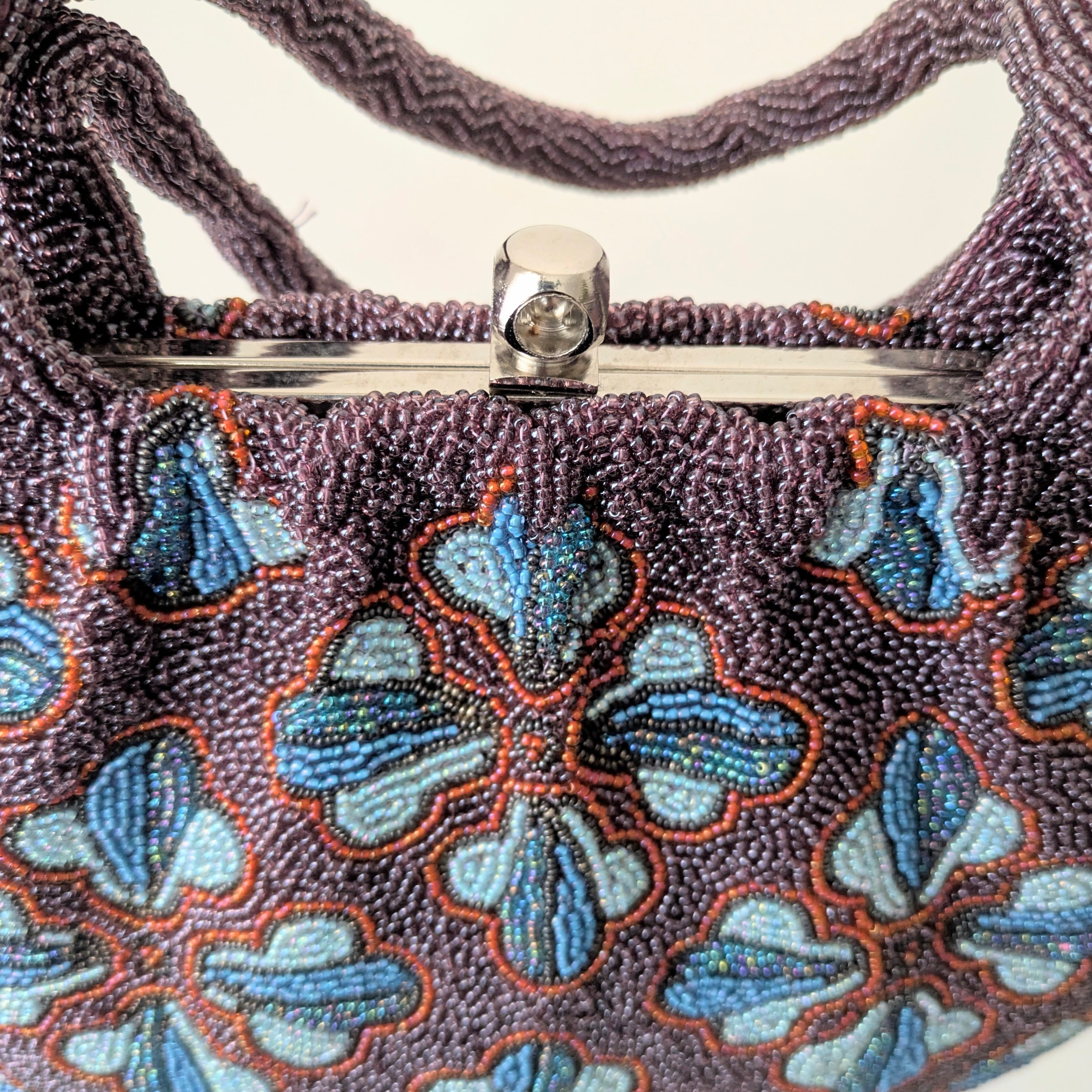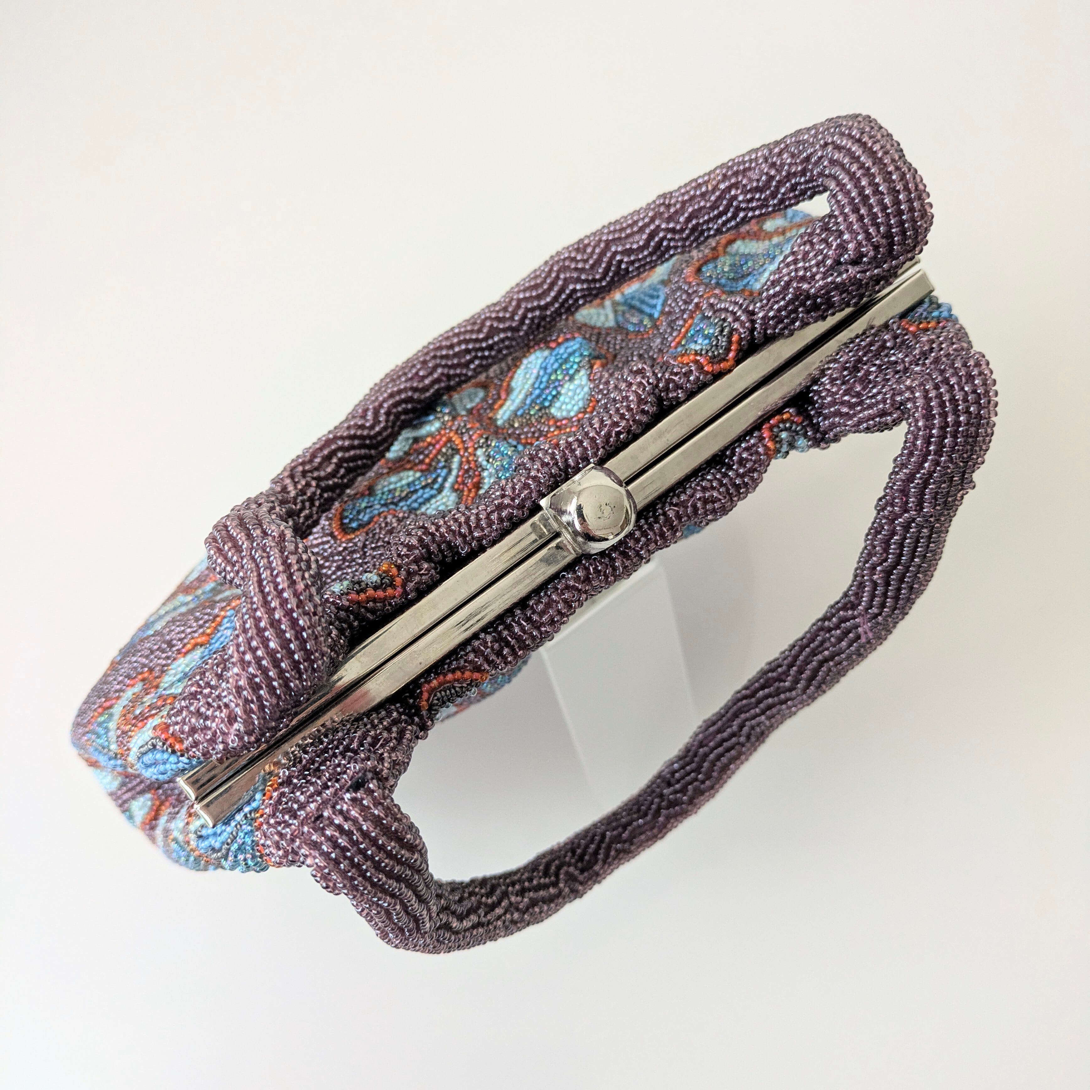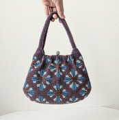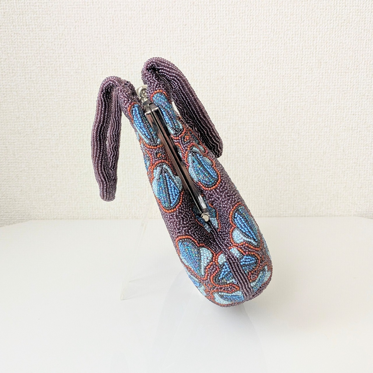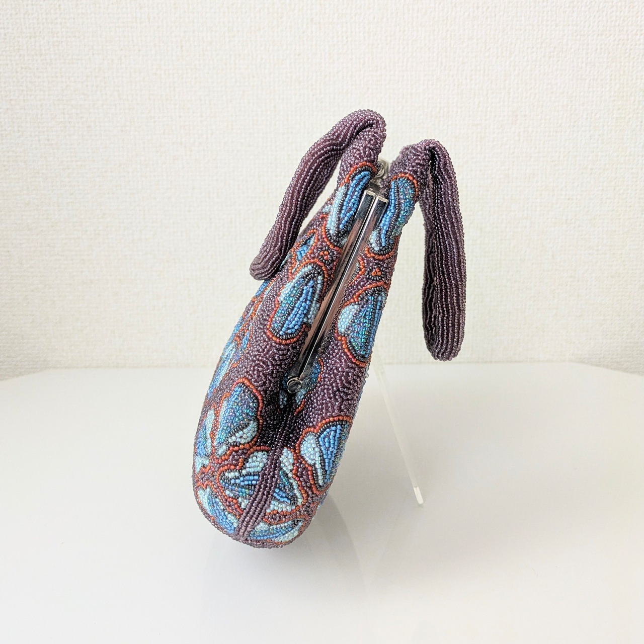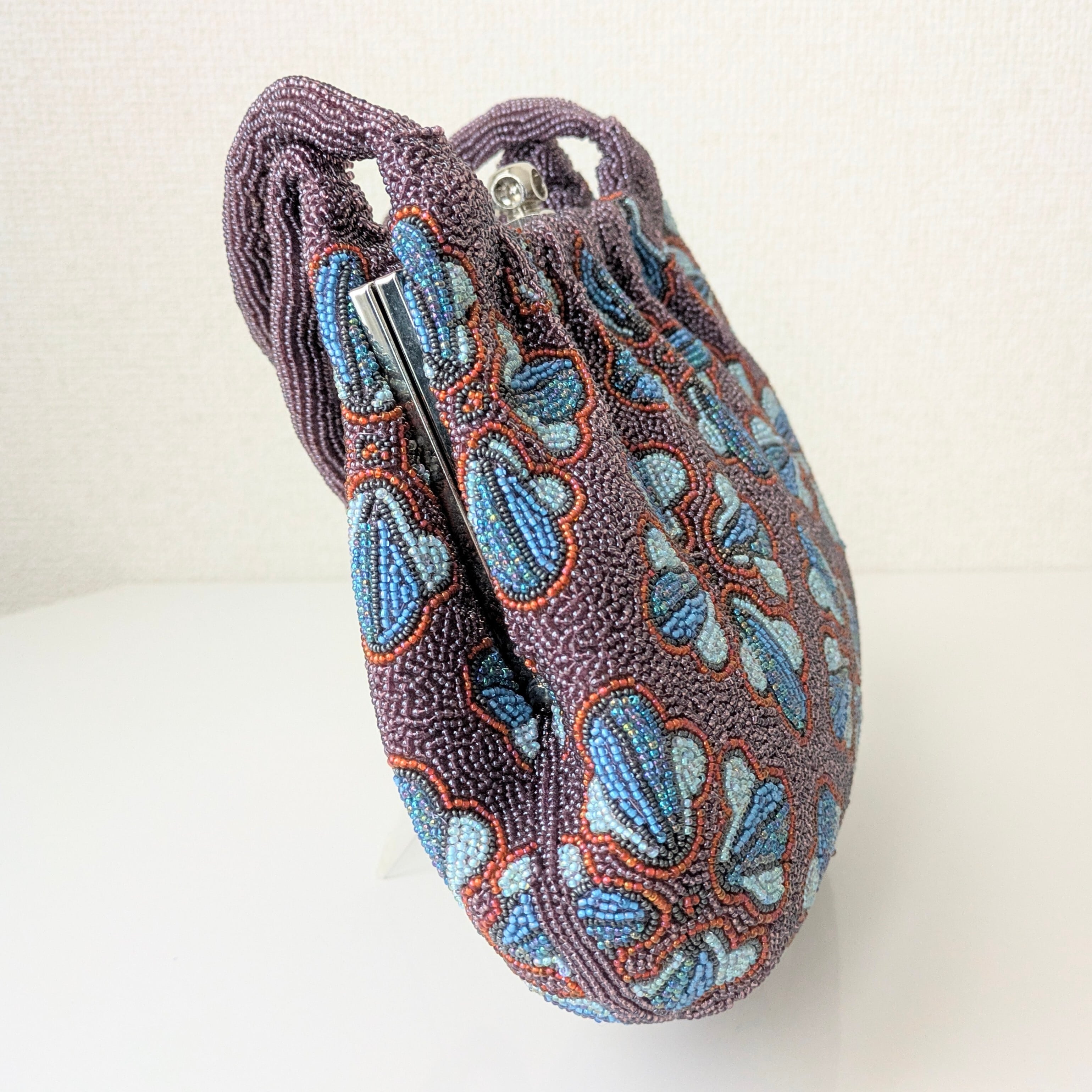 紫のベースに幾何学的な花柄をあしらったビーズバッグは、レトロでありながらもどこかポップな雰囲気を醸し出しています。まるで60年代のワンピースの柄のようで可愛らしいデザインです。