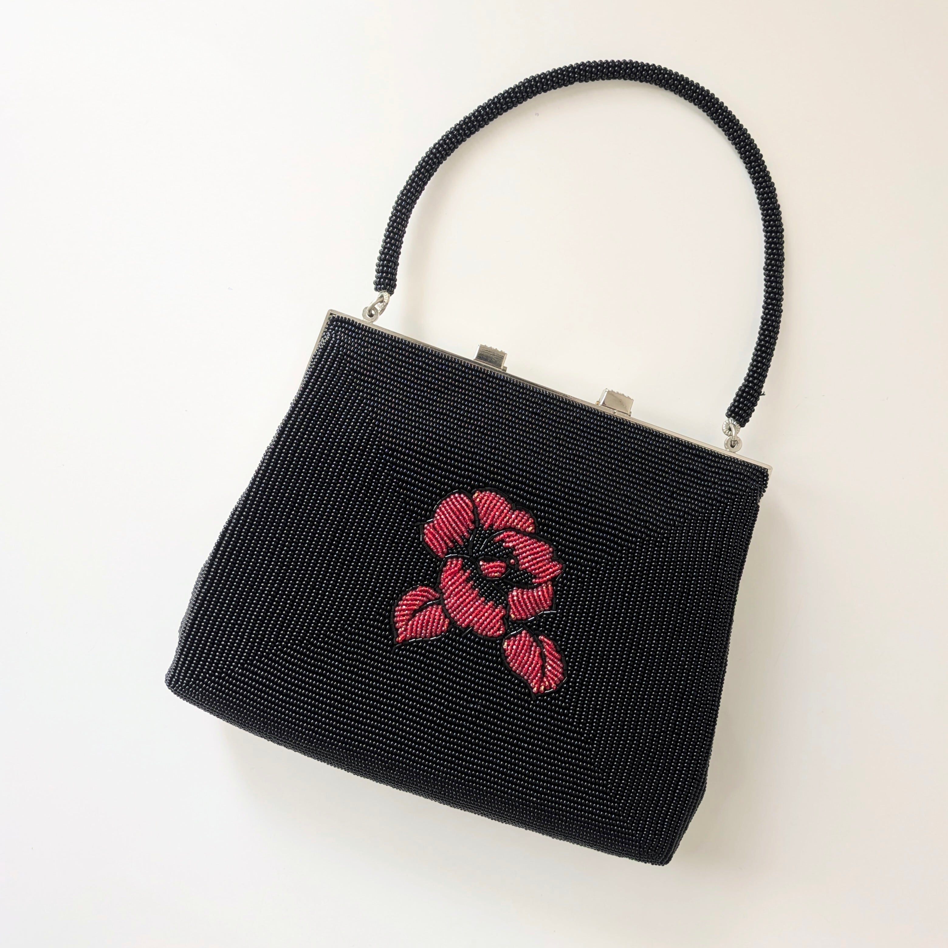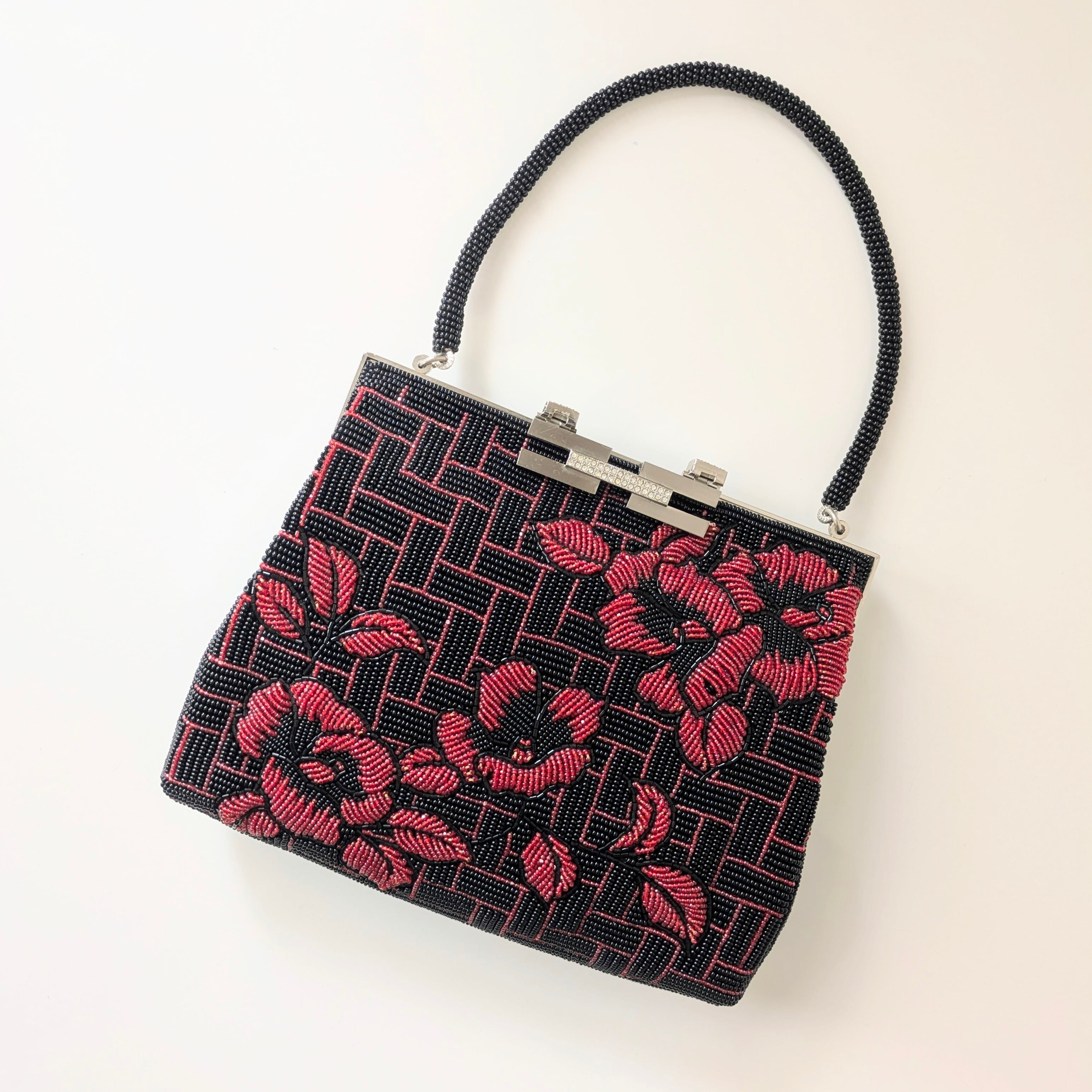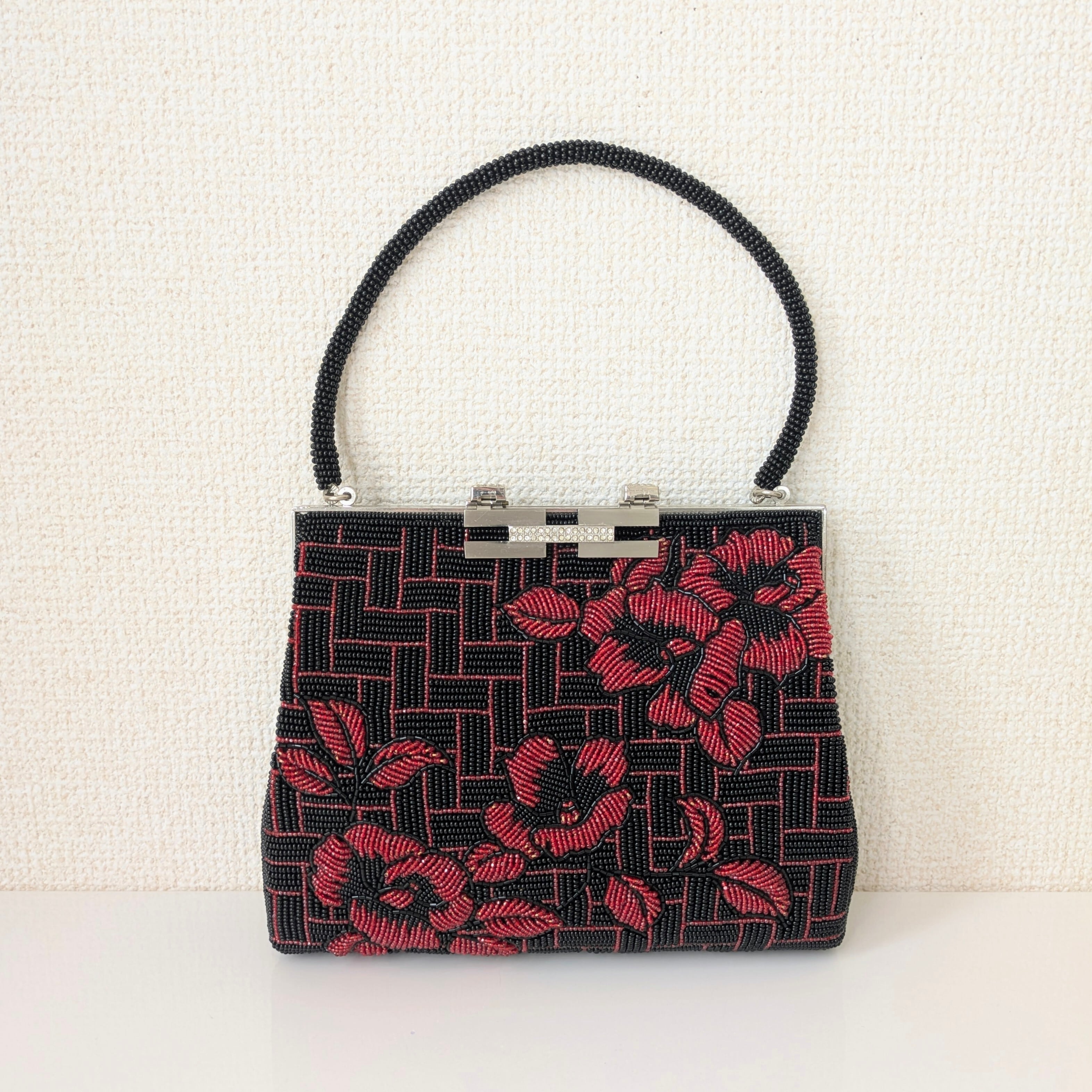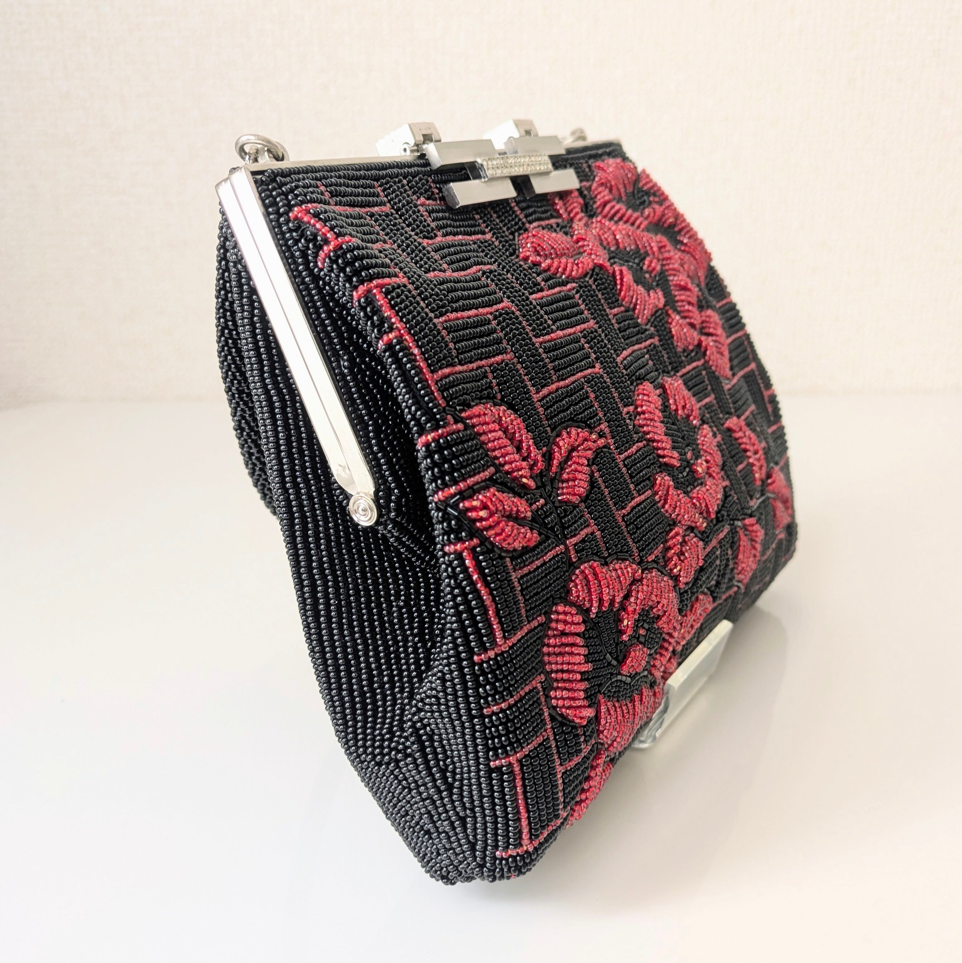 【Vintage】ビーズ刺繍バッグ 黒 赤 椿柄 パーティーバッグ クラッチバッグ 昭和レトロ 大正浪漫 フォーマルバッグ