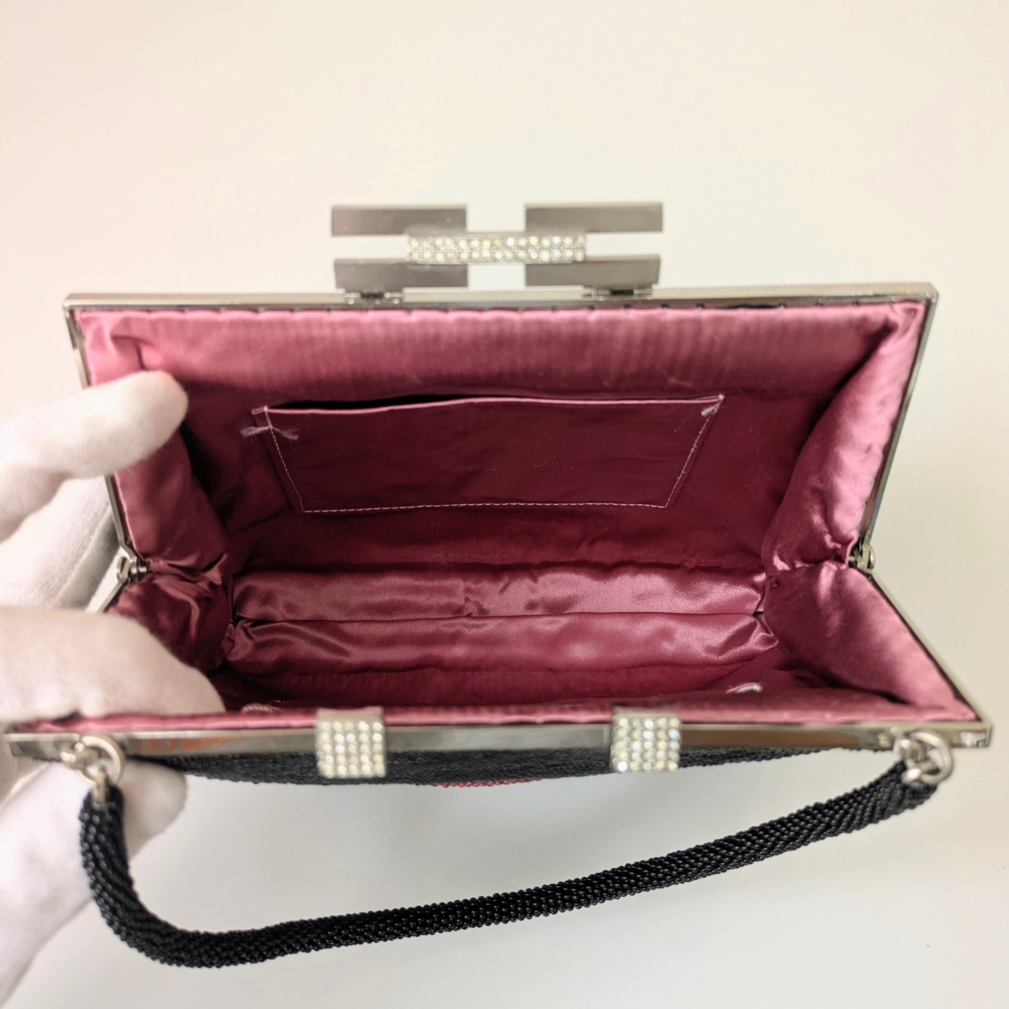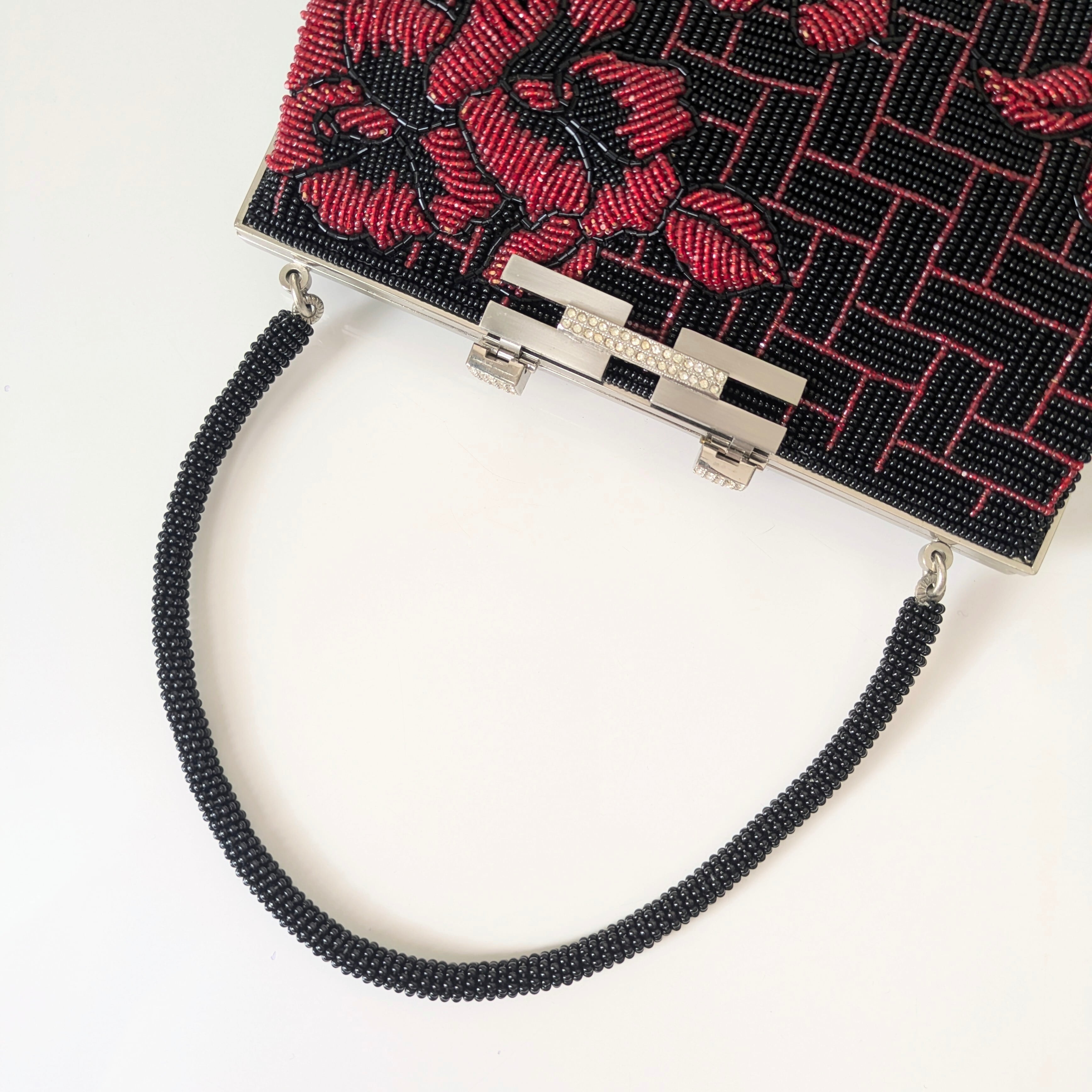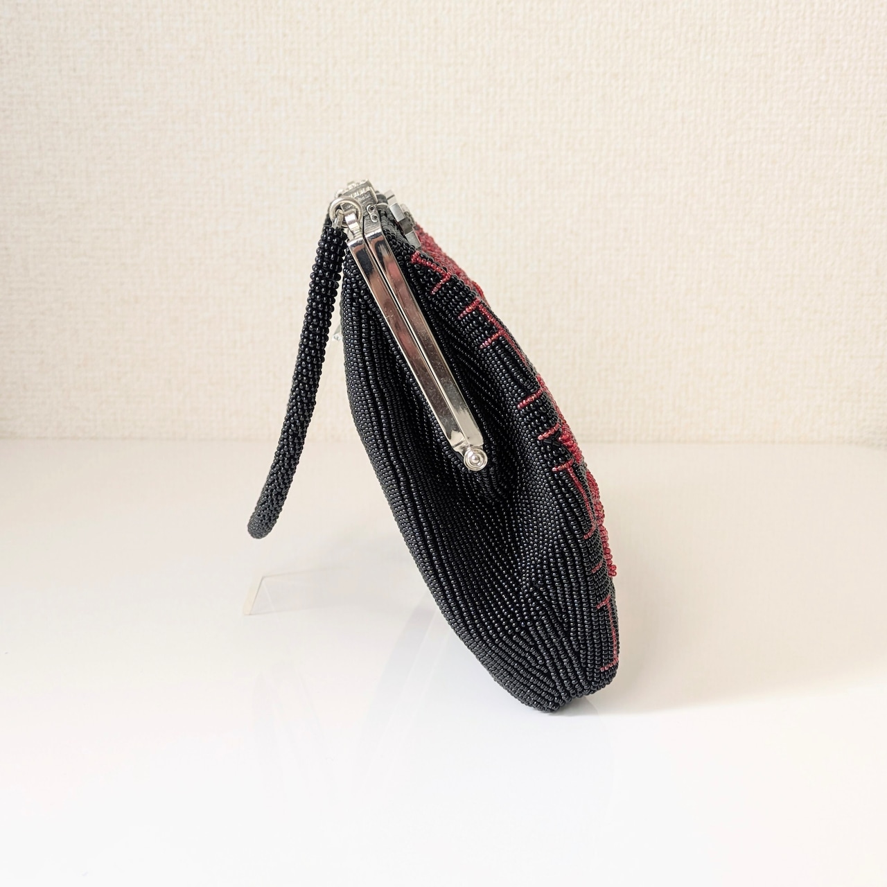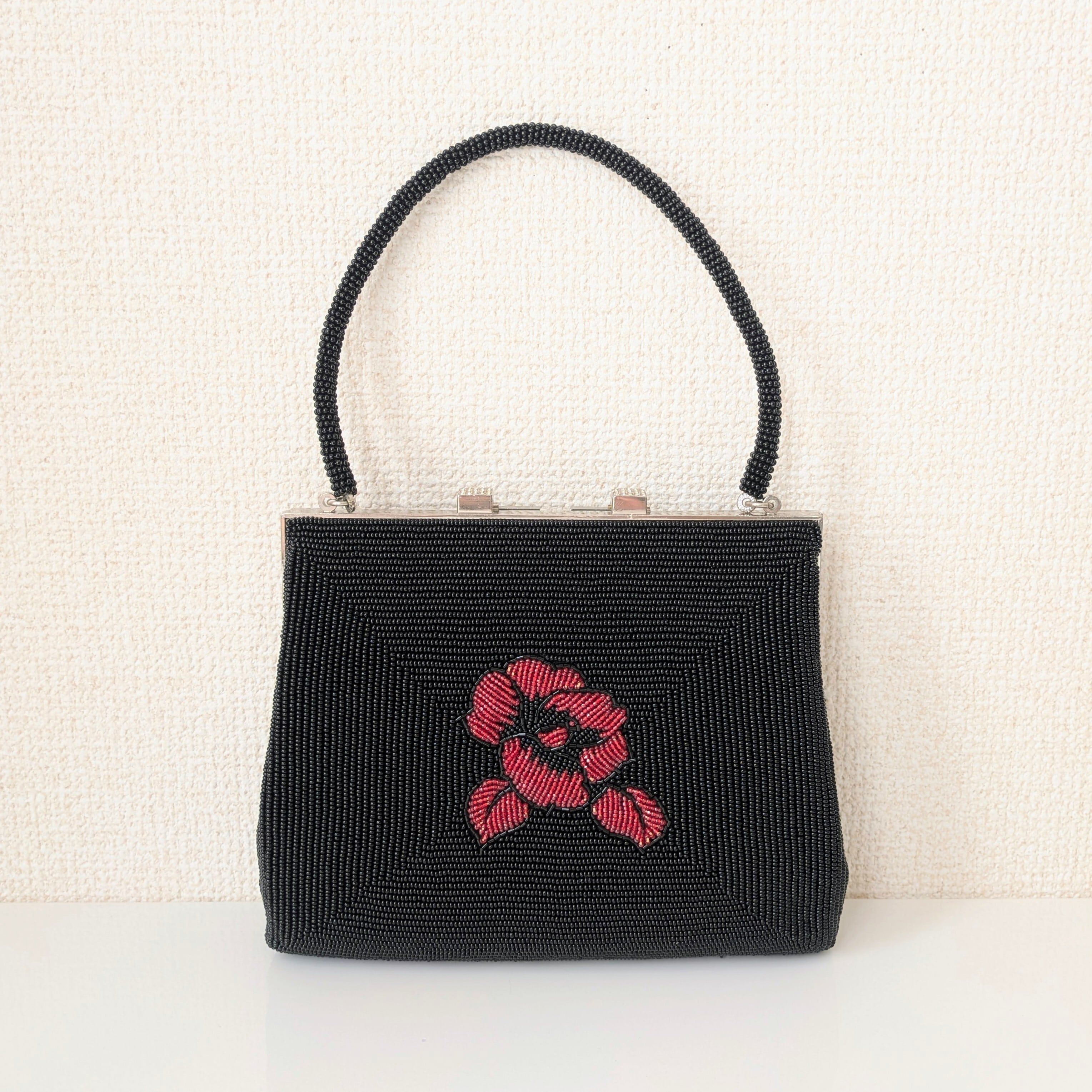 【Vintage】ビーズ刺繍バッグ 黒 赤 椿柄 パーティーバッグ クラッチバッグ 昭和レトロ 大正浪漫 フォーマルバッグ