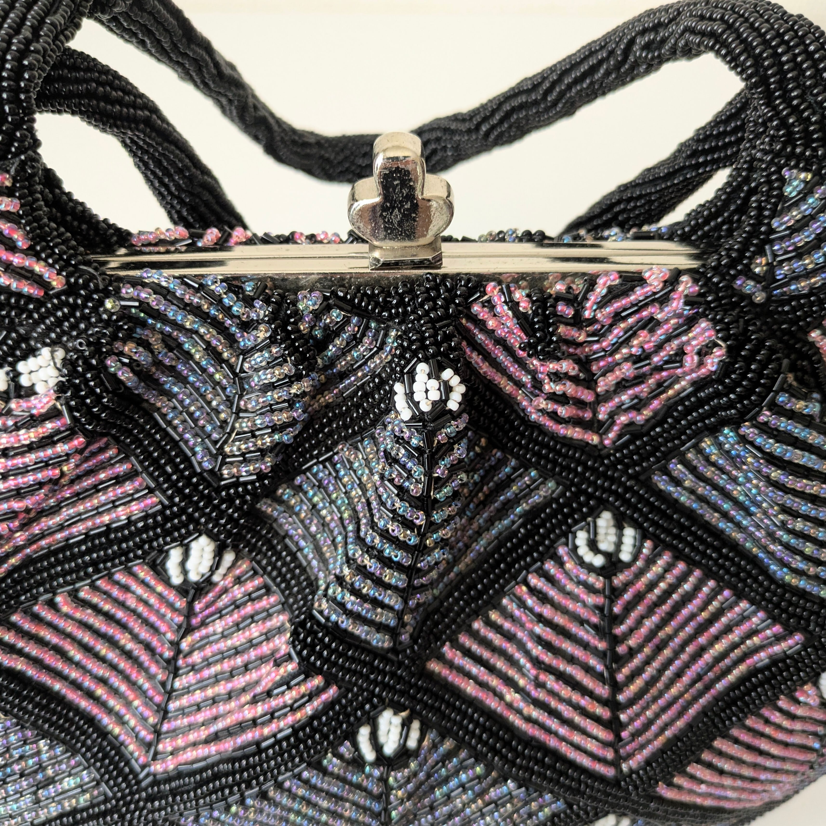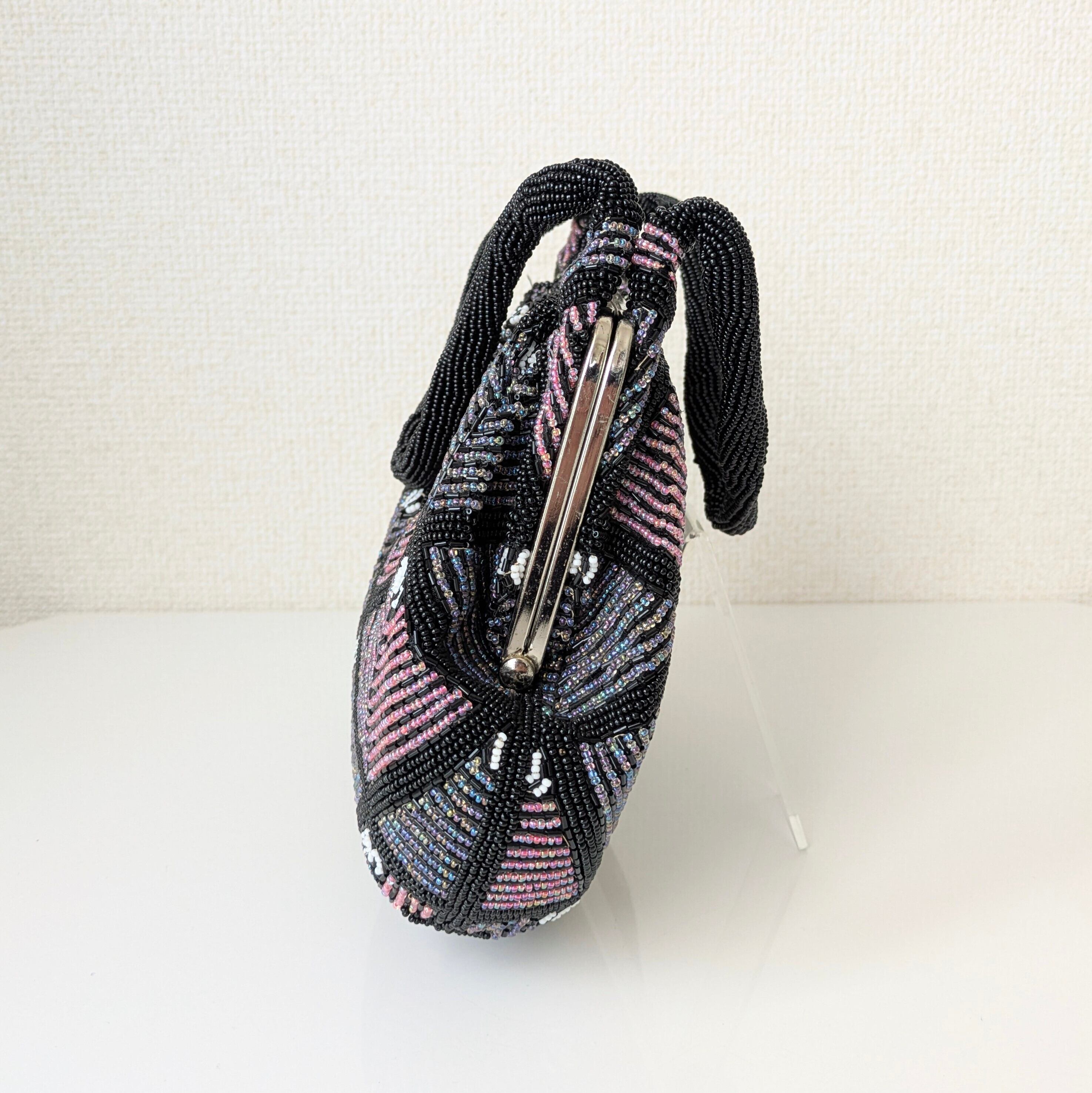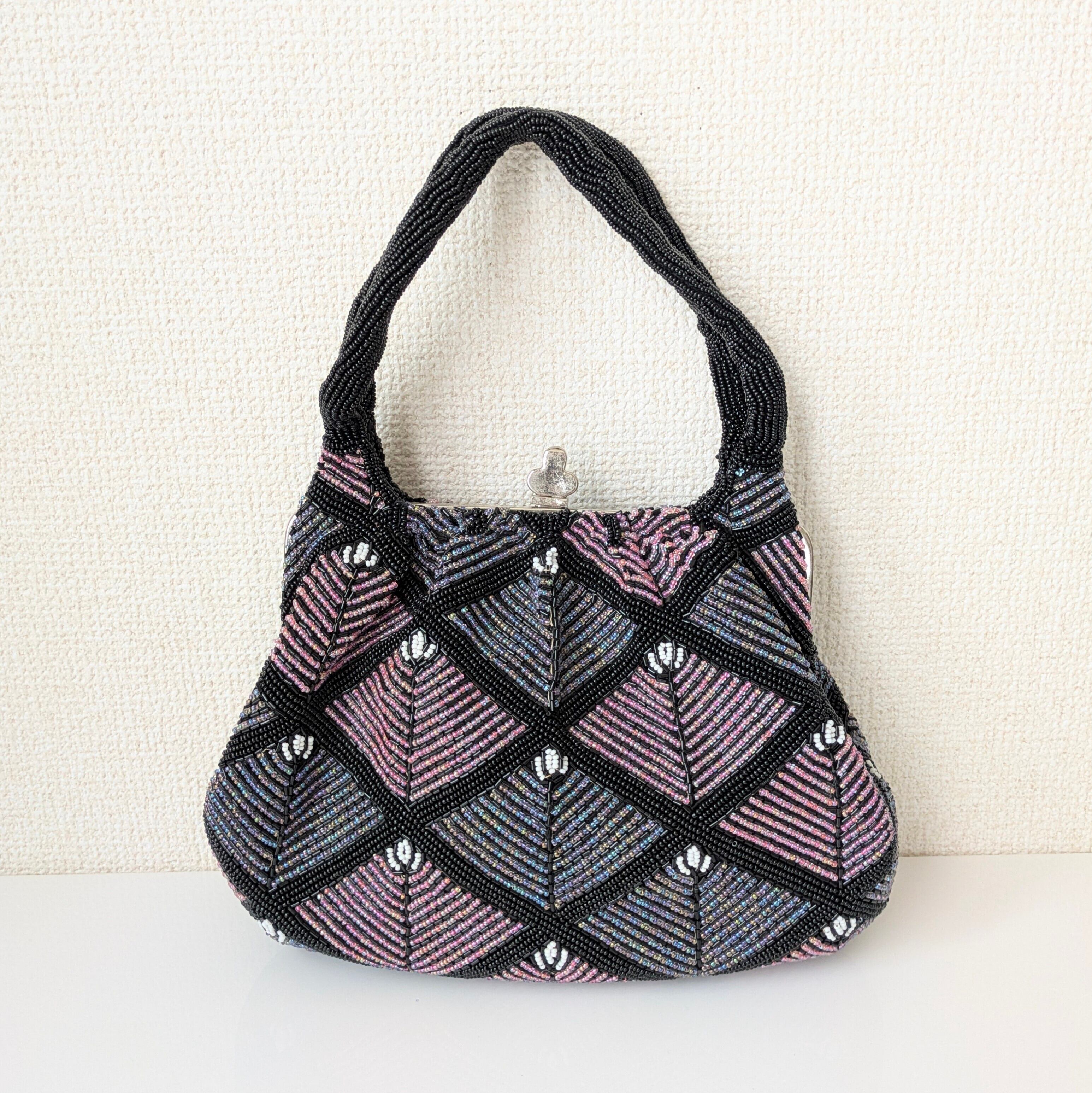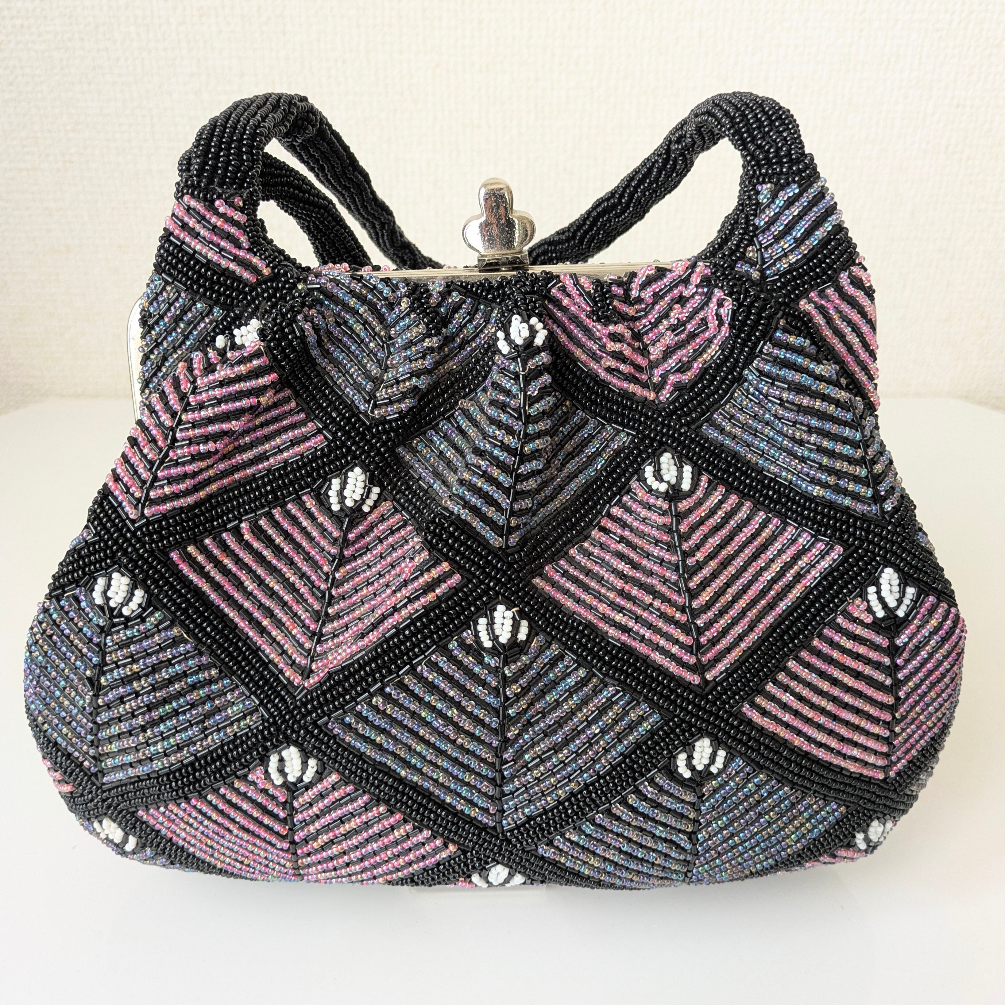 【Vintage】ビーズ刺繍バッグ 黒 若松菱文様 幾何学模様 パーティーバッグ クラッチバッグ 昭和レトロ 大正浪漫 フォーマルバッグ