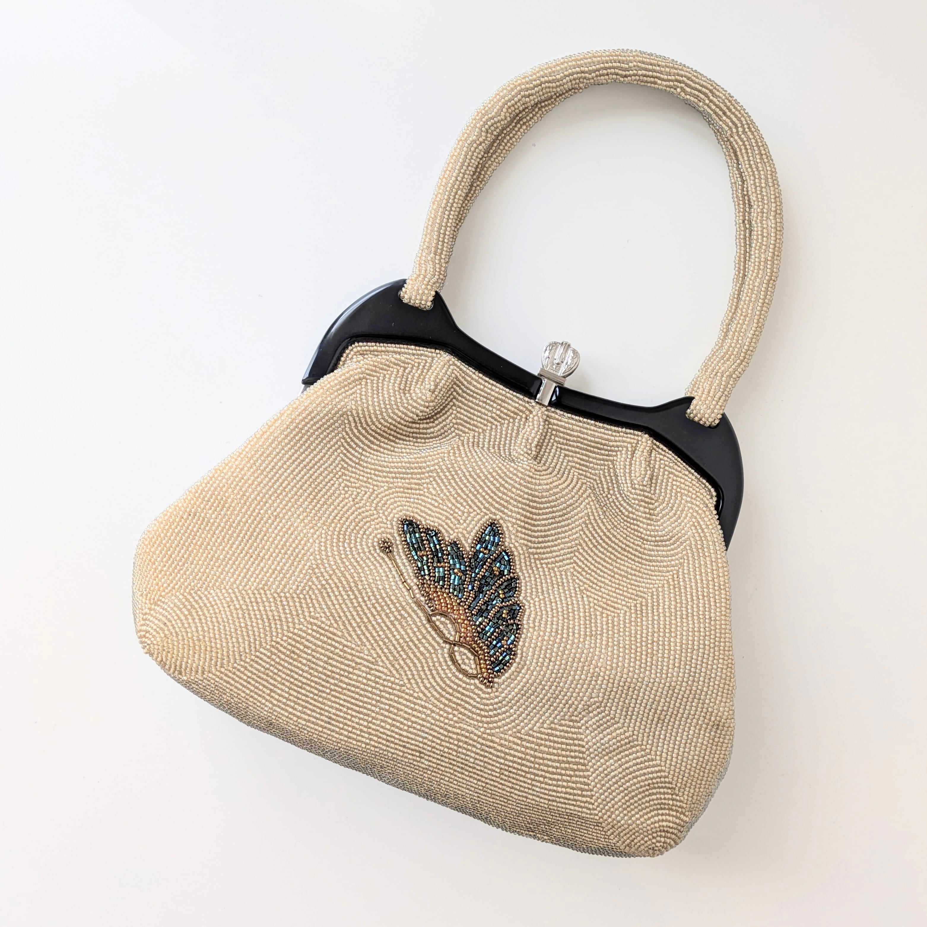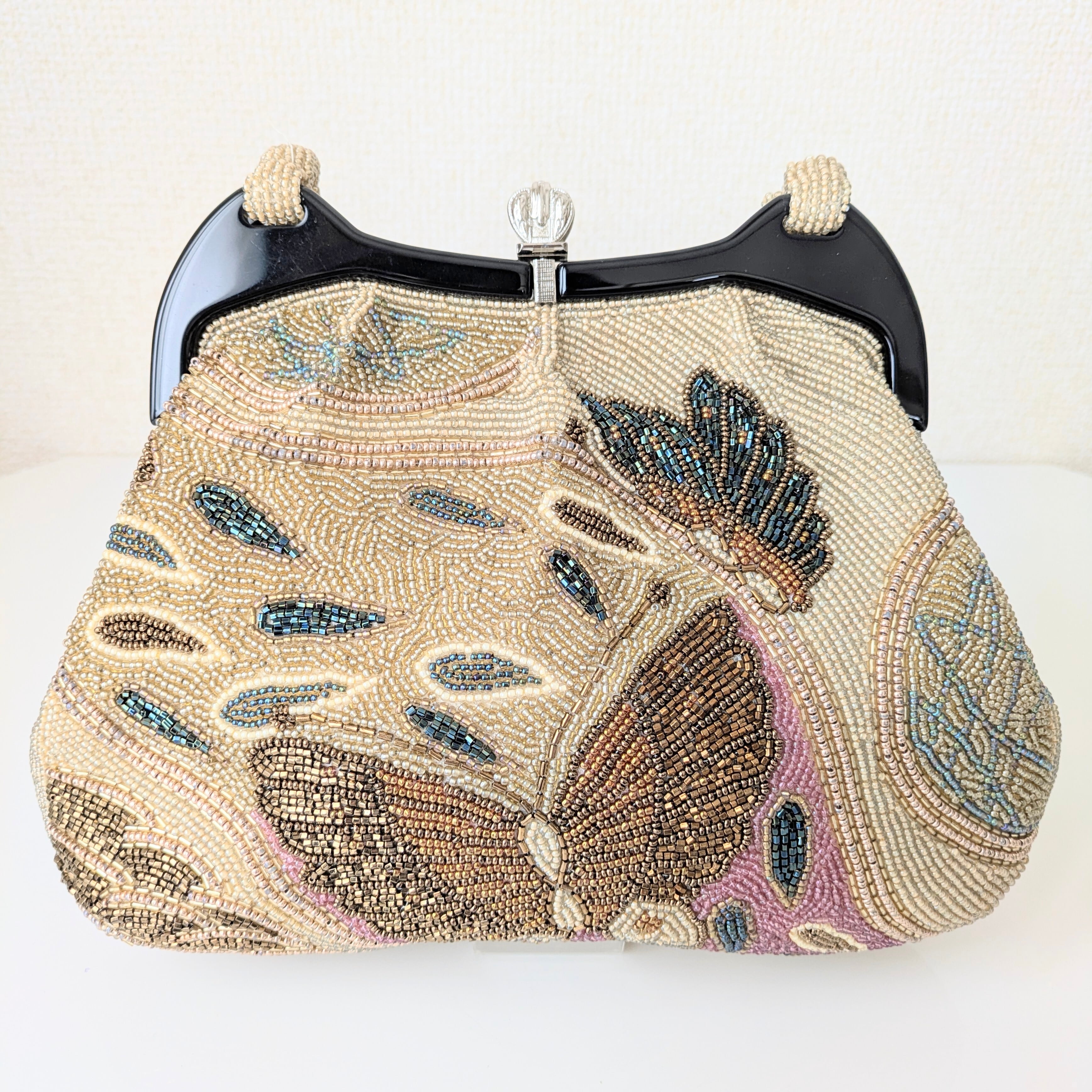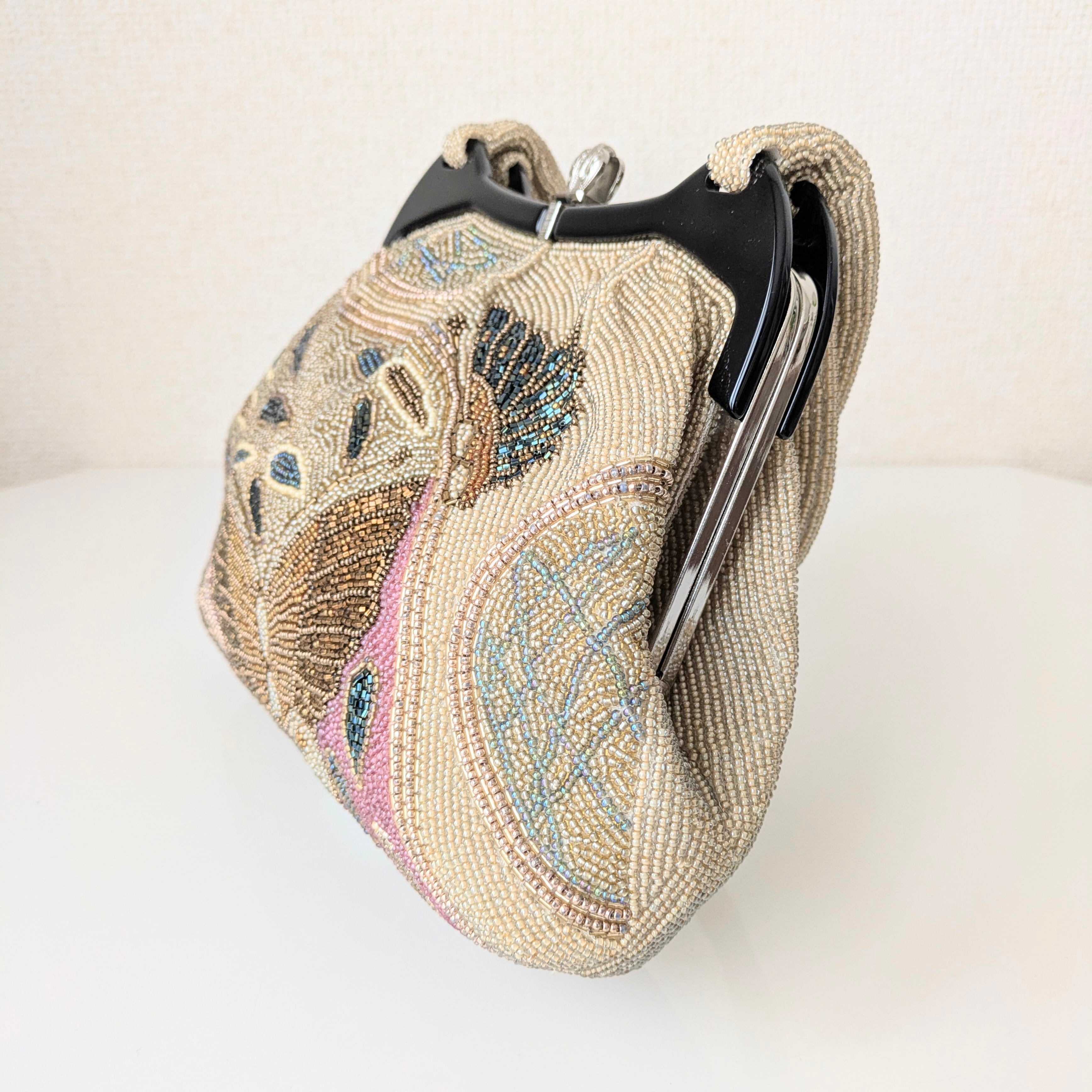 【Vintage】ビーズ刺繍バッグ ベージュ 蝶柄 パーティーバッグ クラッチバッグ 昭和レトロ 大正浪漫 フォーマルバッグ