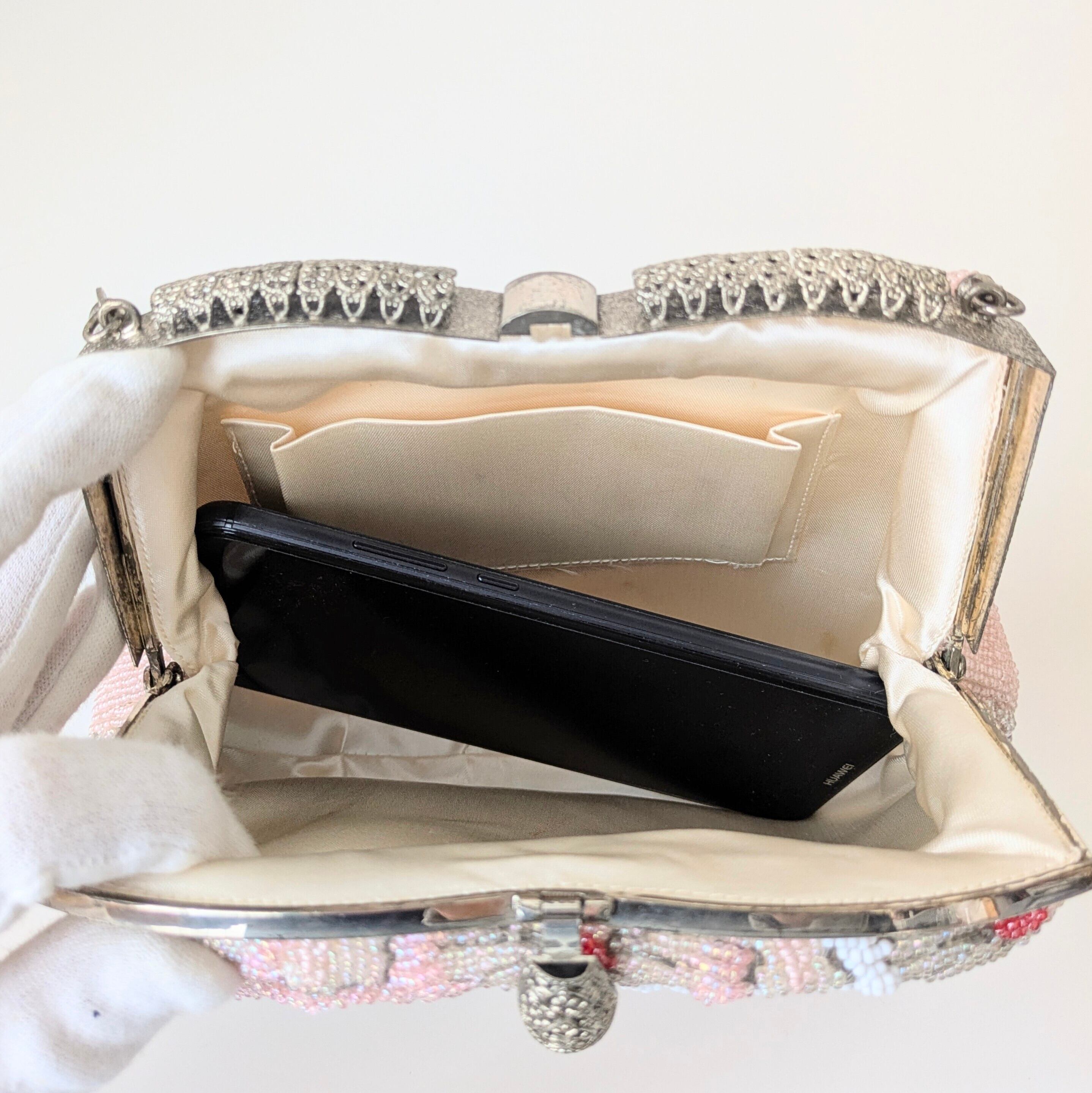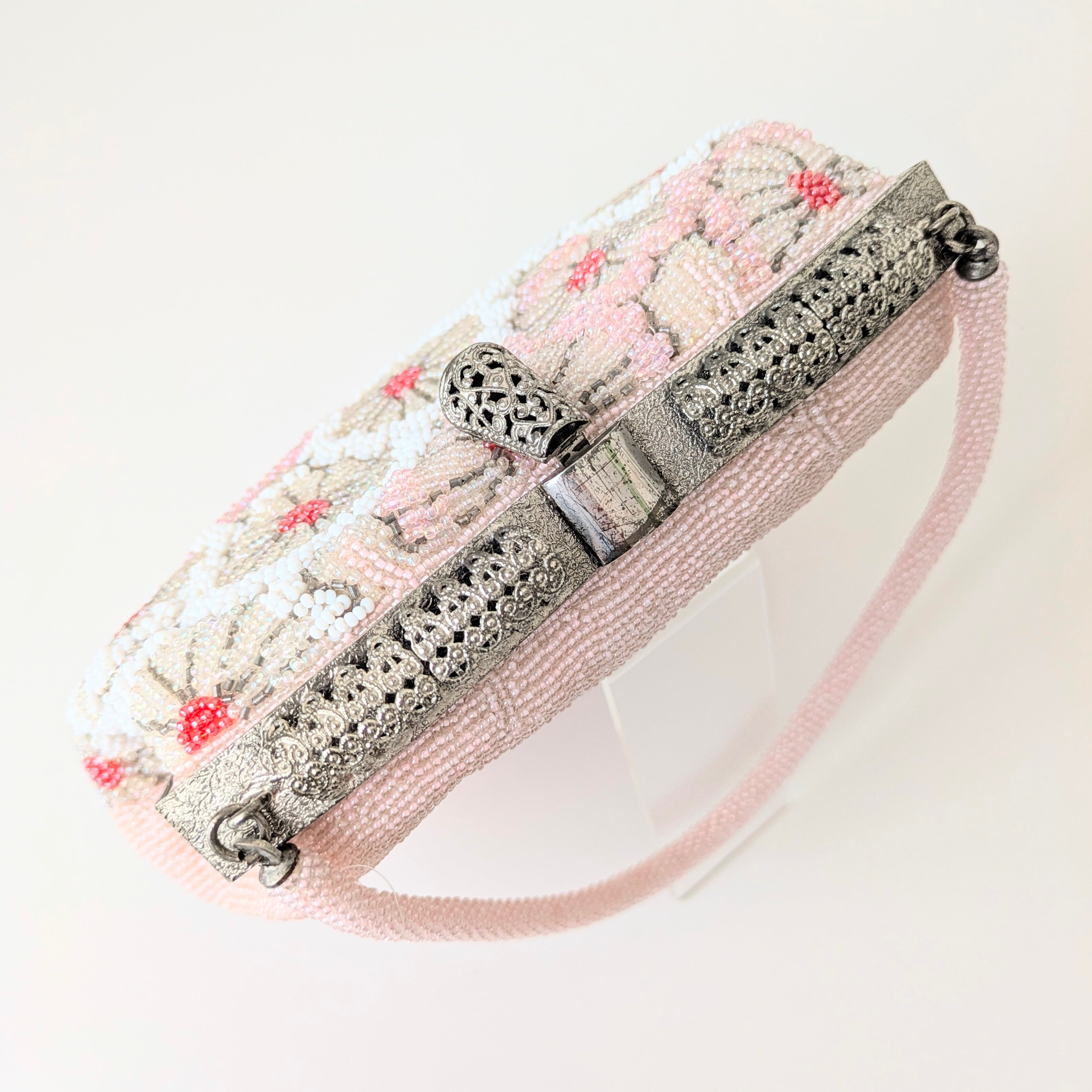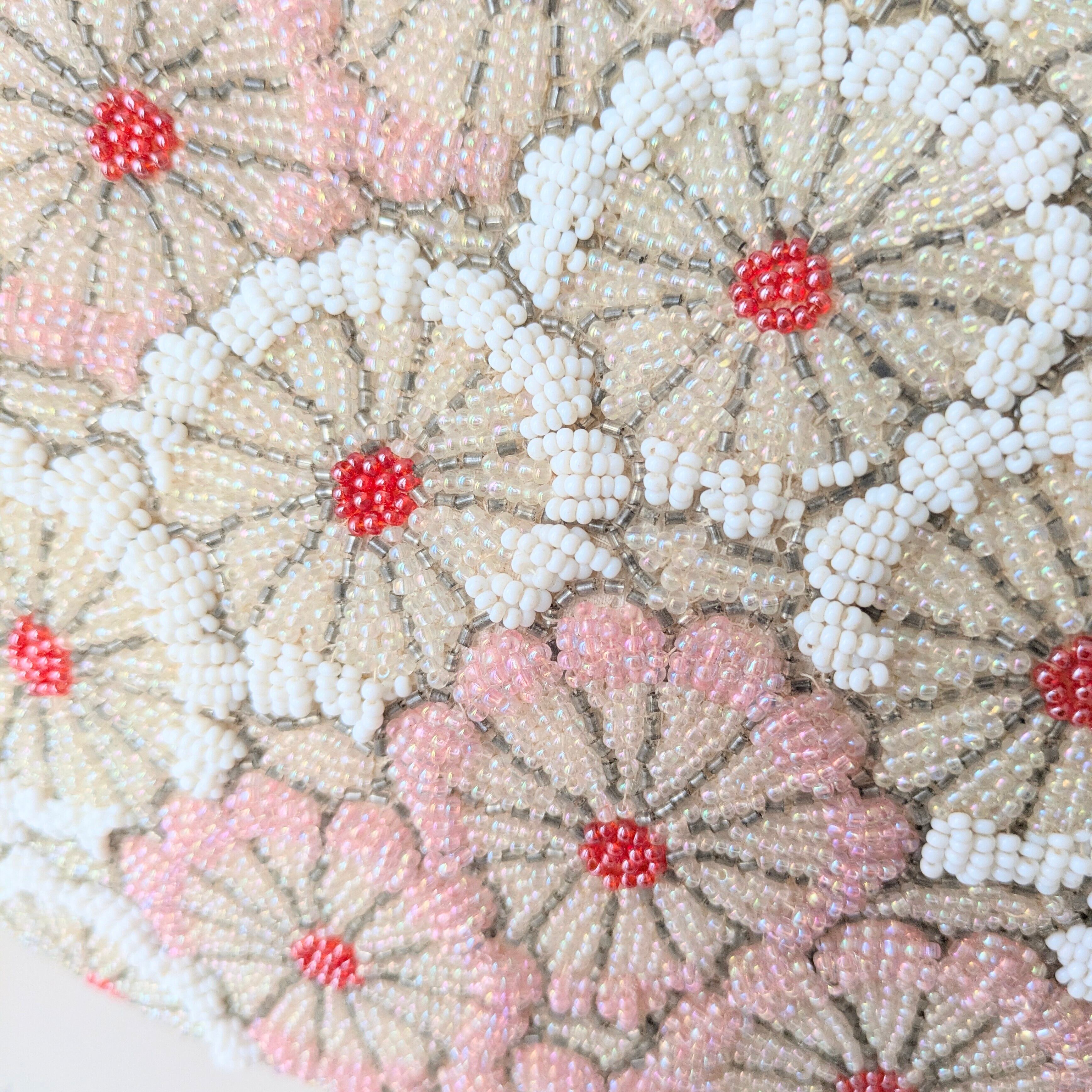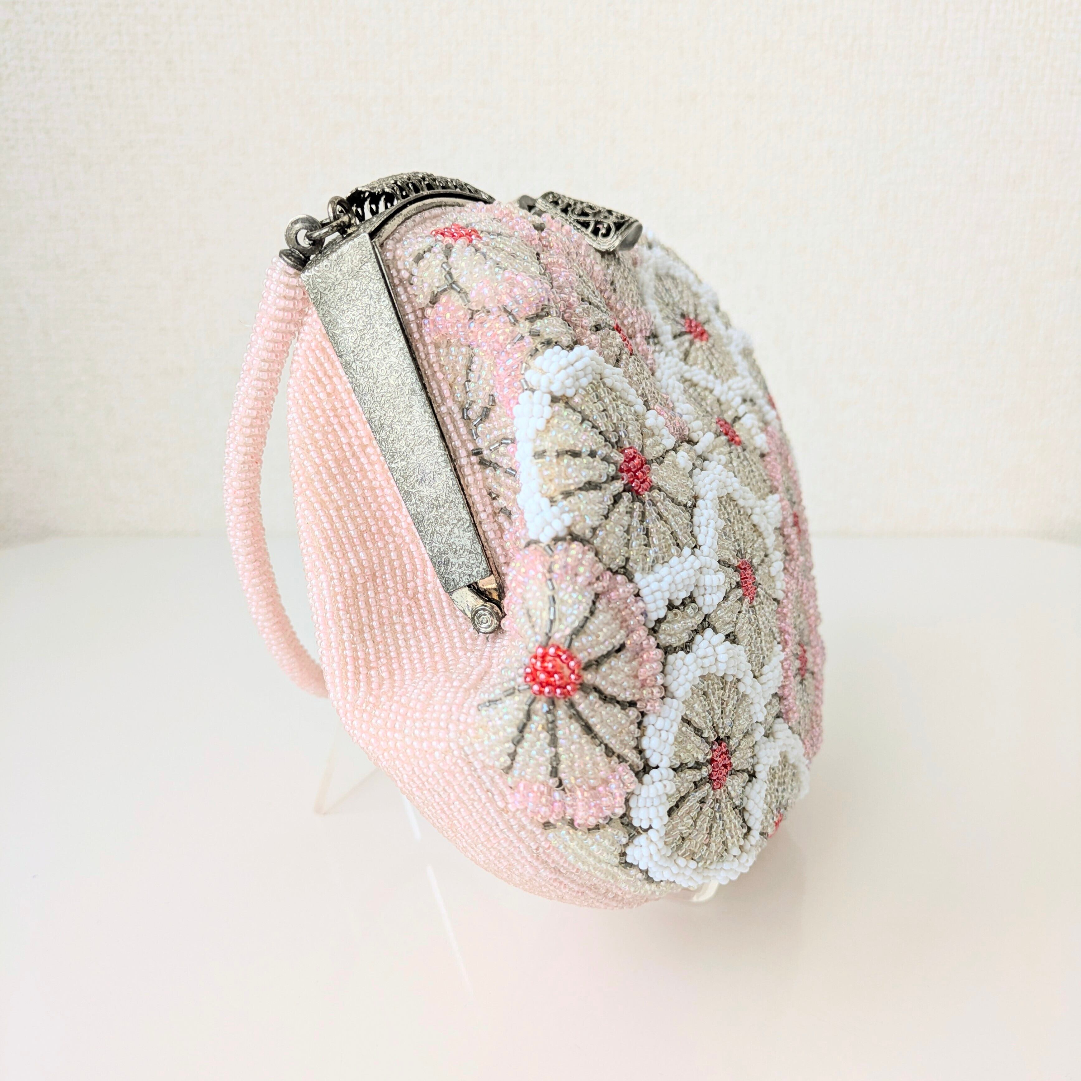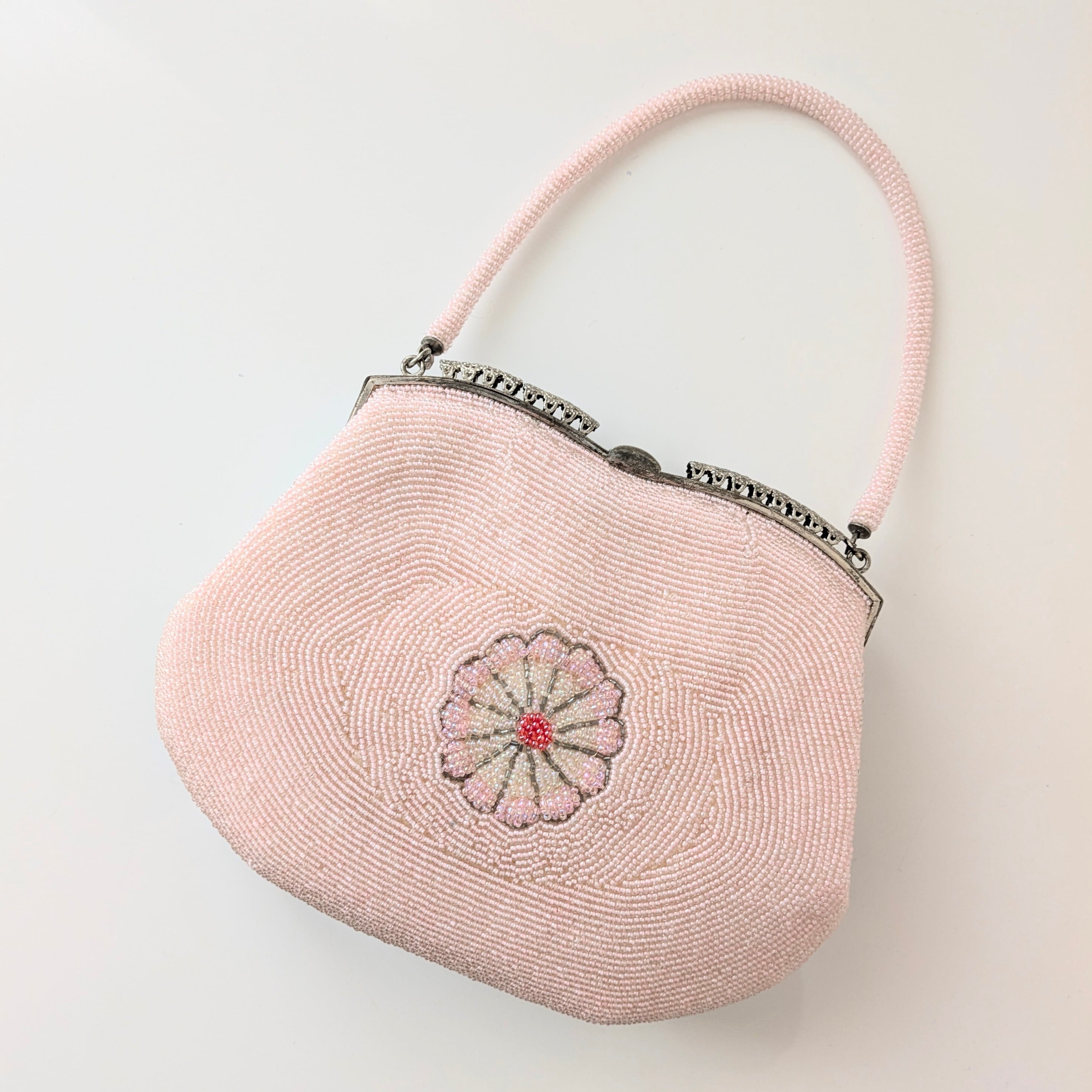 【Vintage】ビーズ刺繍バッグ ピンク 白 菊尽くし パーティーバッグ クラッチバッグ 昭和レトロ 大正浪漫 フォーマルバッグ