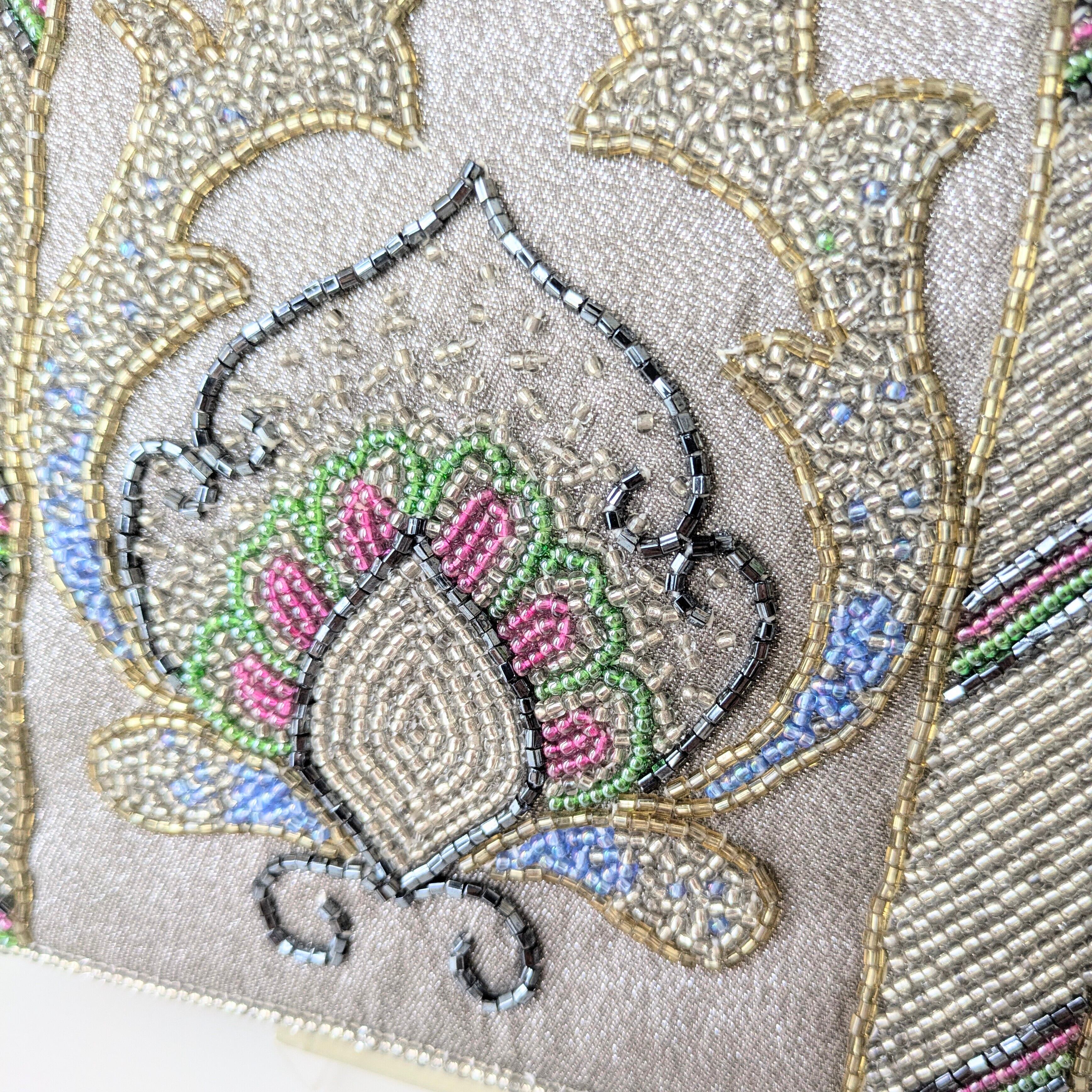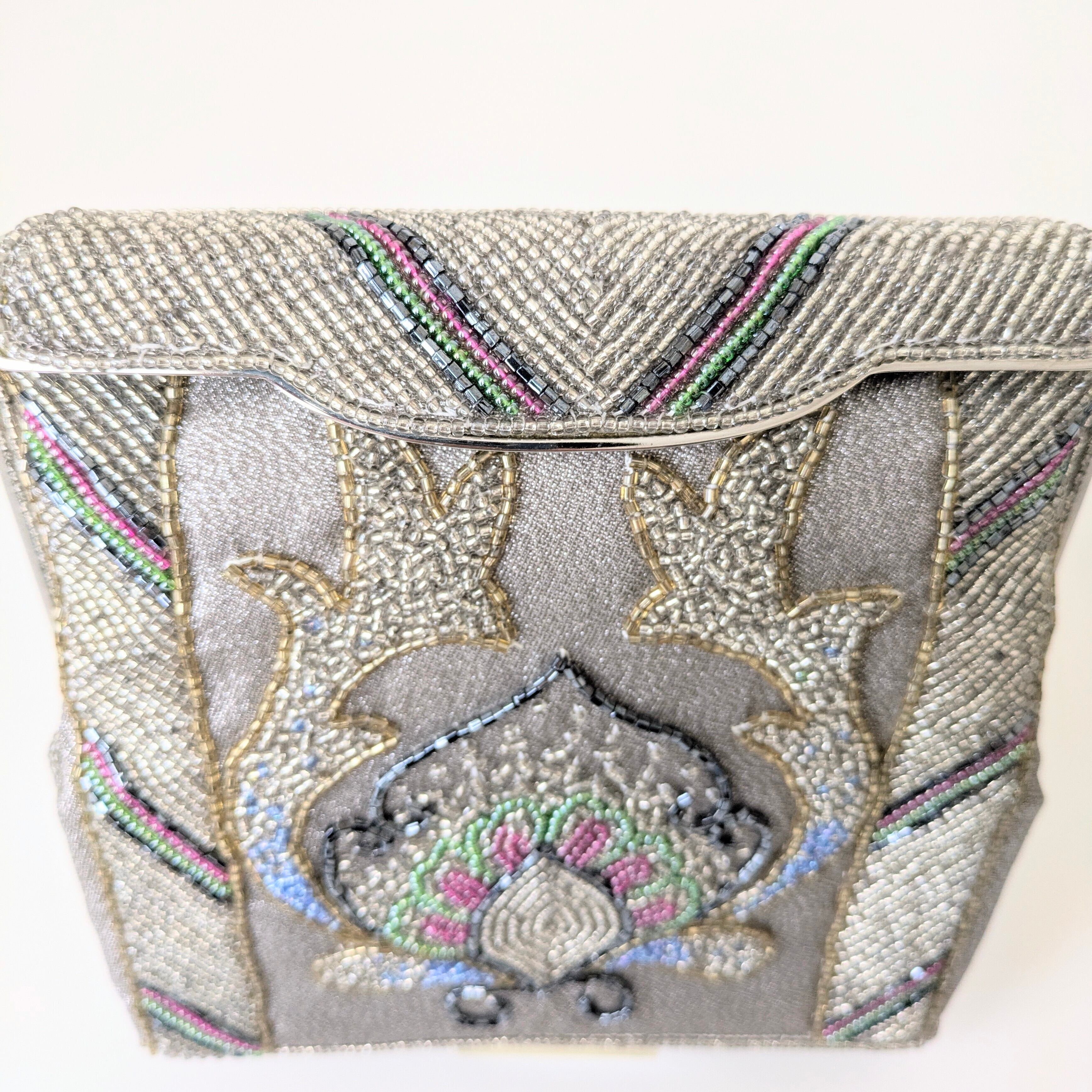 シルバーの布地にビーズ装飾が施されたビーズバッグです。シルバーを基調とした色彩とアラベスク模様が美しくマッチした逸品です。