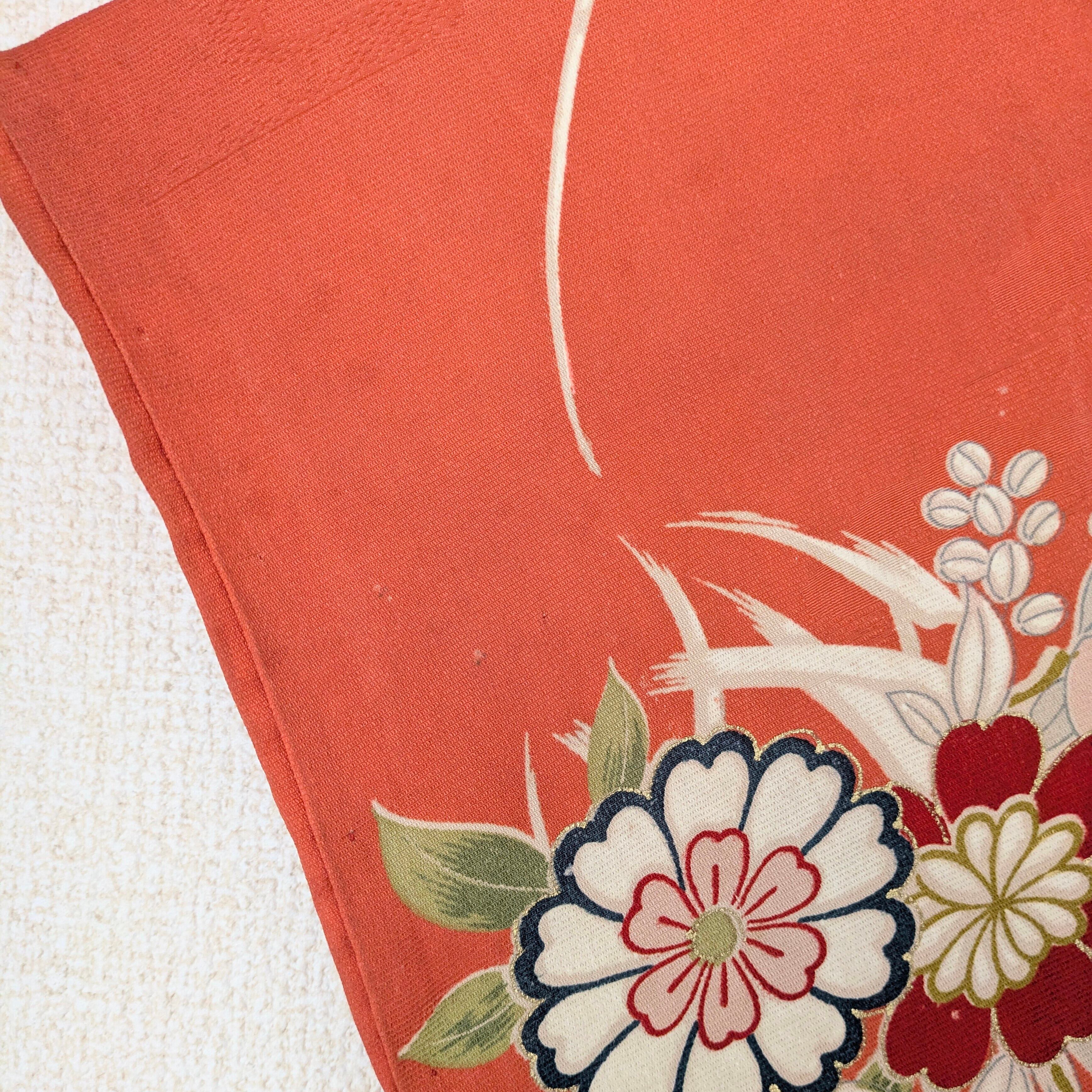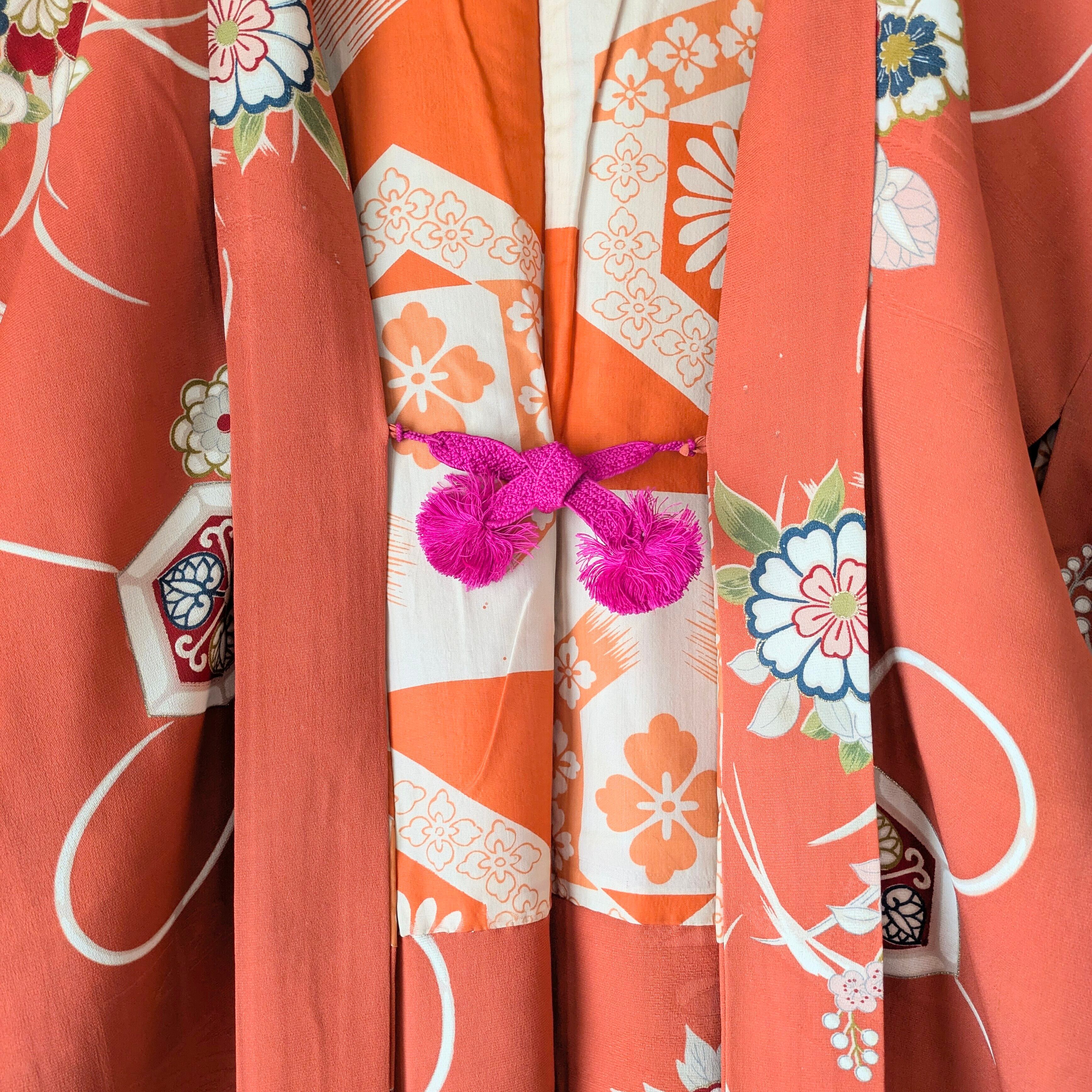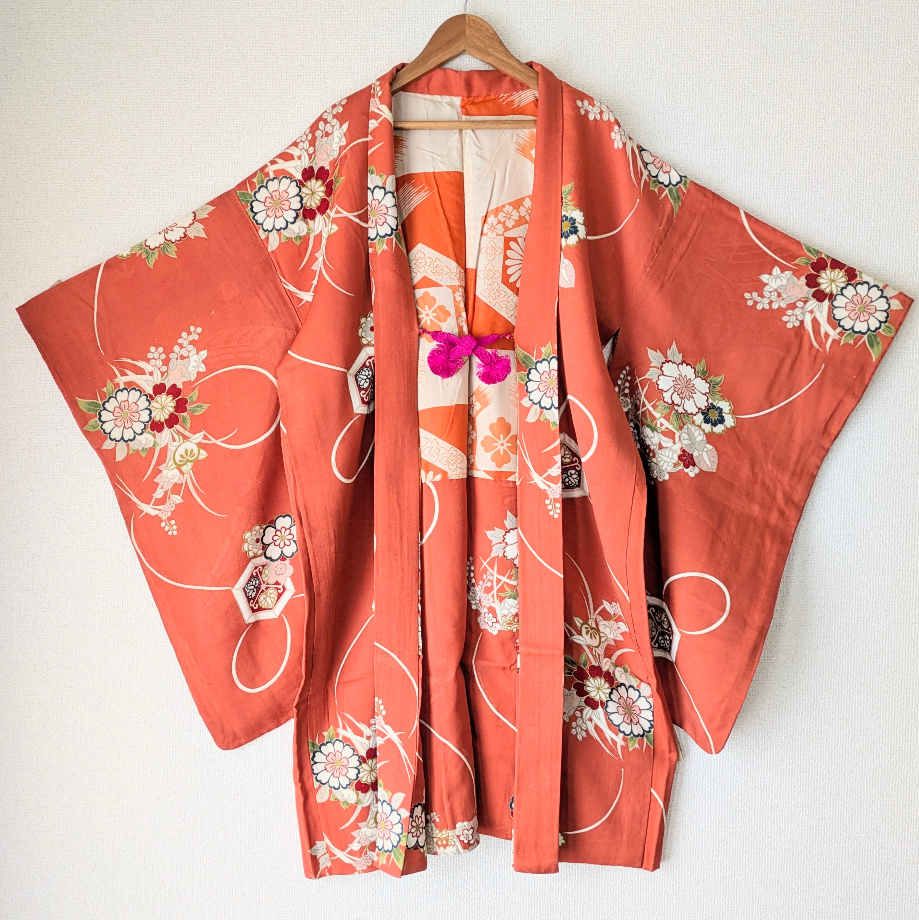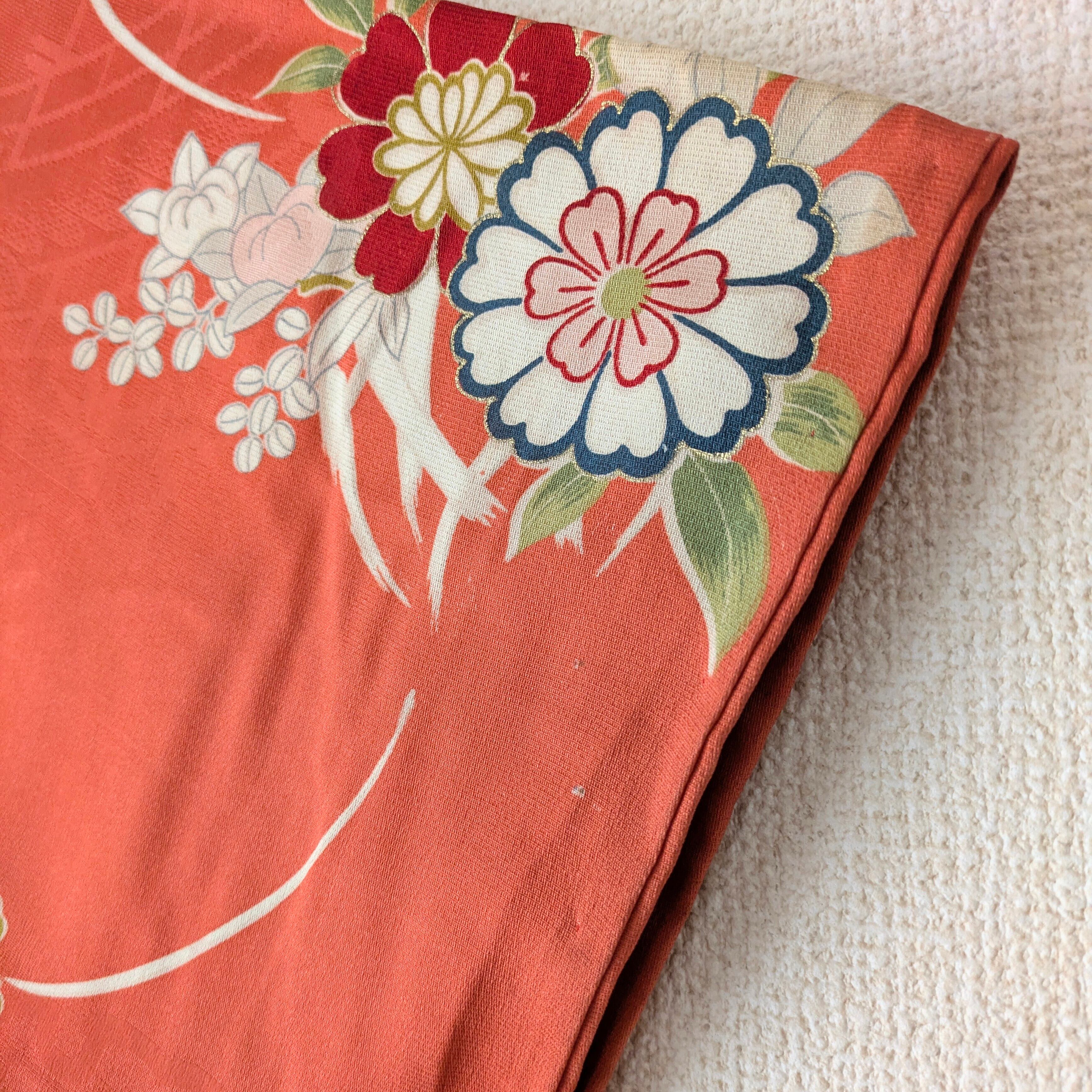 【Vintage】HAORI 羽織 正絹 本緋色 コーラルオレンジ 花柄 金彩 大正浪漫 古布 時代布 和洋折衷