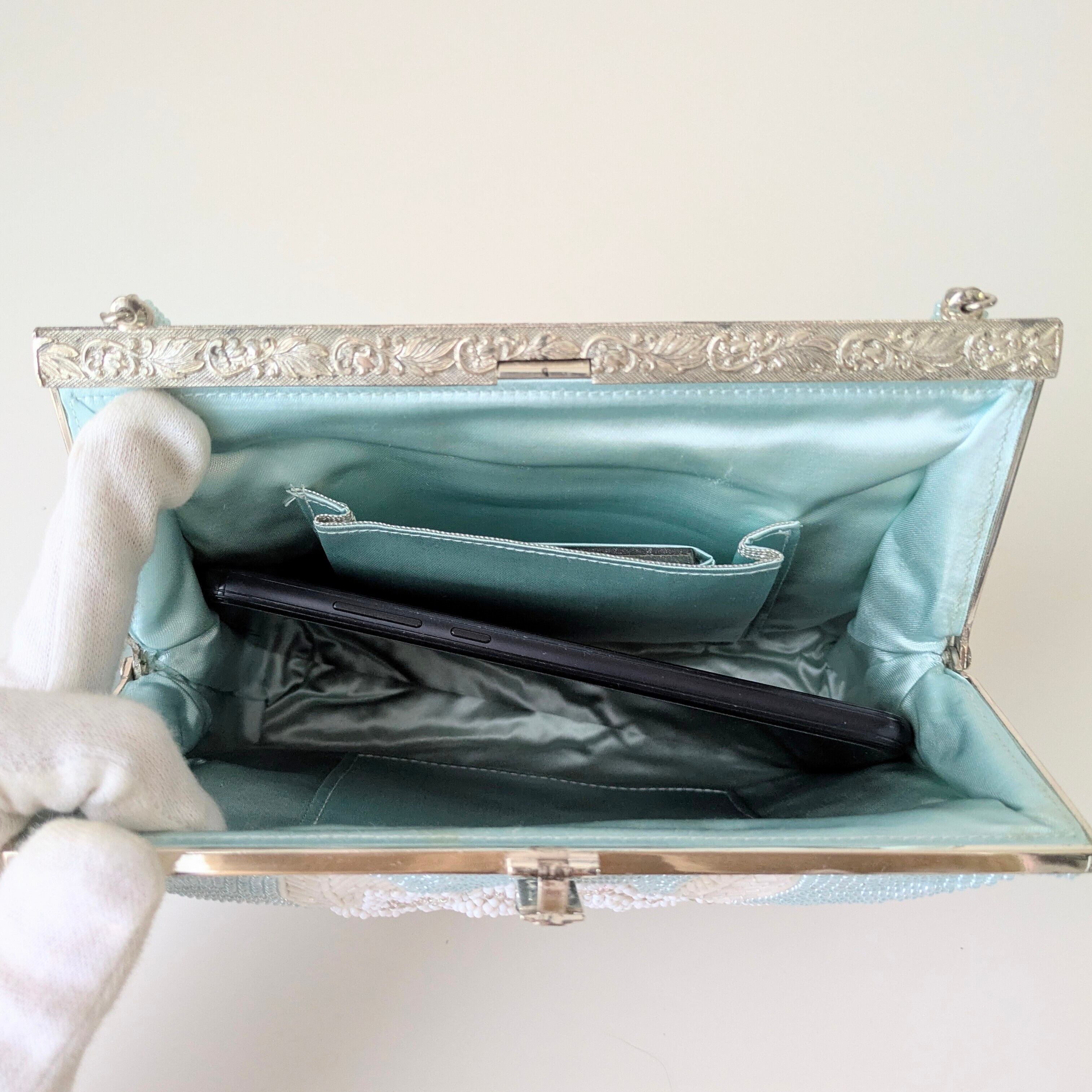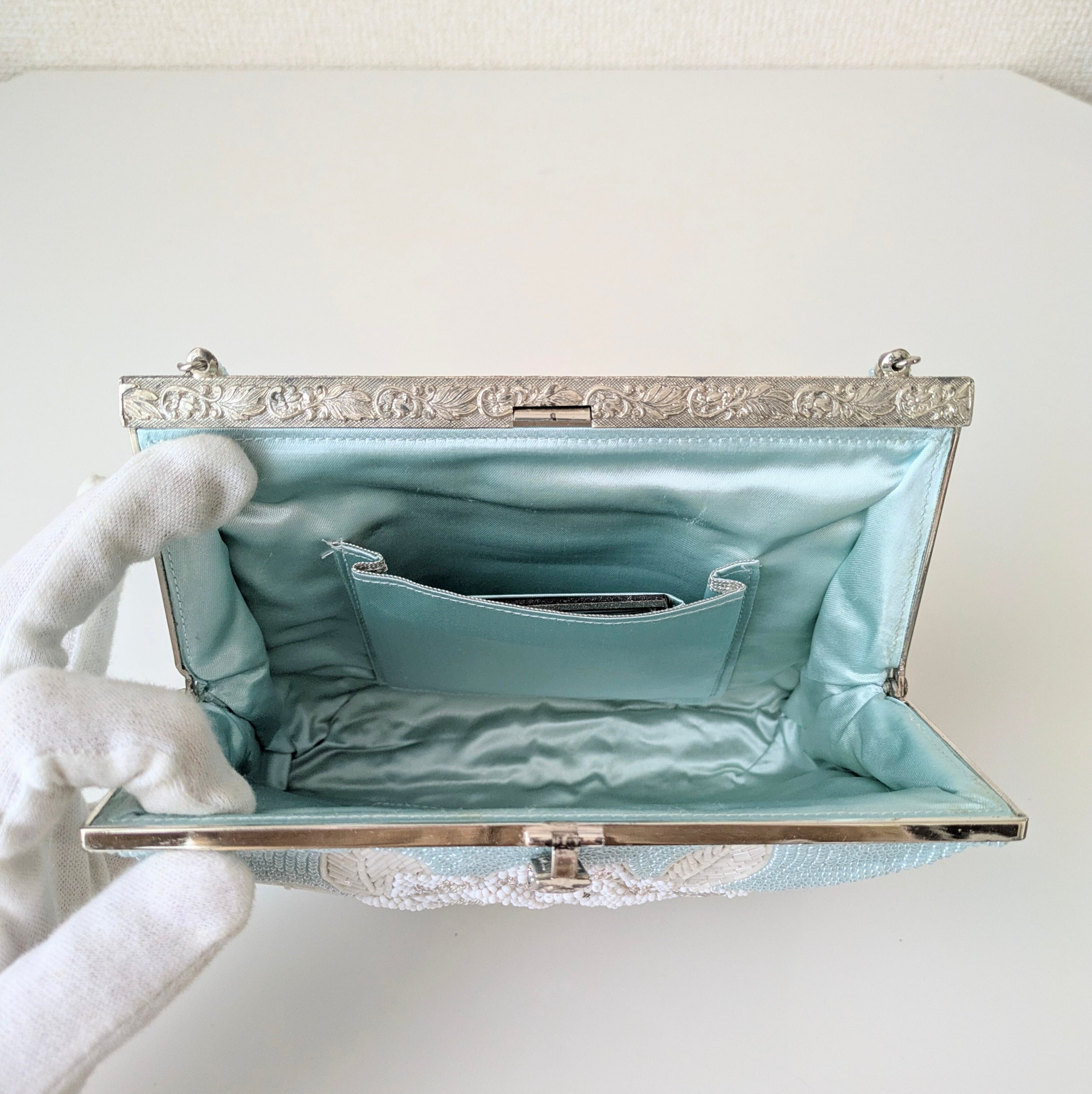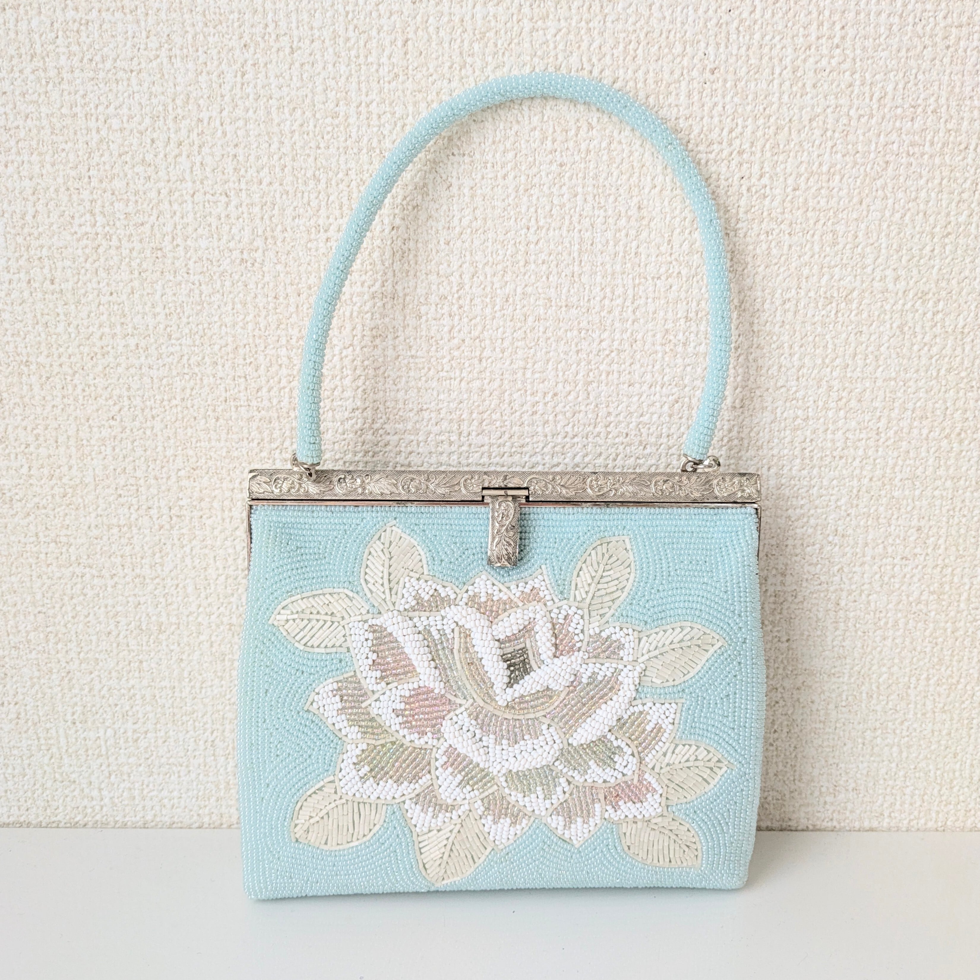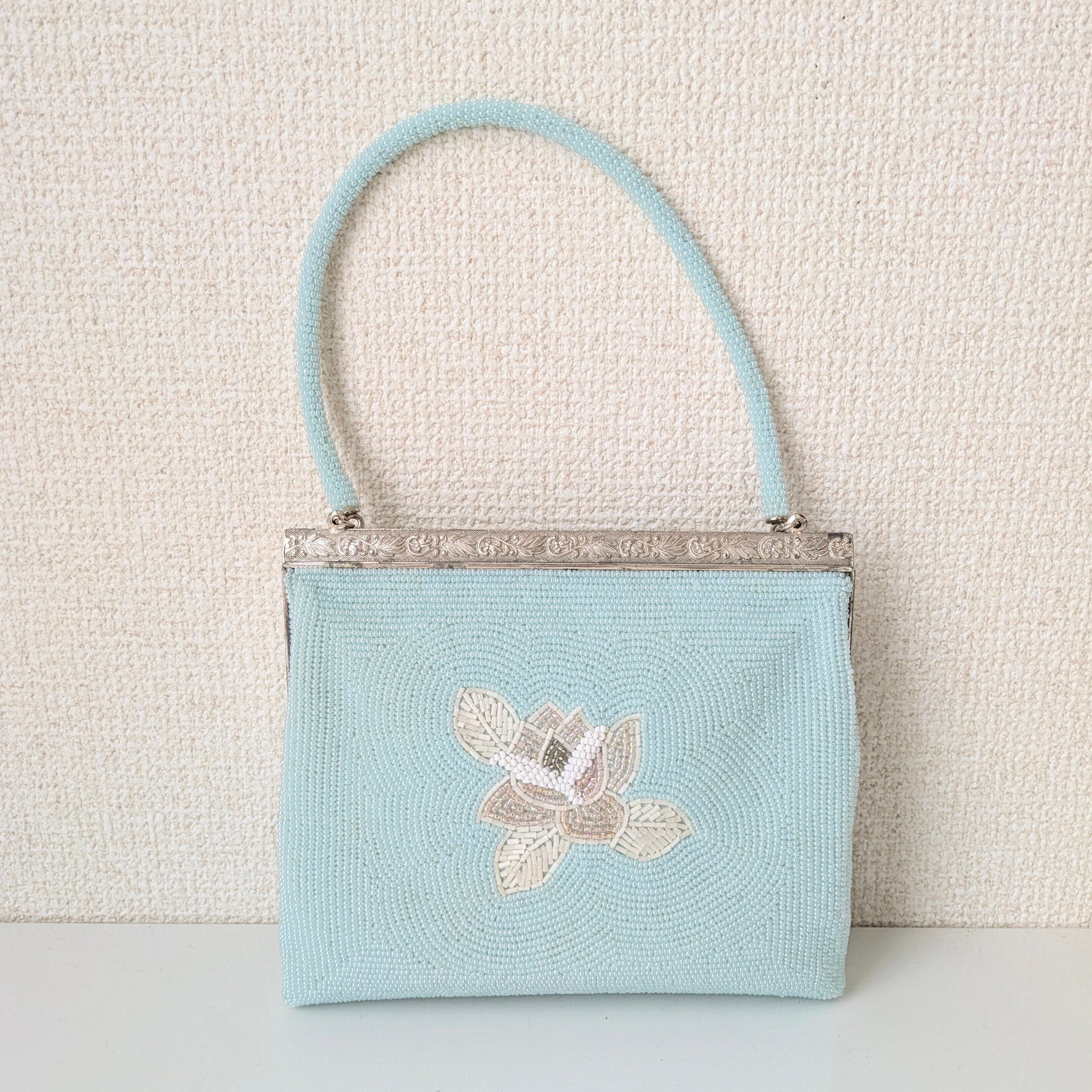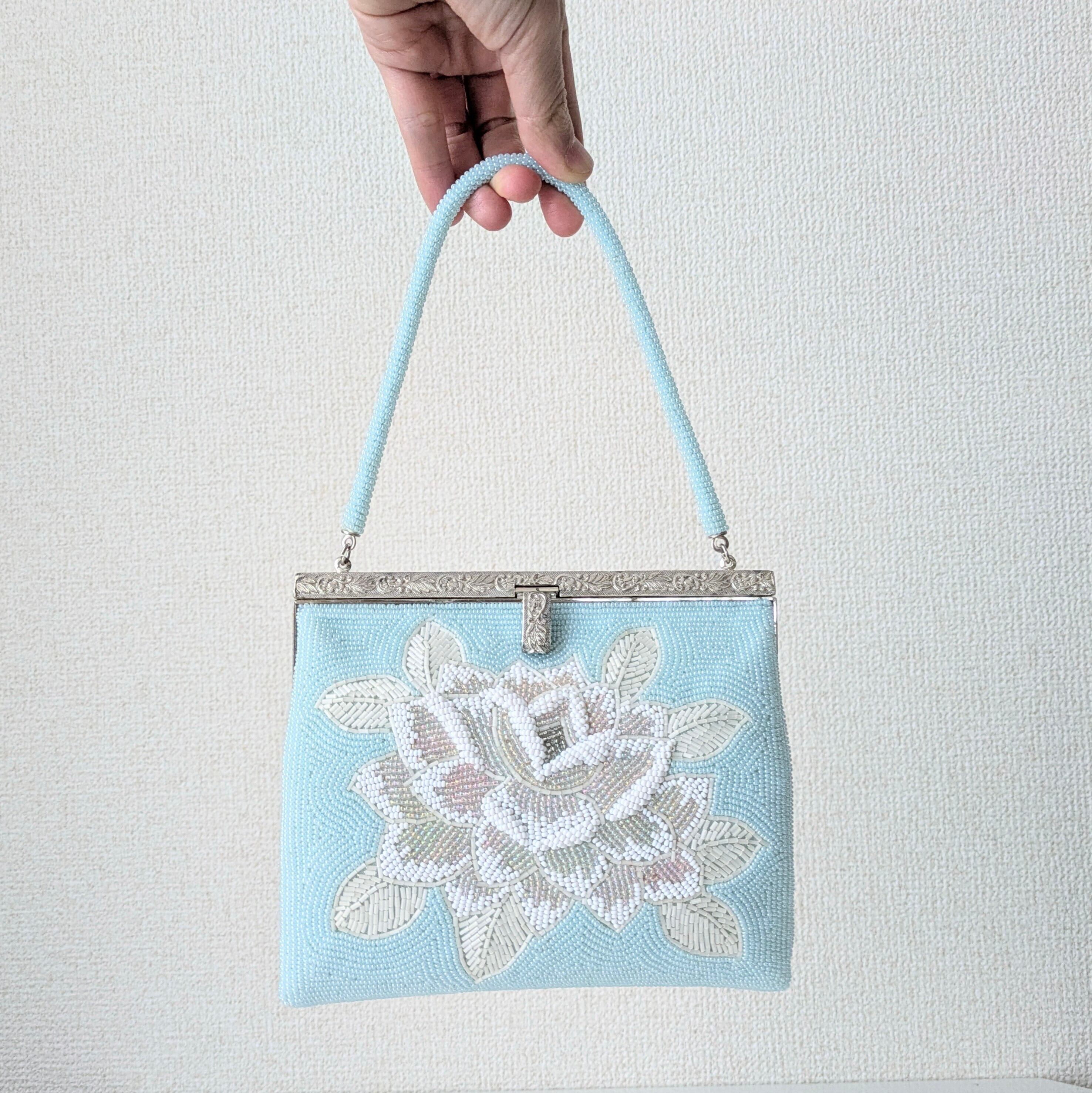 【Vintage】ビーズ刺繍バッグ 水色 薔薇柄 パーティーバッグ クラッチバッグ 昭和レトロ 大正浪漫 フォーマルバッグ