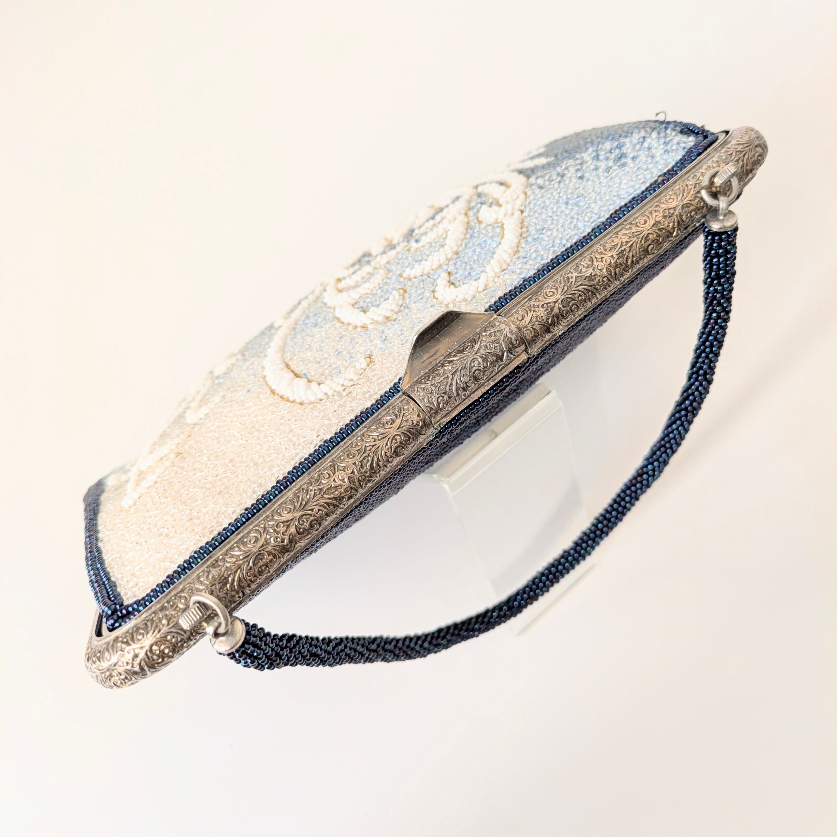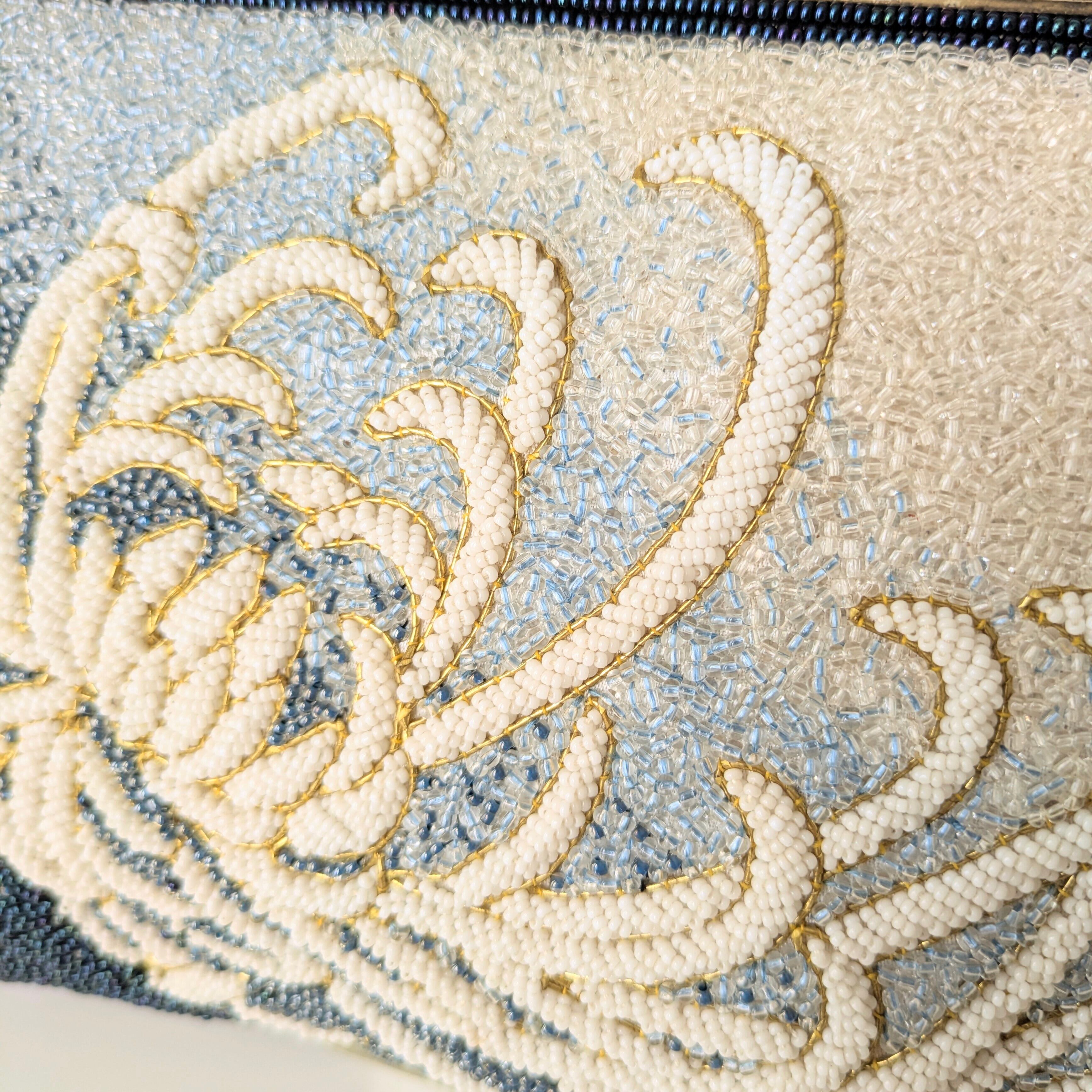 濃紺から白へのグラデーションと大胆な白の乱菊が美しいビーズバッグです。乱菊には駒刺繍が施されており、手の込んだ作りとなっています。