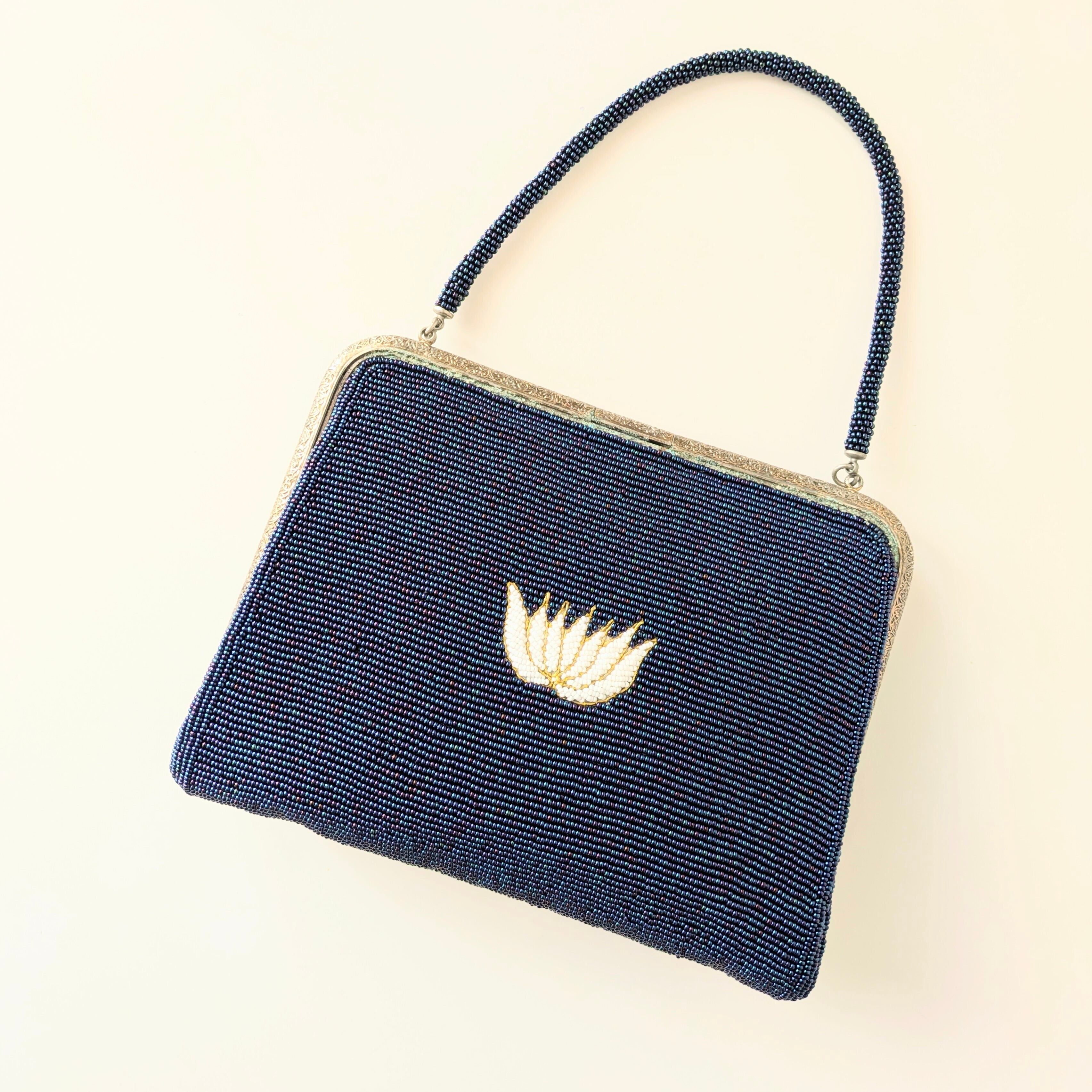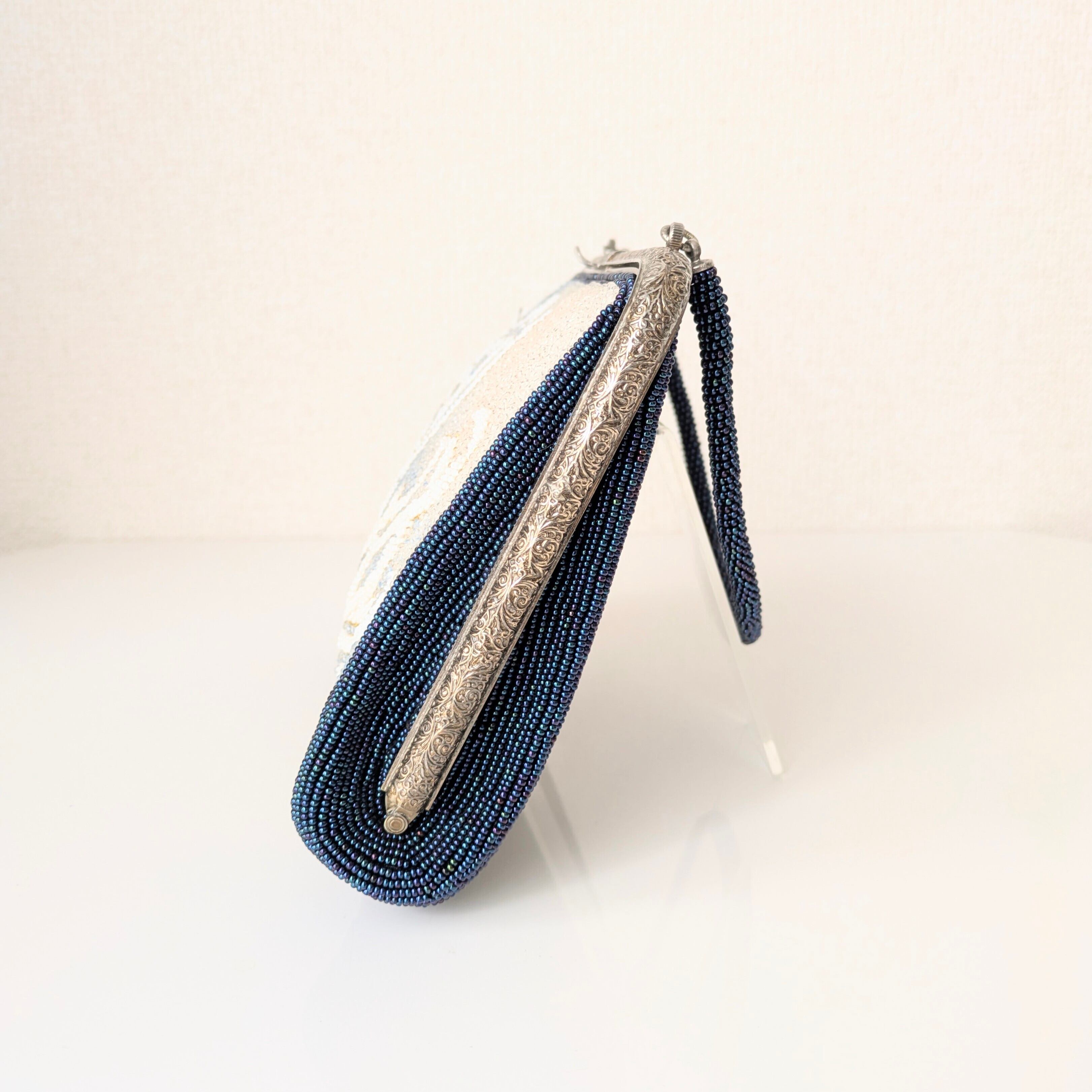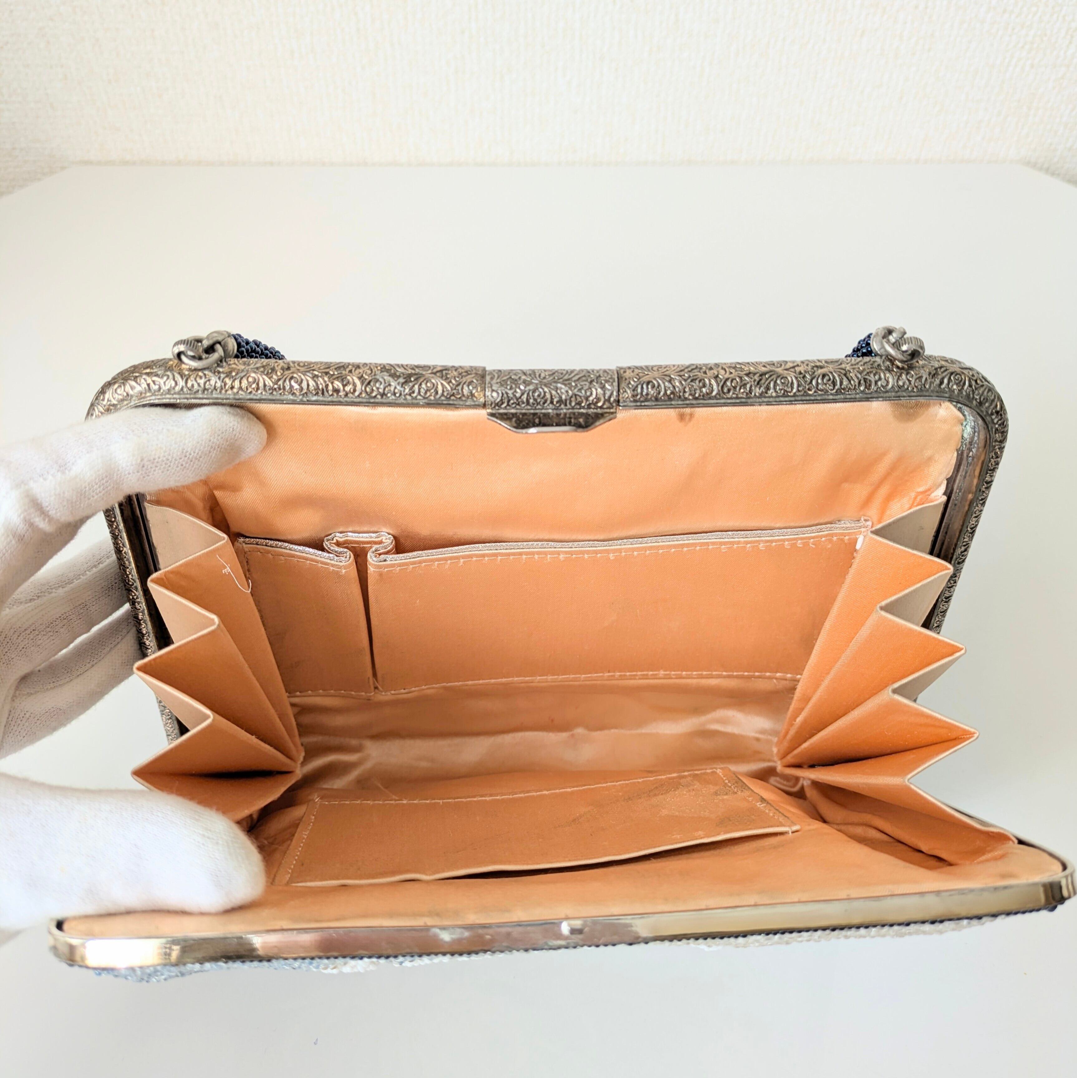 【Vintage】ビーズ刺繍バッグ 濃紺 乱菊 駒刺繍 パーティーバッグ クラッチバッグ 昭和レトロ 大正浪漫 フォーマルバッグ