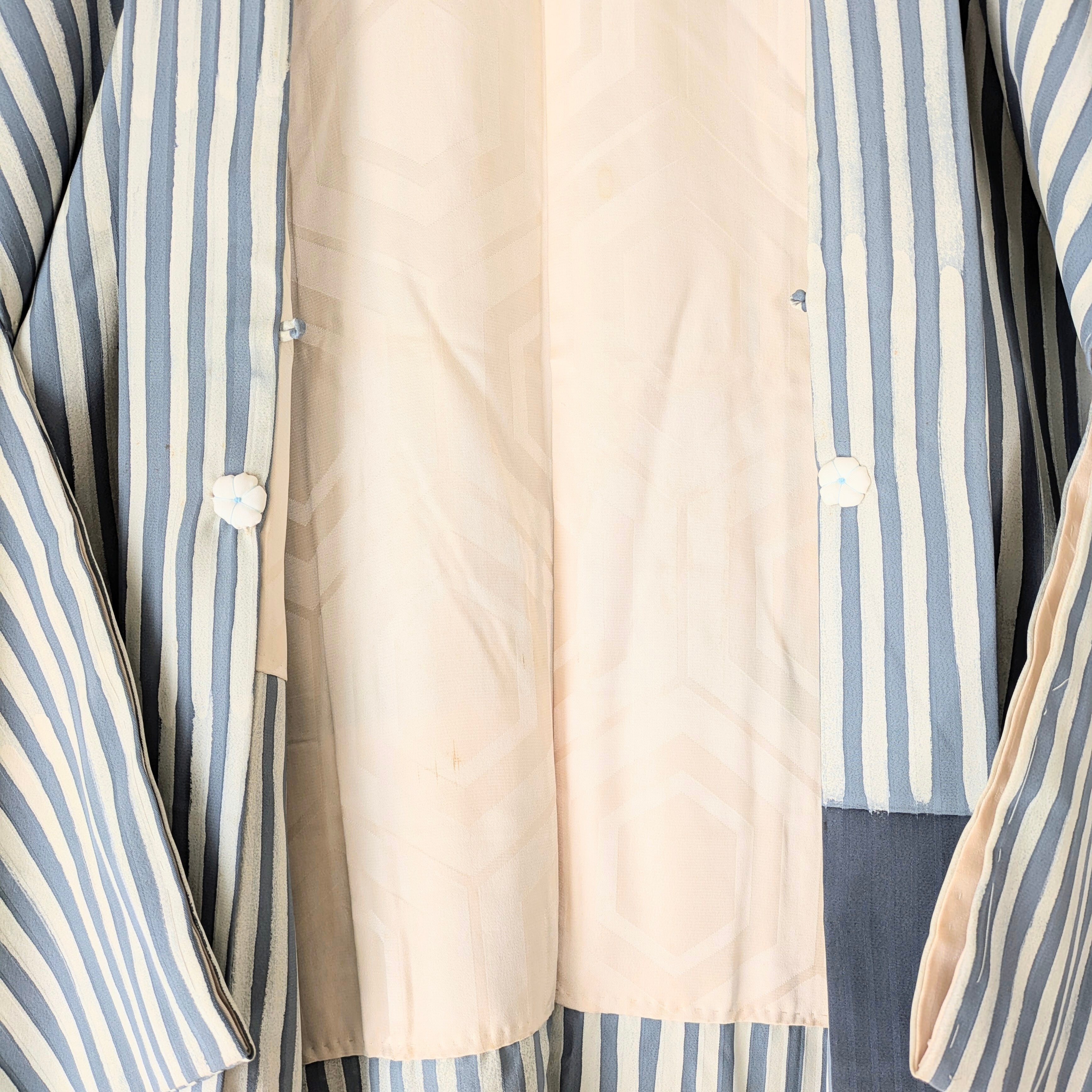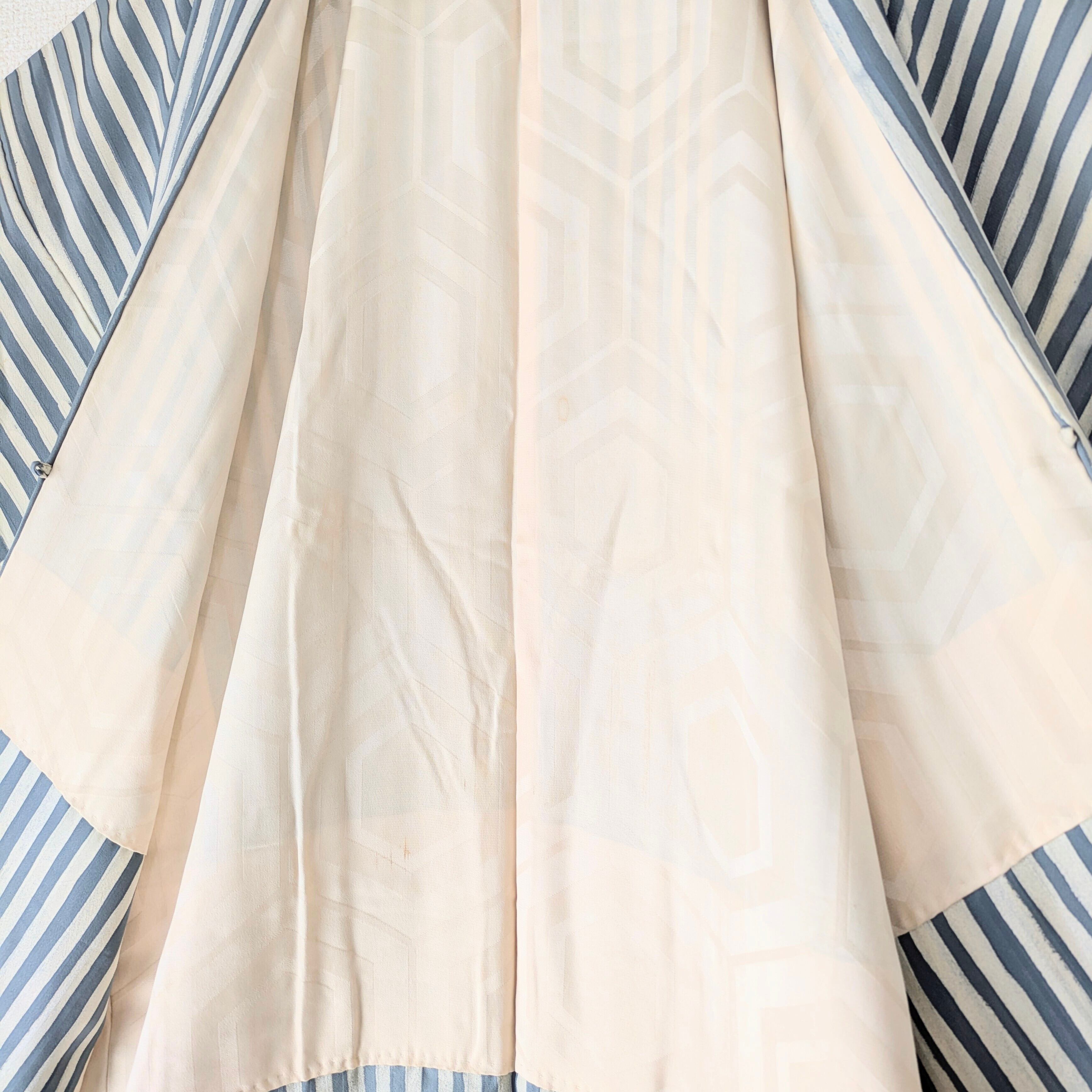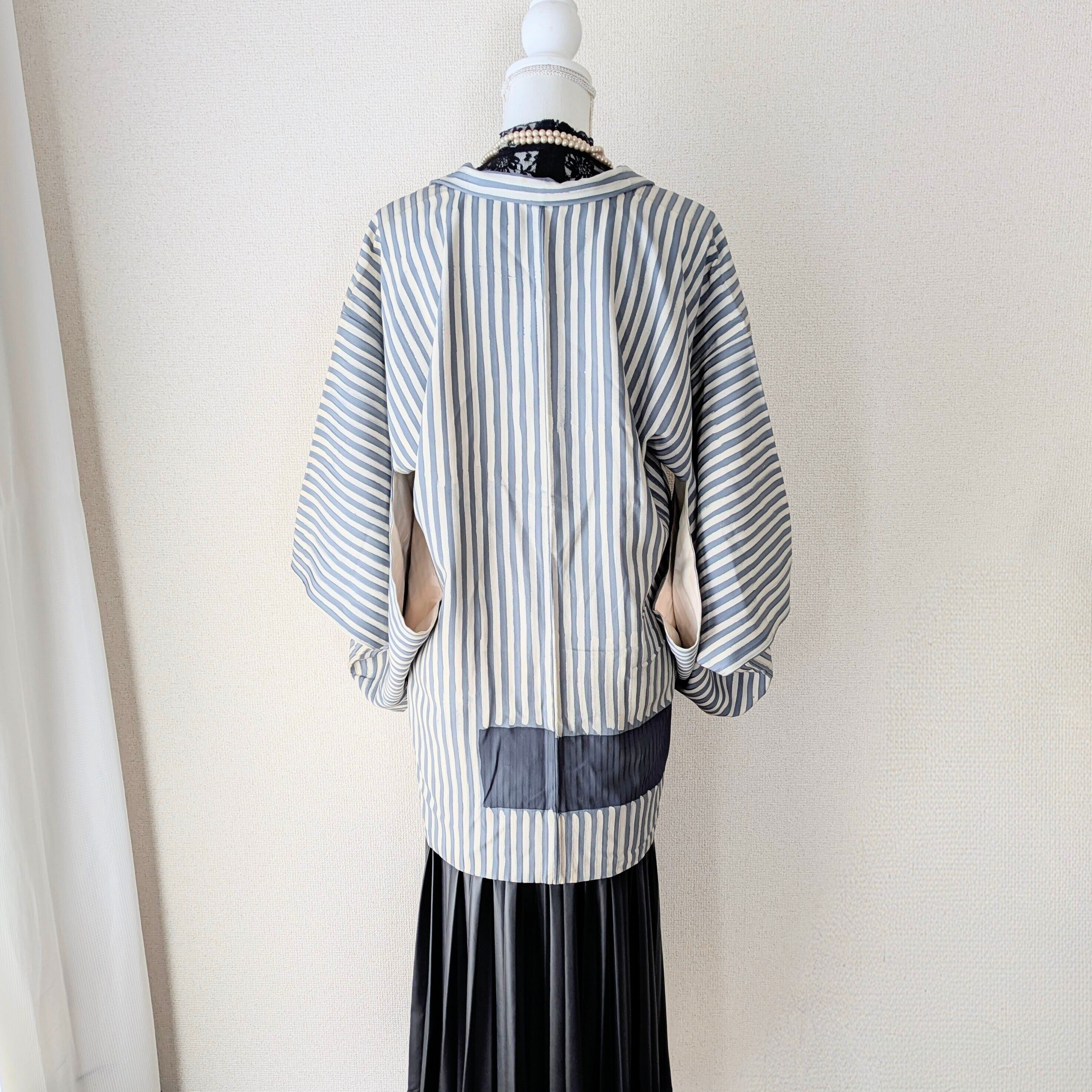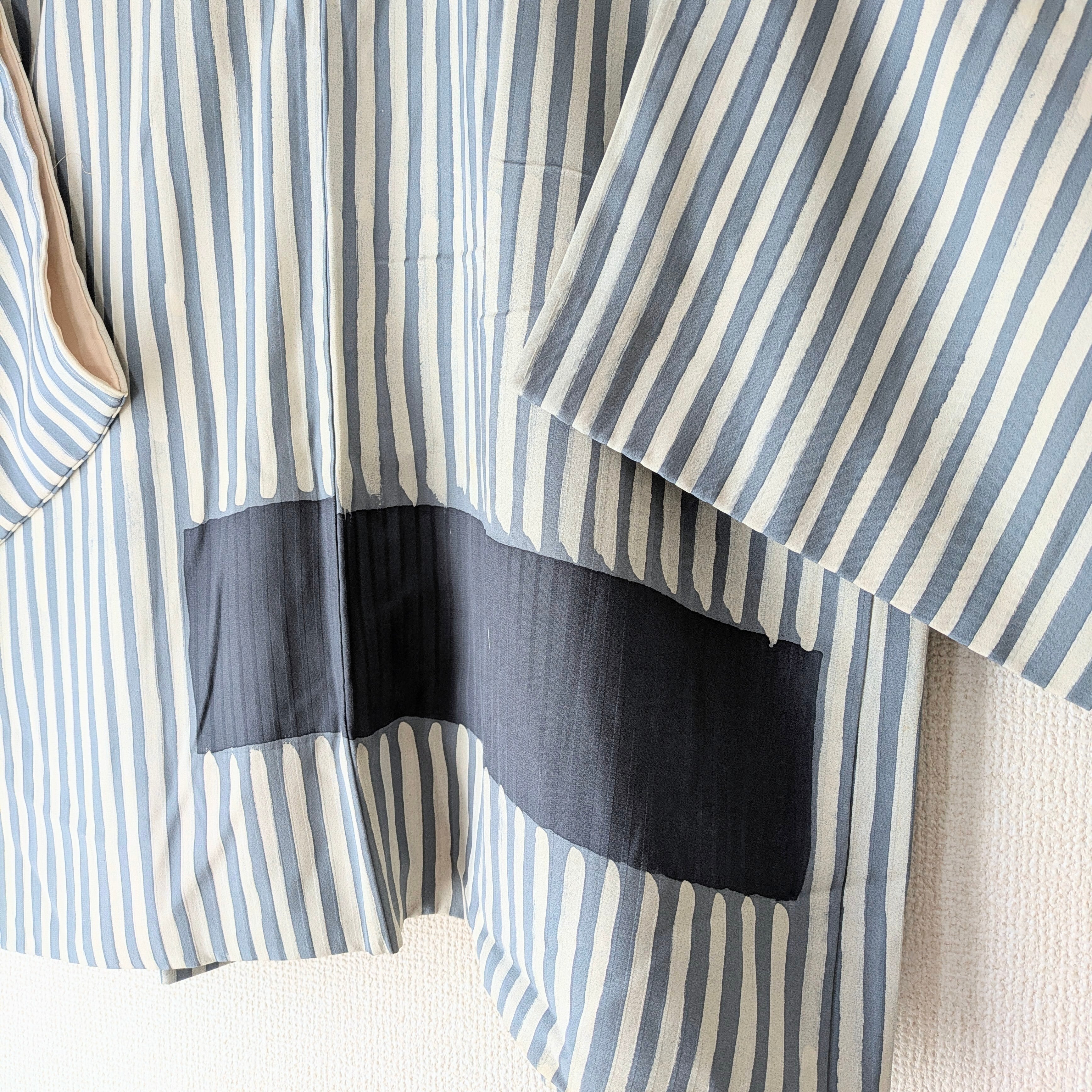【Vintage】HAORI 羽織 正絹 白 水色 手描き縞 大正浪漫 古布 時代布 和洋折衷