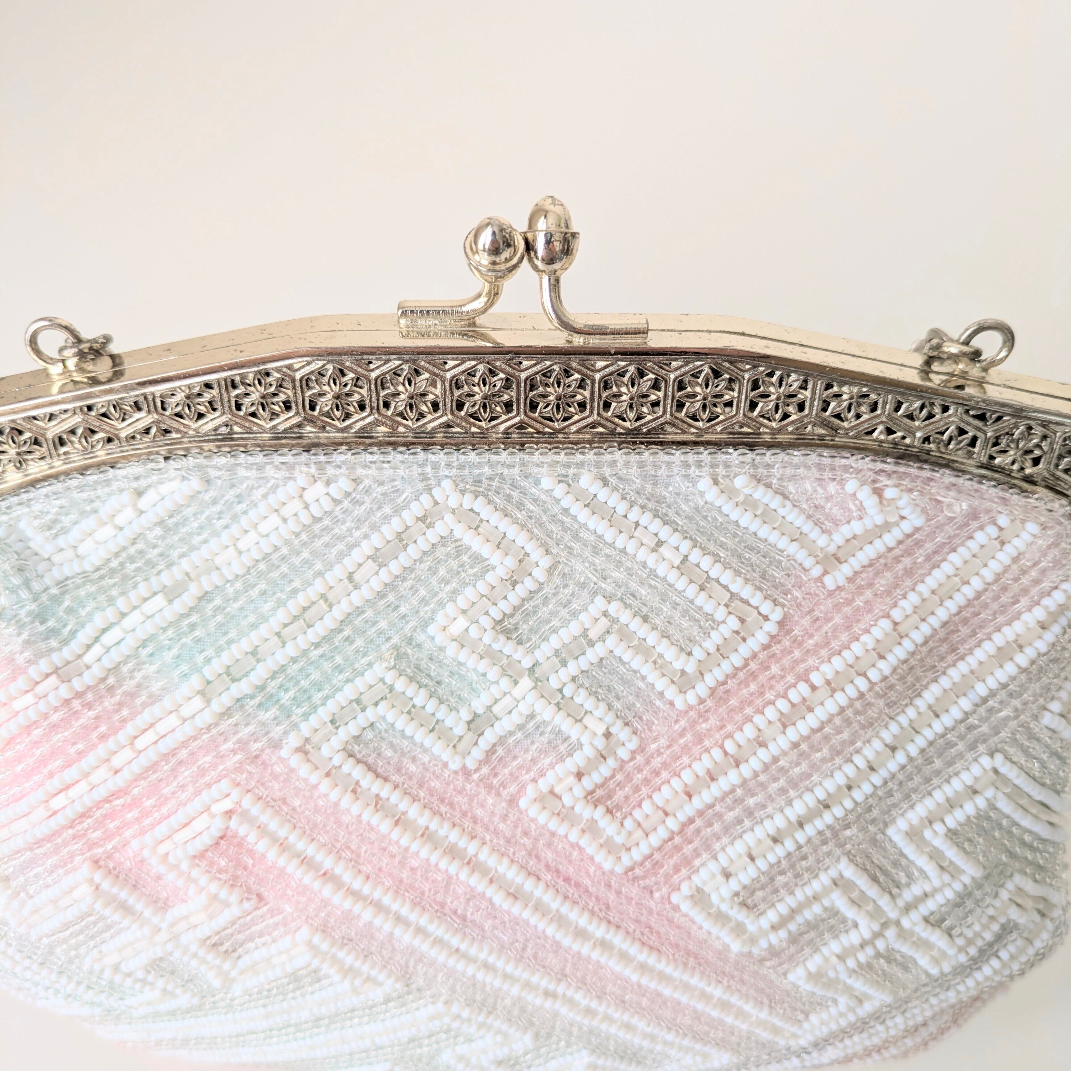 【Vintage】ビーズ刺繍バッグ ピンク 水色 暈し 紗綾形文様 パーティーバッグ クラッチバッグ 昭和レトロ 大正浪漫 フォーマルバッグ