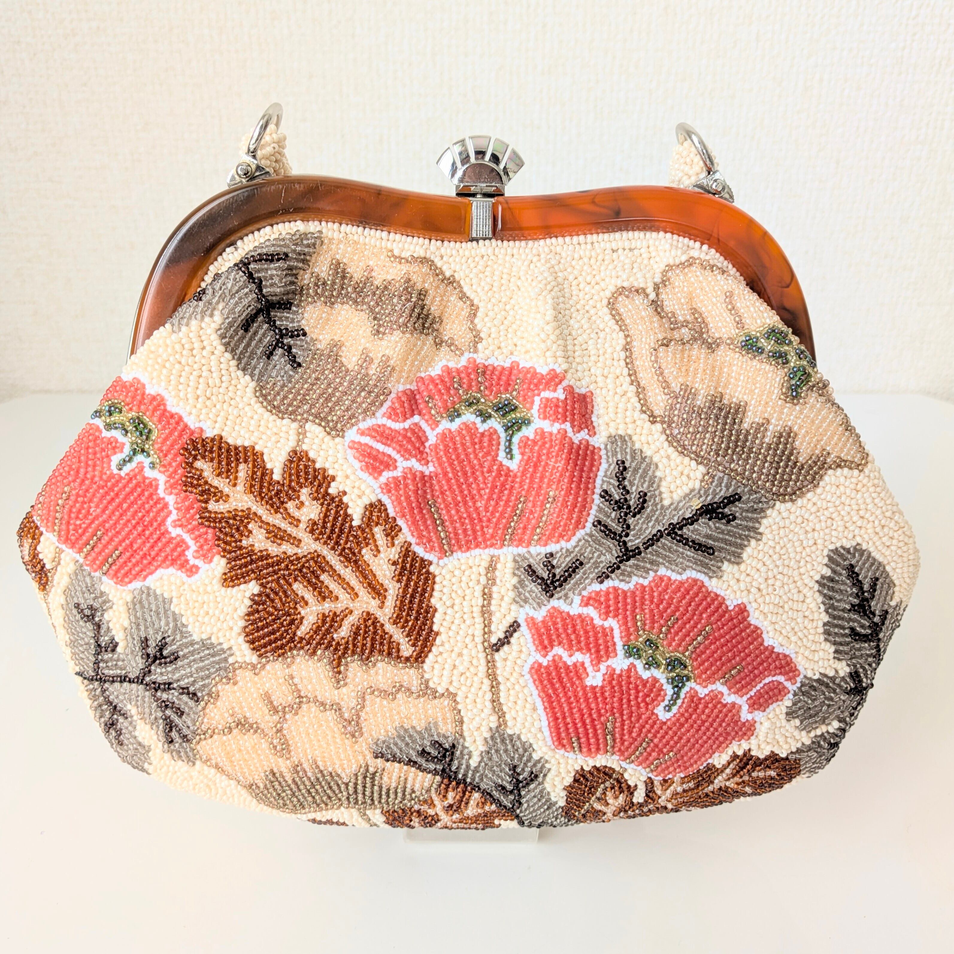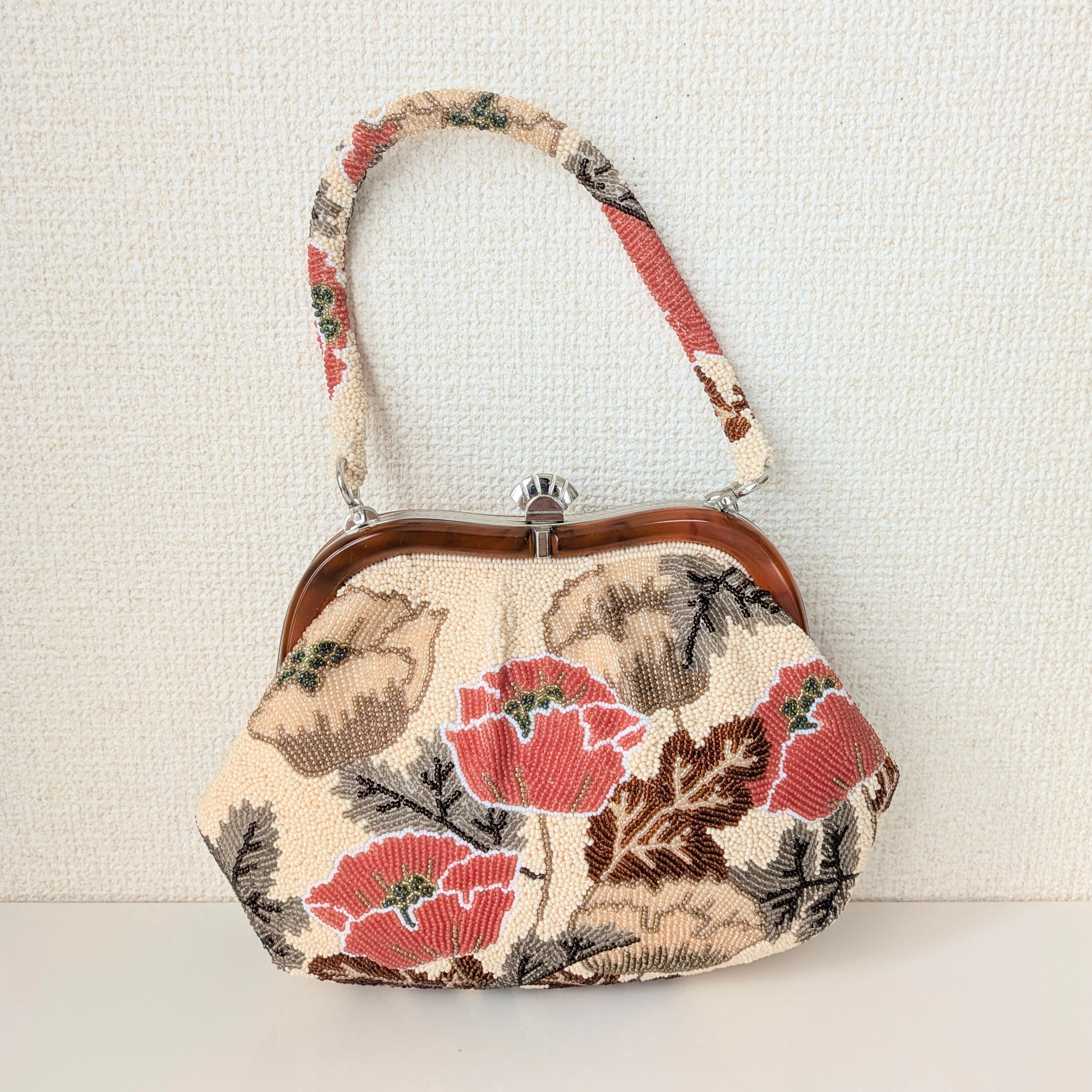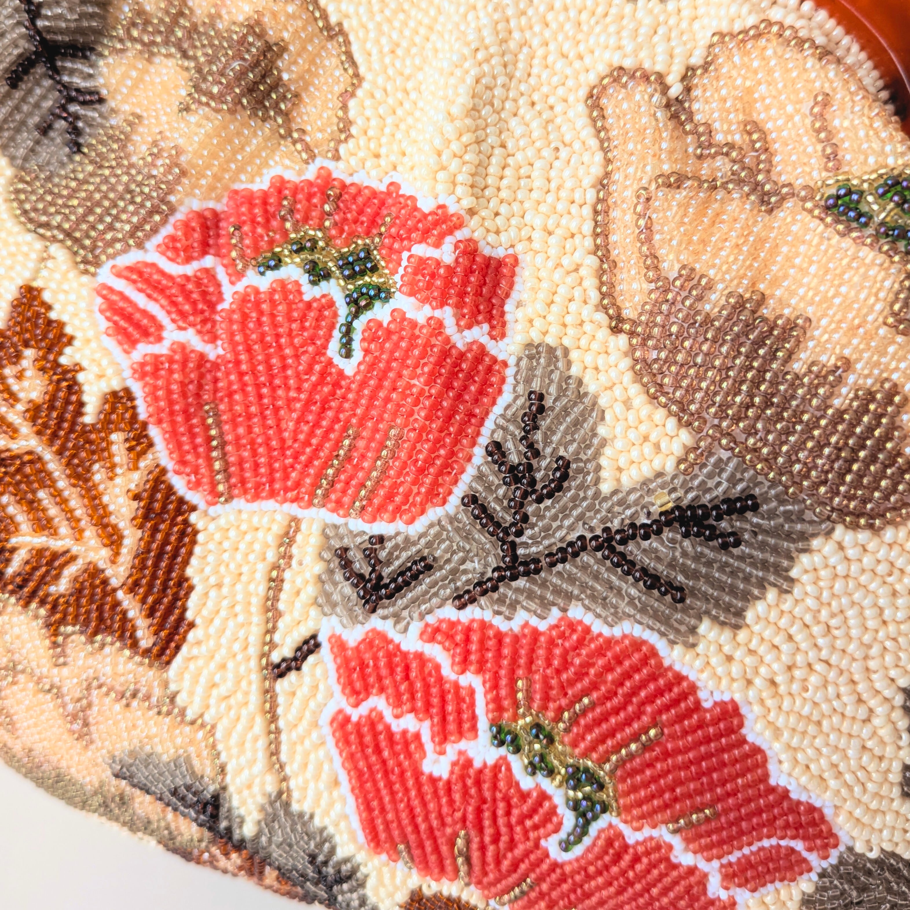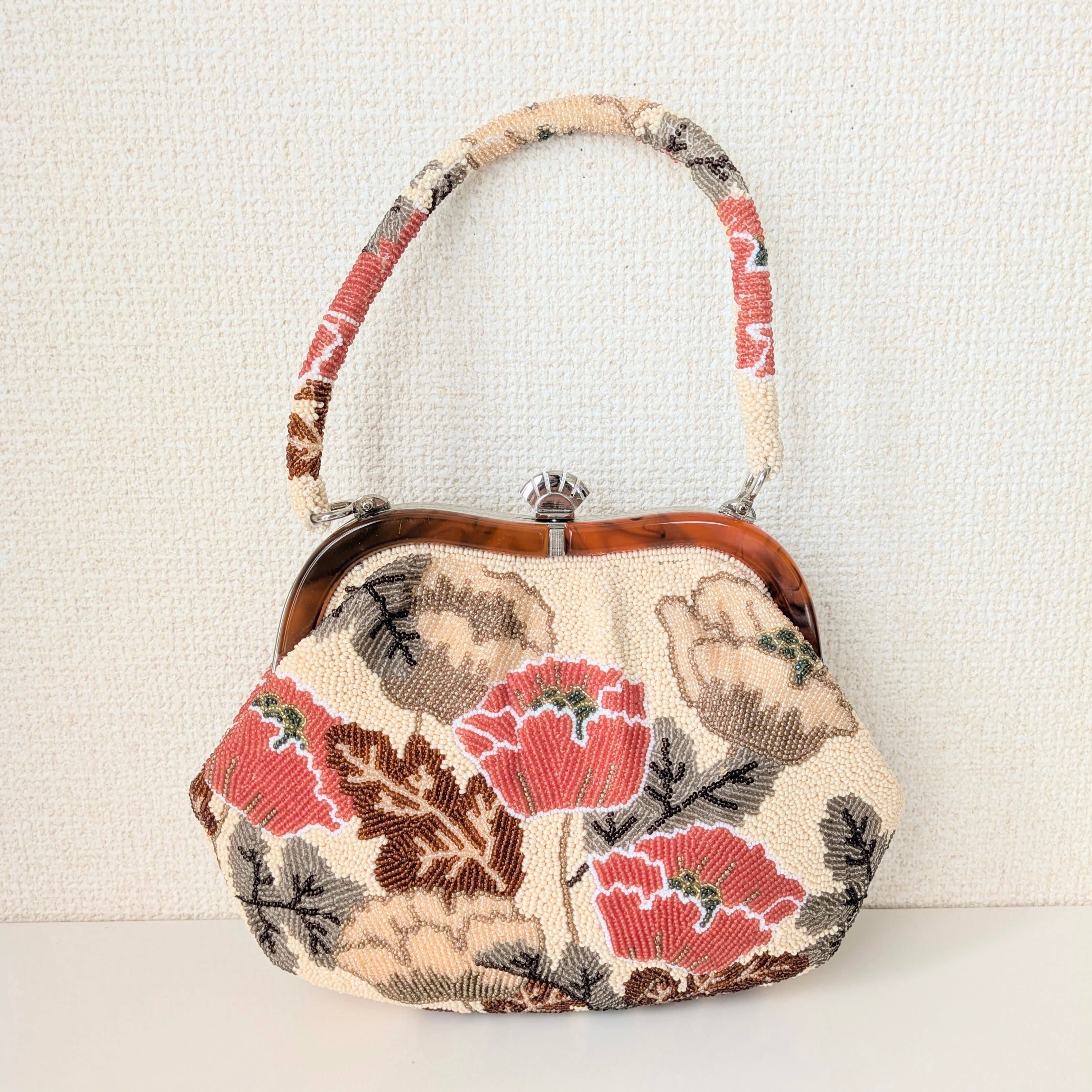 ベージュ地に赤色のポピーが映えるビーズバッグです。ポピーモチーフがビーズバッグにあしらわれているのは珍しいかと思います。