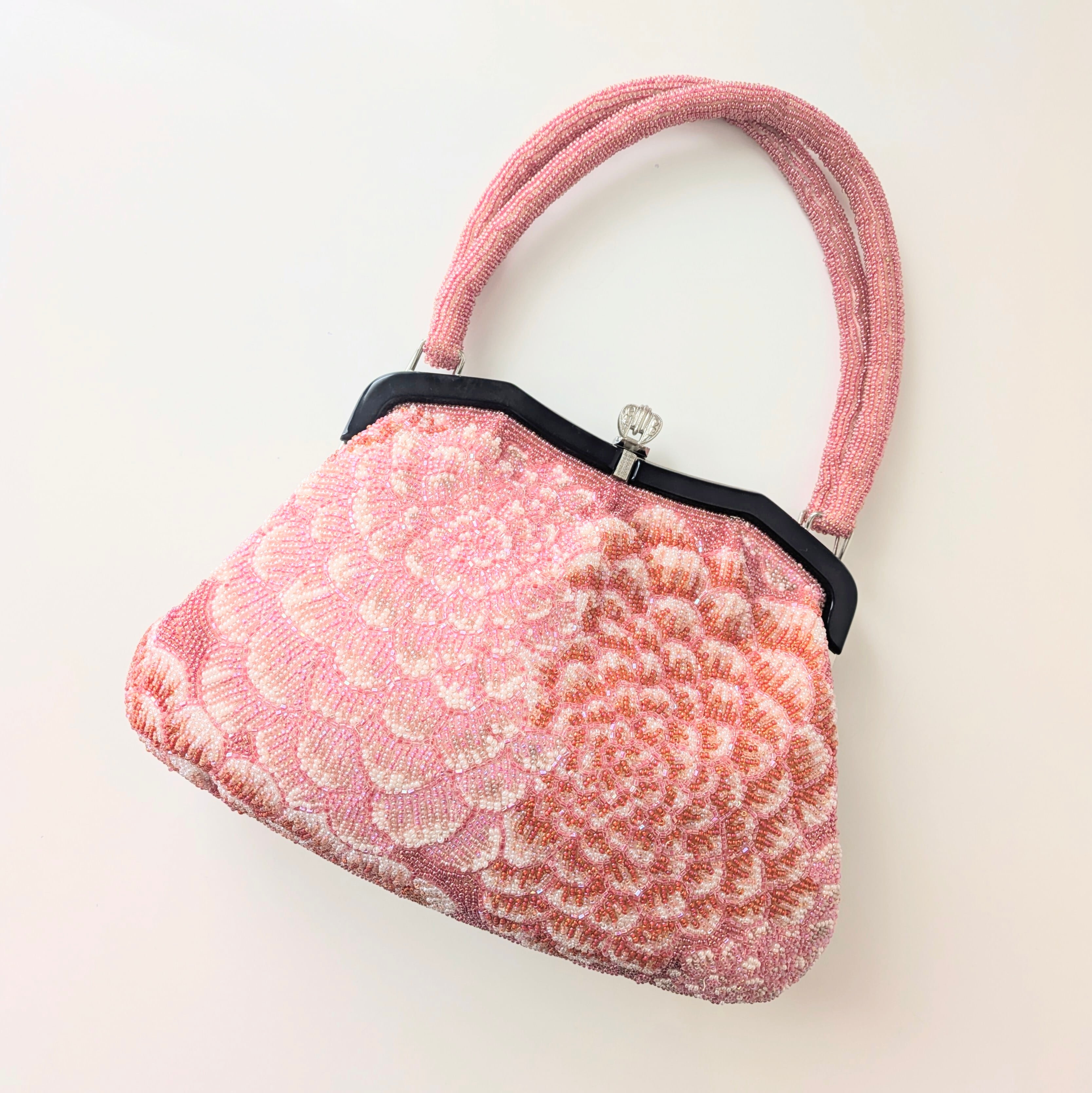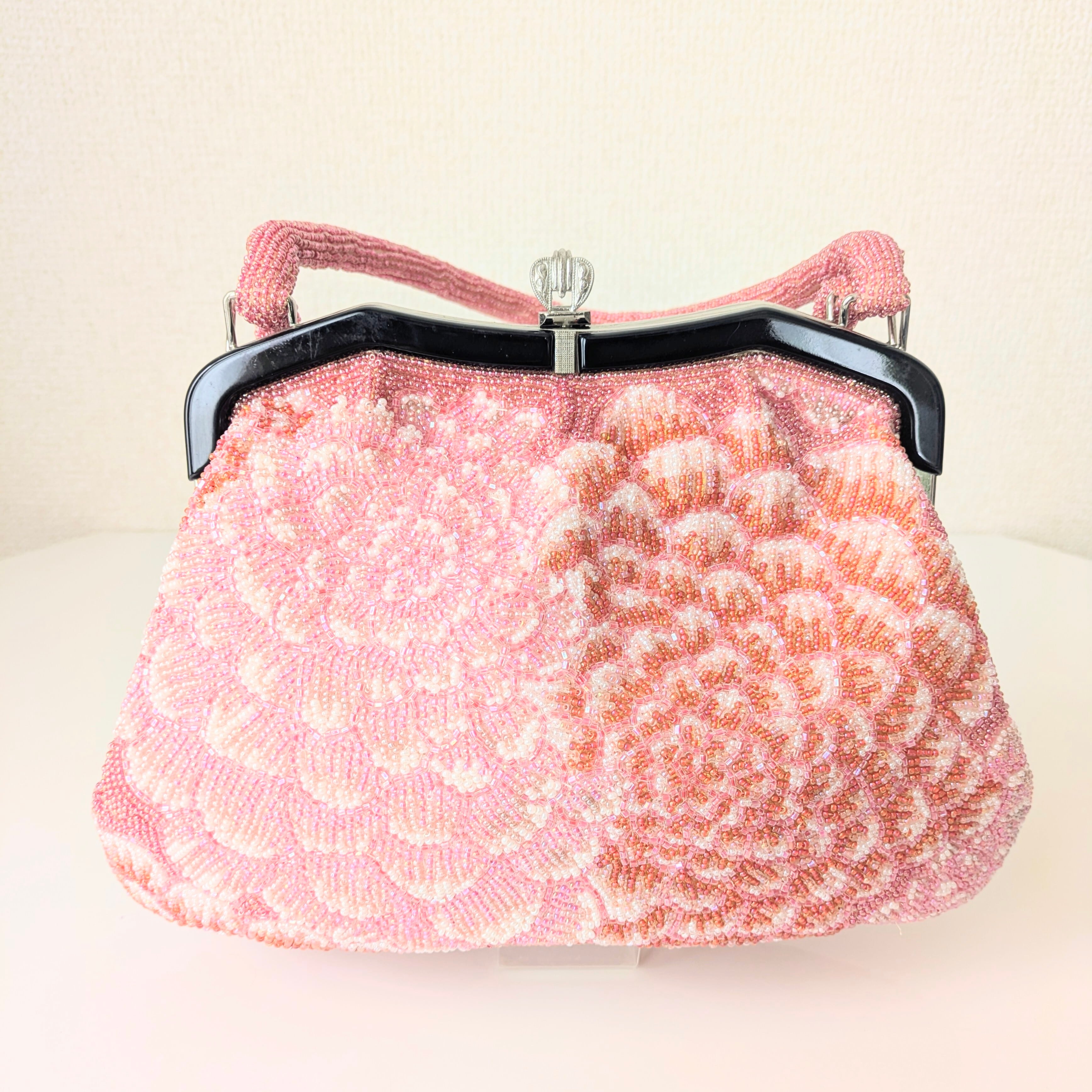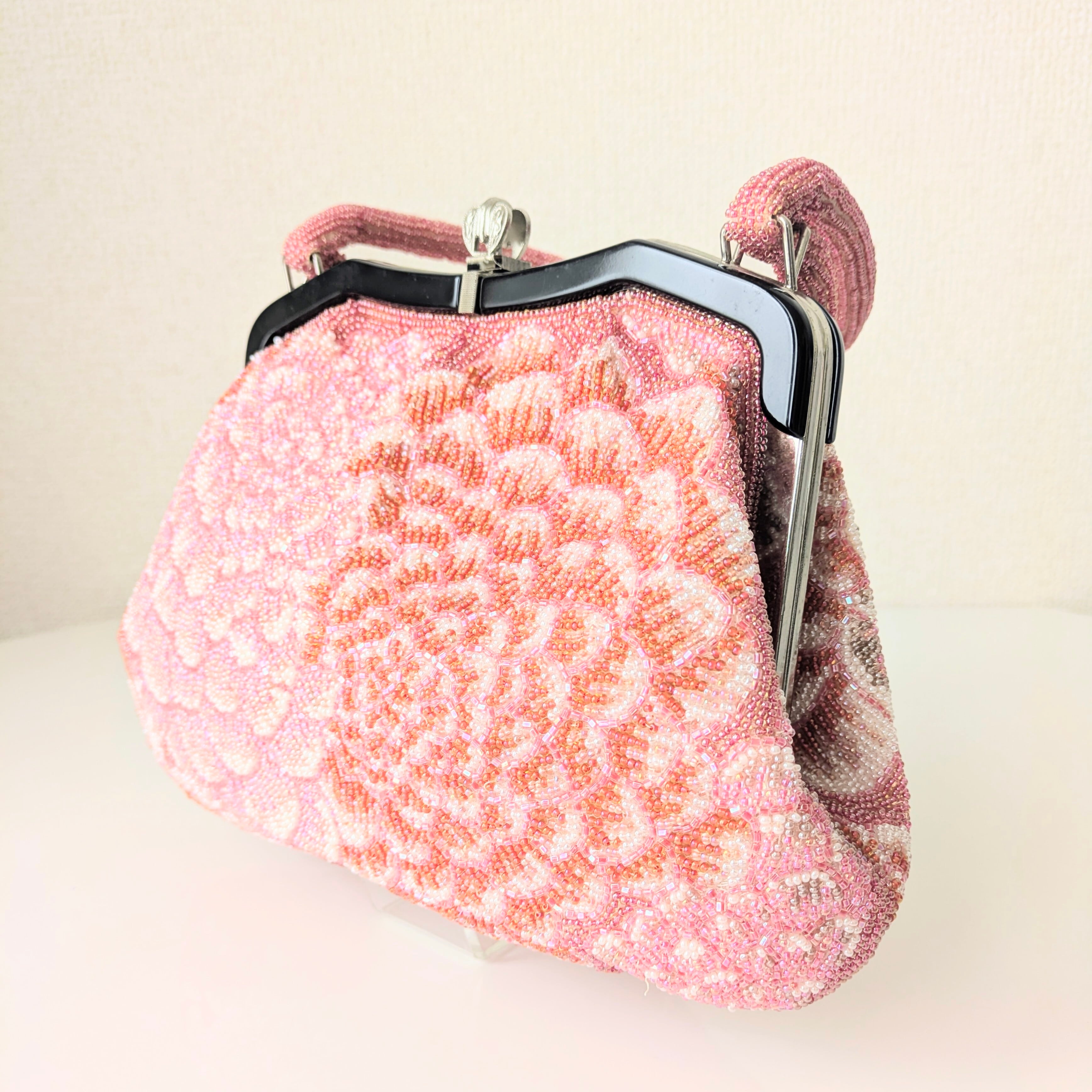 【Vintage】ビーズ刺繍バッグ 赤 ピンク 万寿菊 パーティーバッグ クラッチバッグ 昭和レトロ 大正浪漫 フォーマルバッグ