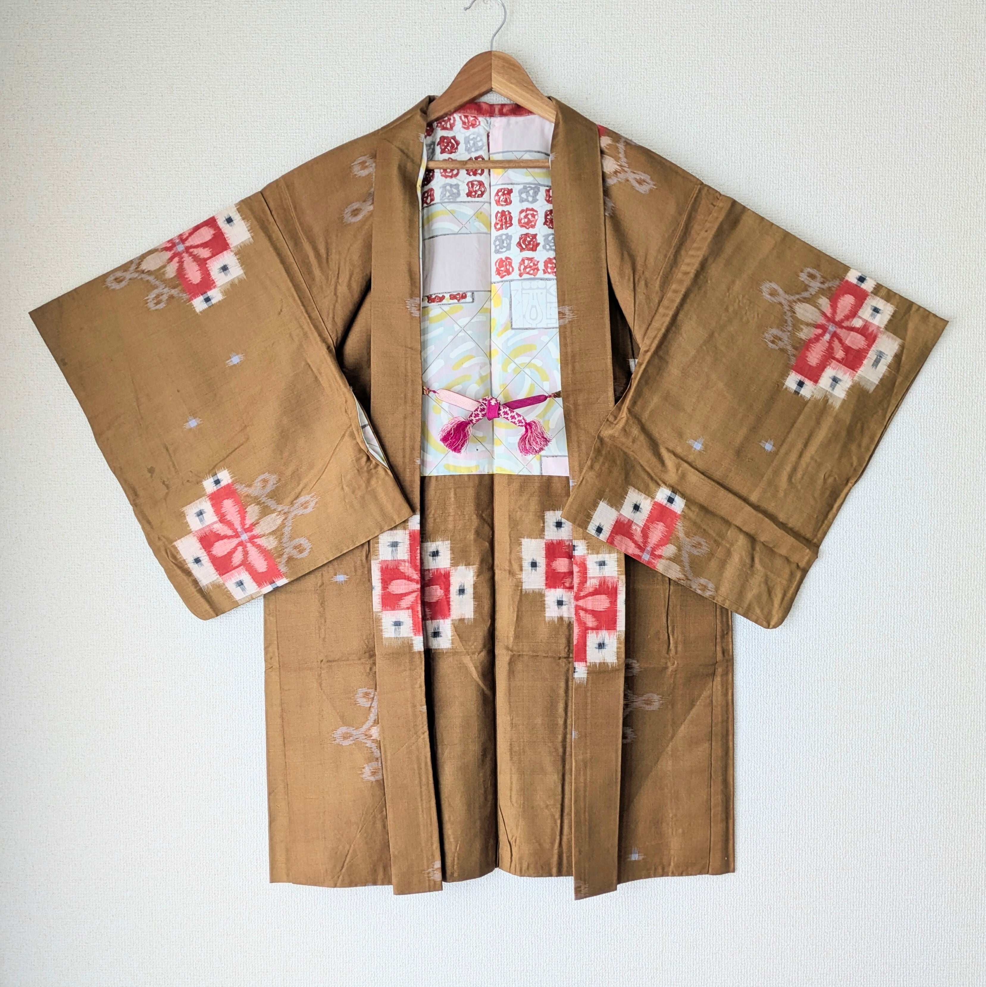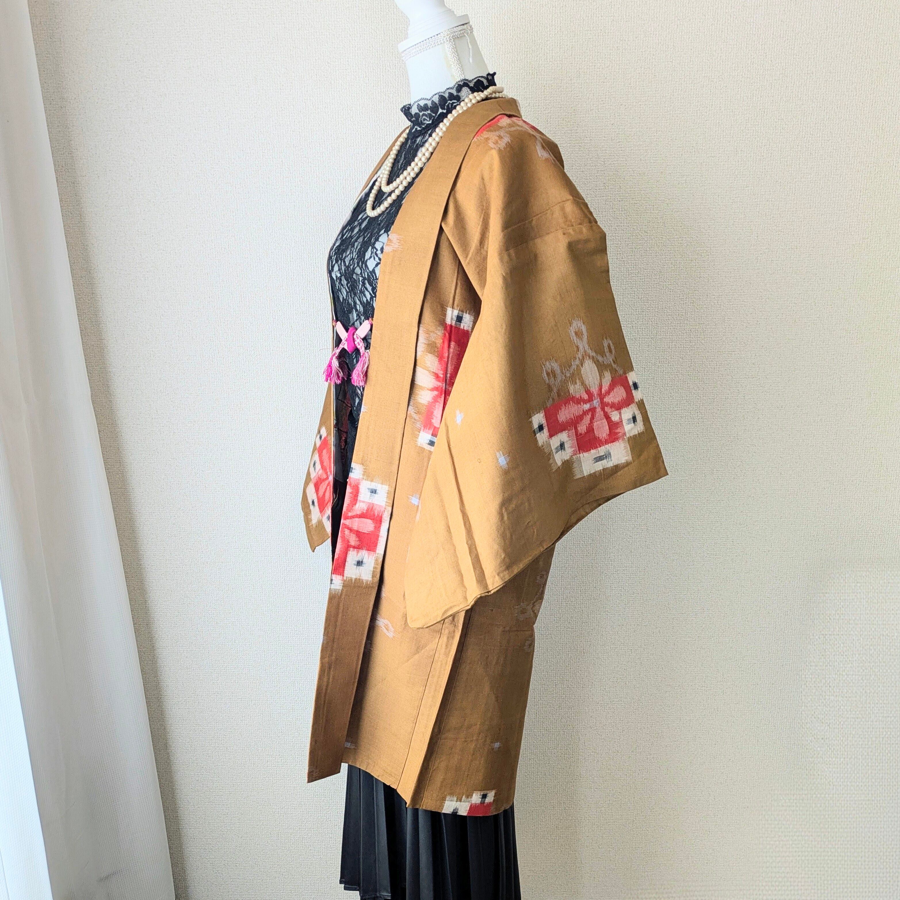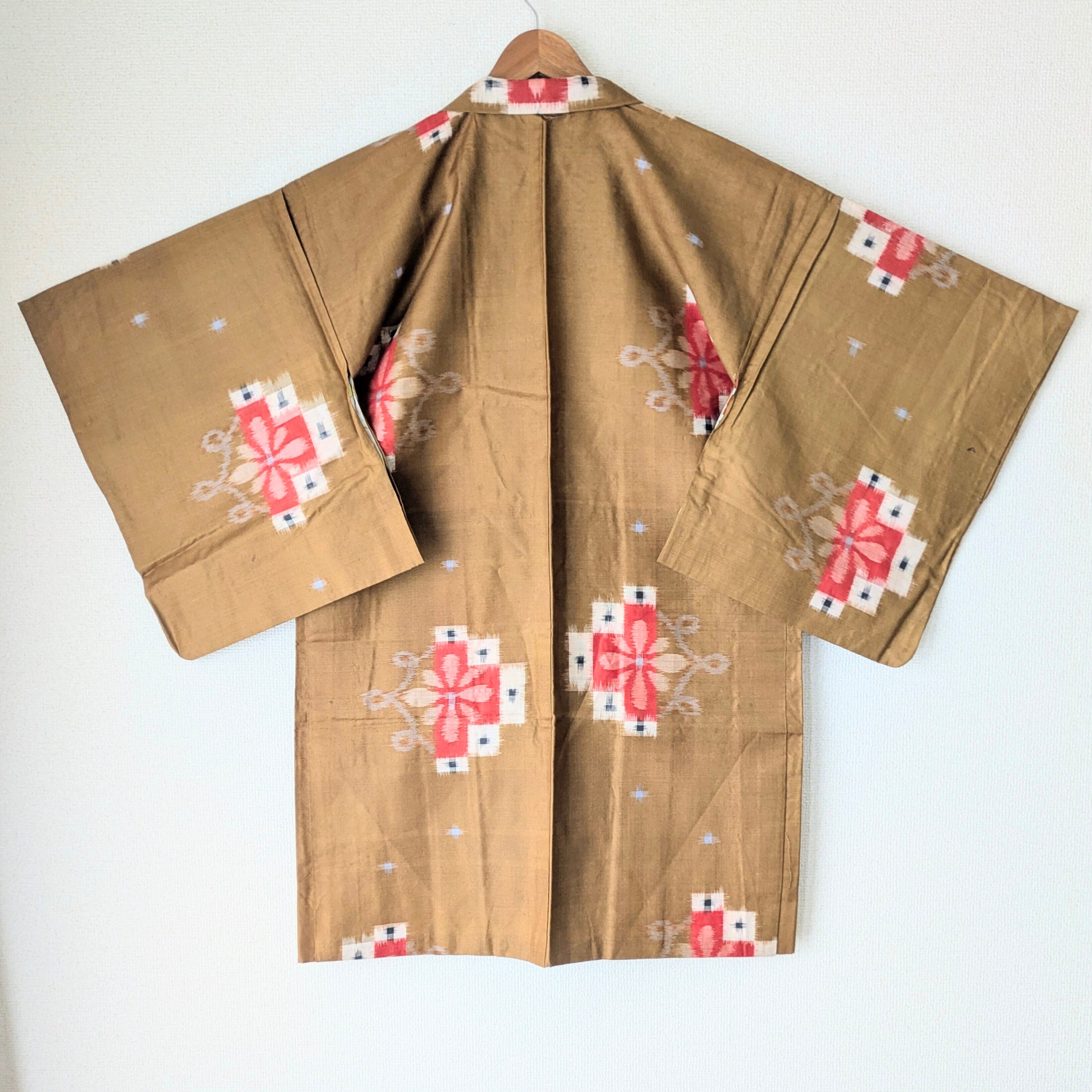 【Vintage】HAORI 羽織 正絹 銘仙 山吹色 絣花柄 大正浪漫 古布 時代布 和洋折衷