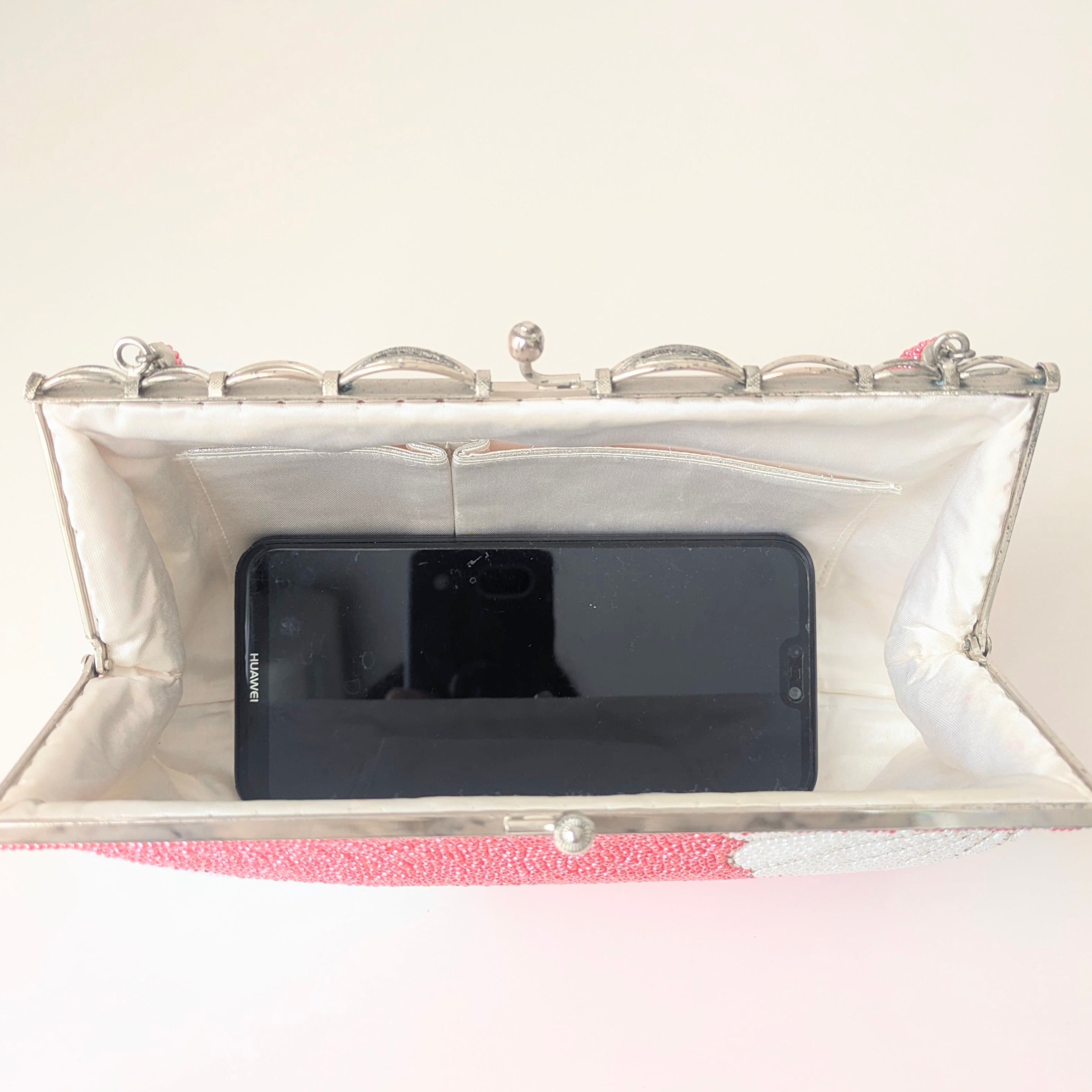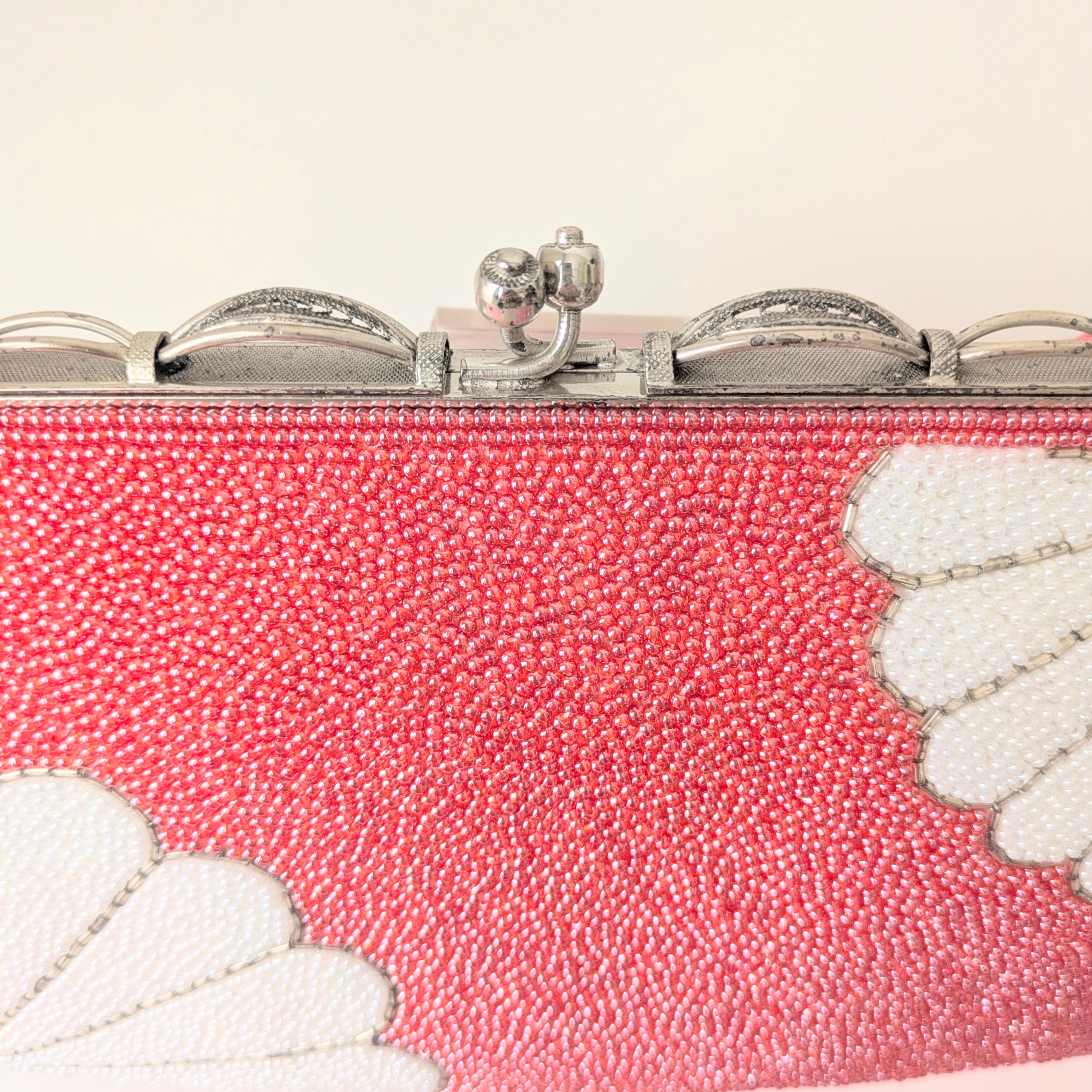赤とピンクの中間といったマゼンタピンク色に、白の菊文様があしらわれたビーズバッグです。色の対比や柄の配置がとても美しい逸品です。