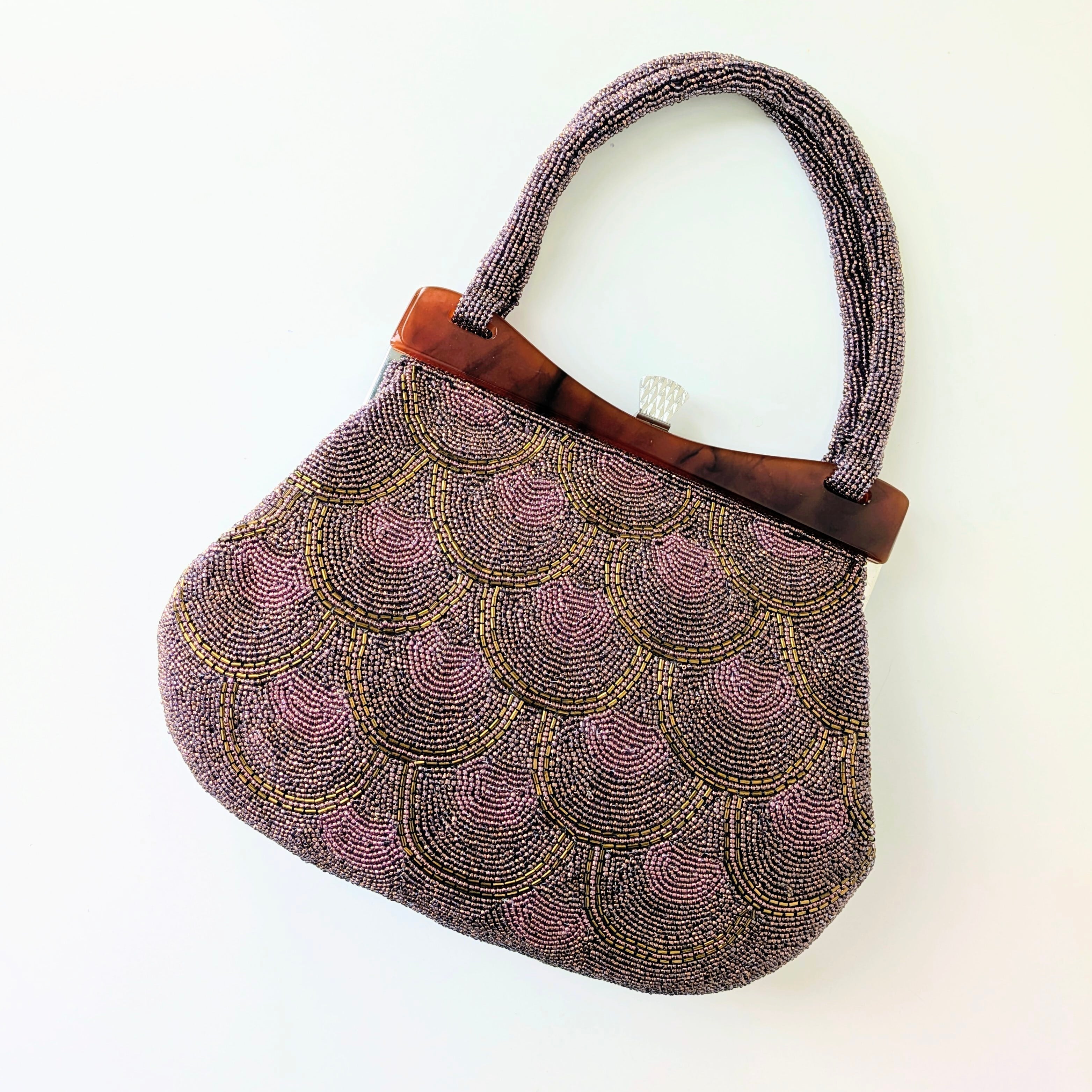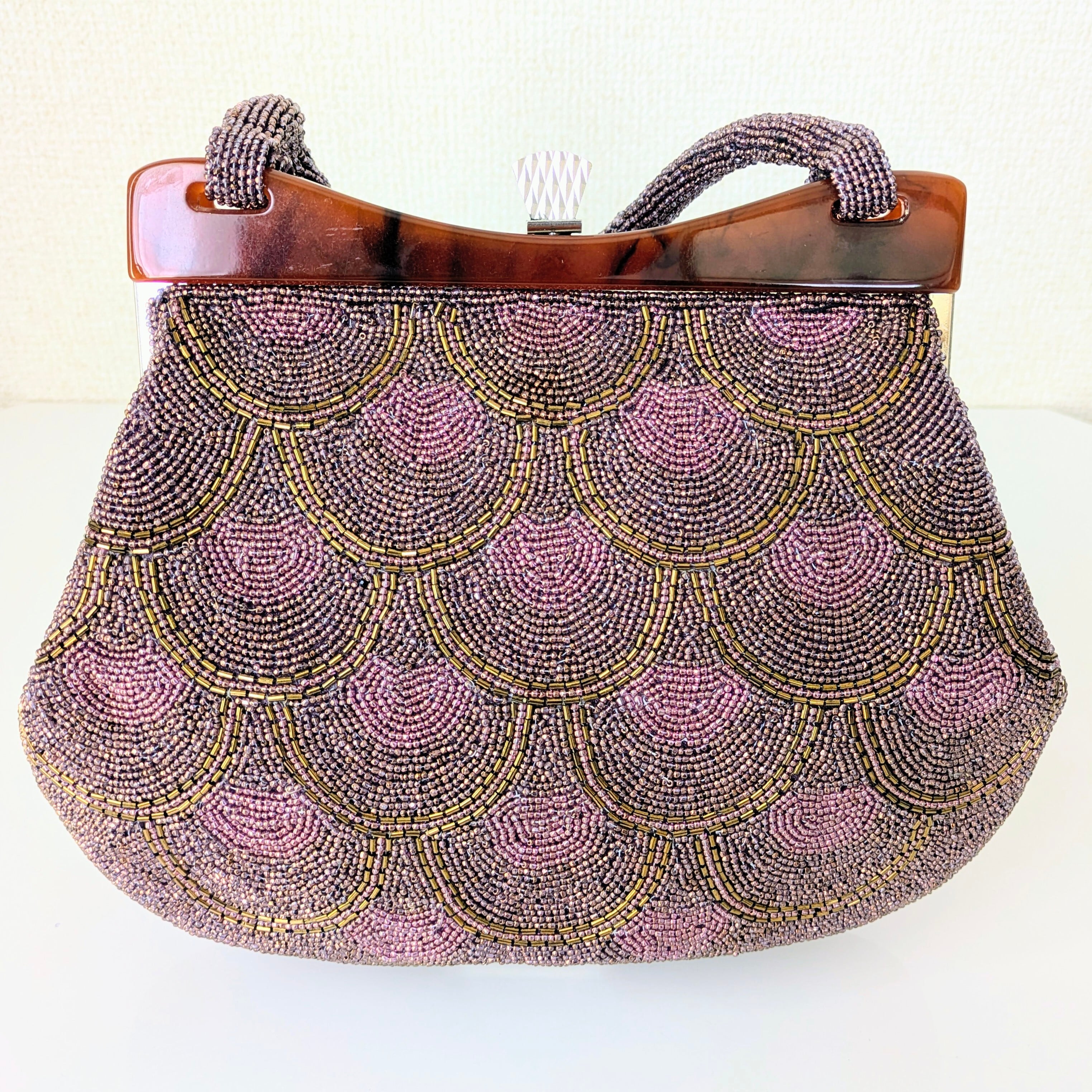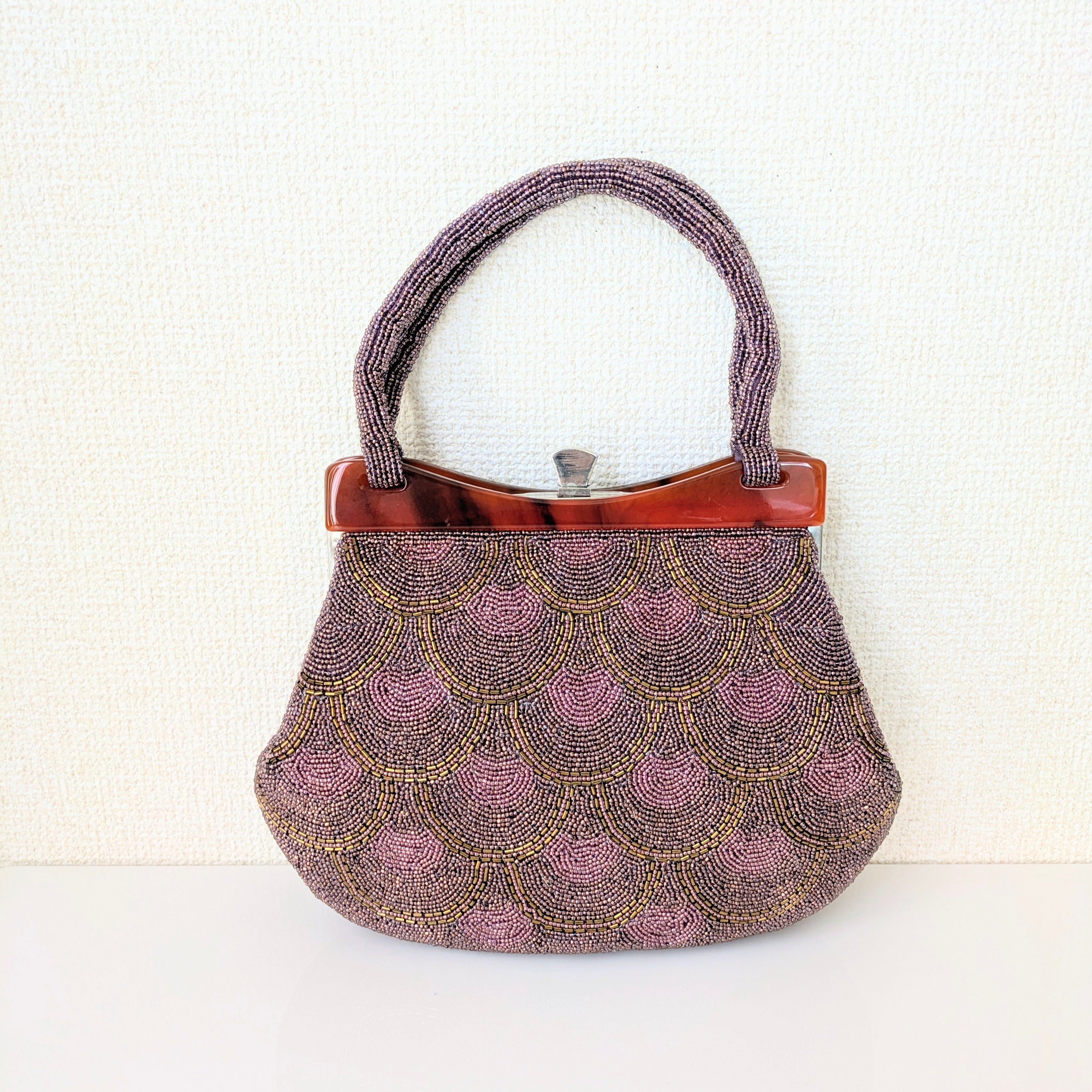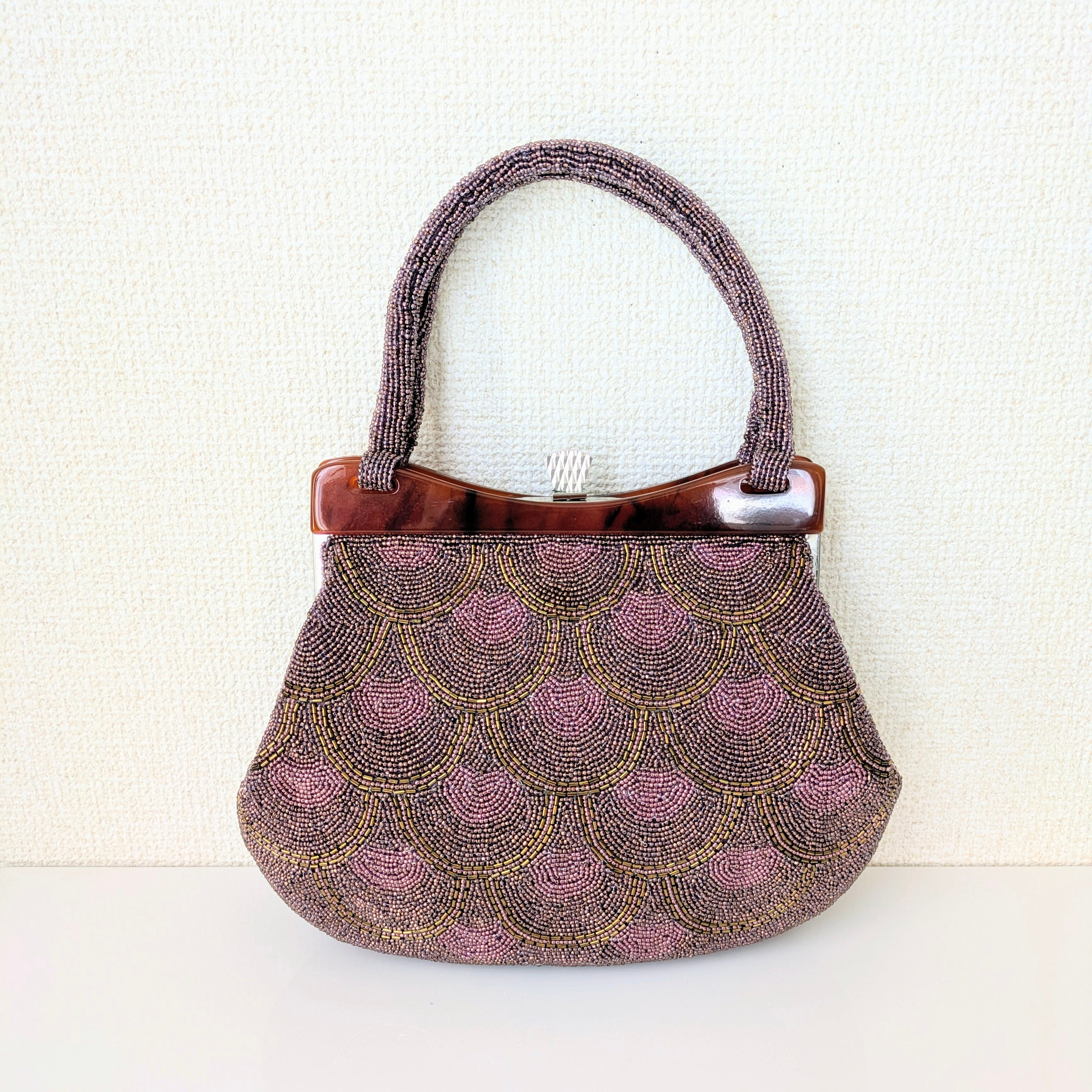 【Vintage】ビーズ刺繍バッグ 紫 ブロンズ色 青海波文様 パーティーバッグ クラッチバッグ 昭和レトロ 大正浪漫 フォーマルバッグ