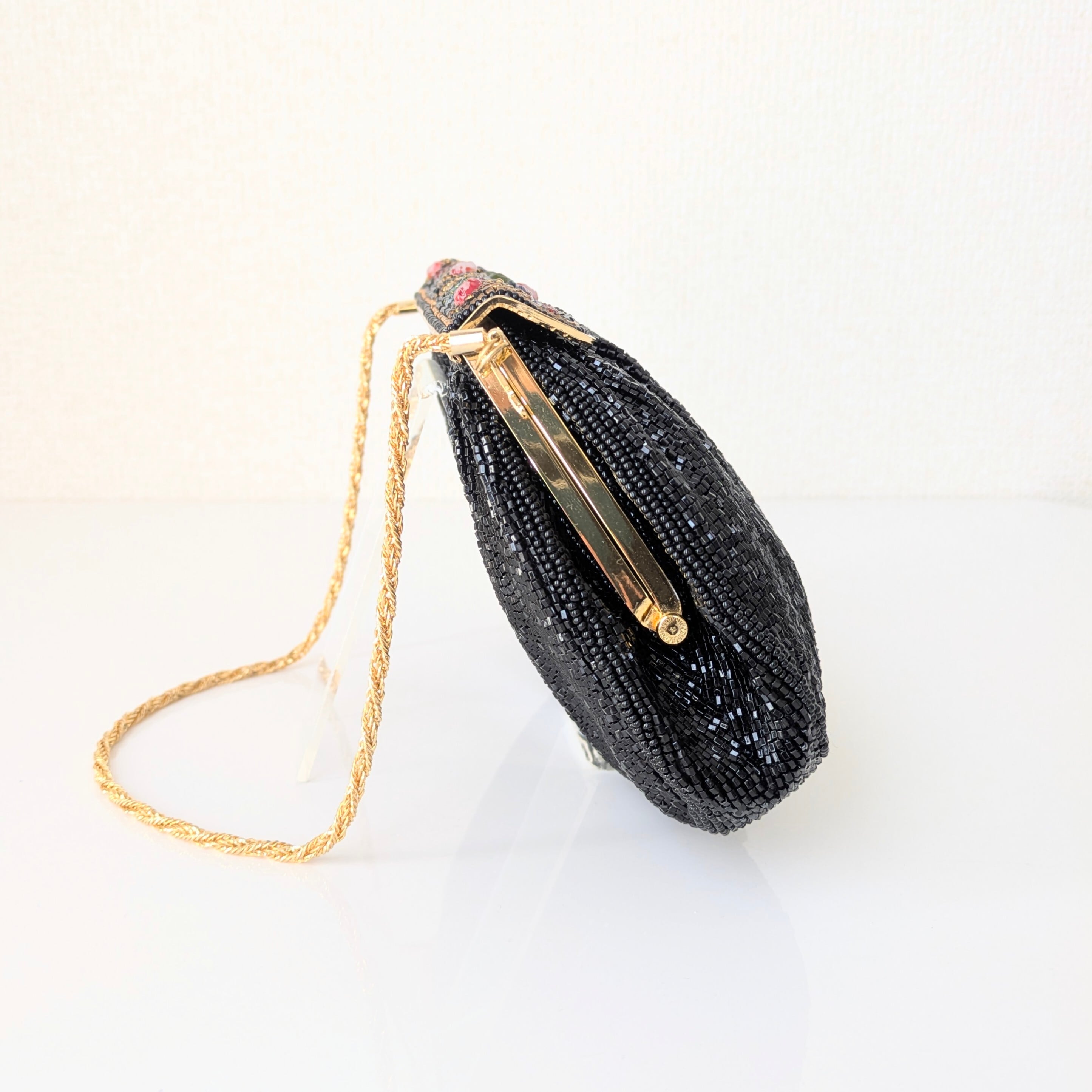 蓋に施されたカラフルで煌びやかなビーズ装飾や、ゴールドのチェーンハンドルが黒地に映える、フラップ式のビーズバッグです。
