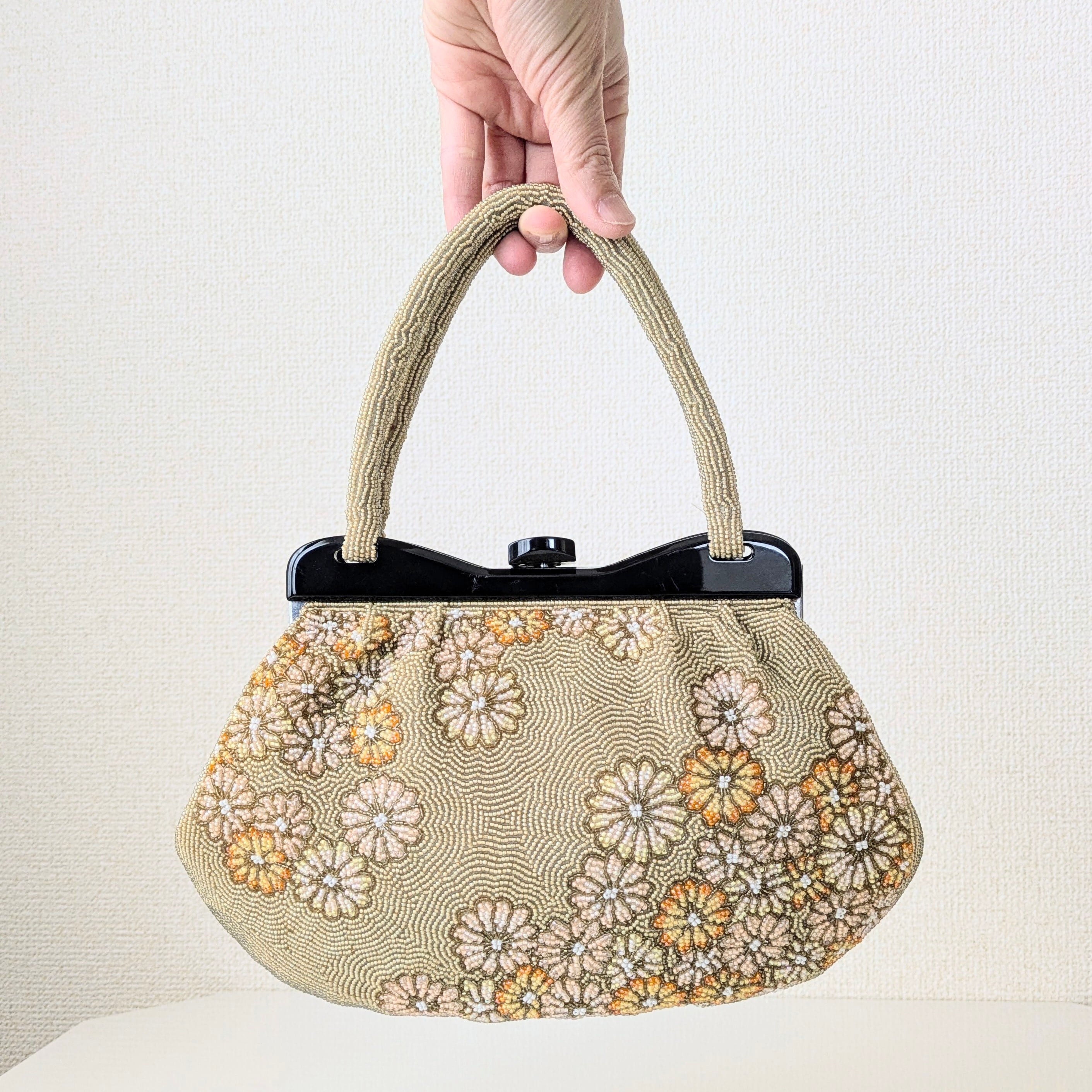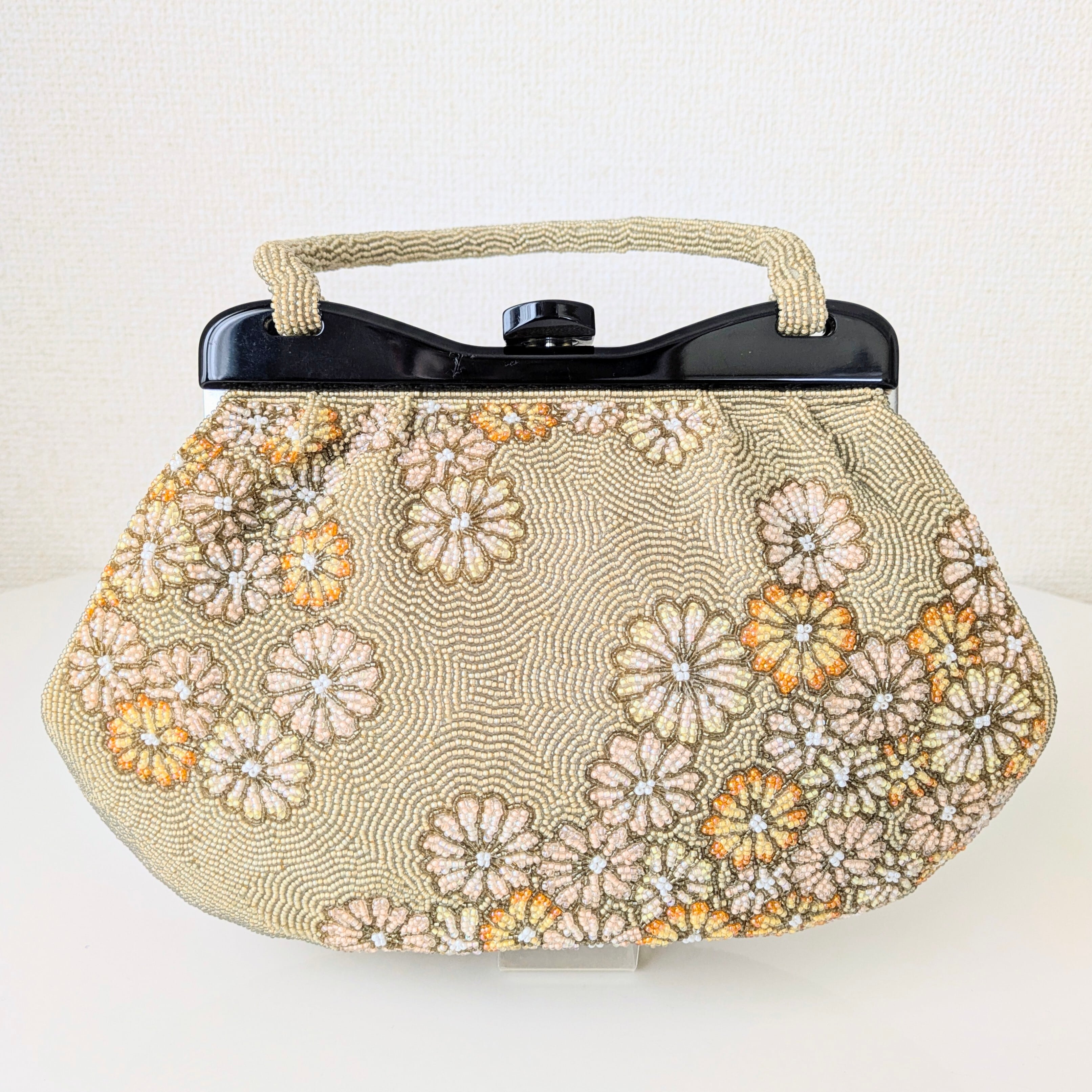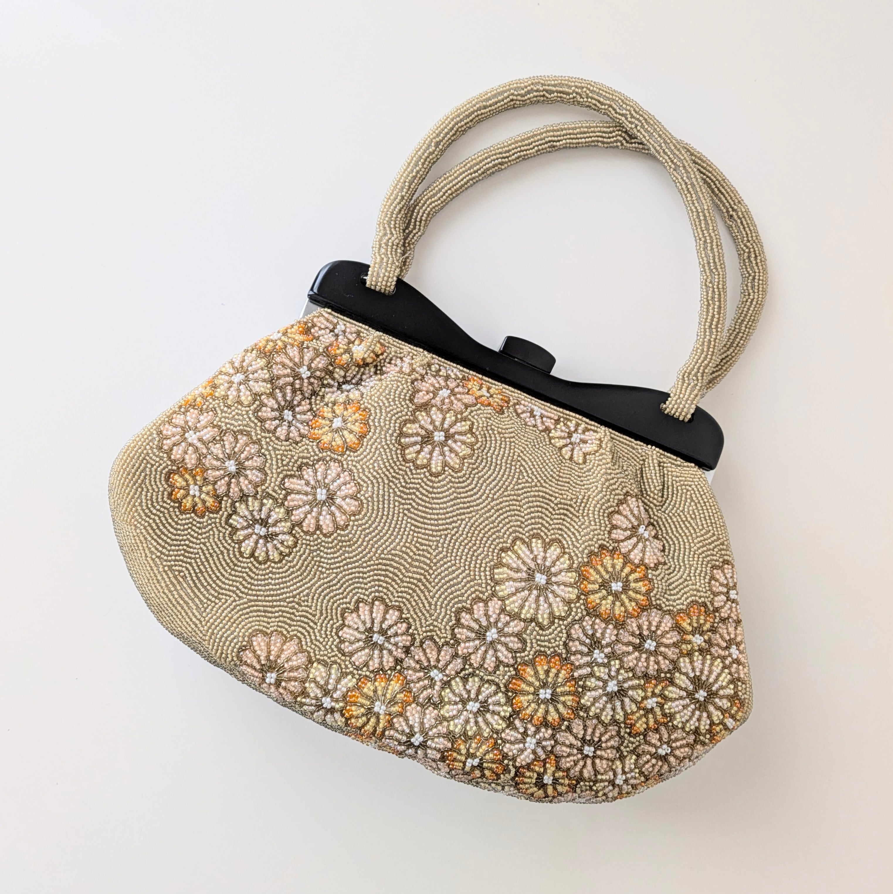 【Vintage】ビーズ刺繍バッグ ベージュ 菊柄 パーティーバッグ クラッチバッグ 昭和レトロ 大正浪漫 フォーマルバッグ