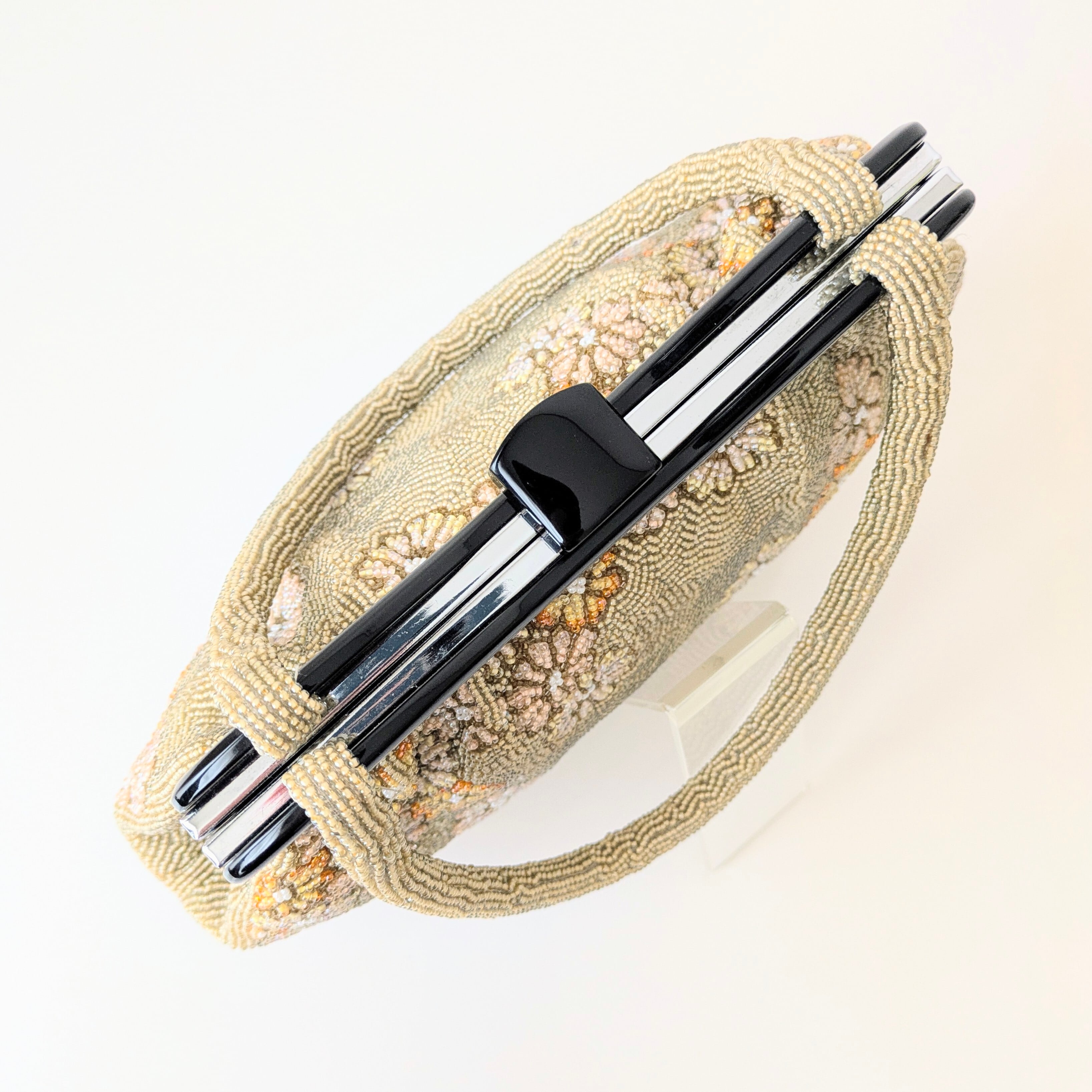 光を受けて美しく輝くヴィンテージビーズバッグ。
