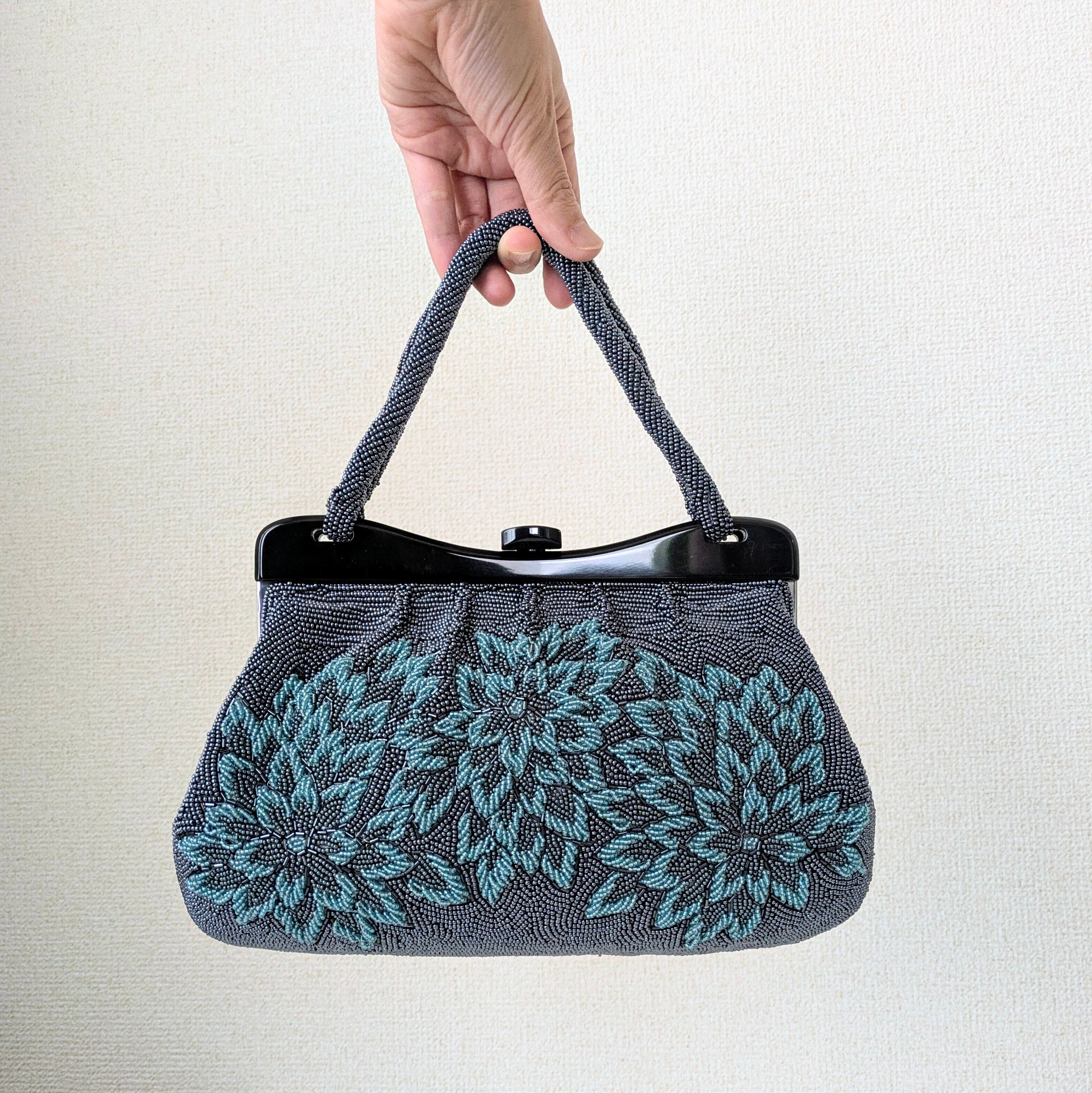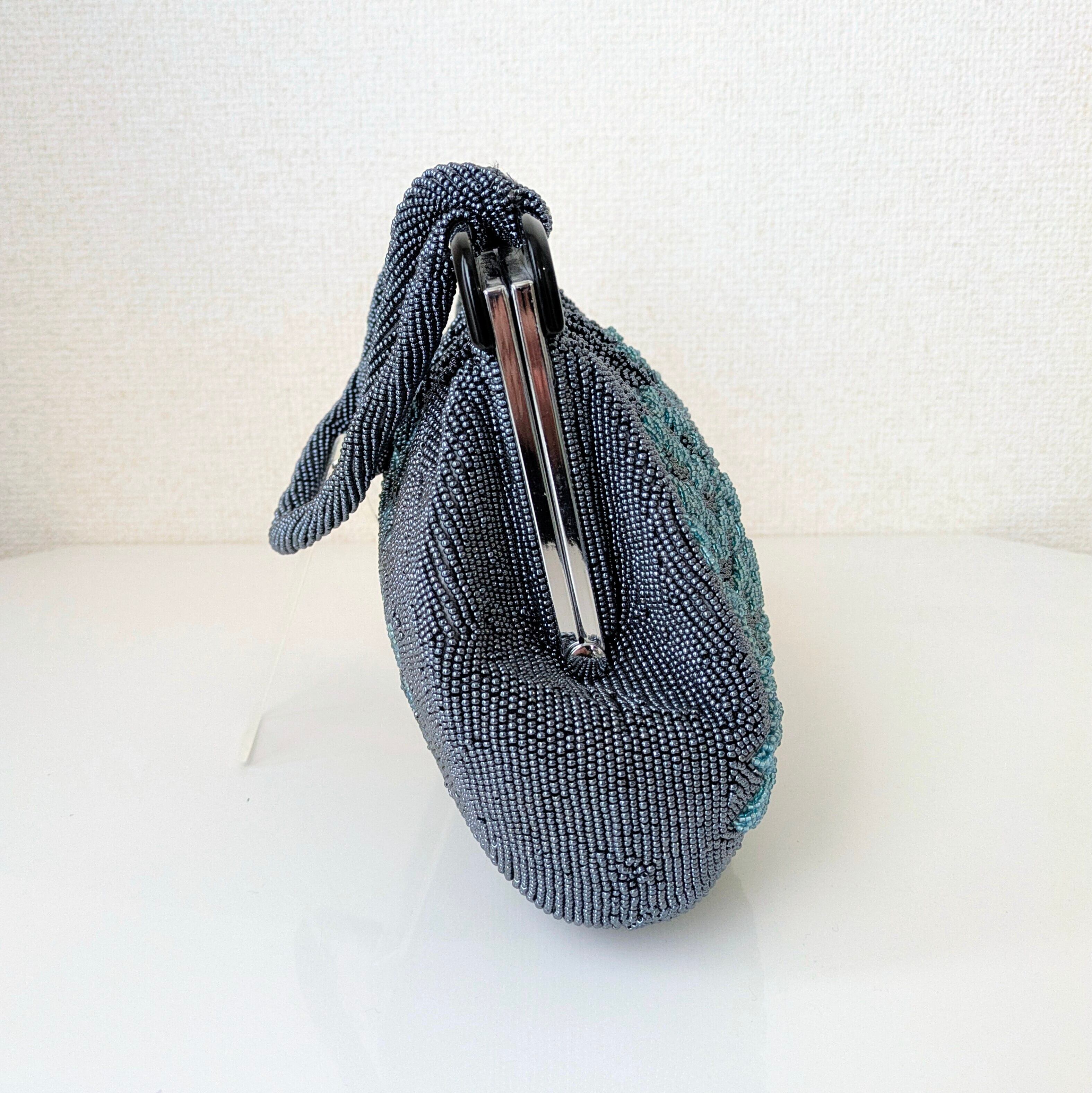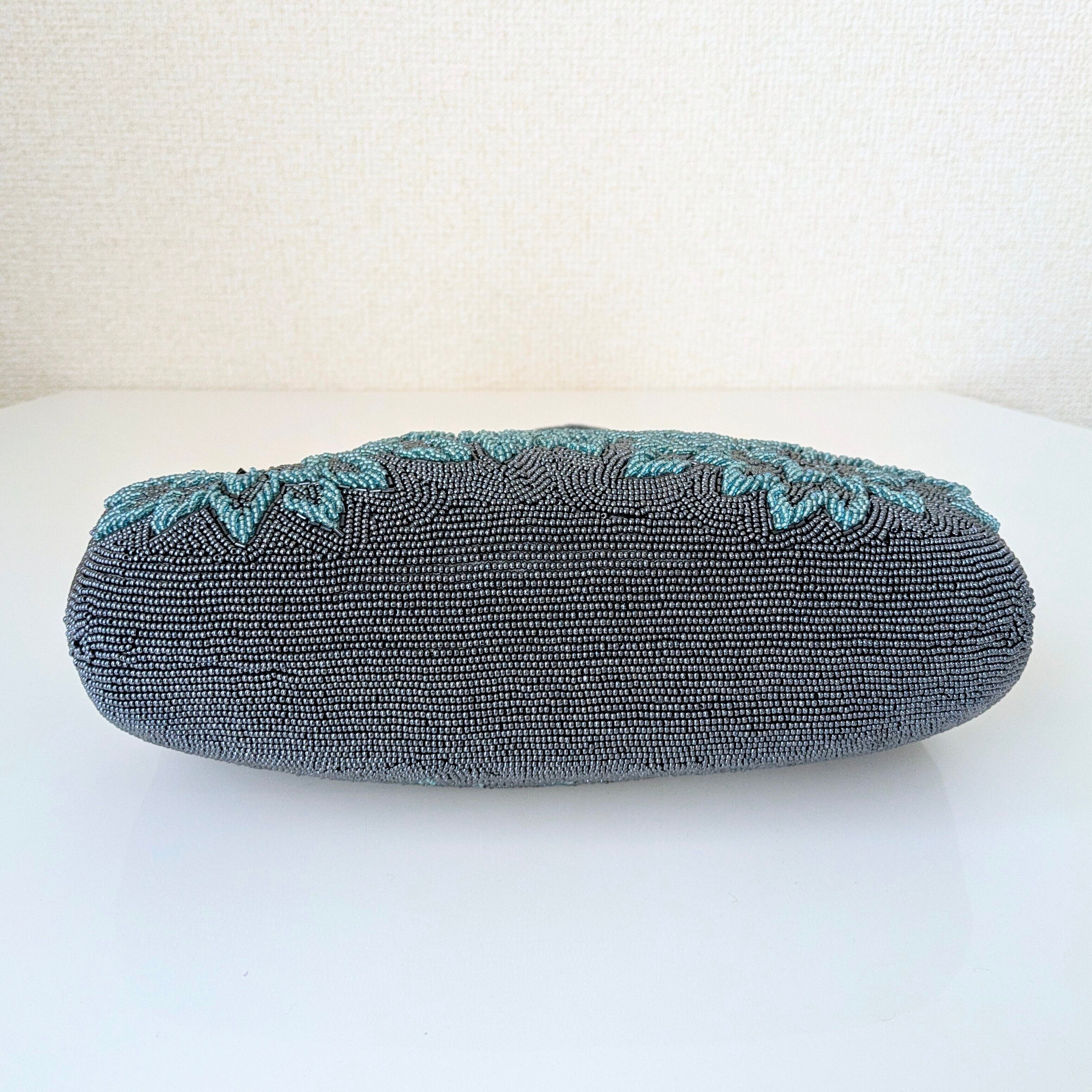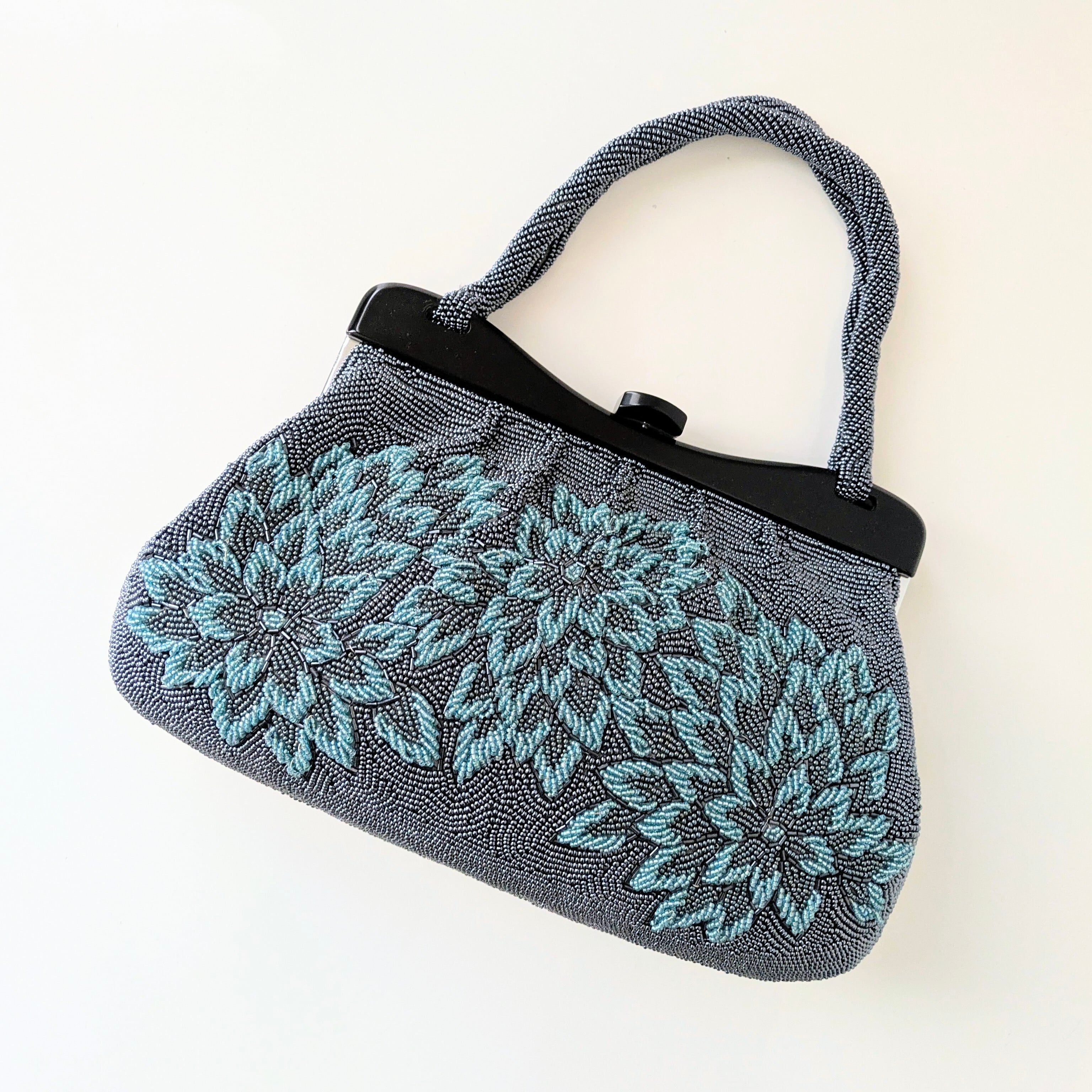【Vintage】ビーズ刺繍バッグ ブルーグレー×青 菊柄 パーティーバッグ クラッチバッグ 昭和レトロ 大正浪漫 フォーマルバッグ