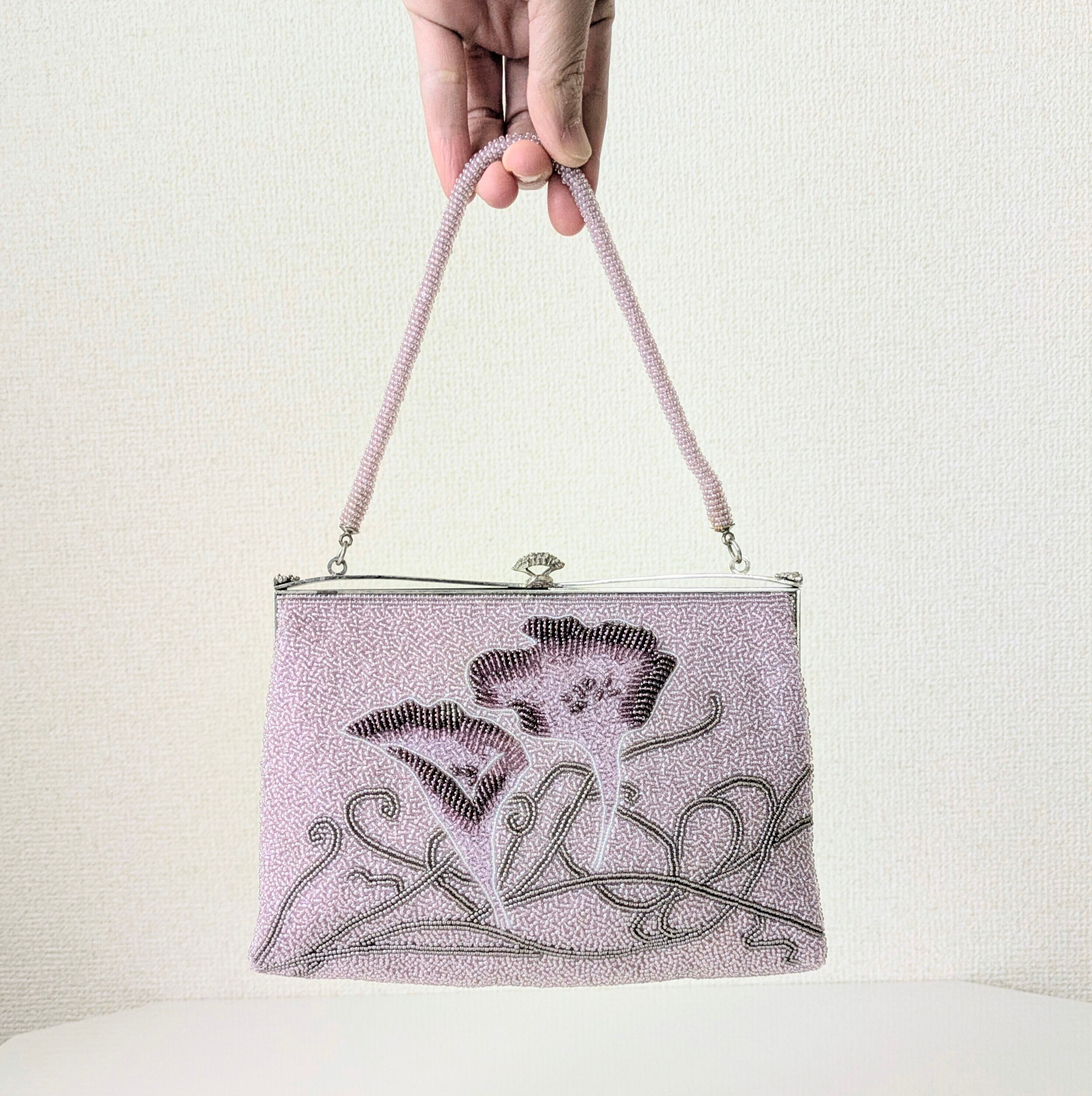 【Vintage】ビーズ刺繍バッグ 藤色 朝顔柄 パーティーバッグ クラッチバッグ 昭和レトロ 大正浪漫 フォーマルバッグ