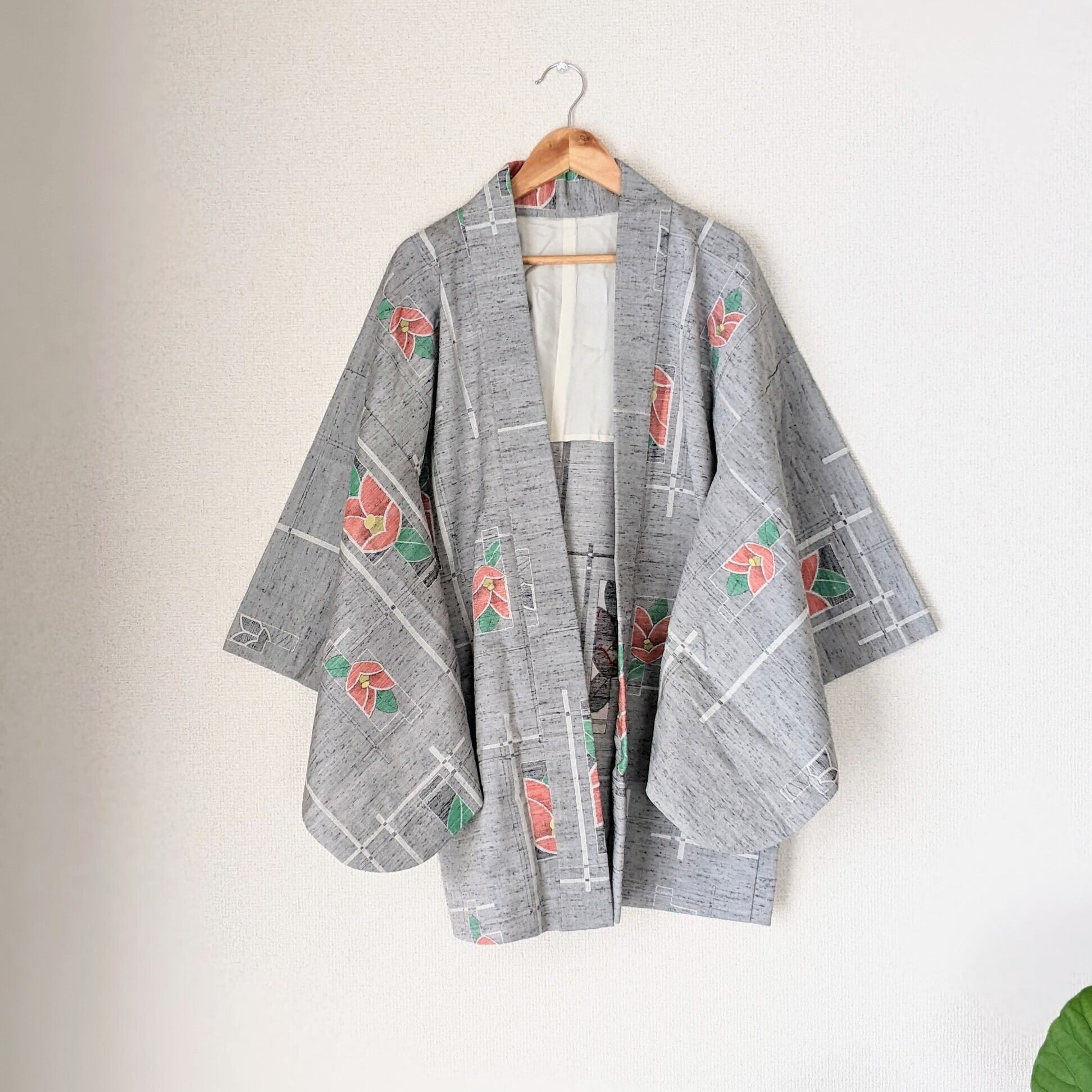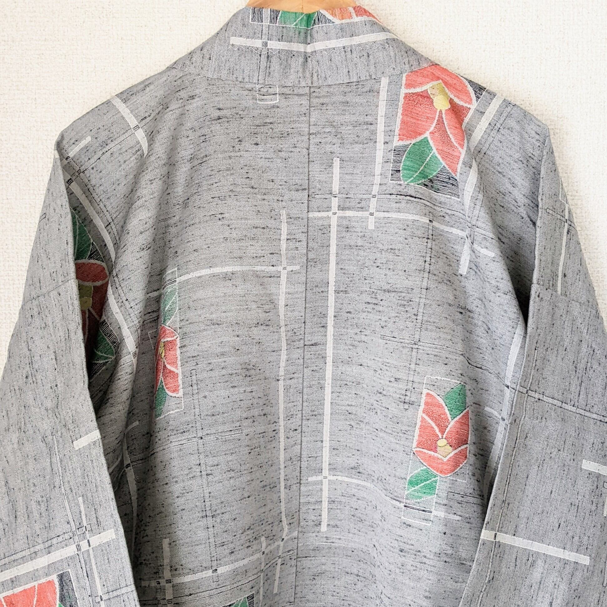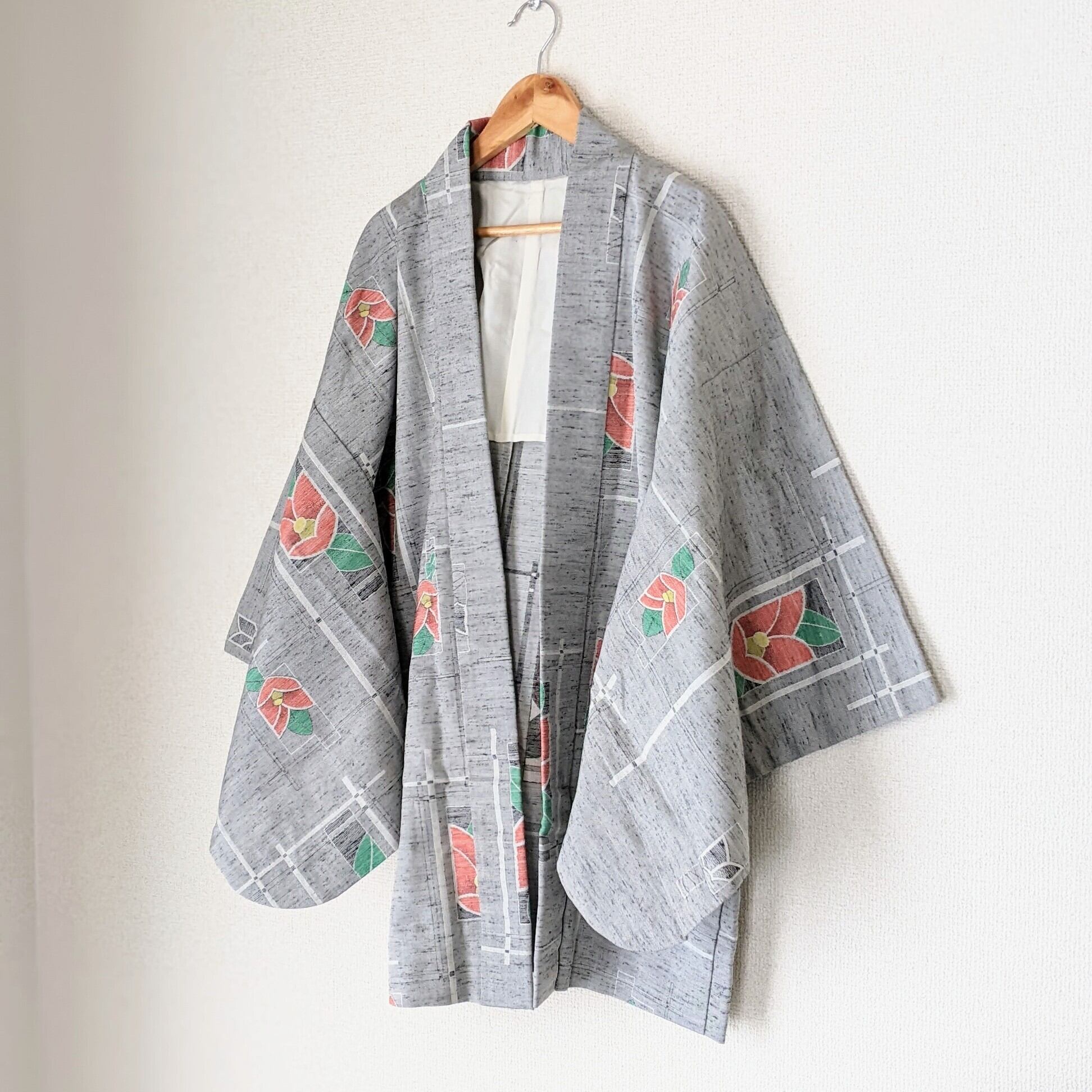 【Vintage】 羽織 ウール 椿柄 絣 カメリア グレー 着物 ジャケット 和洋折衷