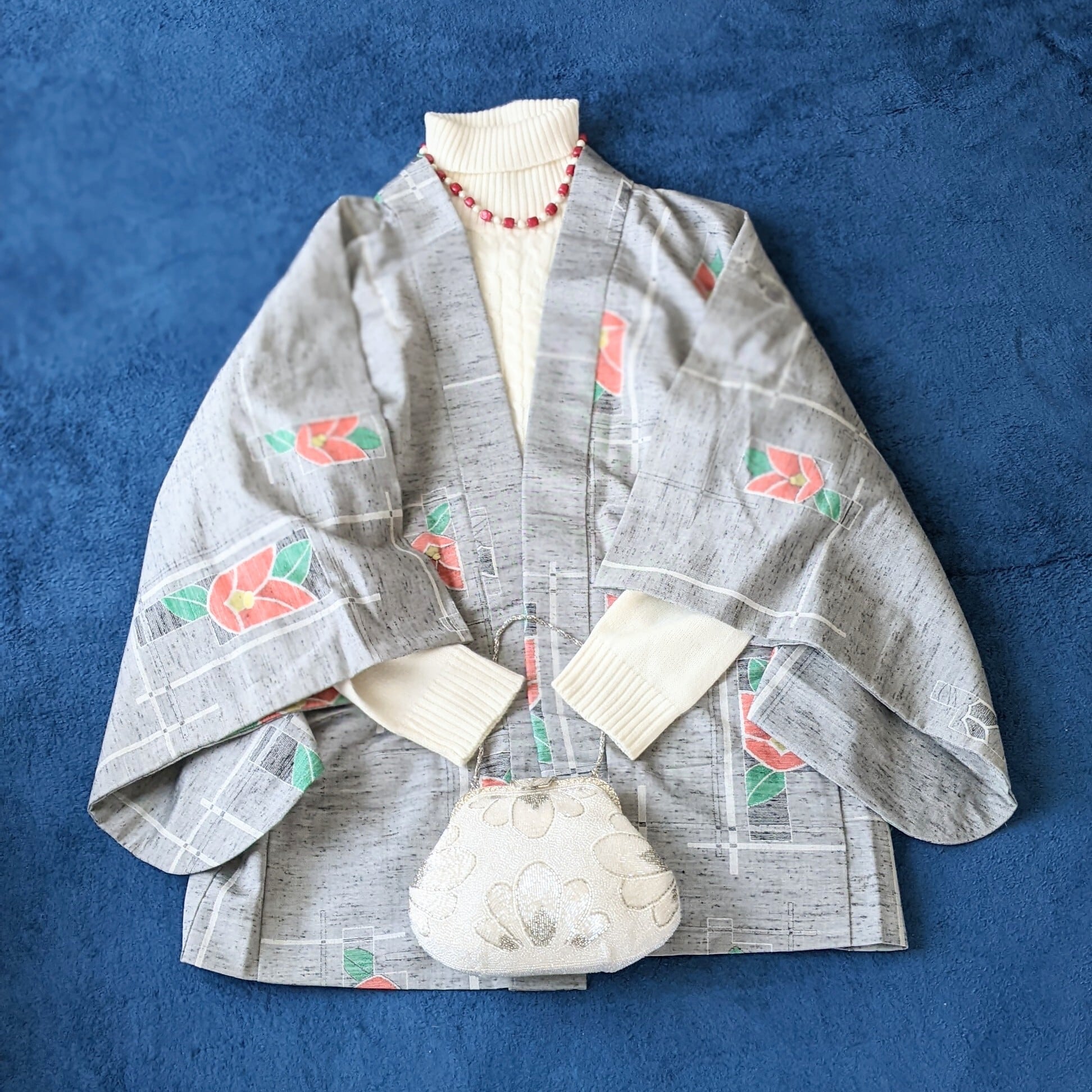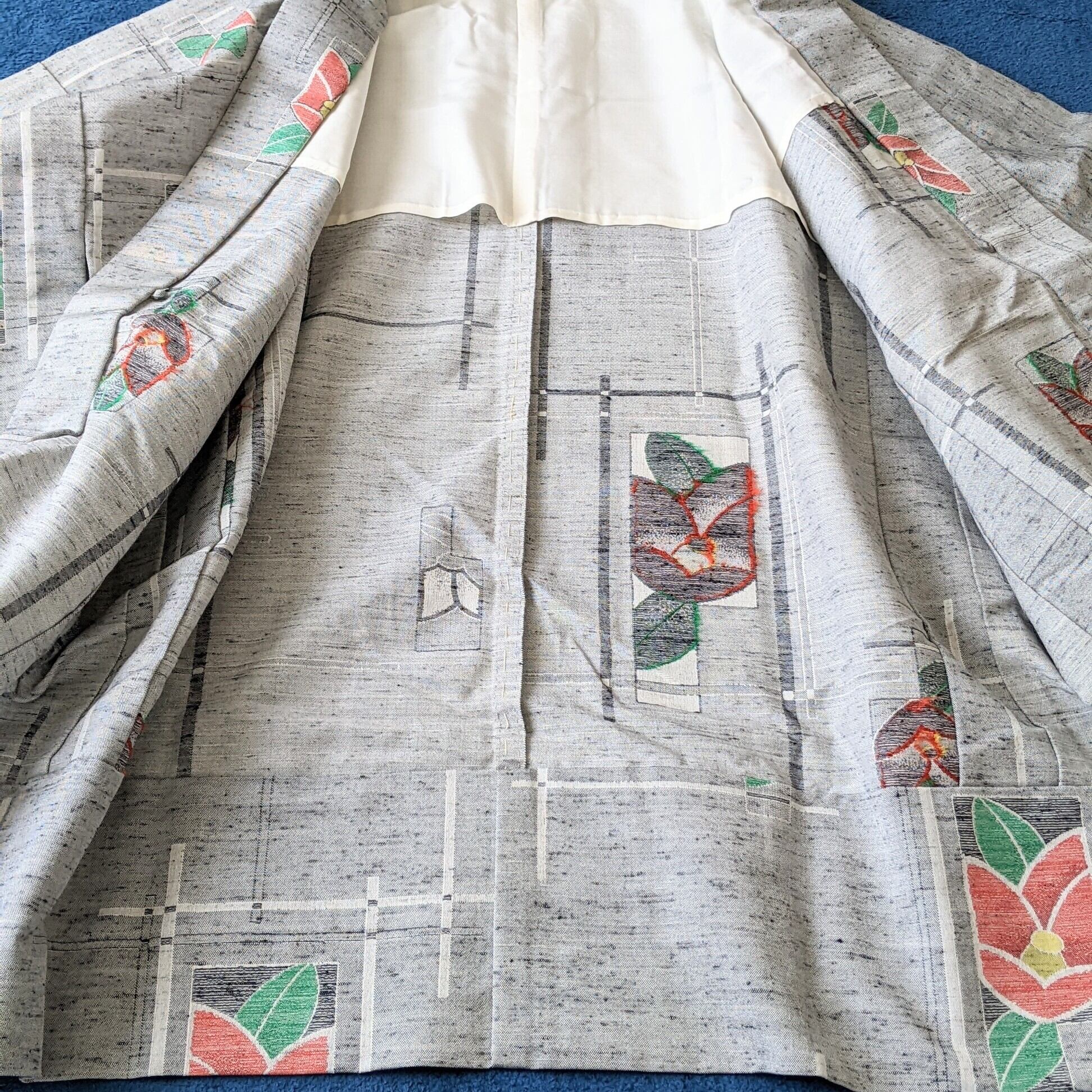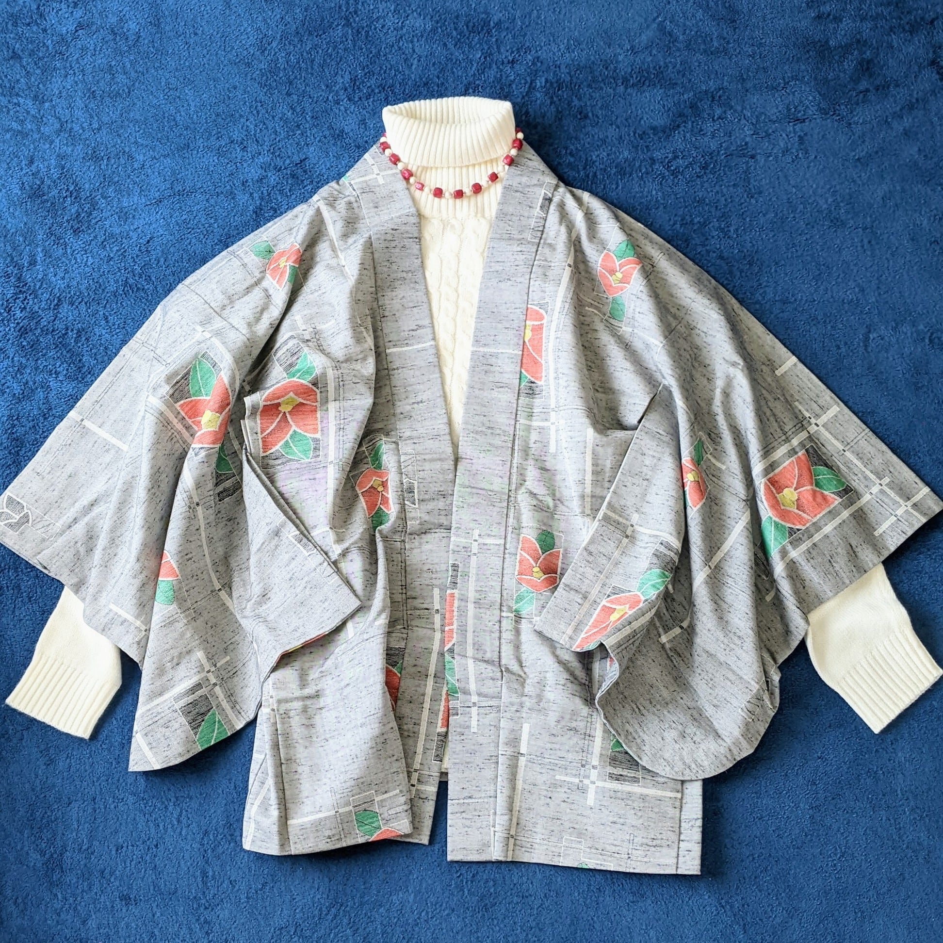 【Vintage】 羽織 ウール 椿柄 絣 カメリア グレー 着物 ジャケット 和洋折衷