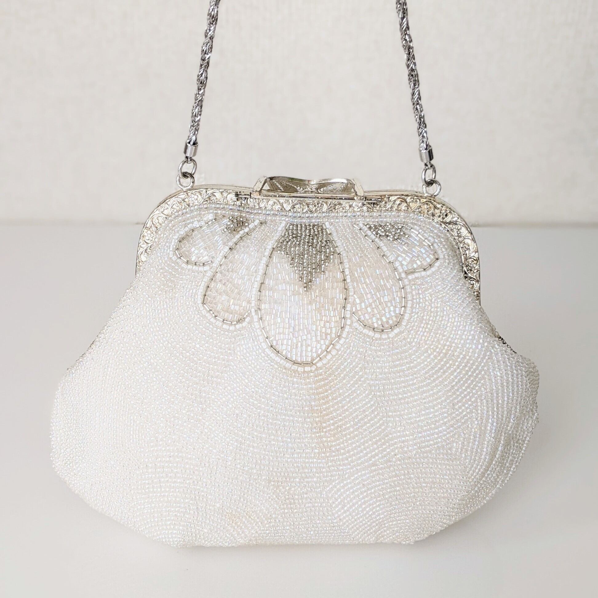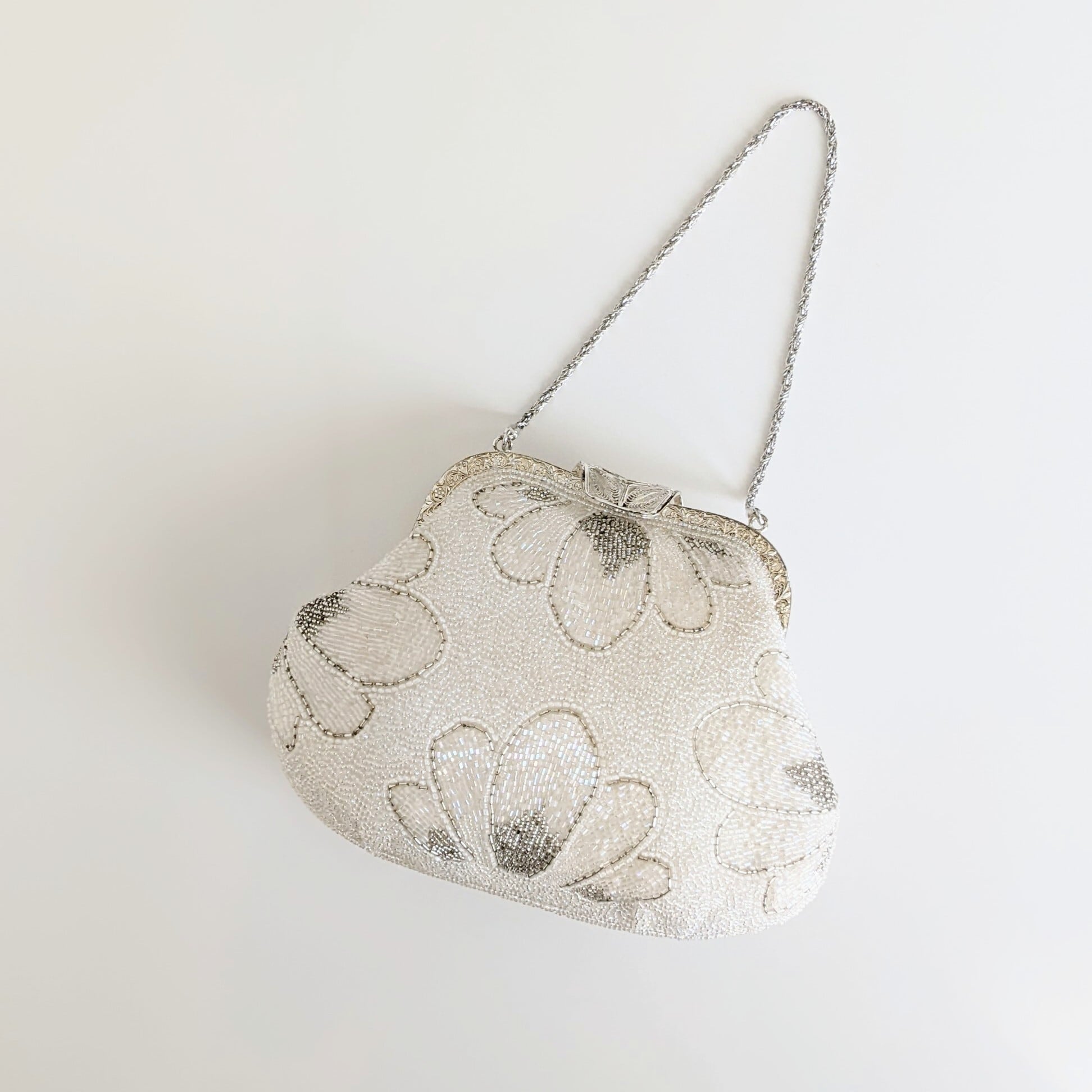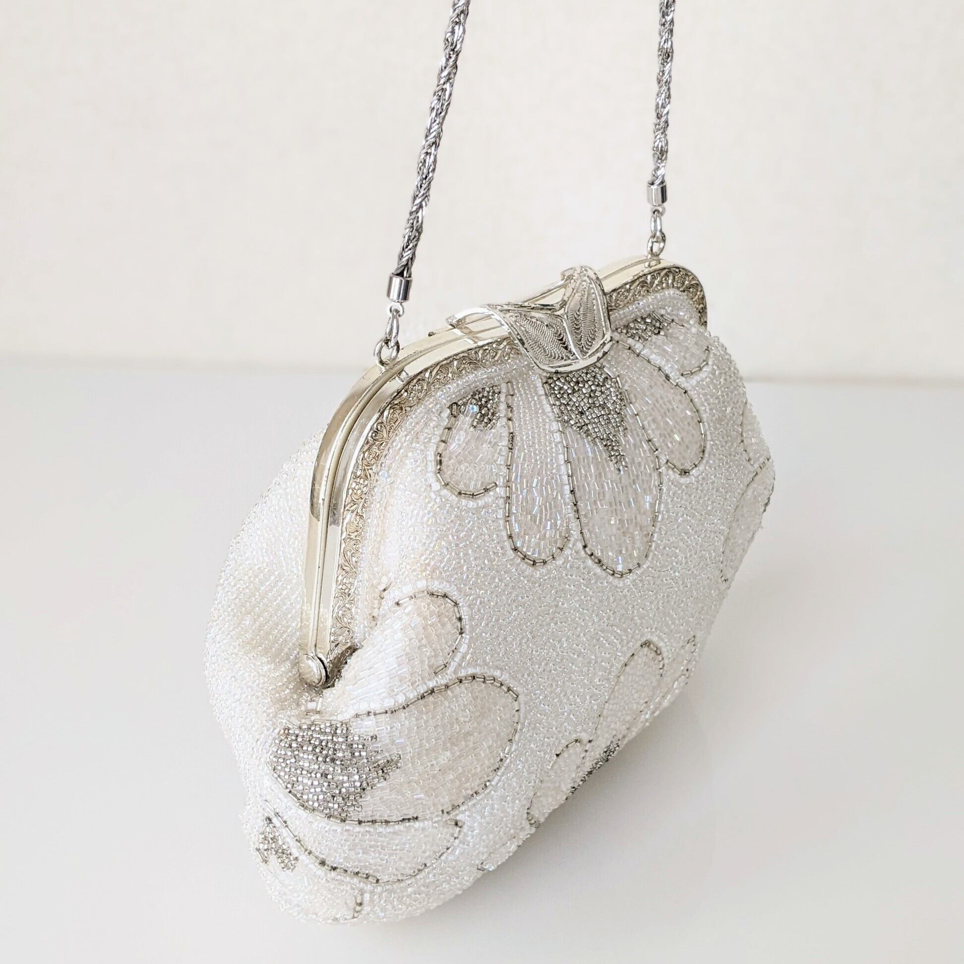 【vintage】ビーズ刺繍バッグ レトロ 白 クリア シルバー 花モチーフ