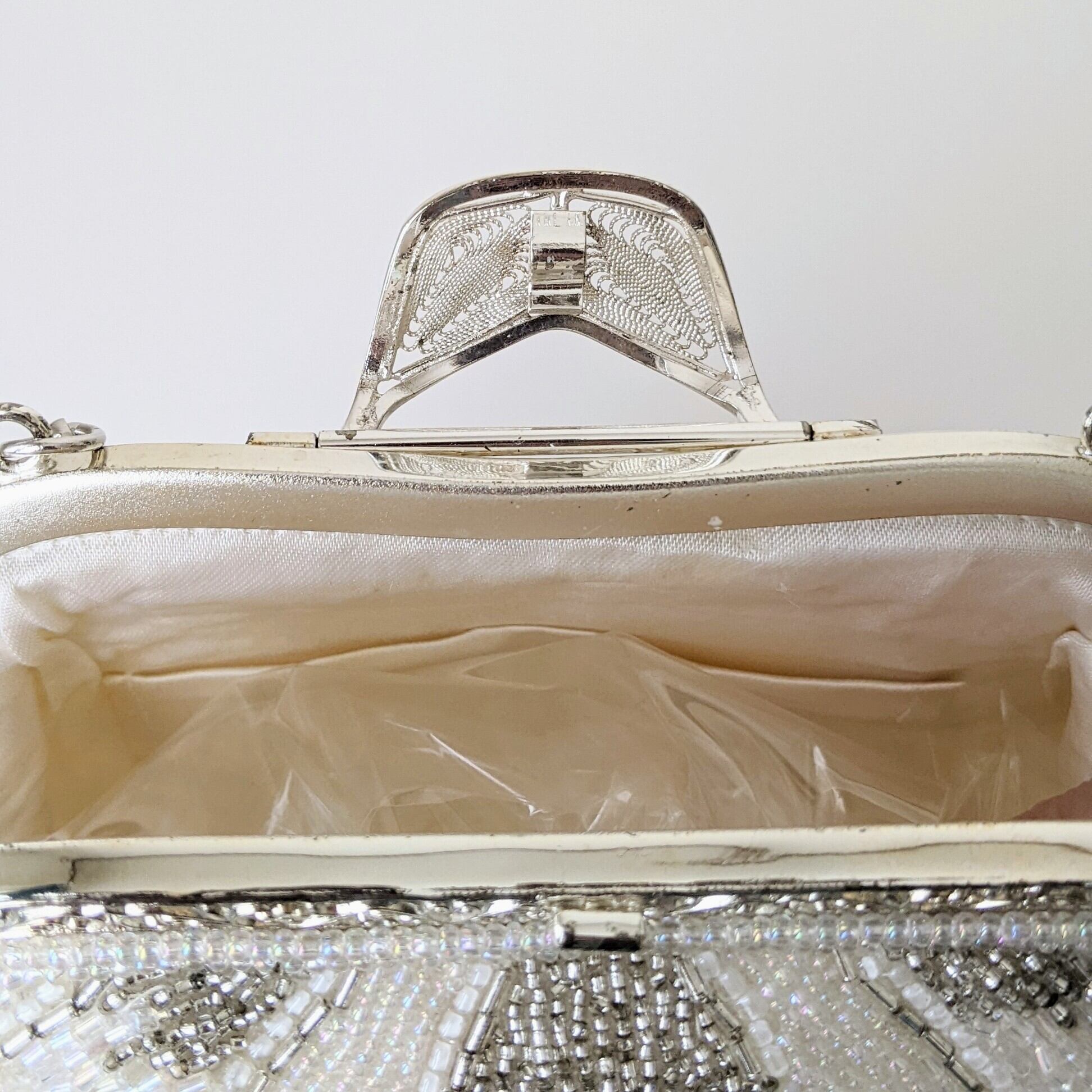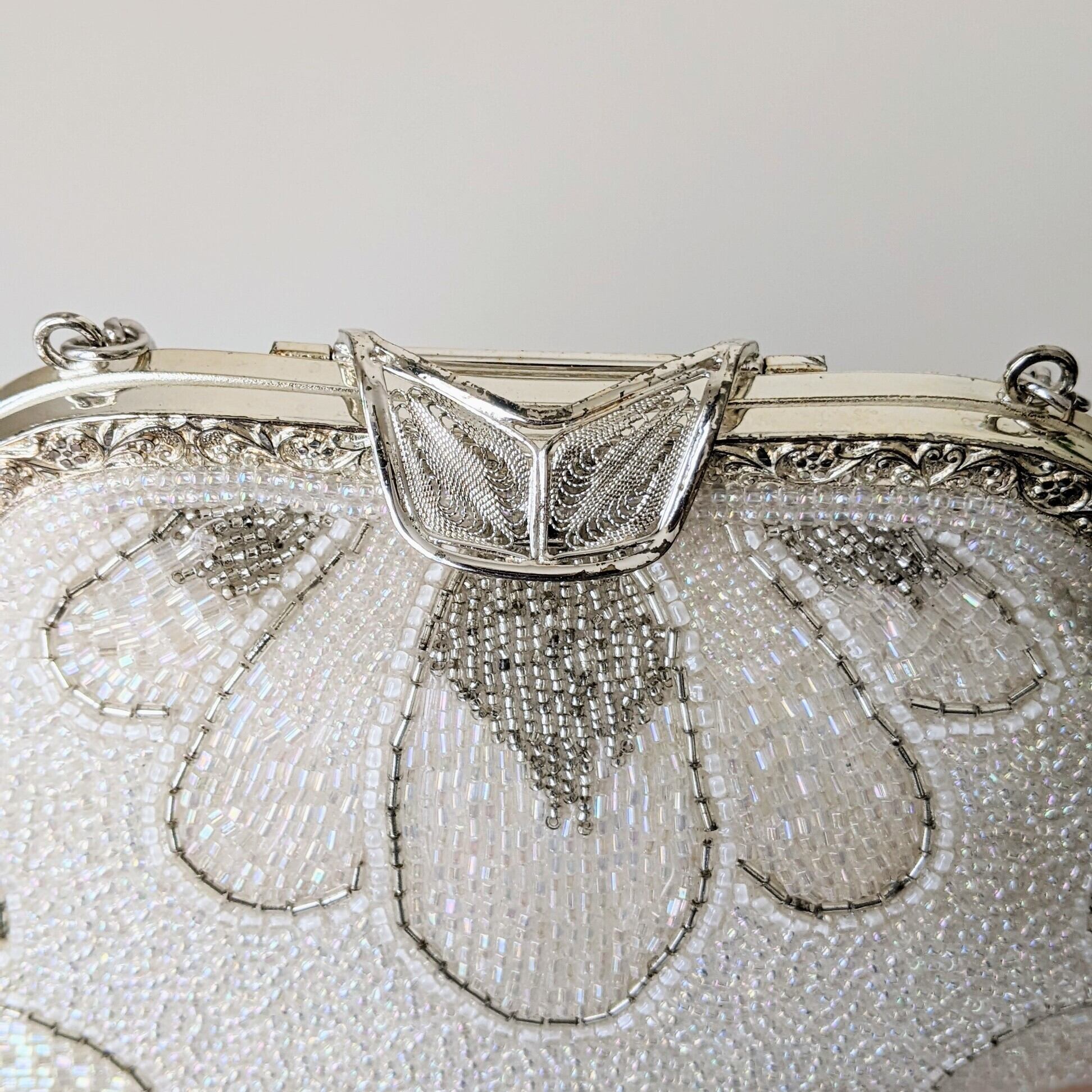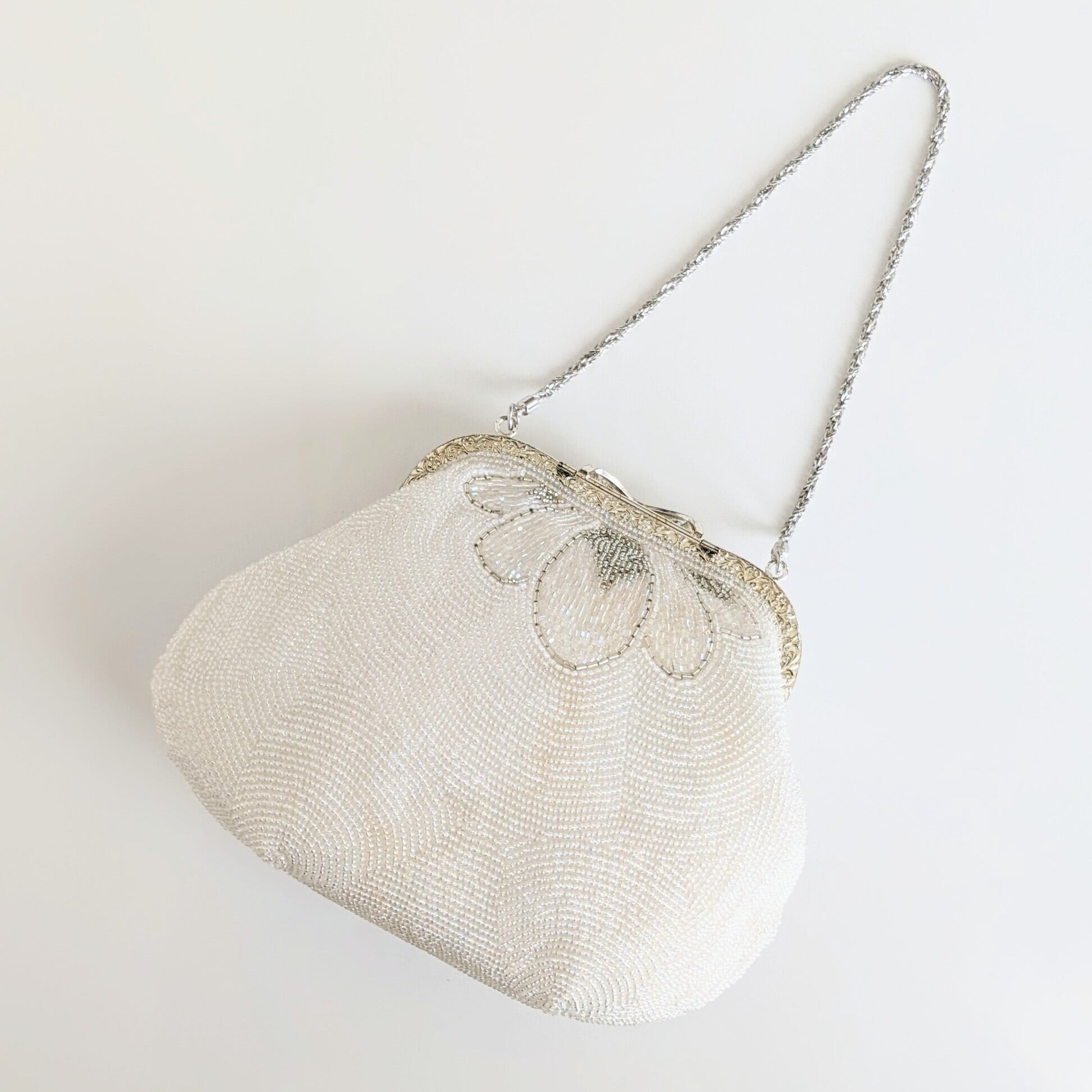 【vintage】ビーズ刺繍バッグ レトロ 白 クリア シルバー 花モチーフ