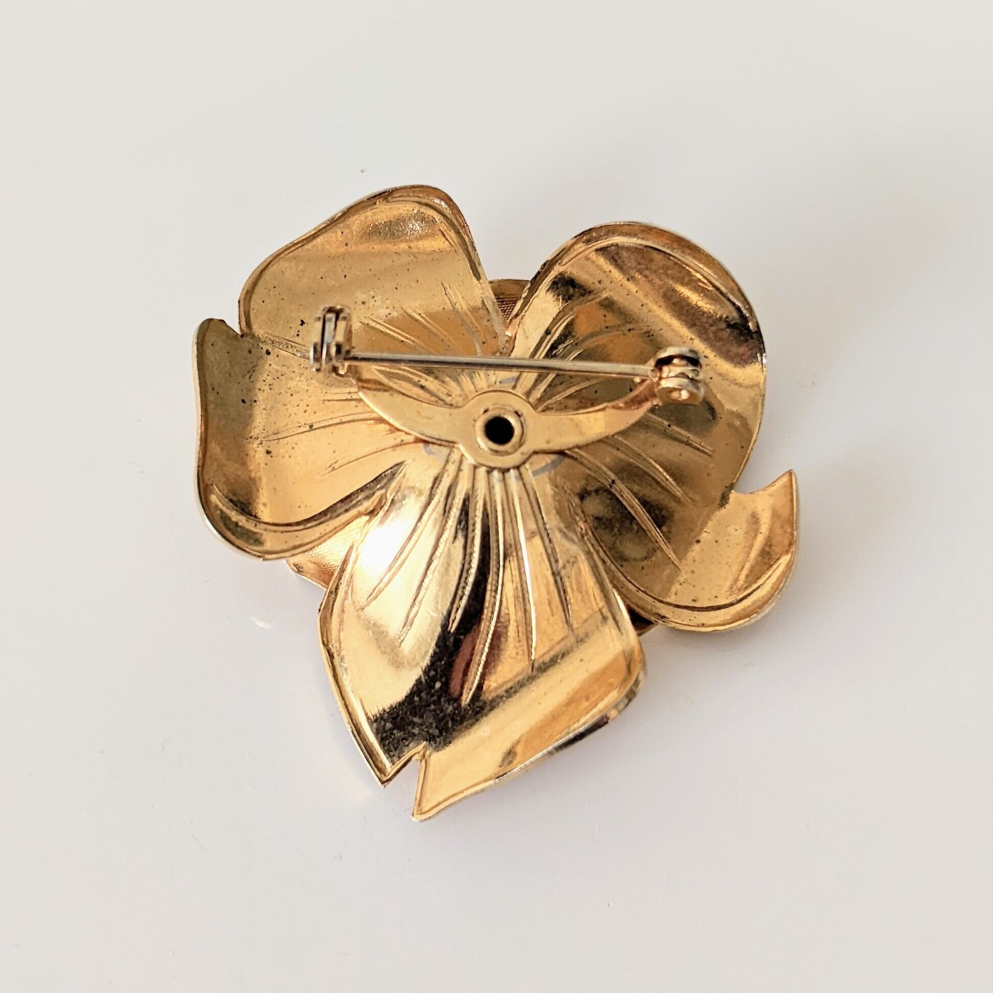 ゴールドの花モチーフ、真中にフェイクパールがあしらわれた上品な可愛さのヴィンテージブローチです。