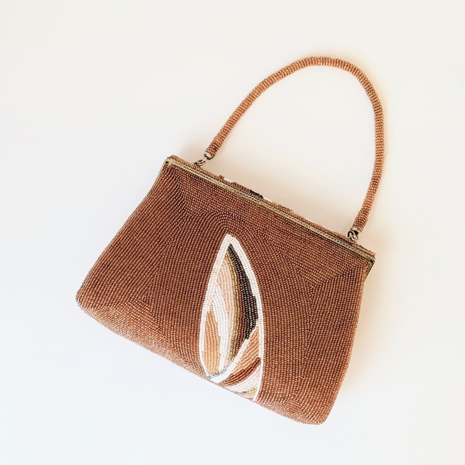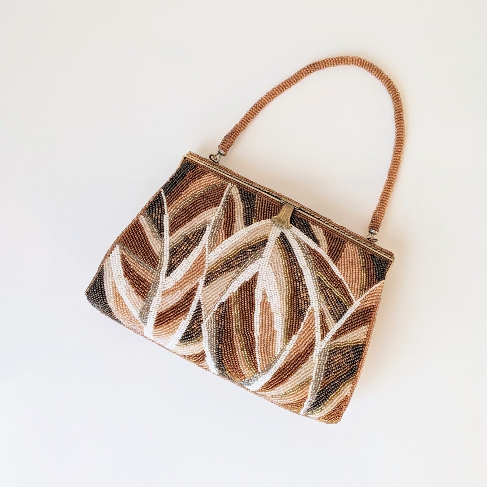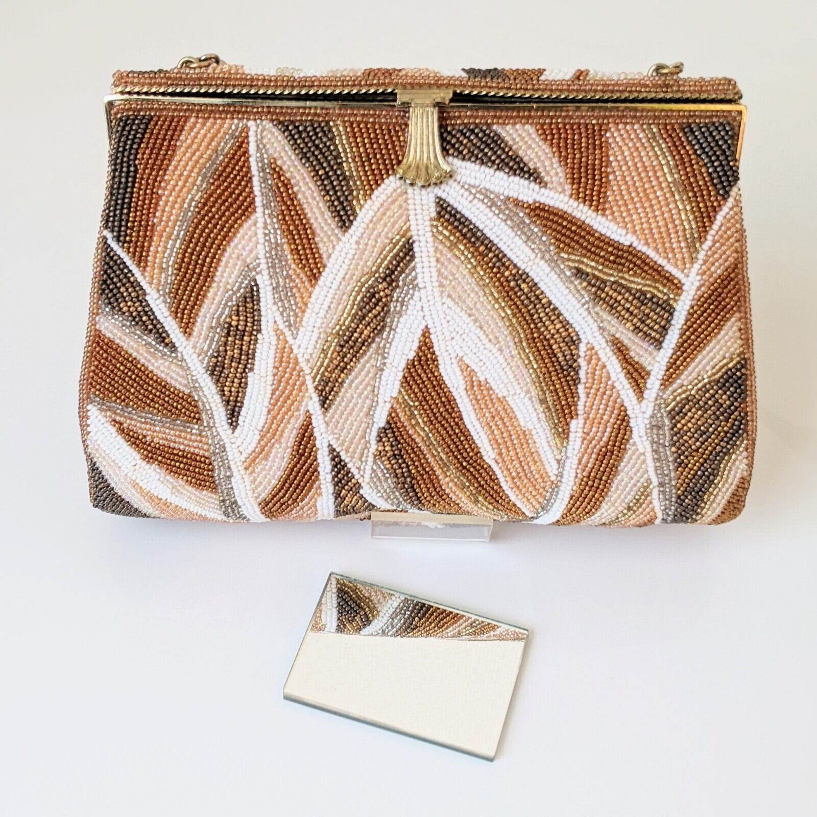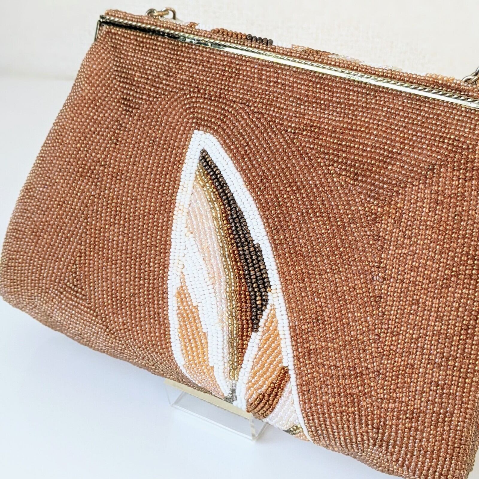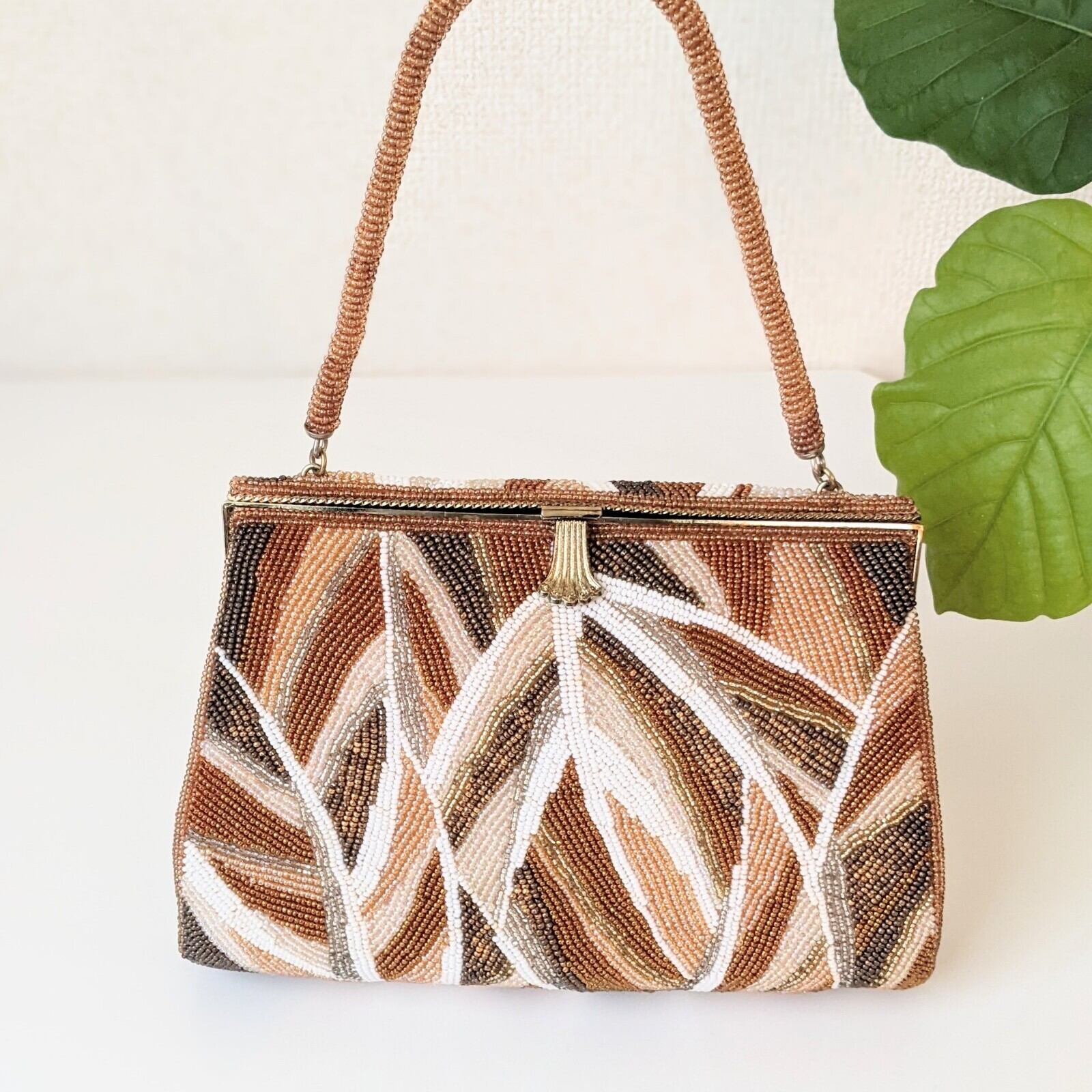 【vintage】ビーズ刺繡バッグ リーフ柄 枯葉 ブラウングラデーション 鏡付き 大正浪漫 昭和レトロ