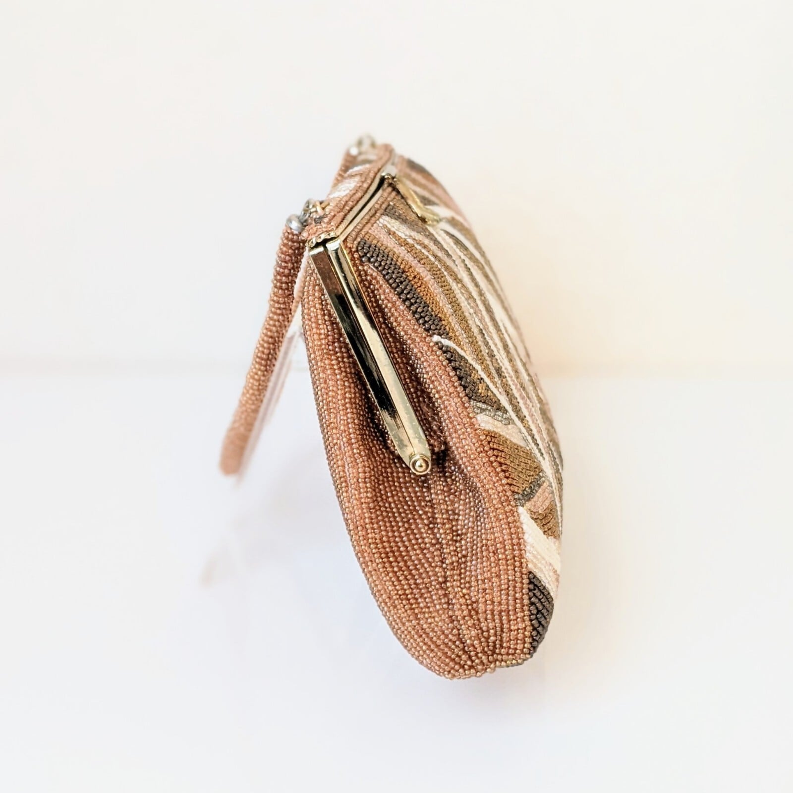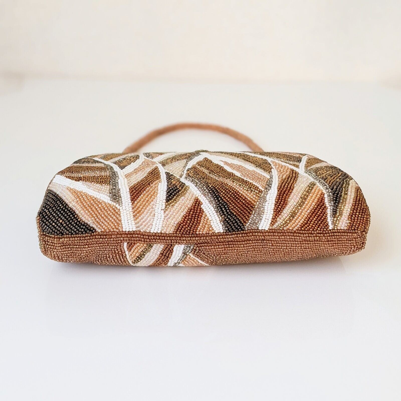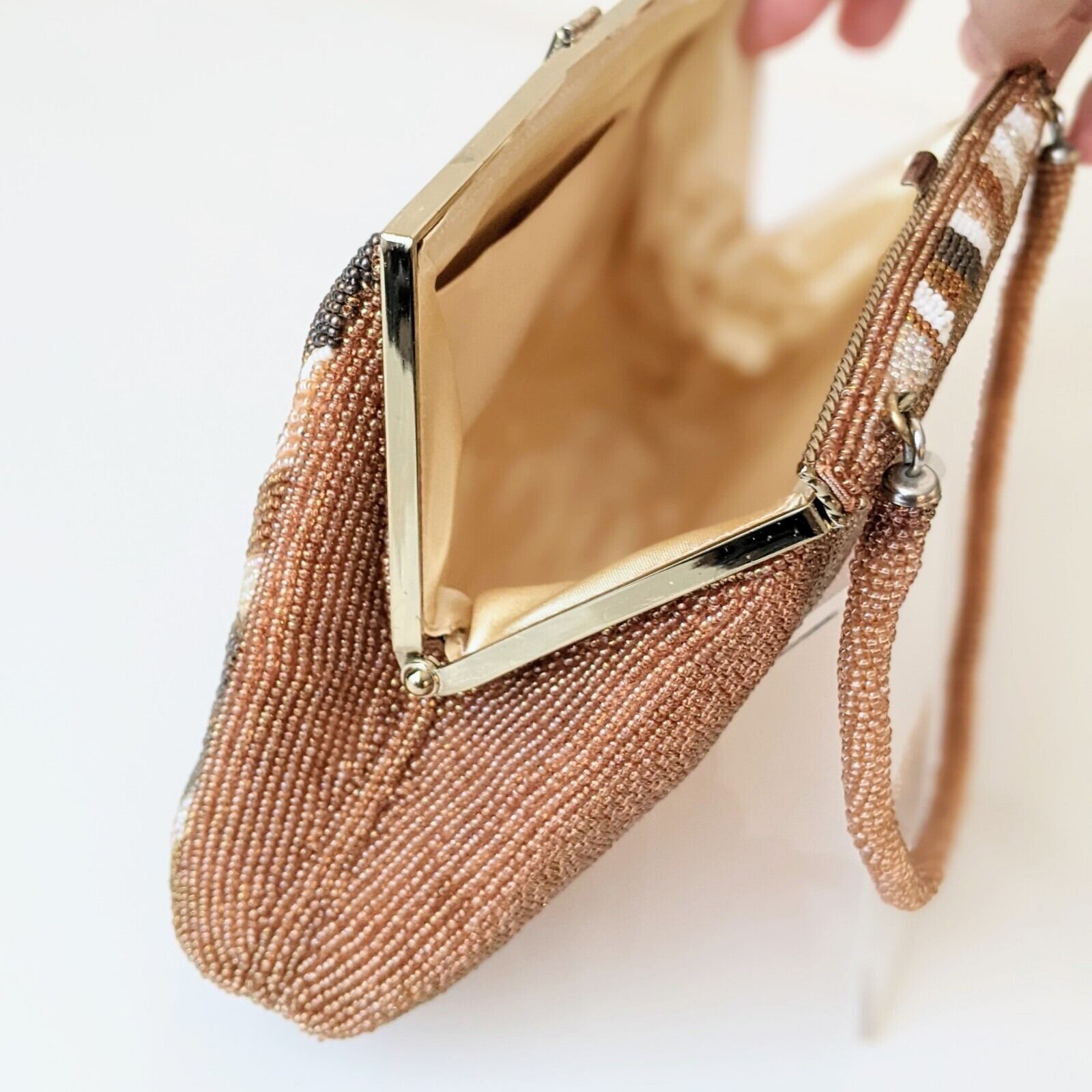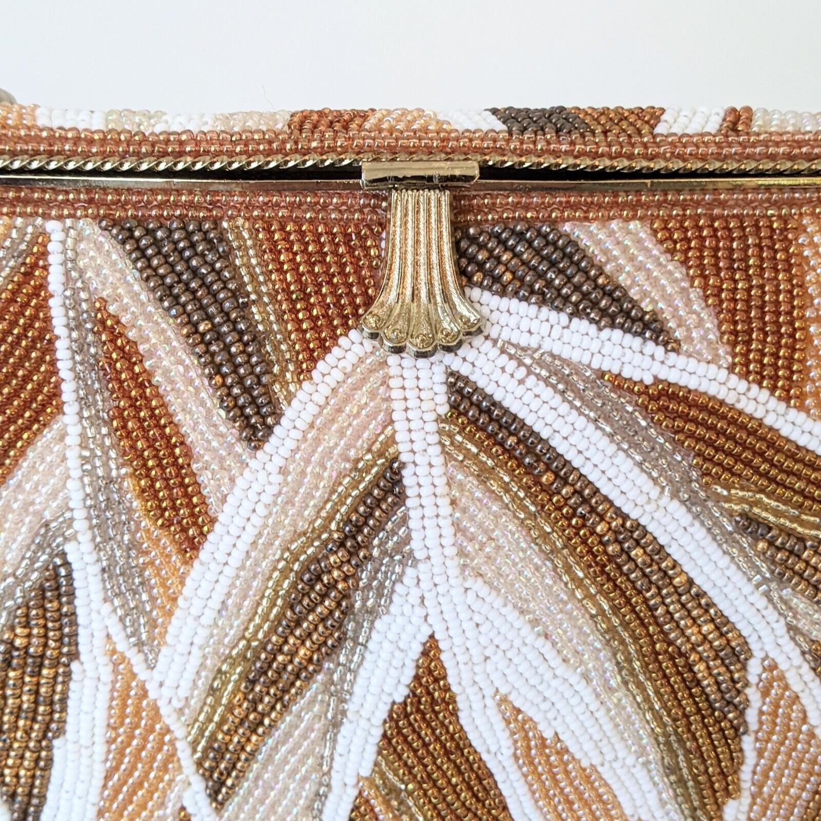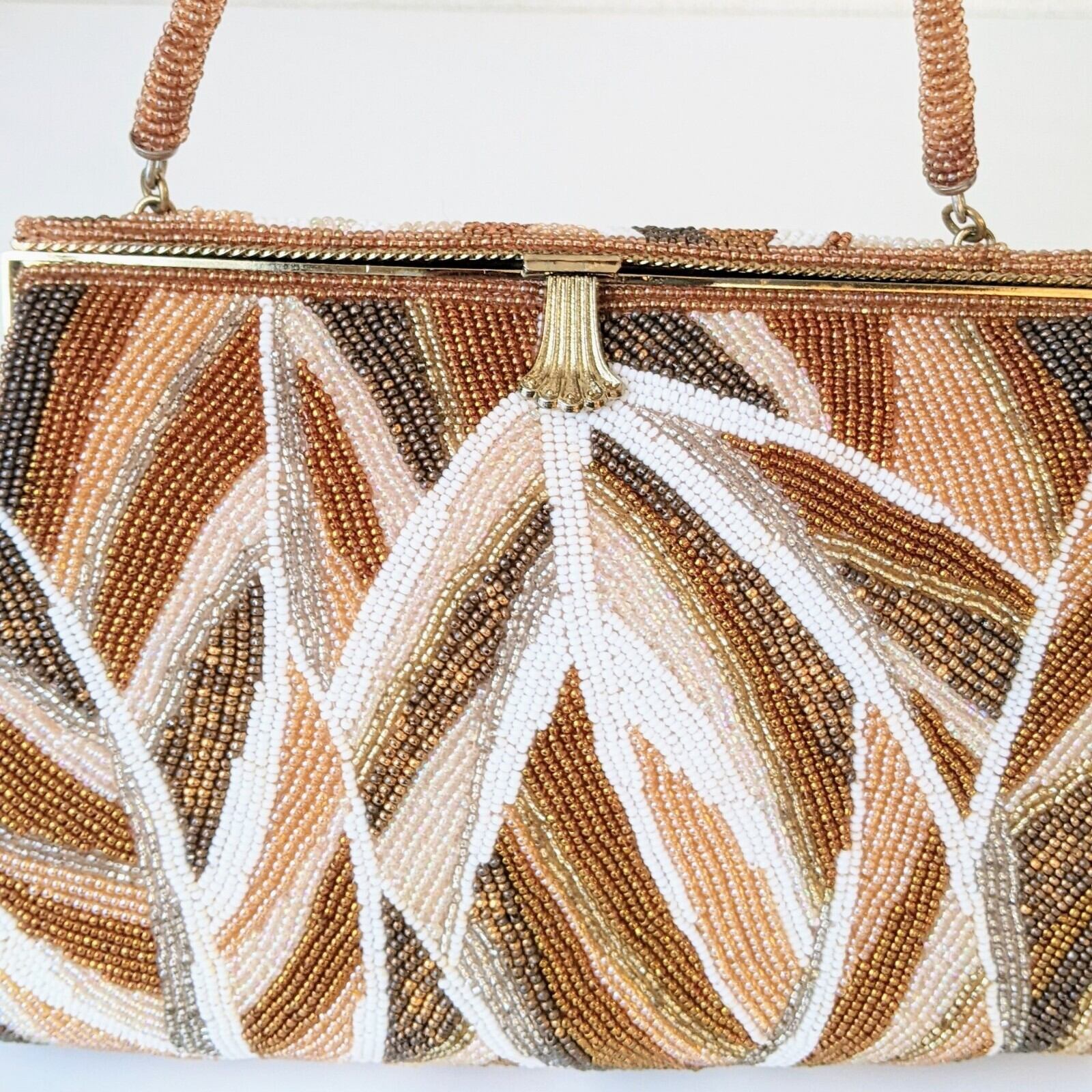 【vintage】ビーズ刺繡バッグ リーフ柄 枯葉 ブラウングラデーション 鏡付き 大正浪漫 昭和レトロ