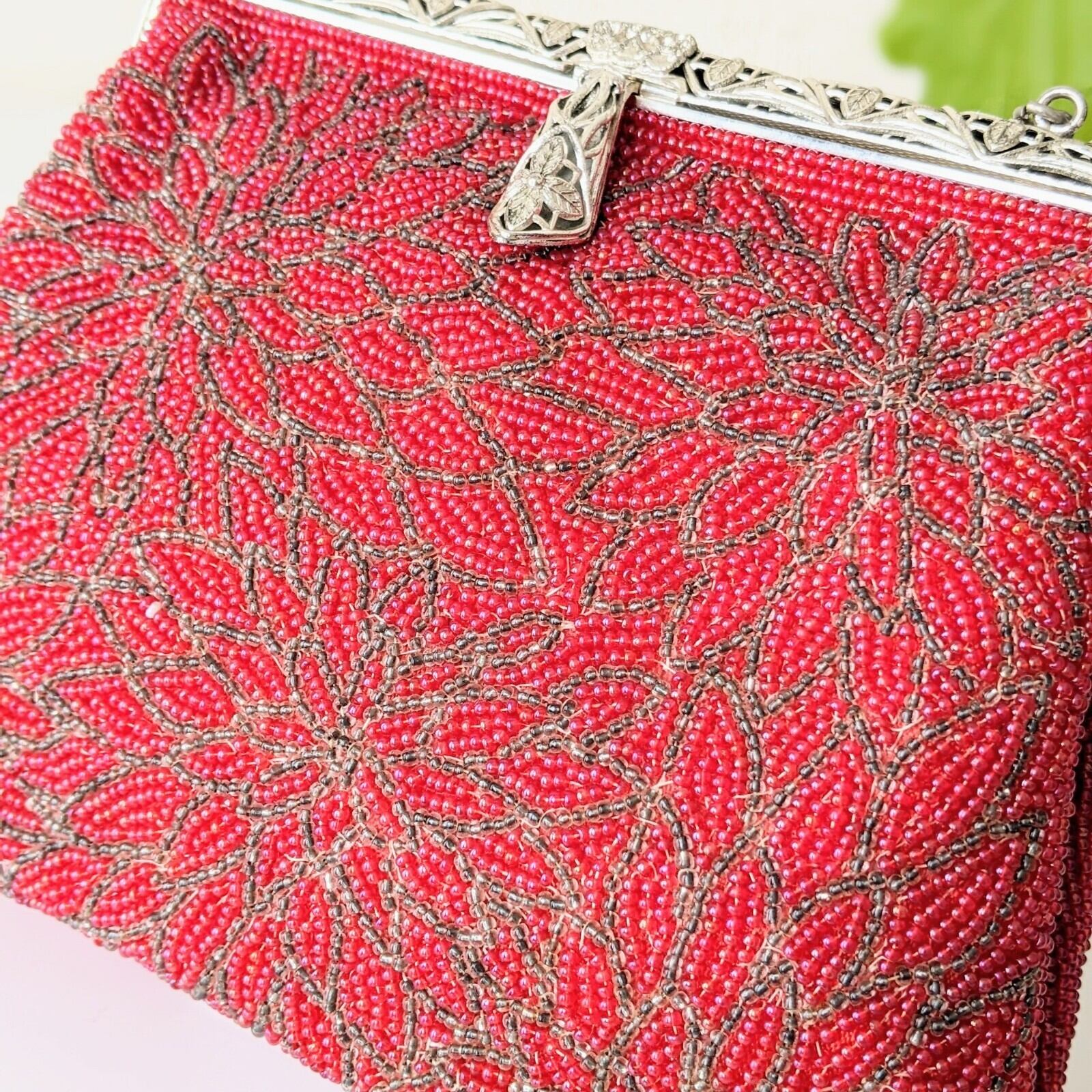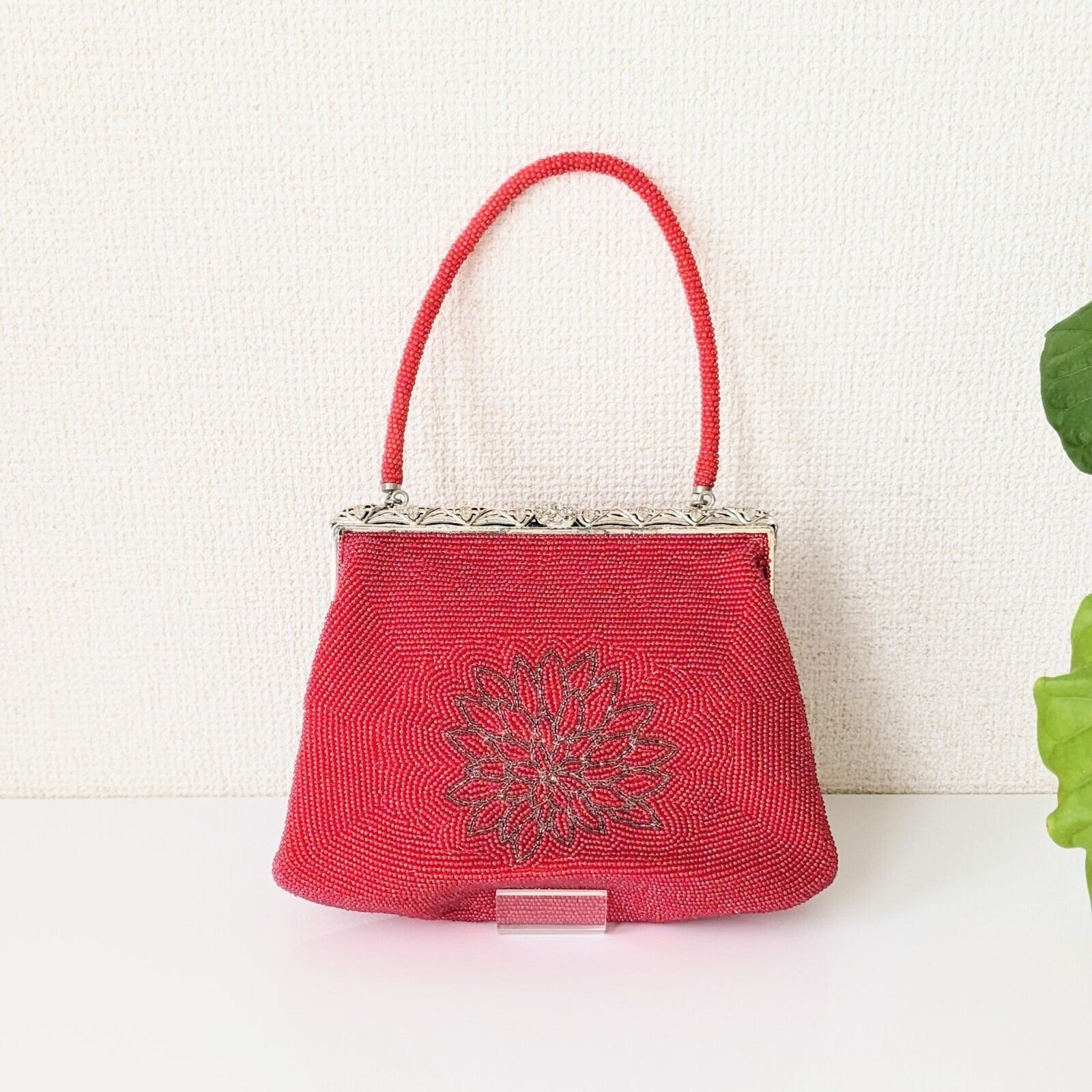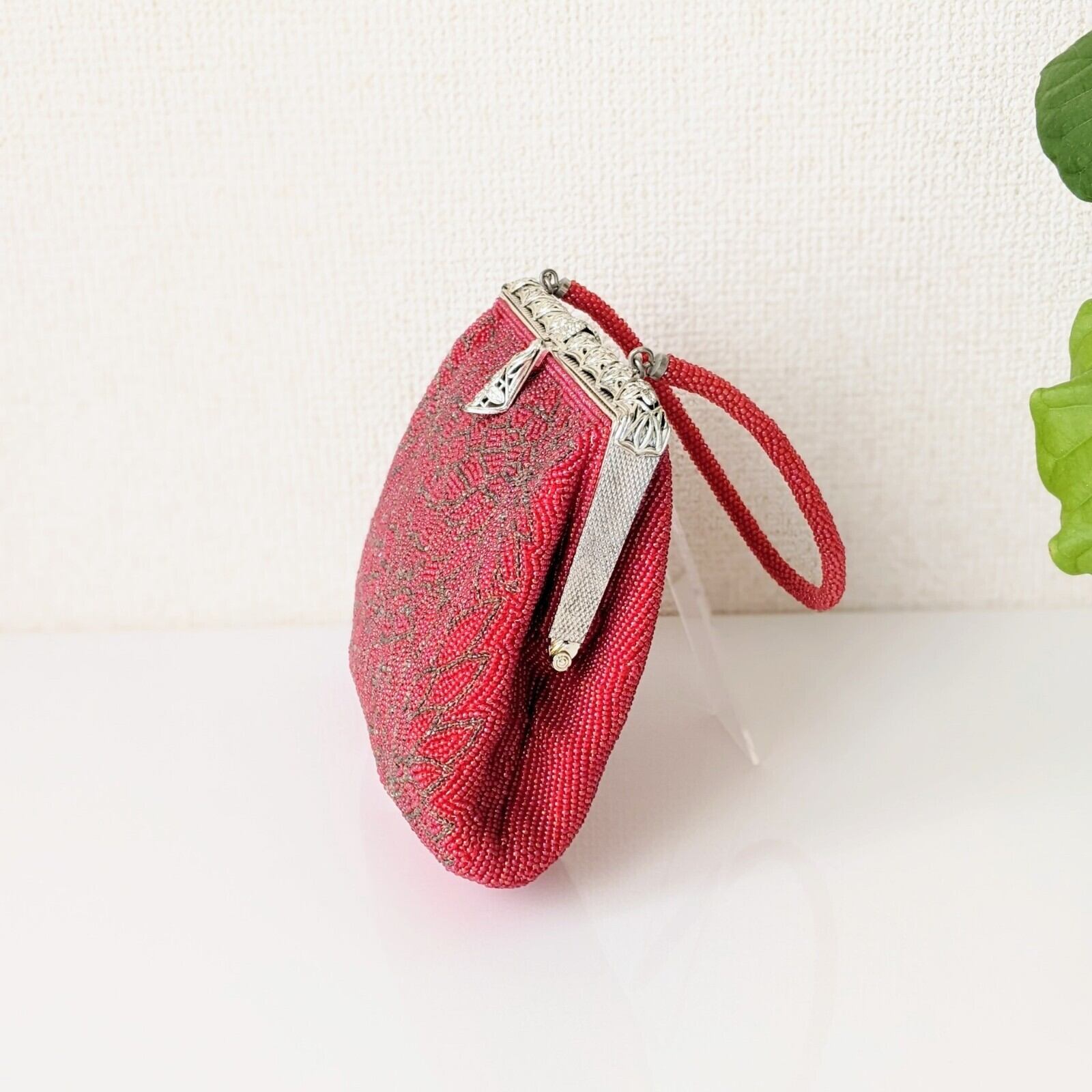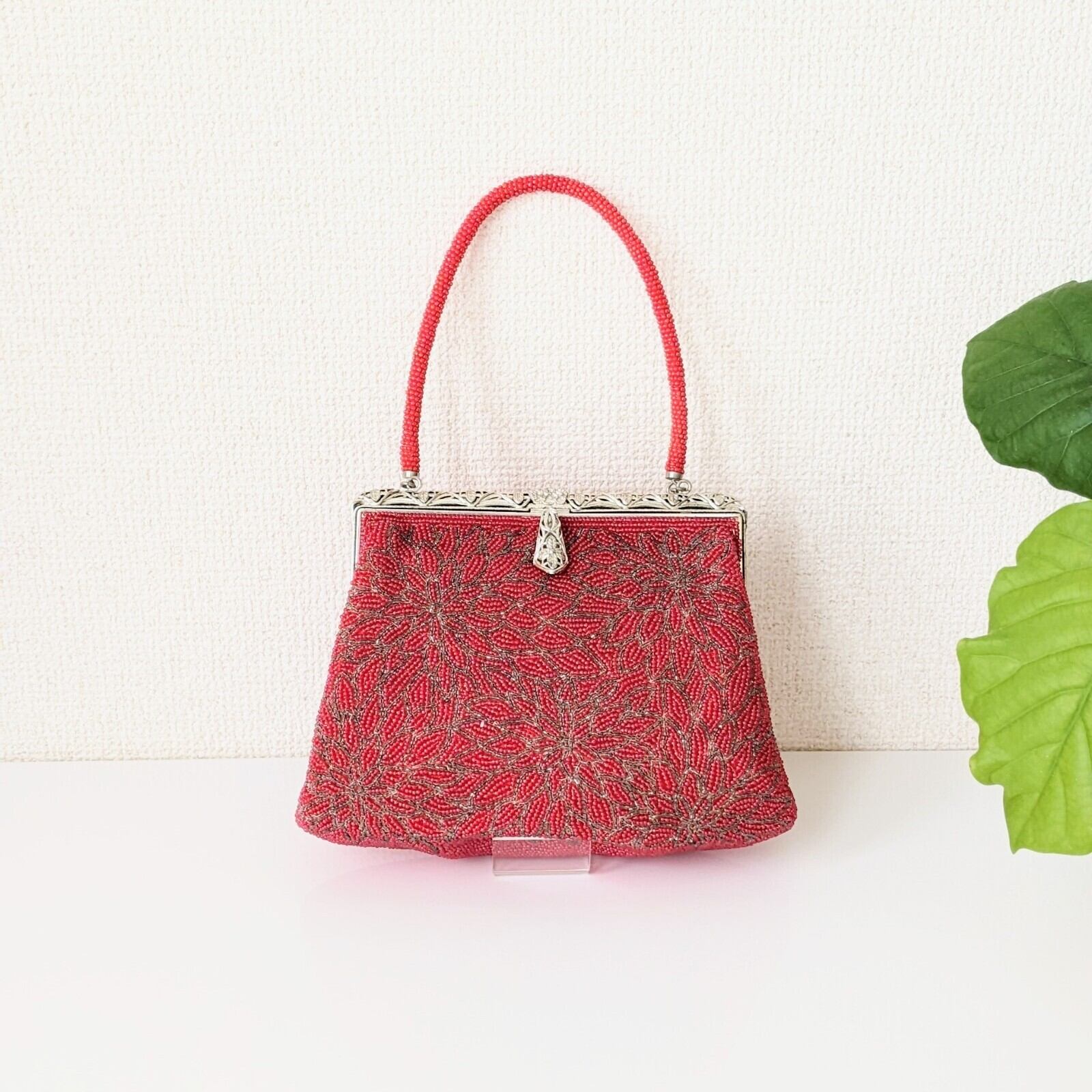 【vintage】ビーズ刺繡バッグ 赤 シルバー 花柄 大正浪漫 昭和レトロ