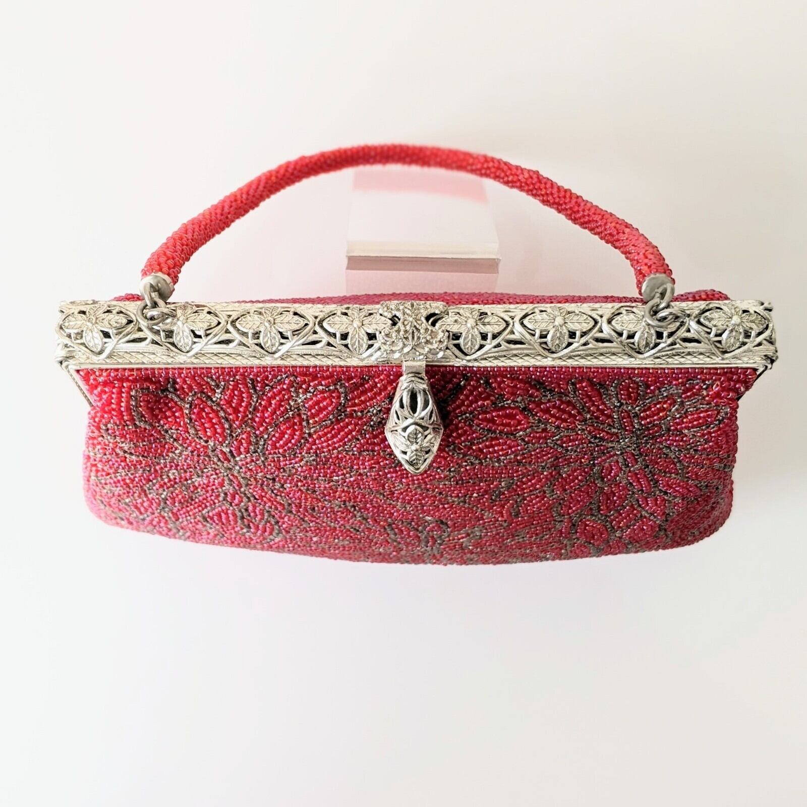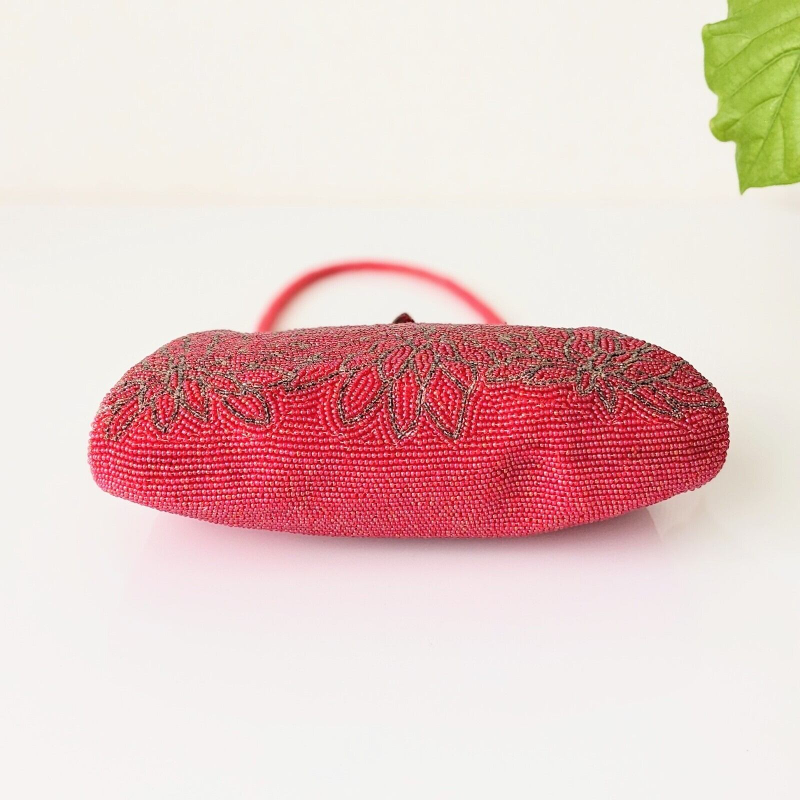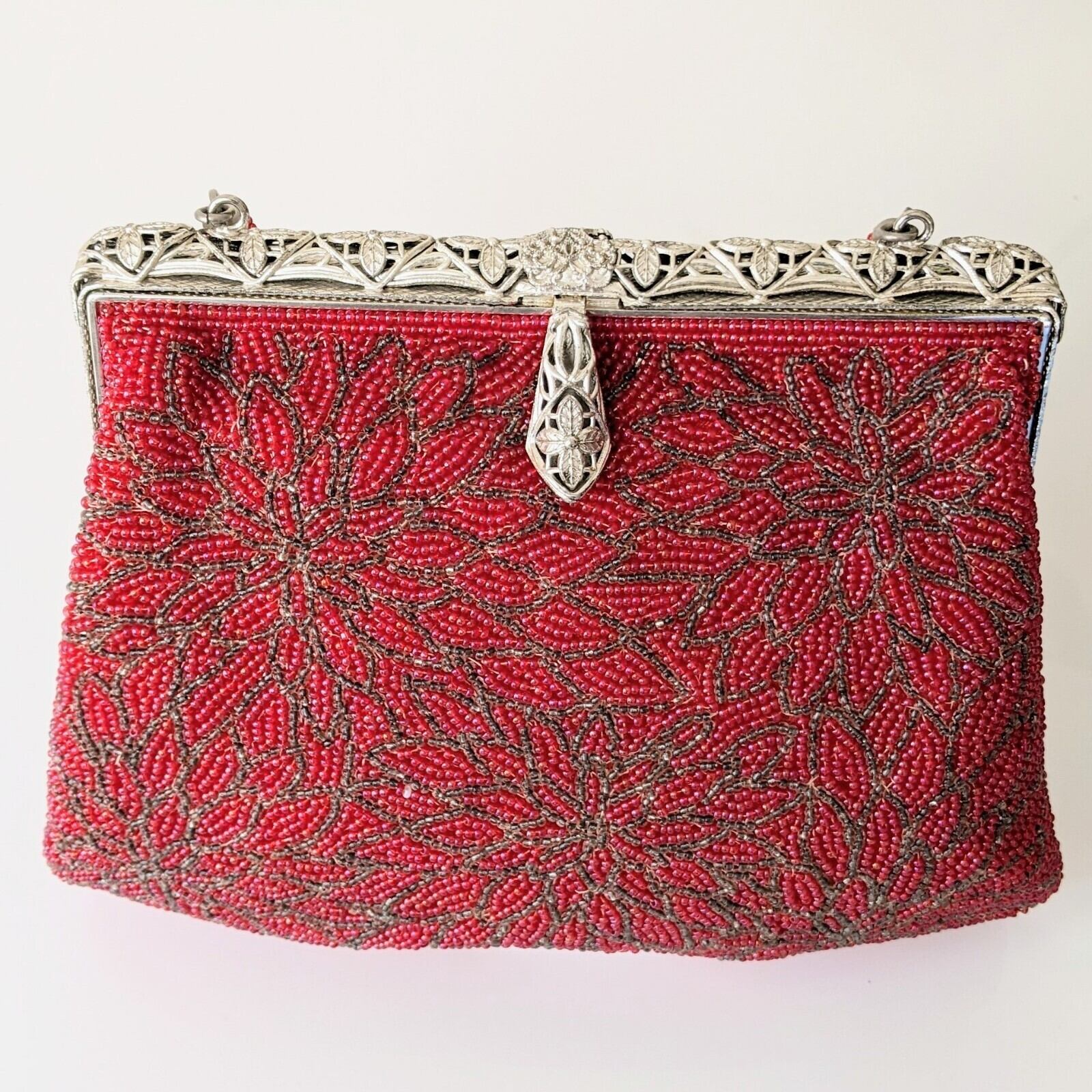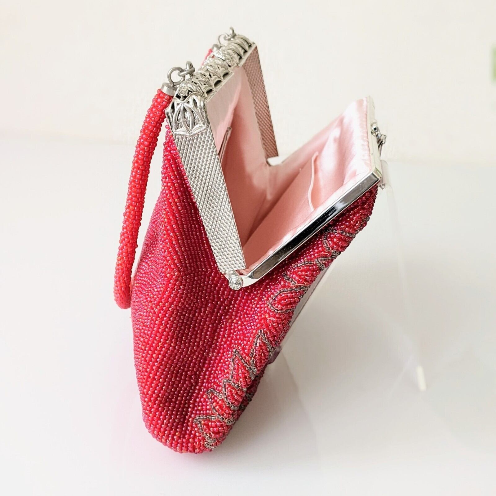 【vintage】ビーズ刺繡バッグ 赤 シルバー 花柄 大正浪漫 昭和レトロ