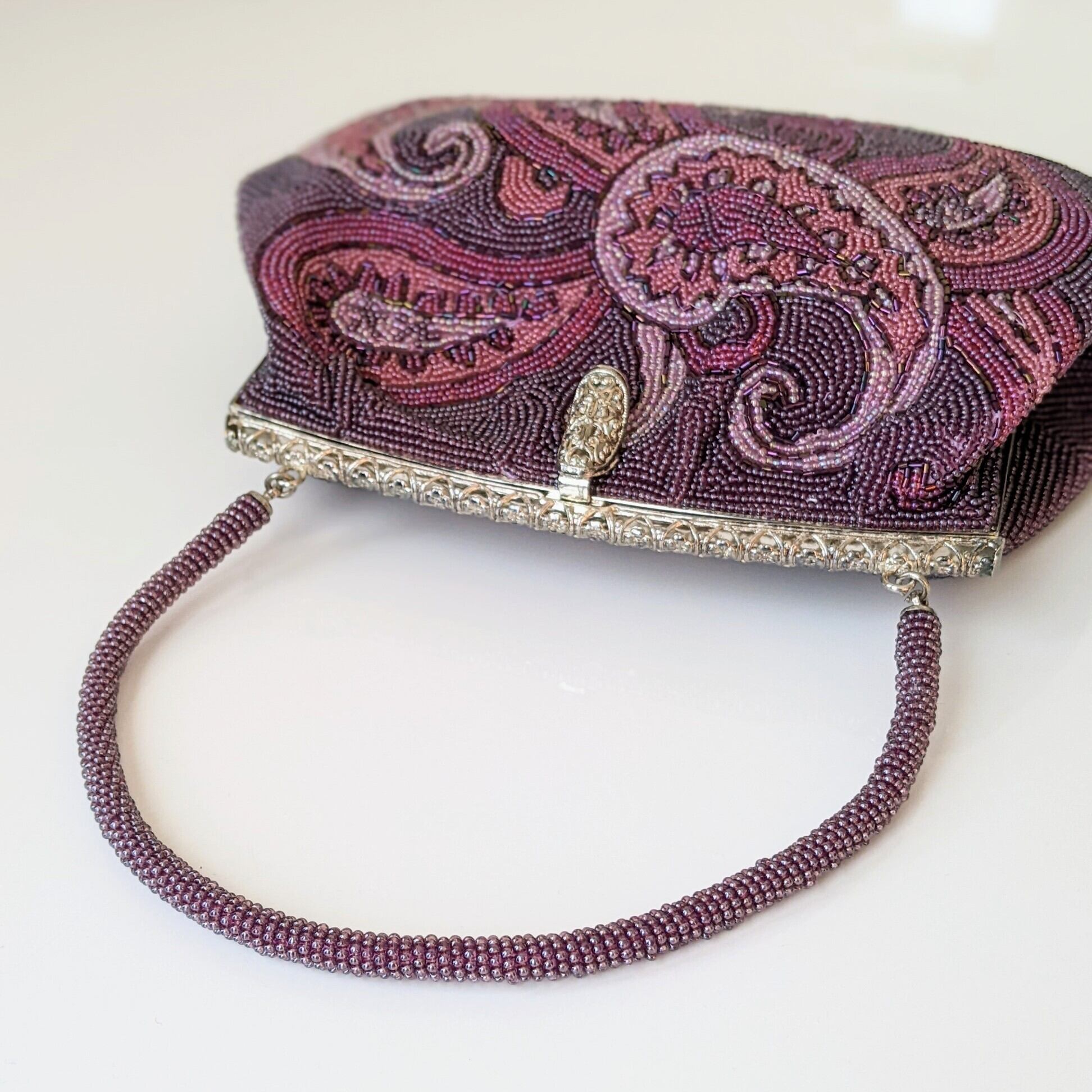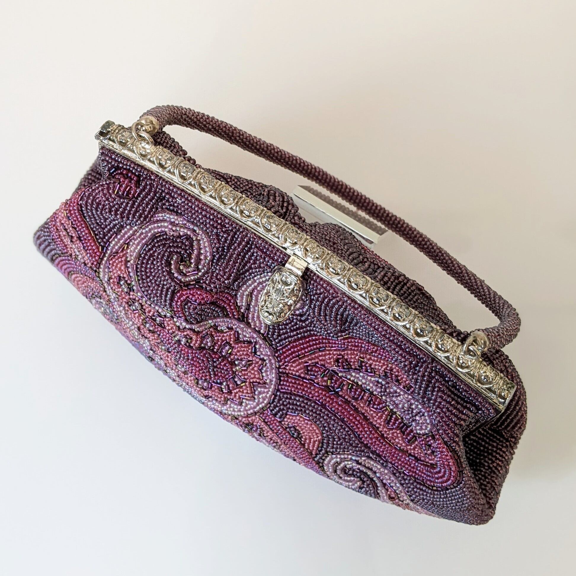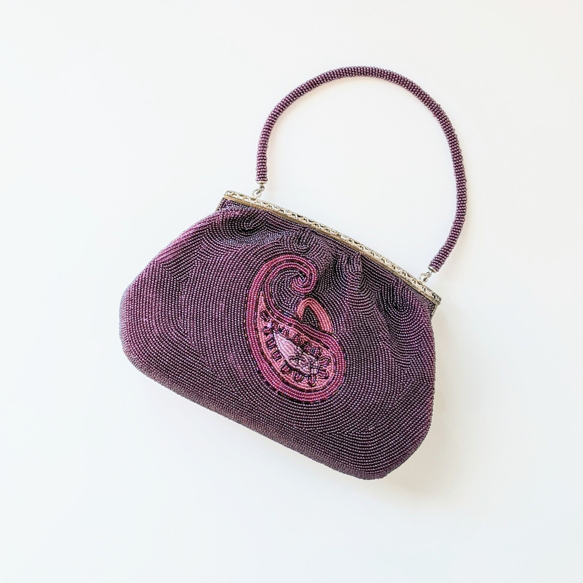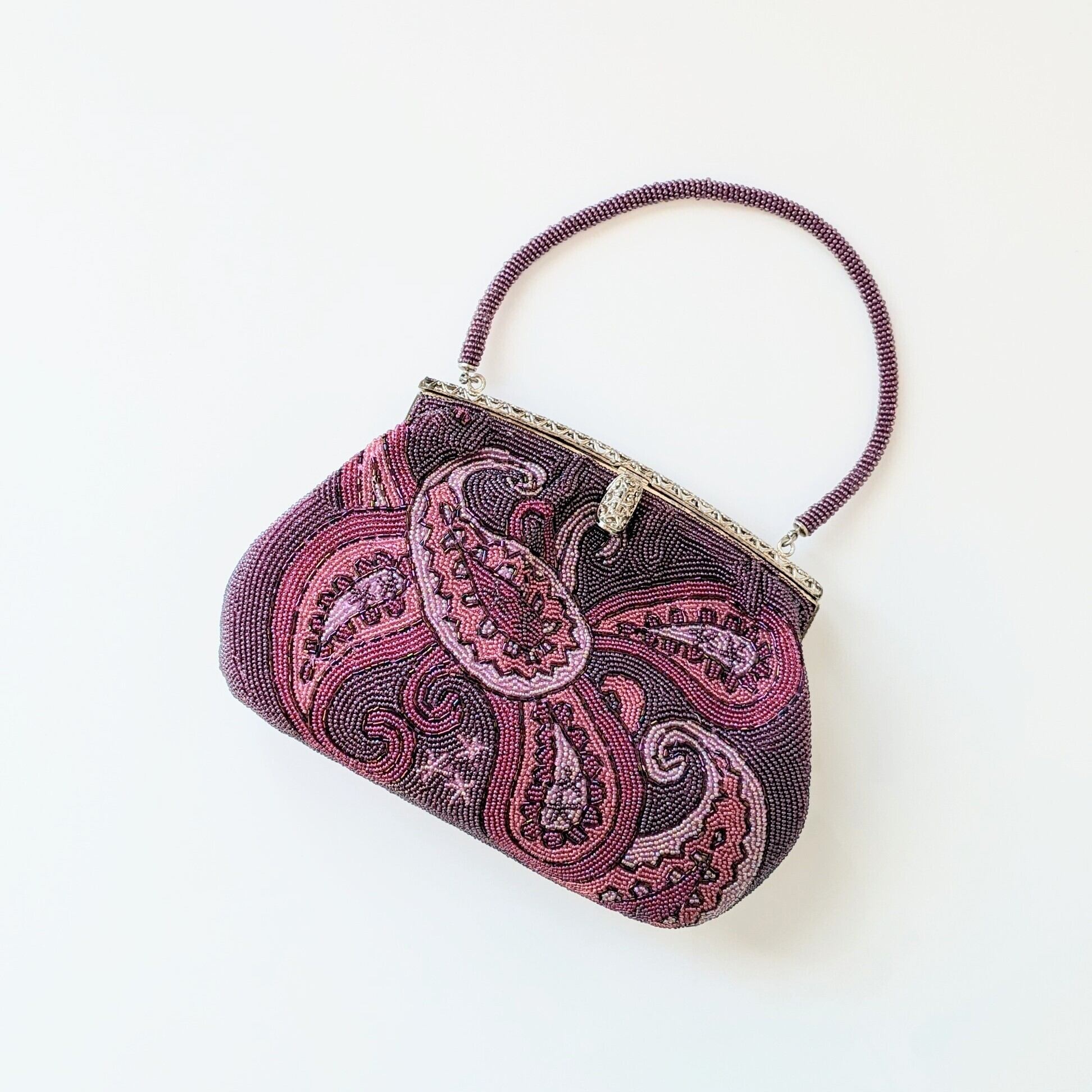 古い時代のものとは思えない、紫色のグラデーションが美しいペイズリー柄が印象的な希少なビーズバッグです。