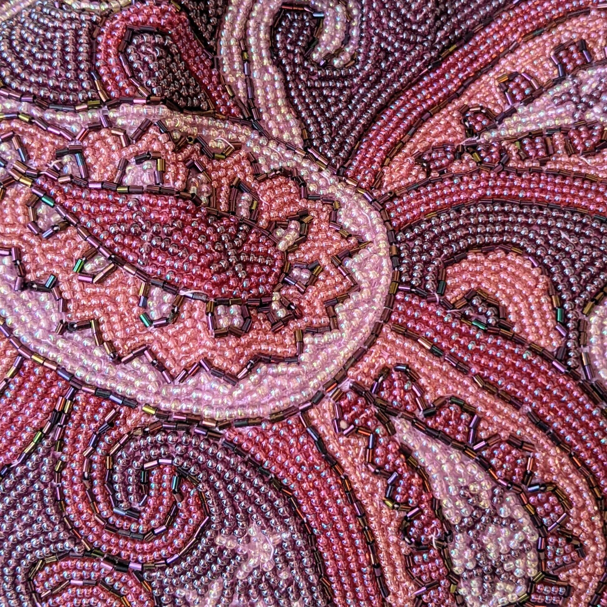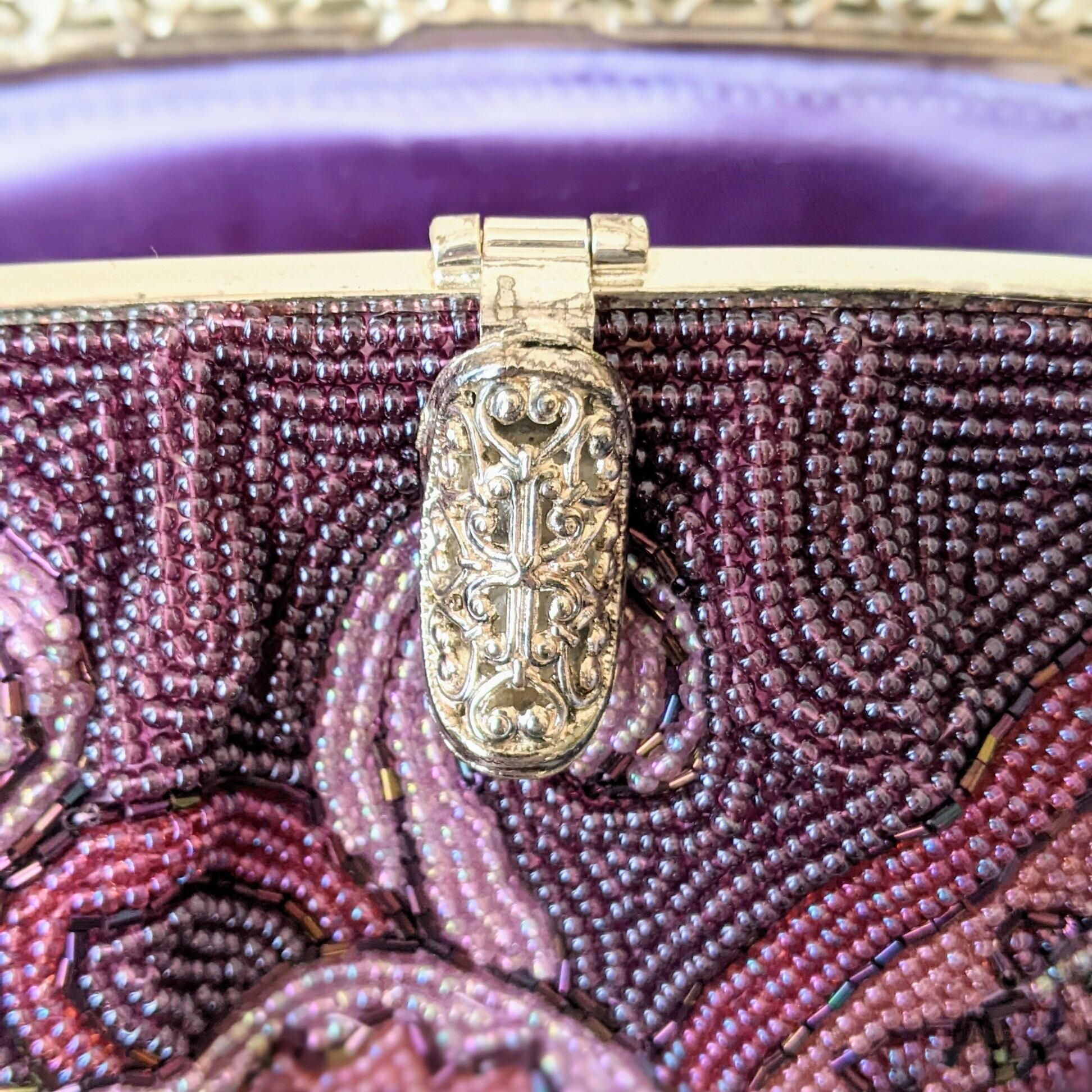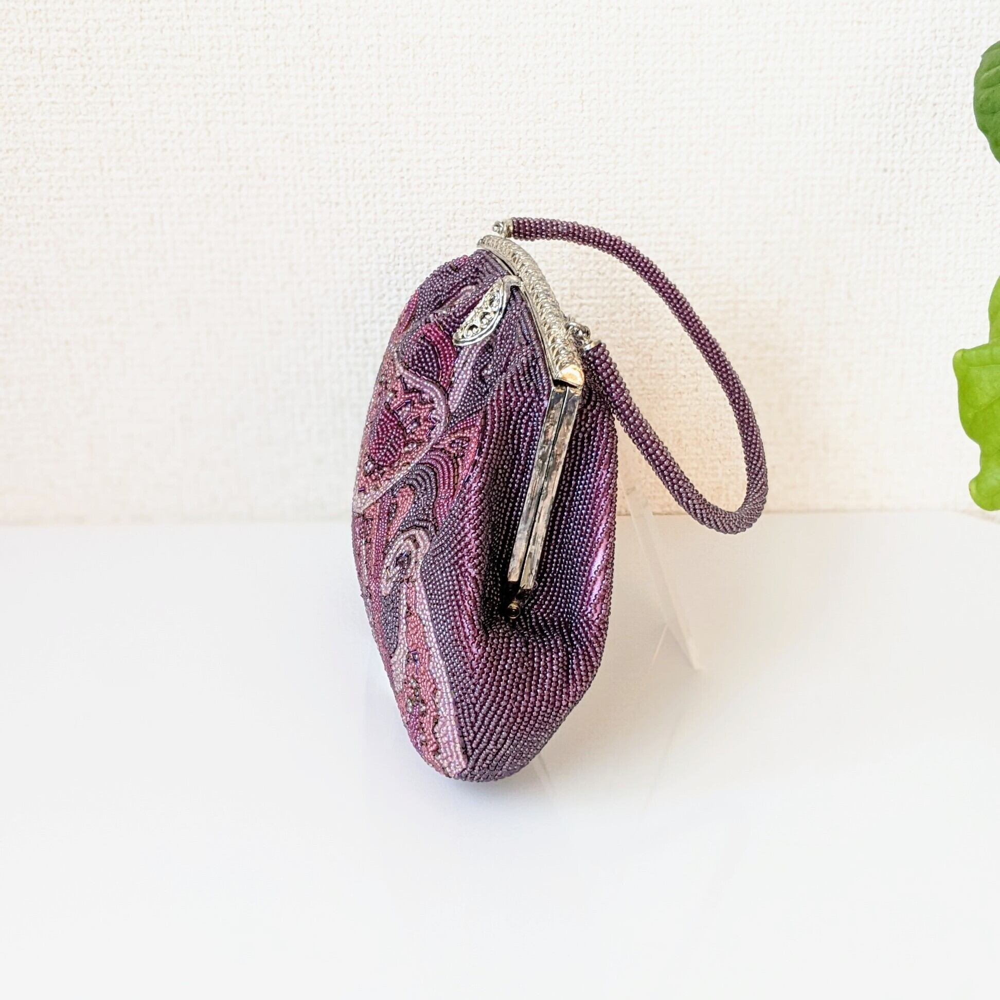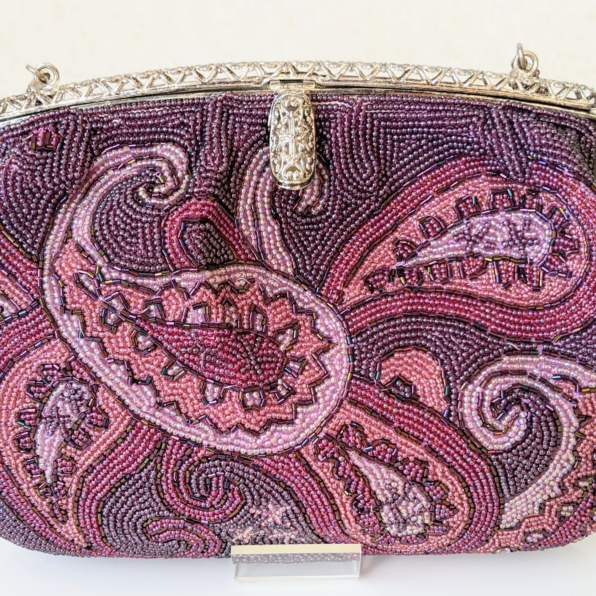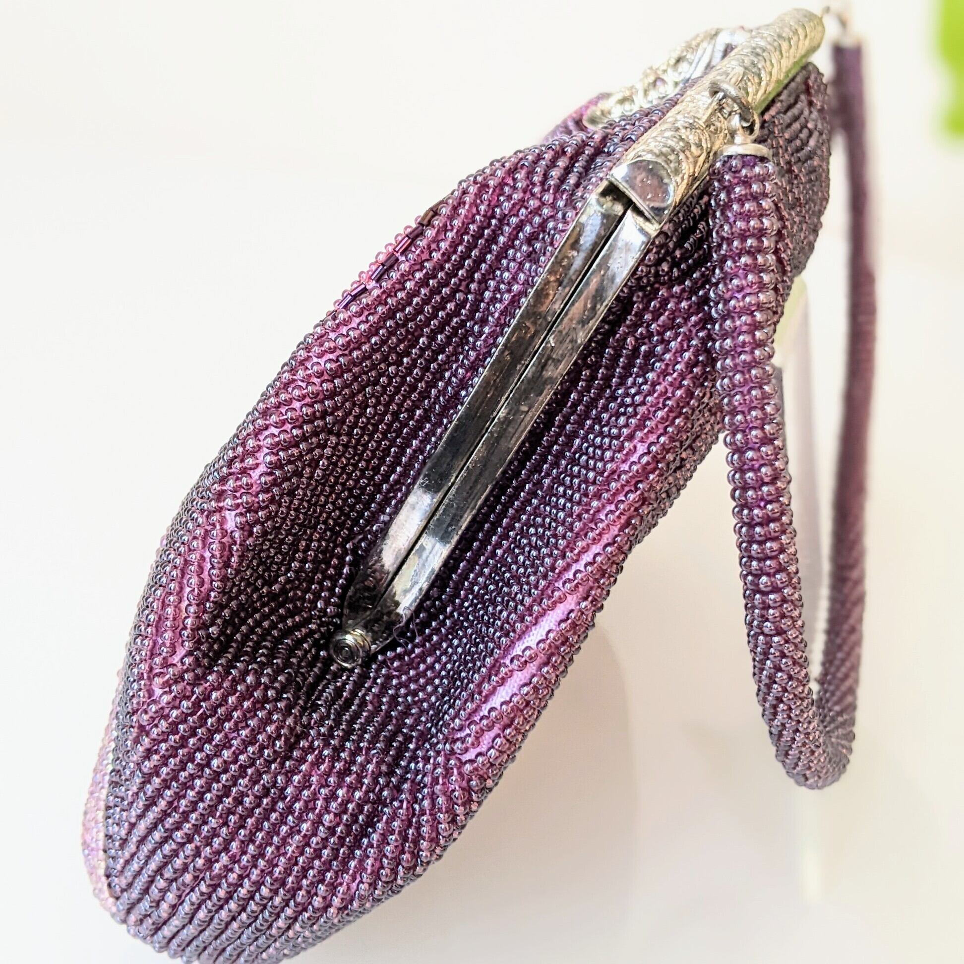 古い時代のものとは思えない、紫色のグラデーションが美しいペイズリー柄が印象的な希少なビーズバッグです。