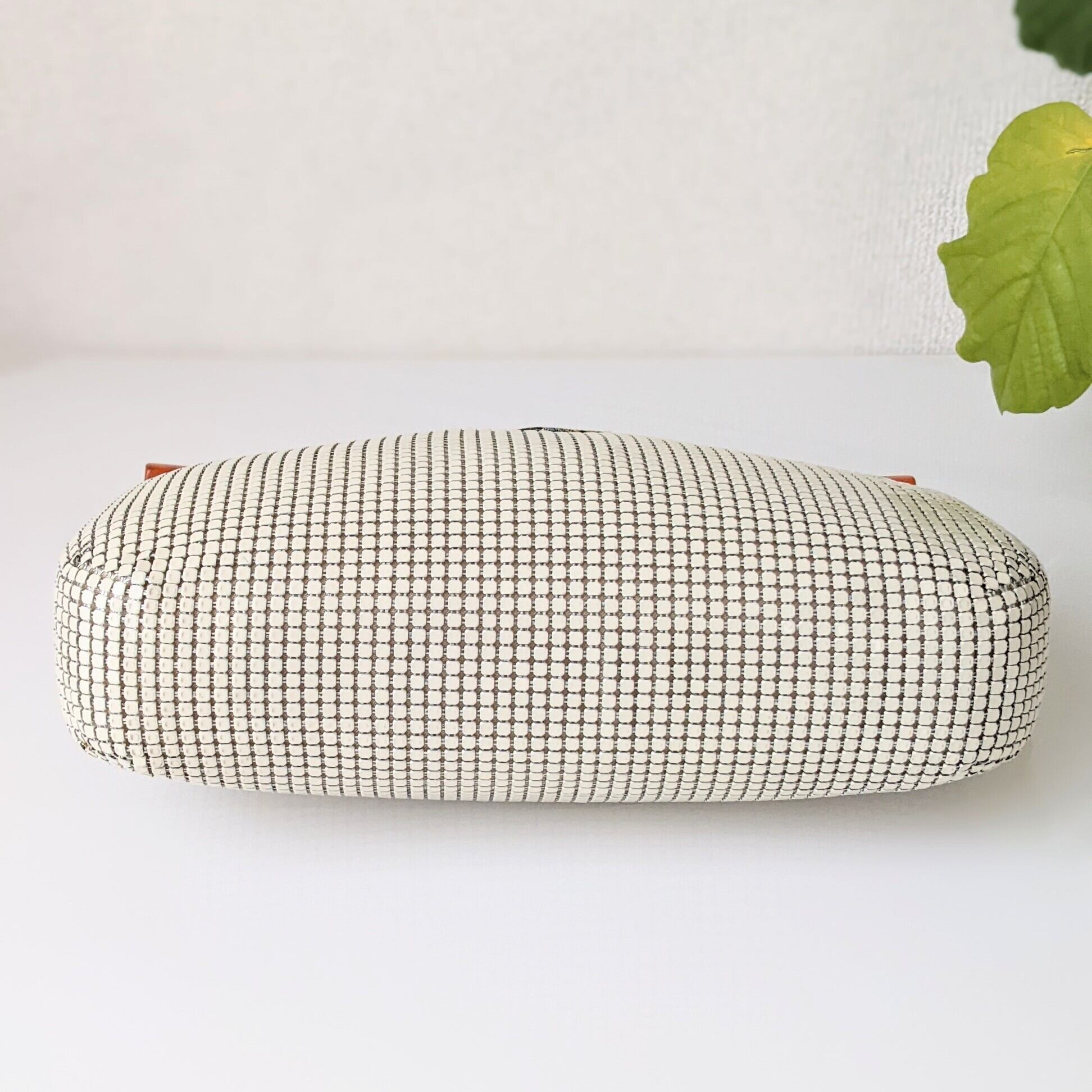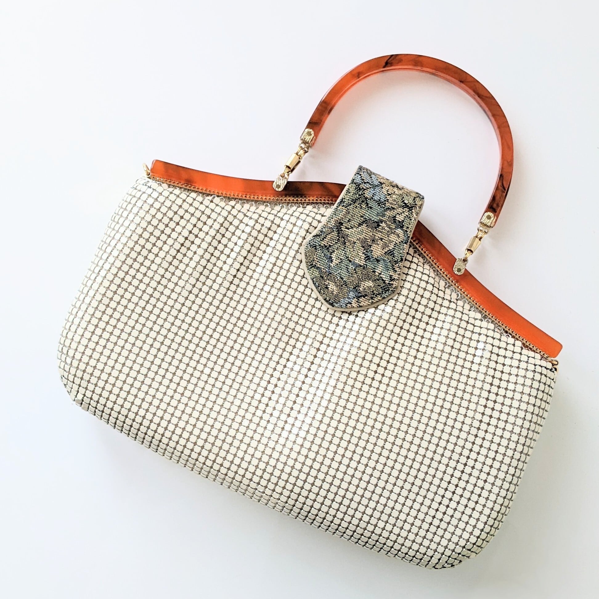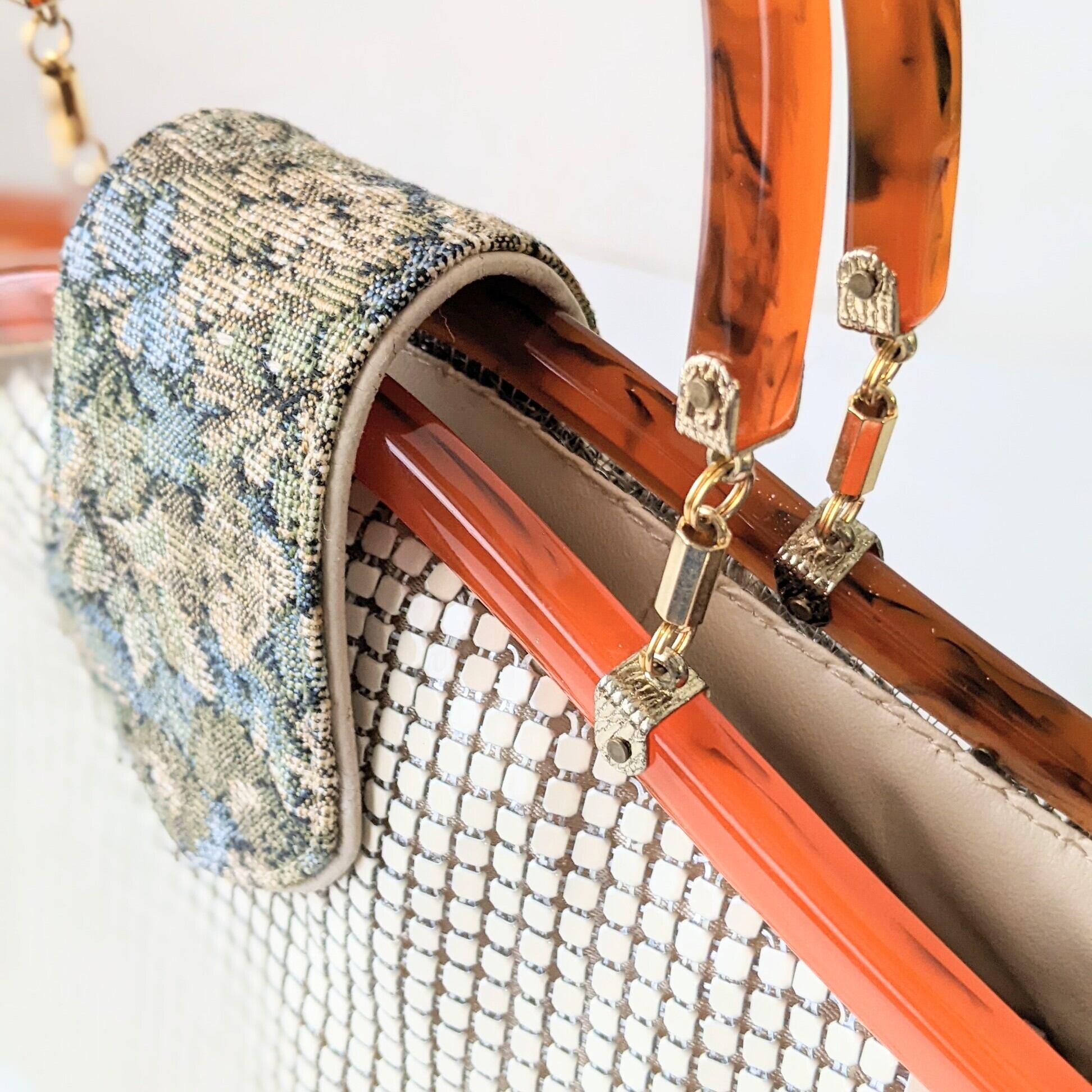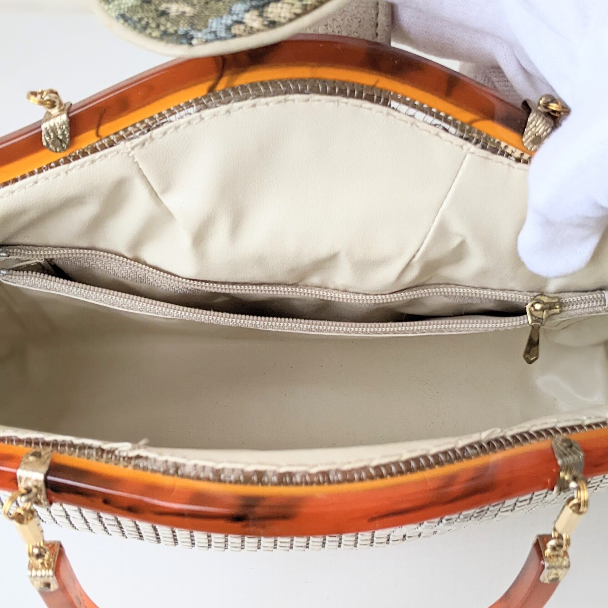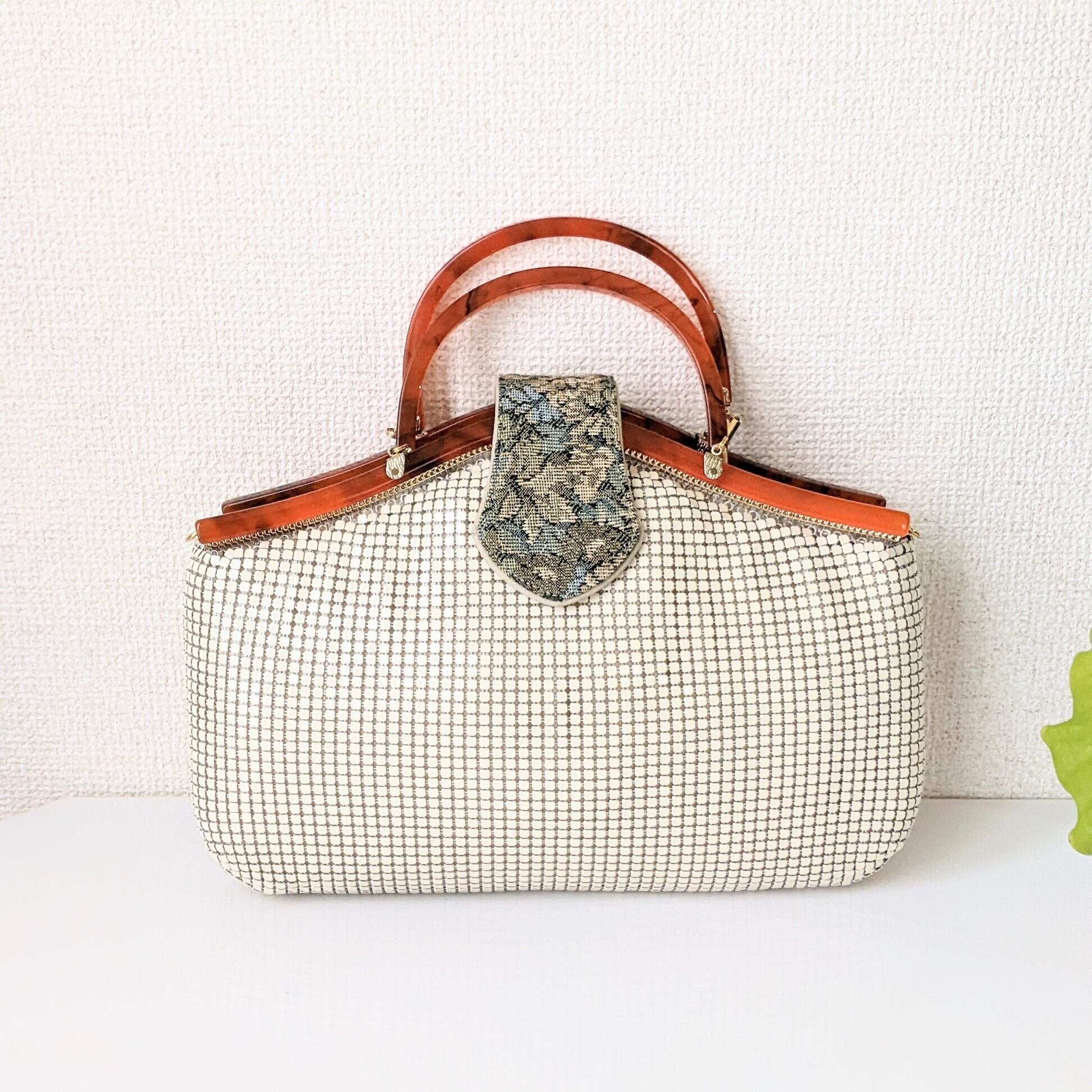 【vintage】メタリックハンドバッグ べっ甲風×ゴブラン織り オフホワイト 昭和ヴィンテージ