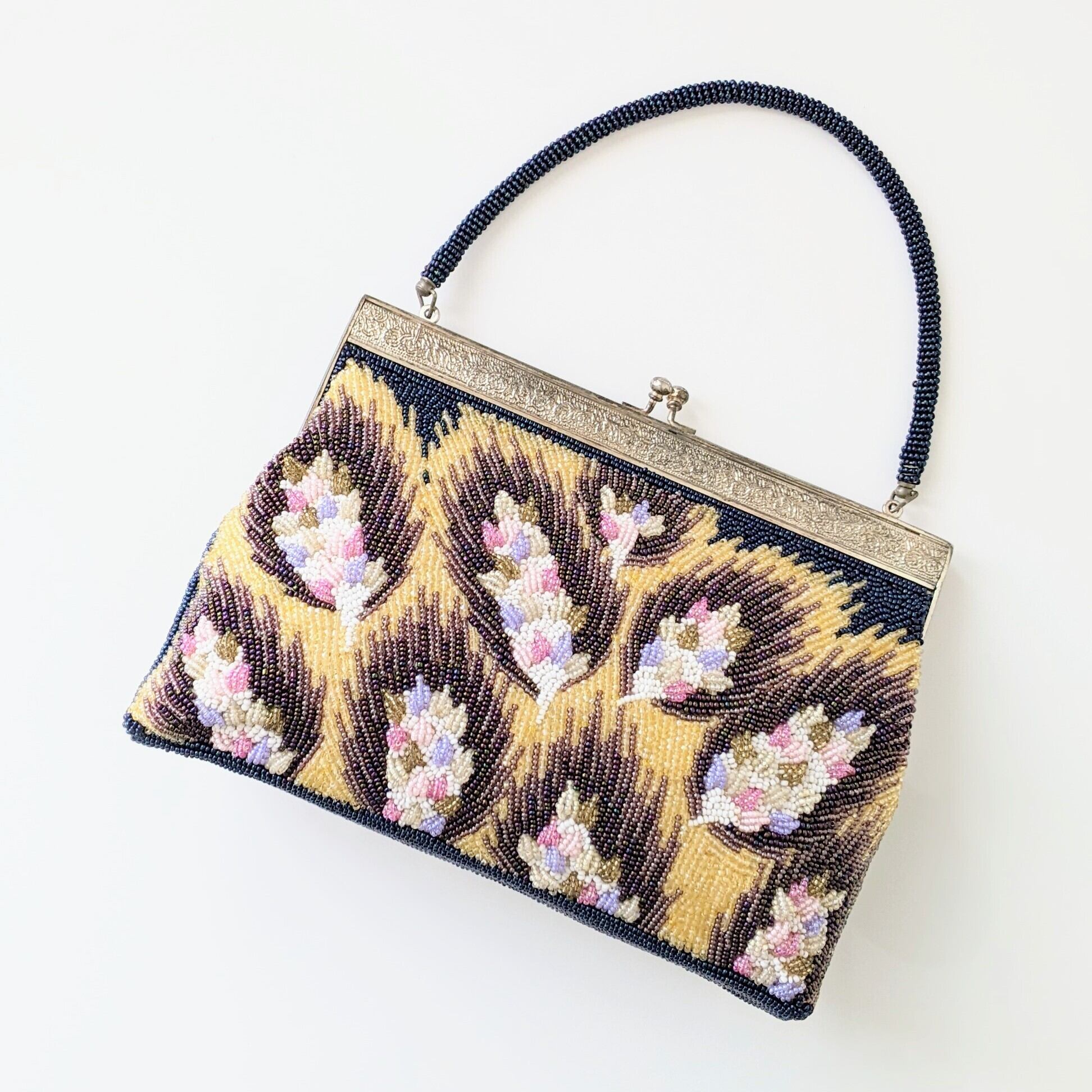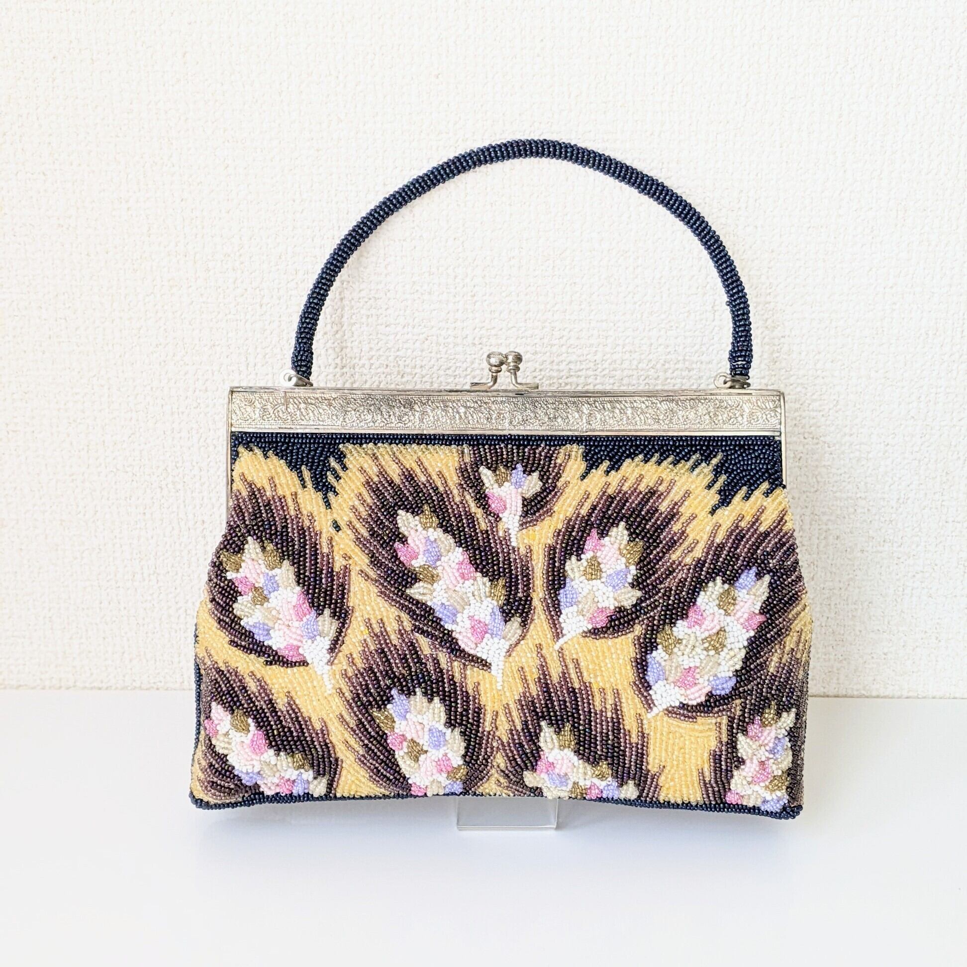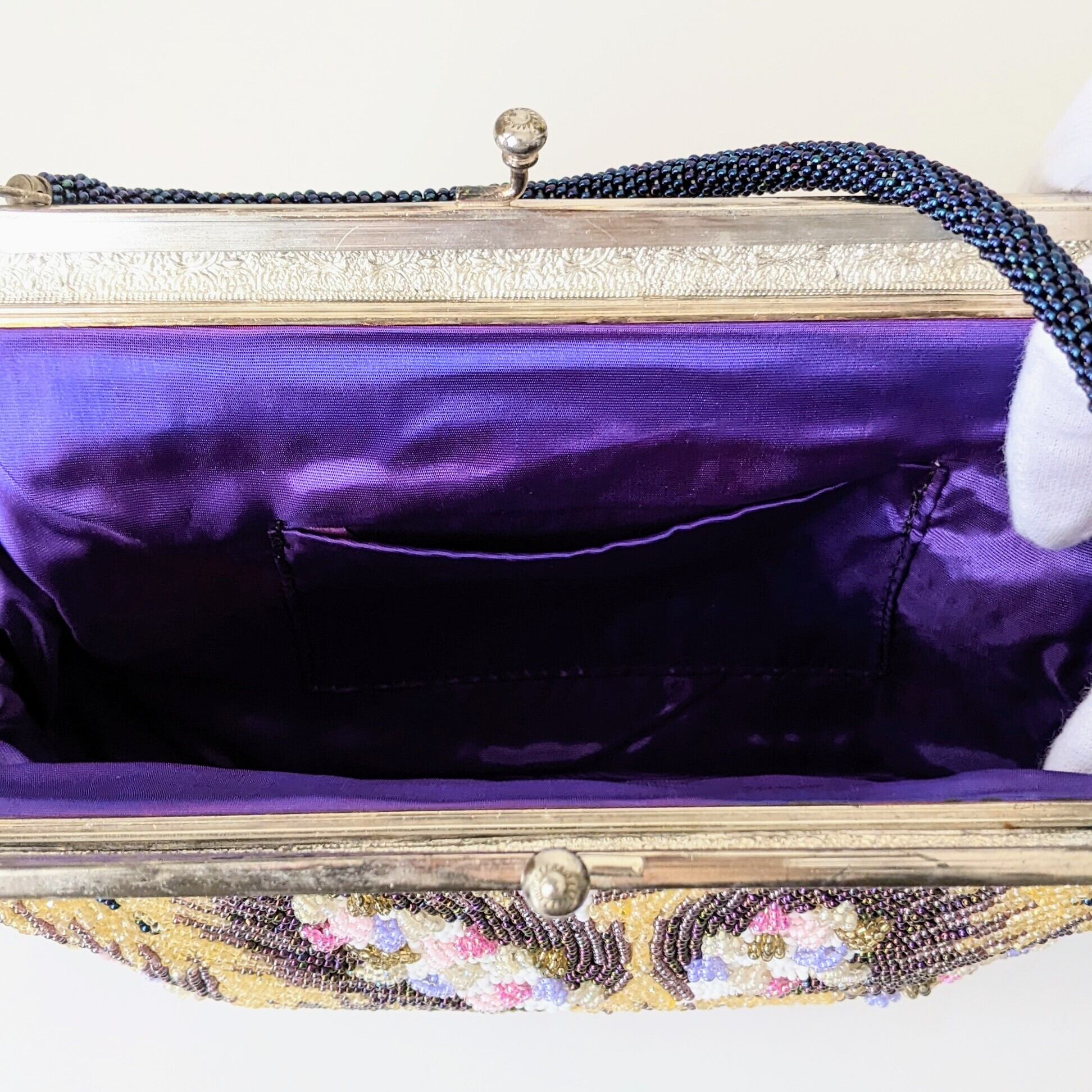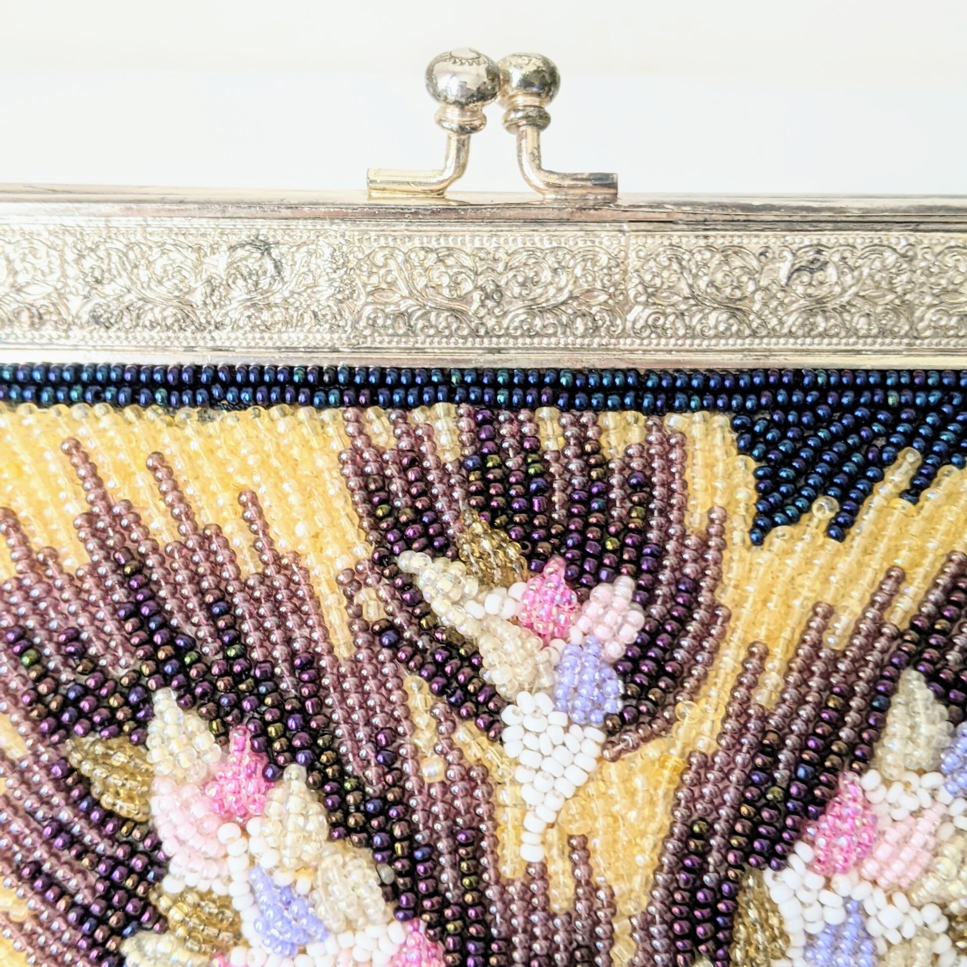 【vintage】ビーズ刺繍バッグ 稲穂柄 昭和レトロ マルチカラー 紫色