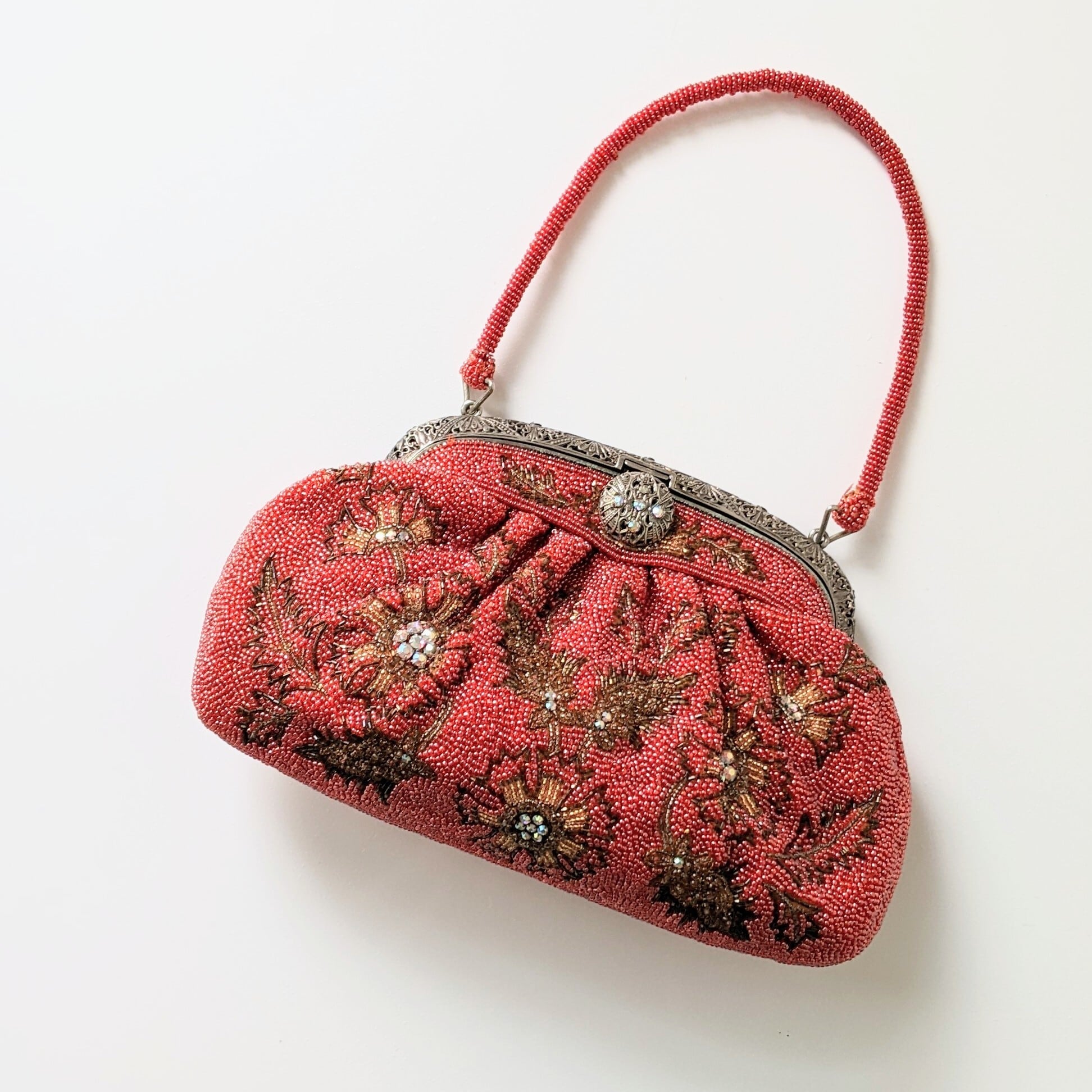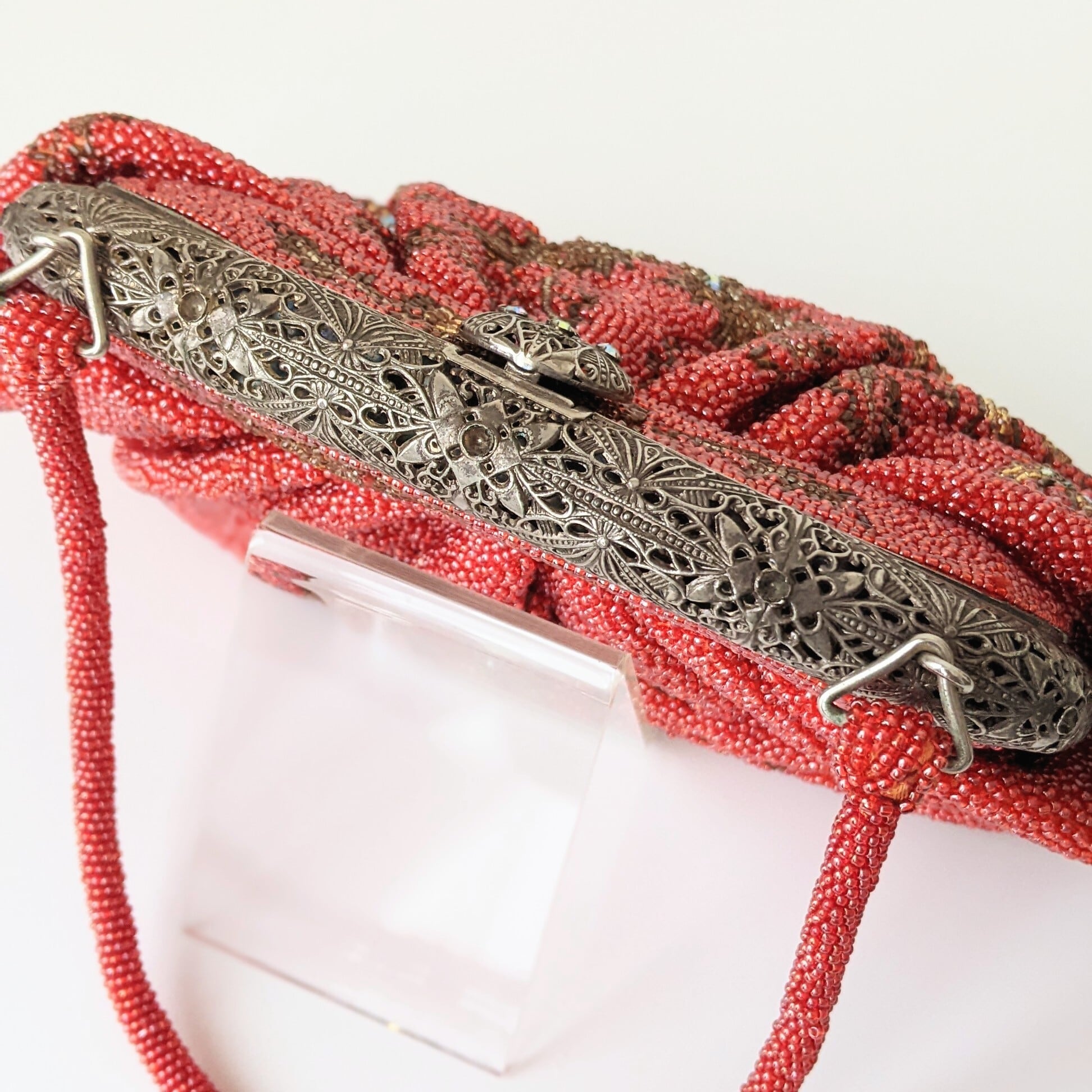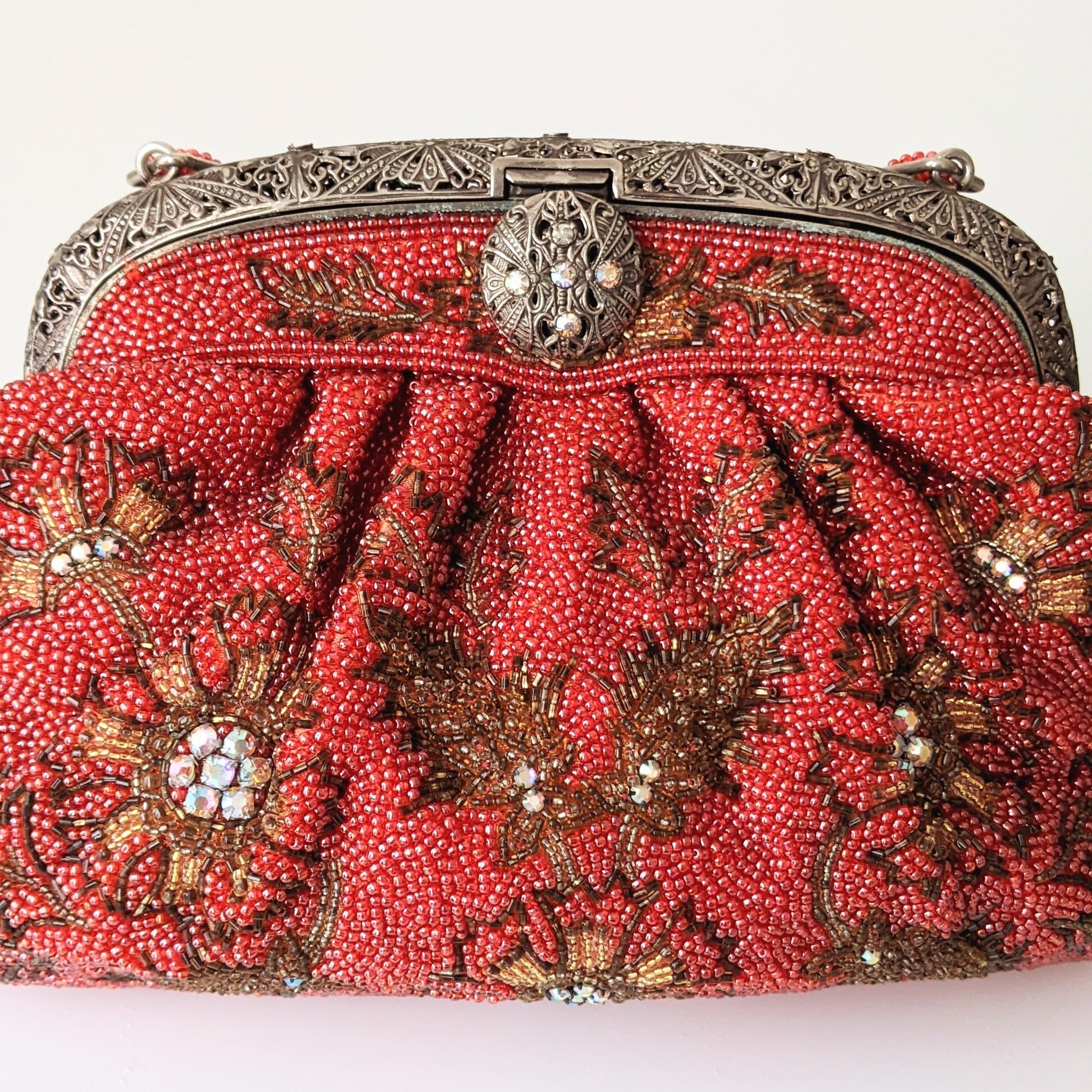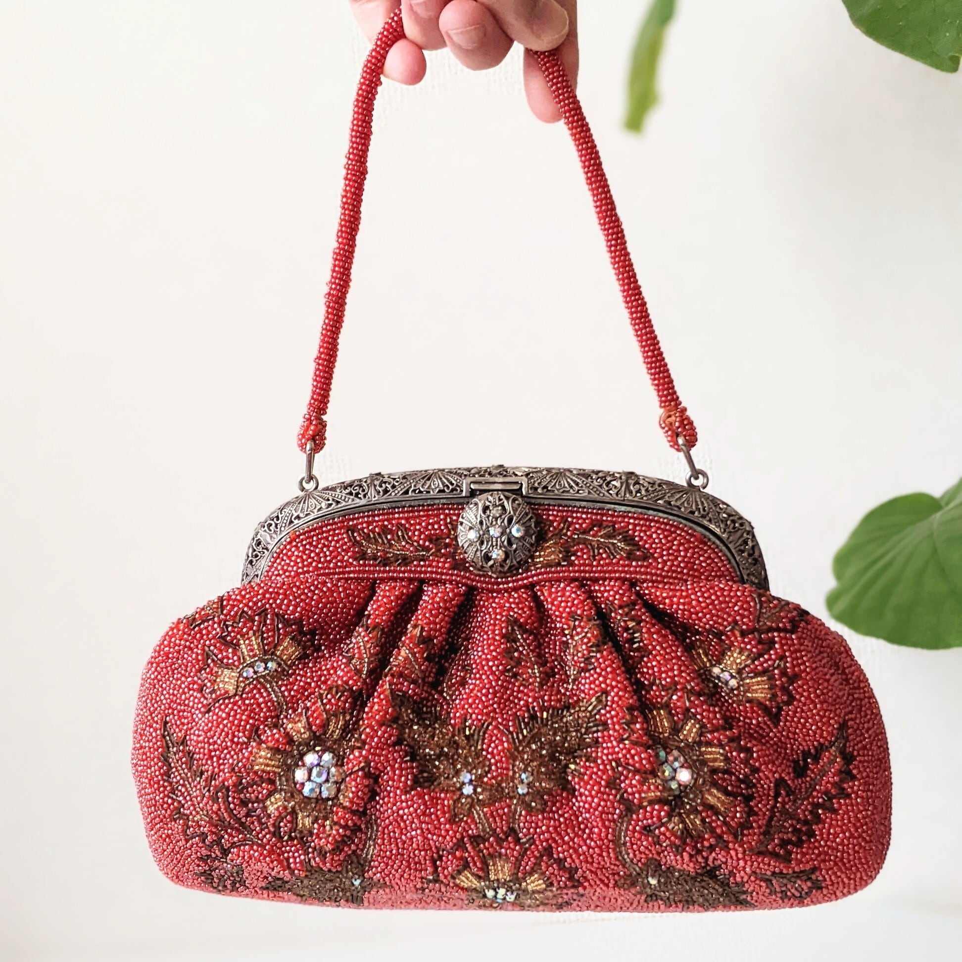古い洋館で暮らす女主人が大切に持っているようなアンティークレッドのビーズバッグ。