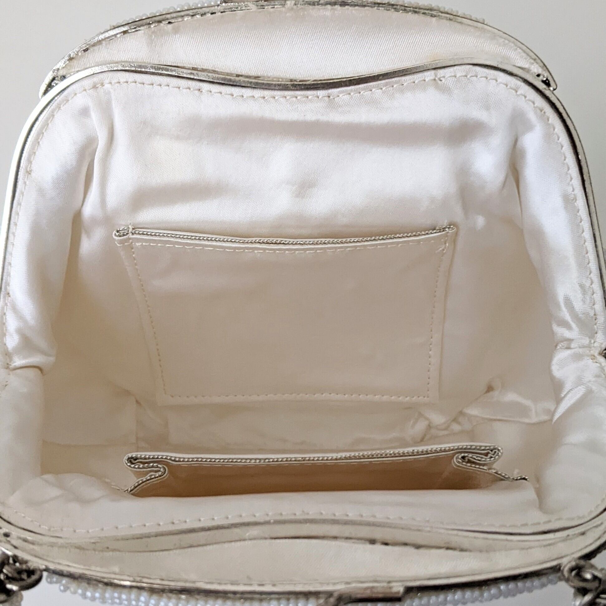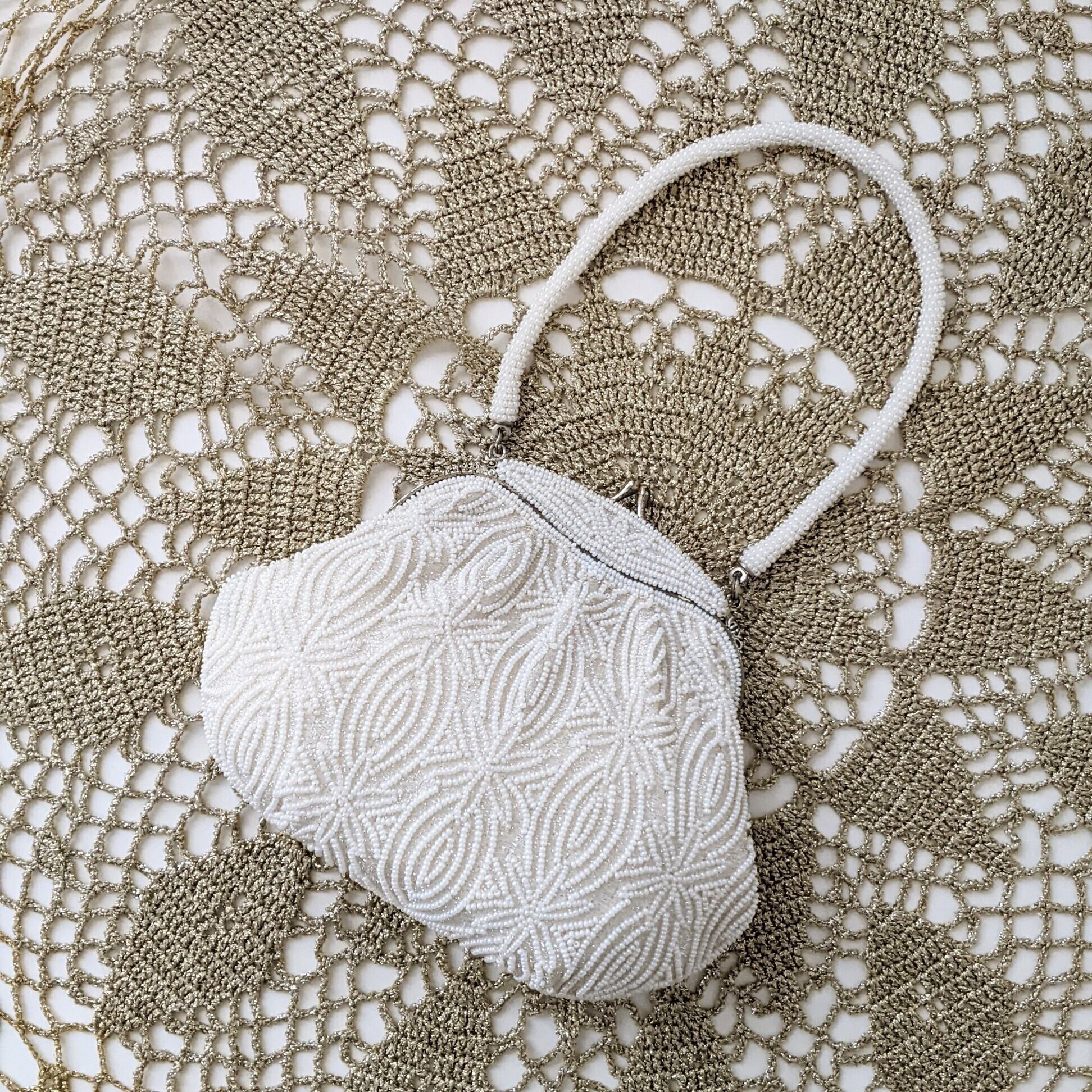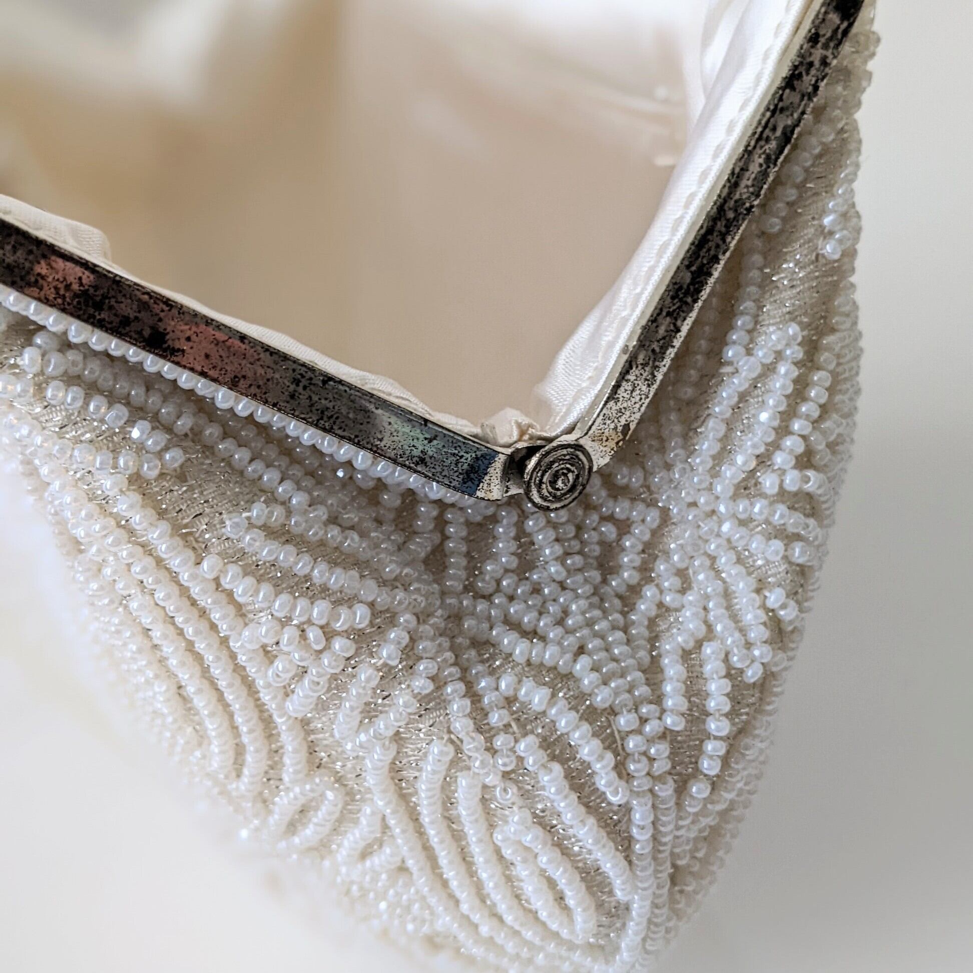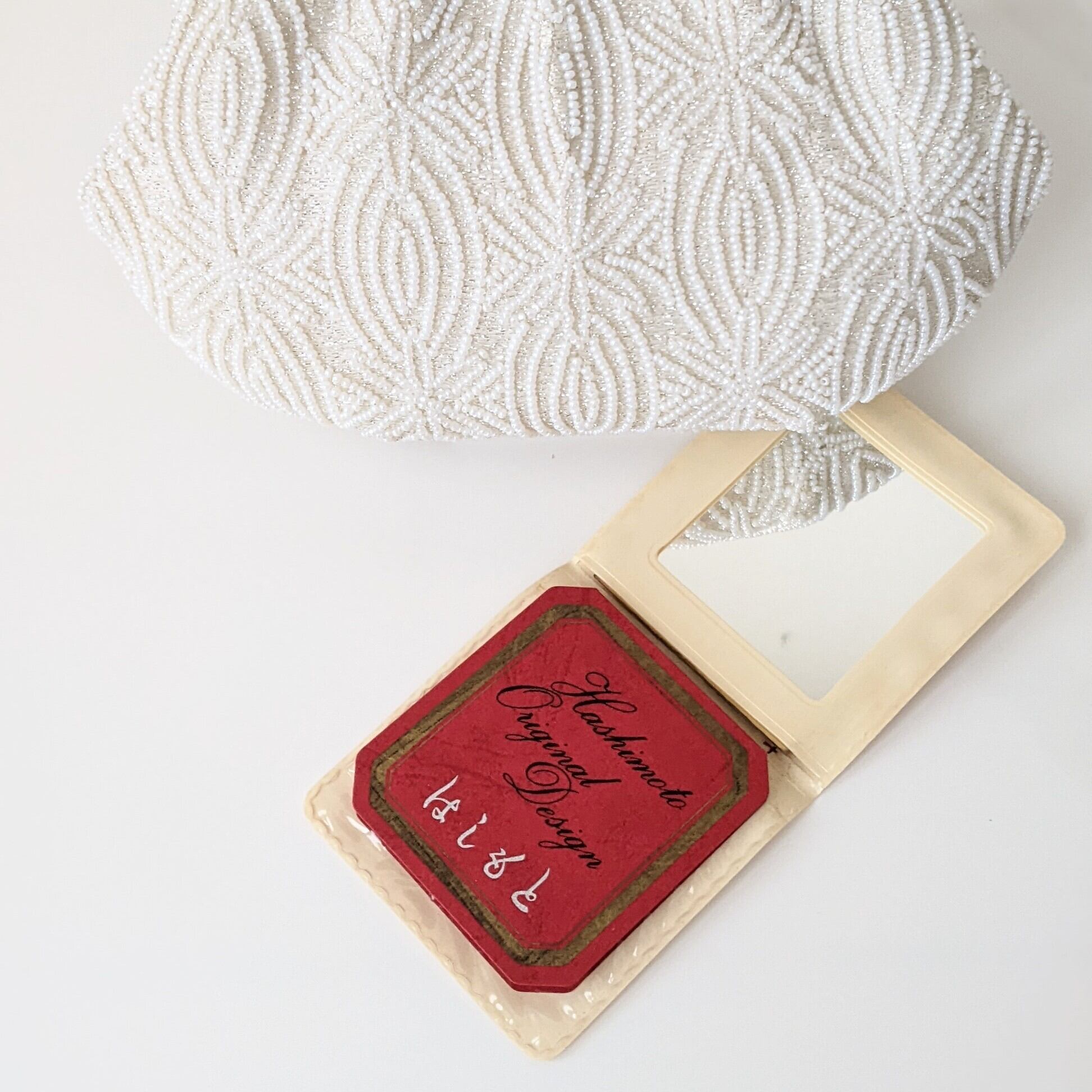 【vintage】 ビーズ刺繍バッグ パーティーバッグ 白 雪の結晶 はしもと 皇室御用達 鏡付き 大正浪漫