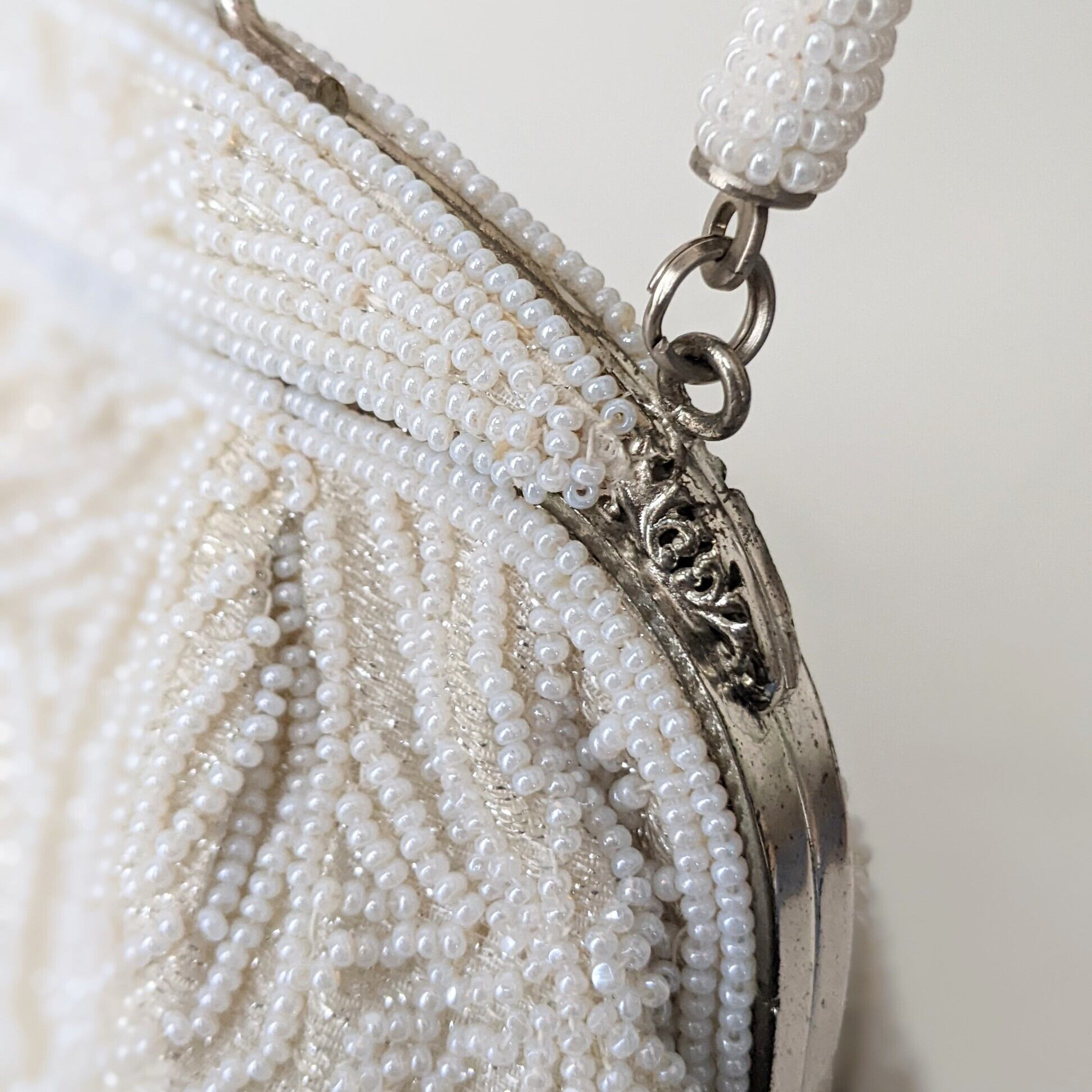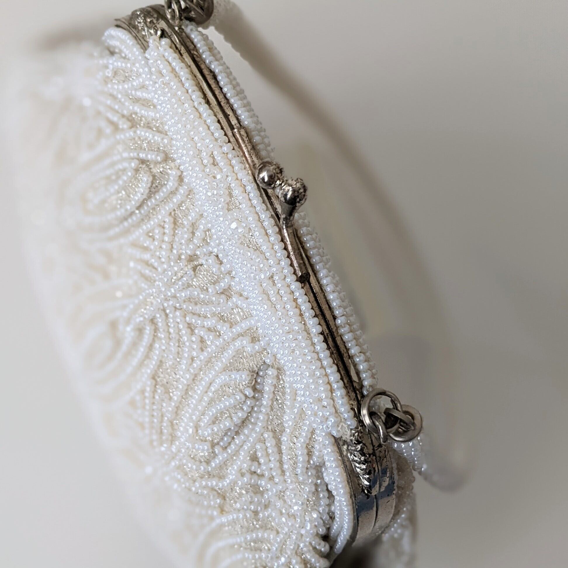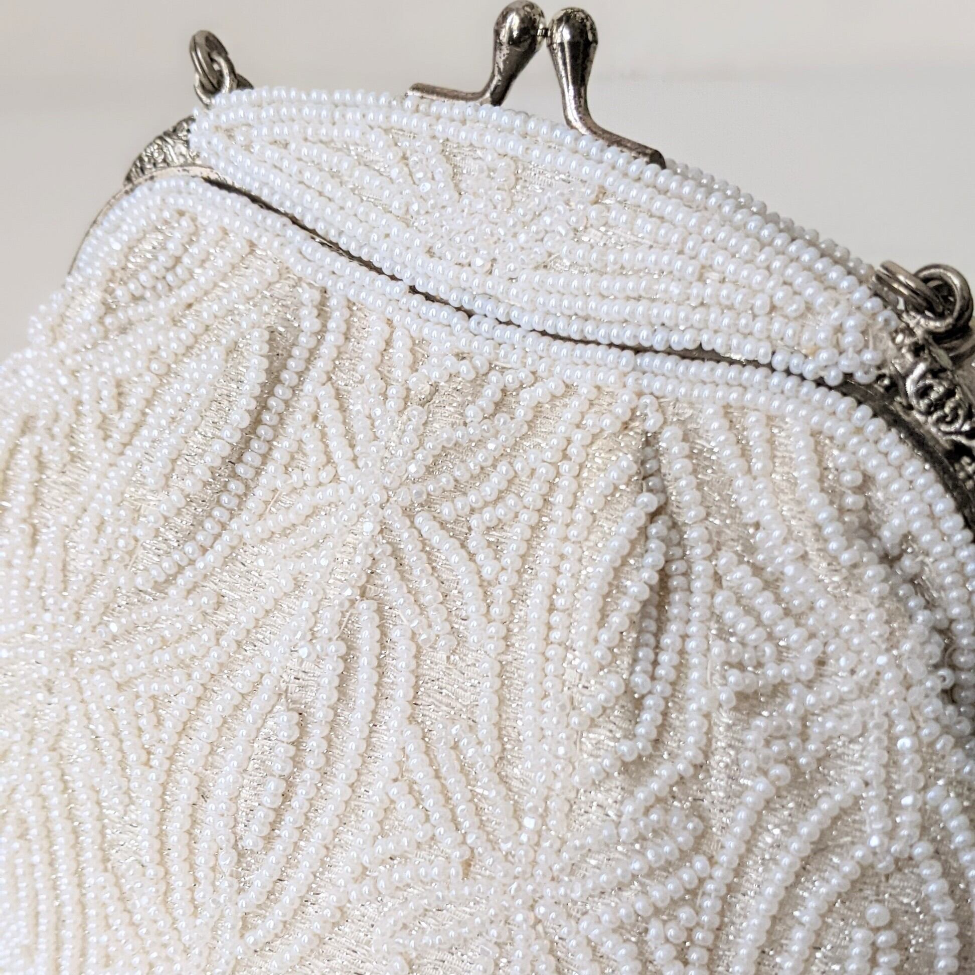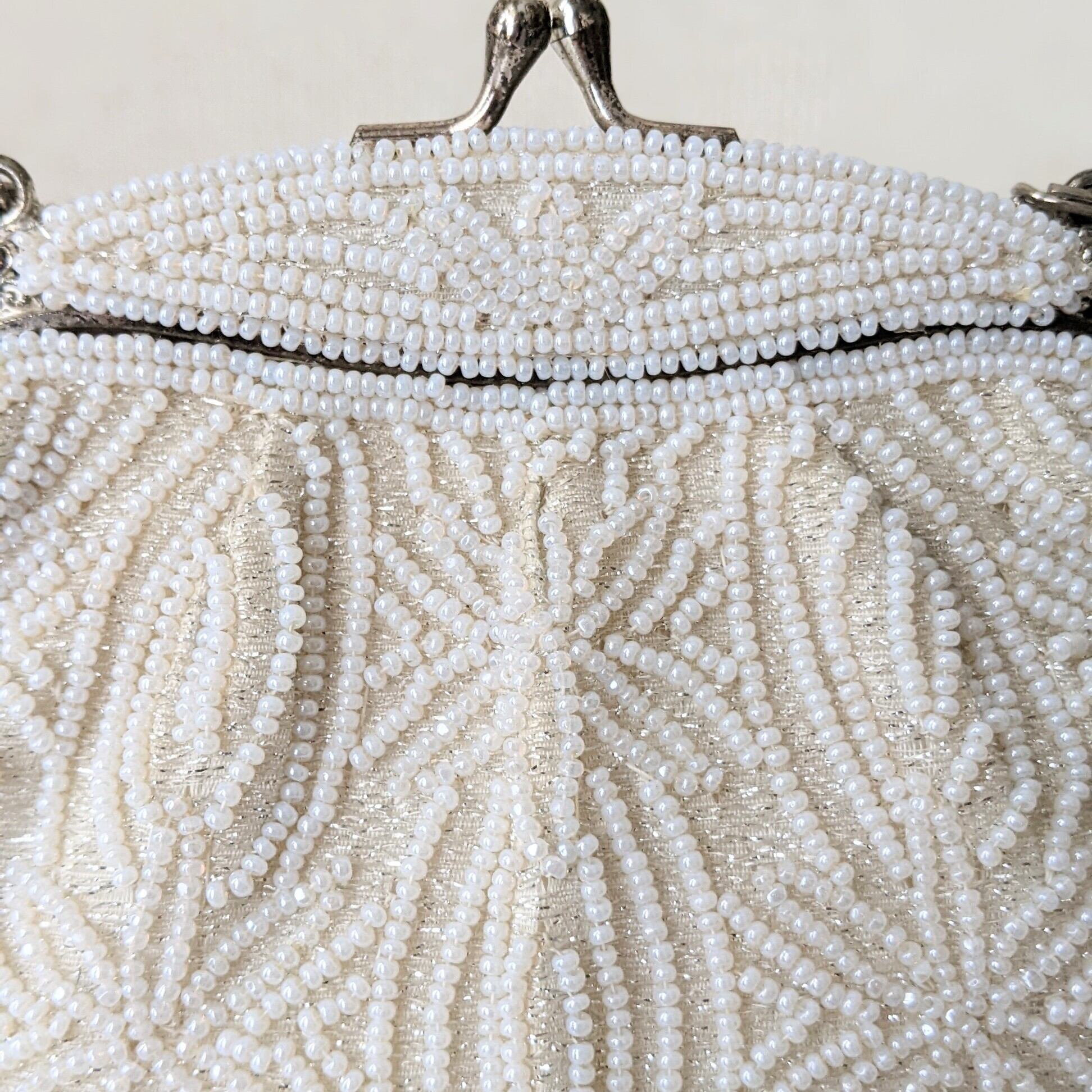 光に反射して美しく輝くヴィンテージビーズバッグ。