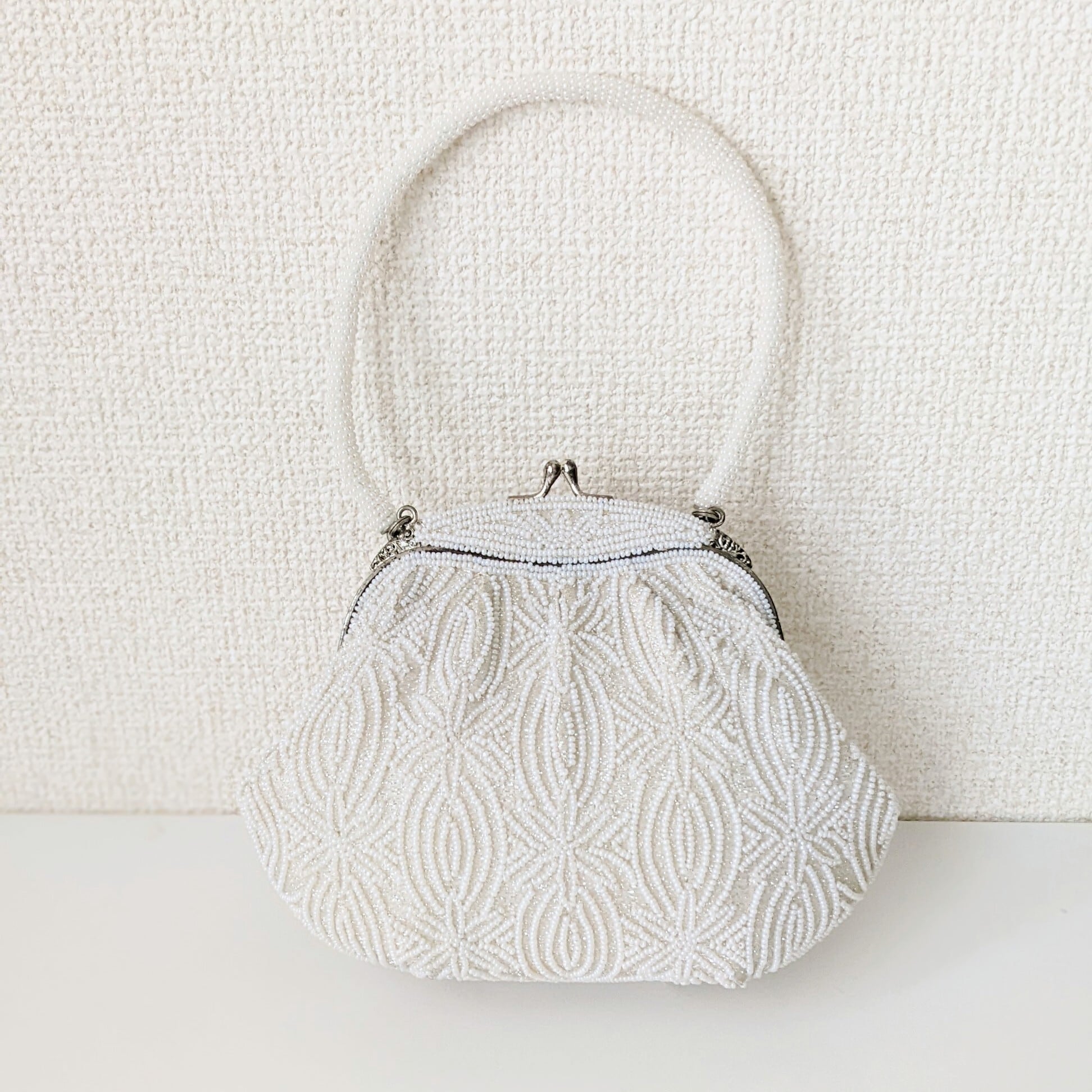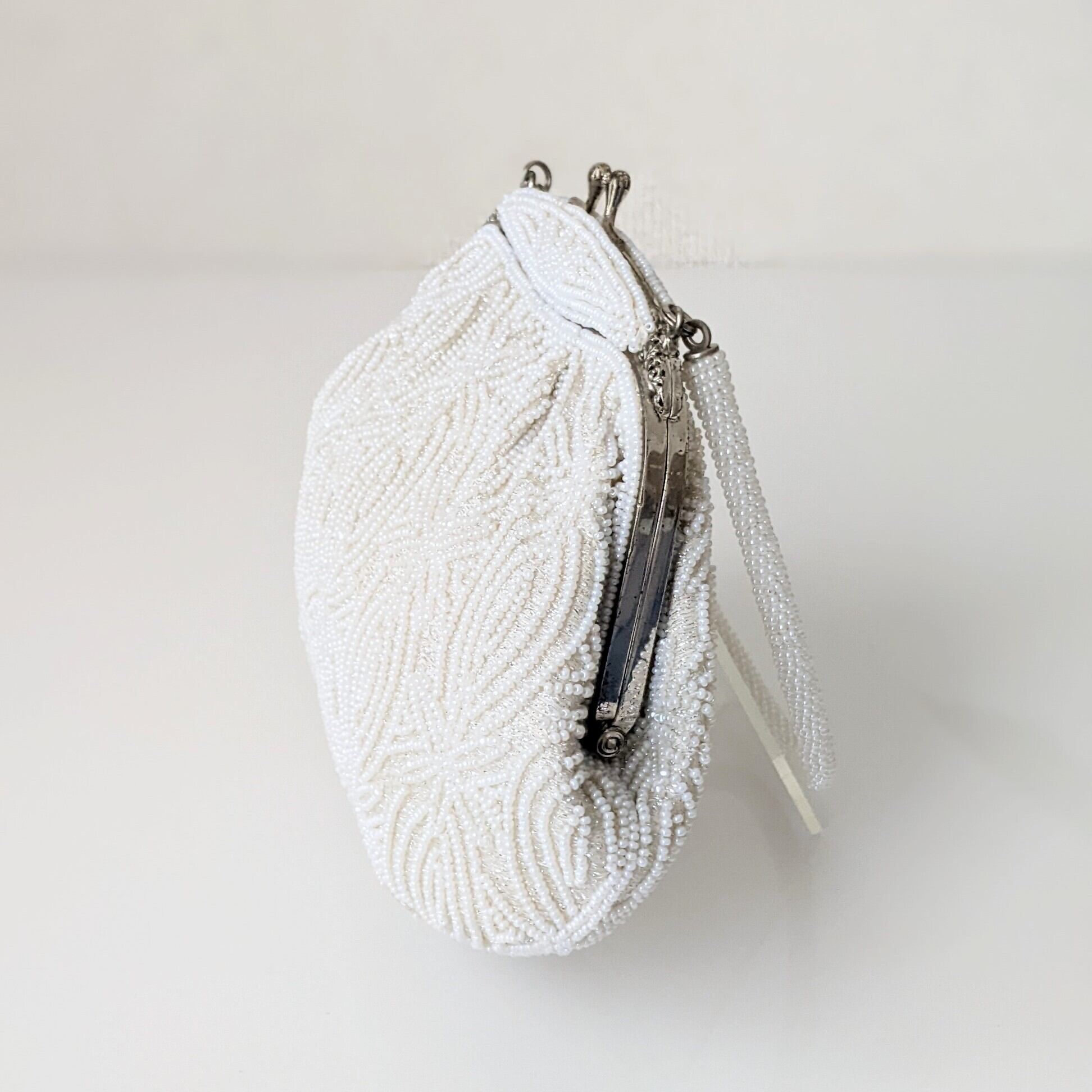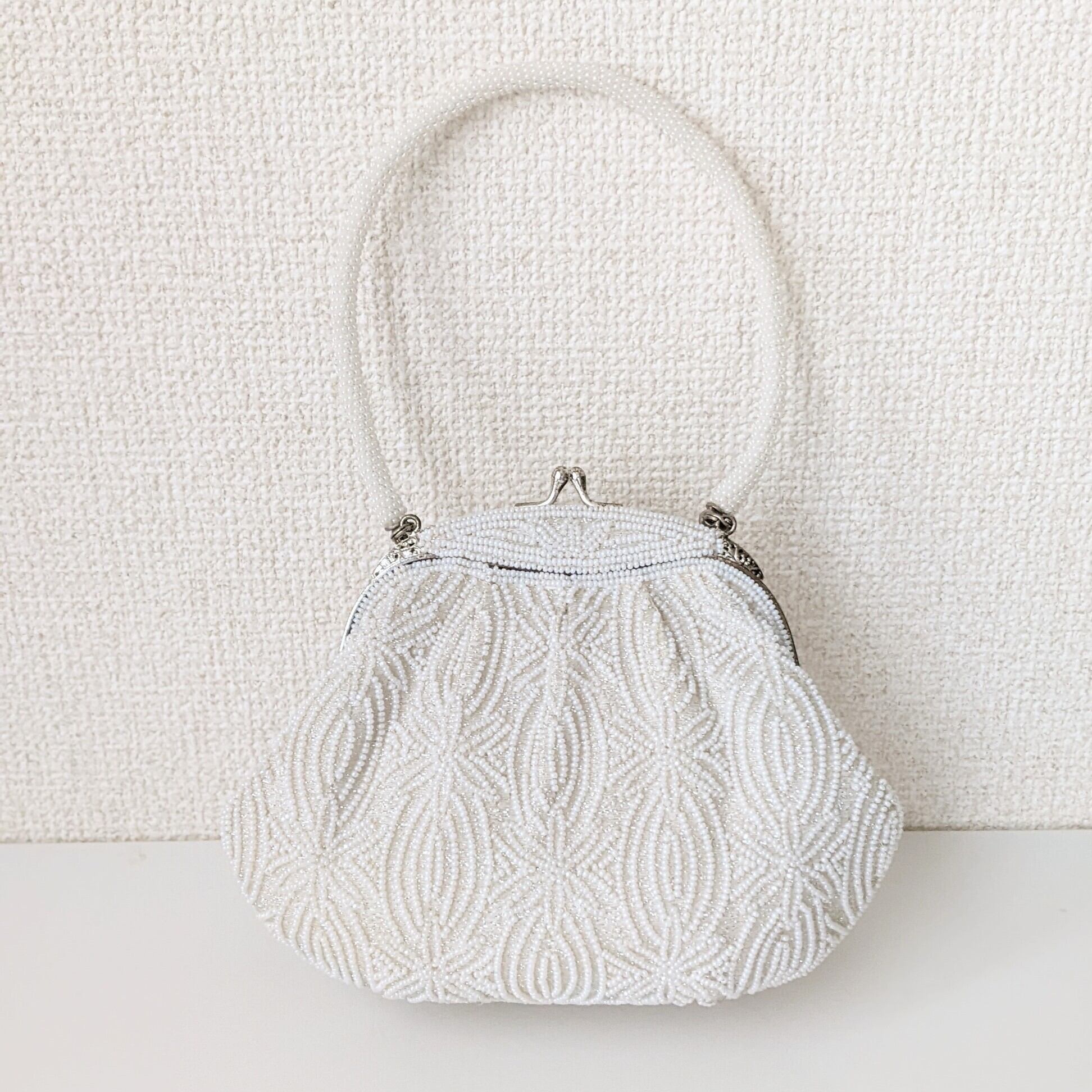 雪化粧をまとったかのような無垢な白さが美しいビーズバッグです。