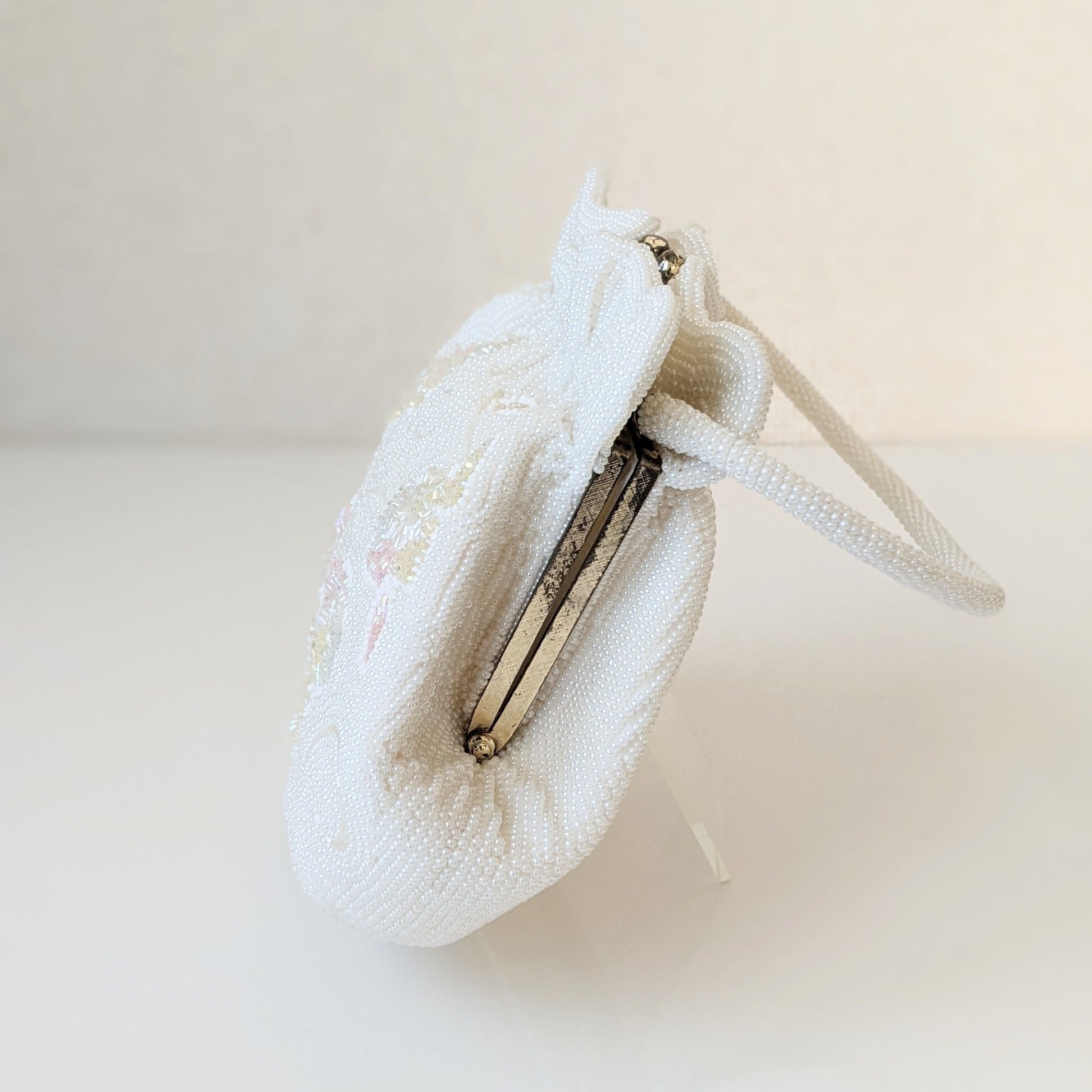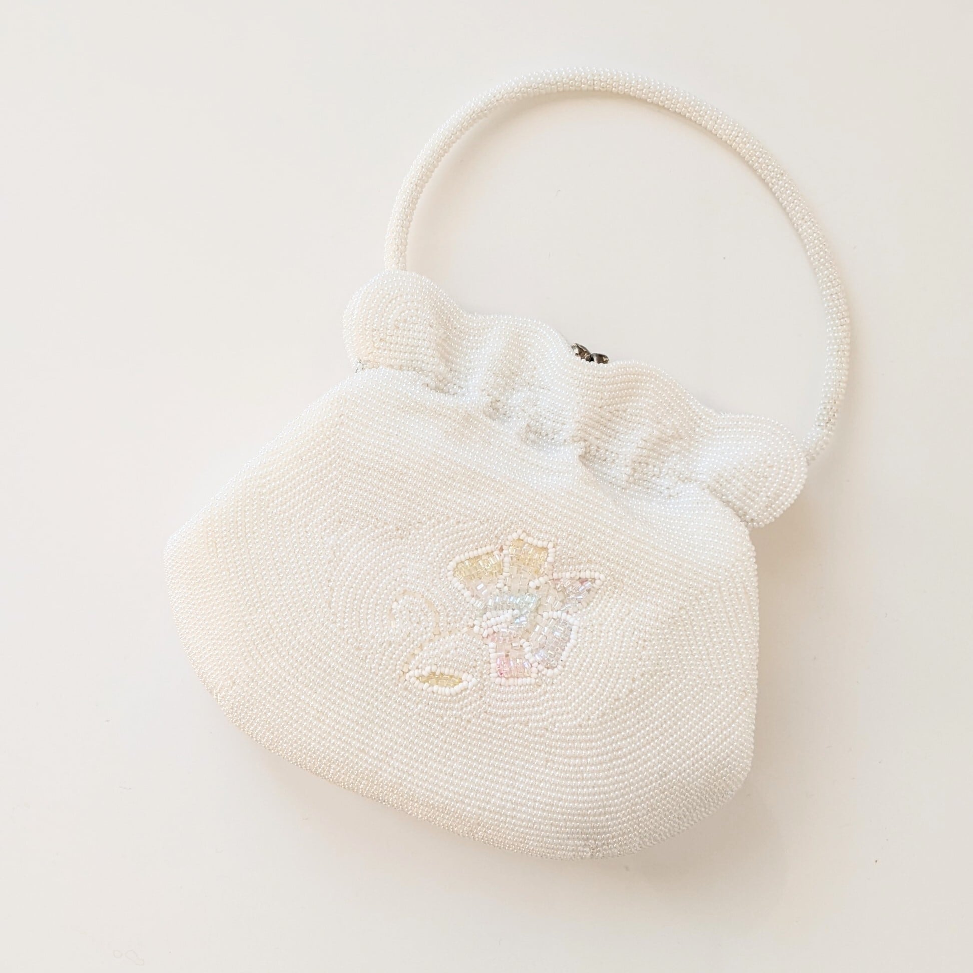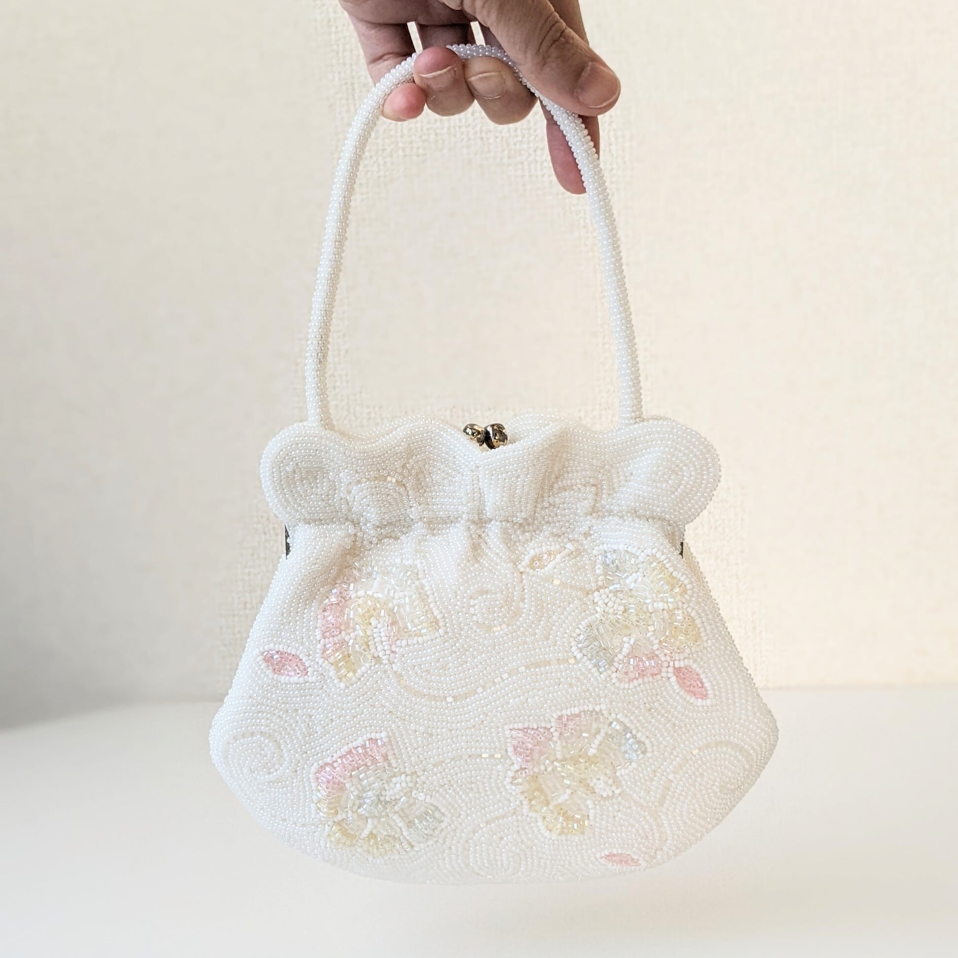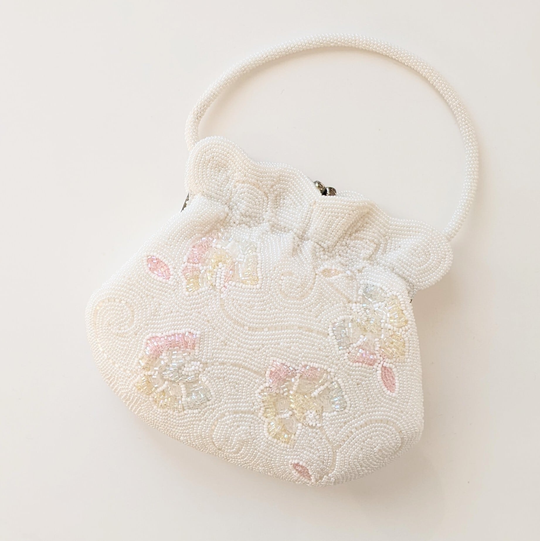 【vintage】 ビーズ刺繍バッグ パーティーバッグ 金魚鉢型 白×花柄 昭和レトロ 大正浪漫 フォーマルバッグ